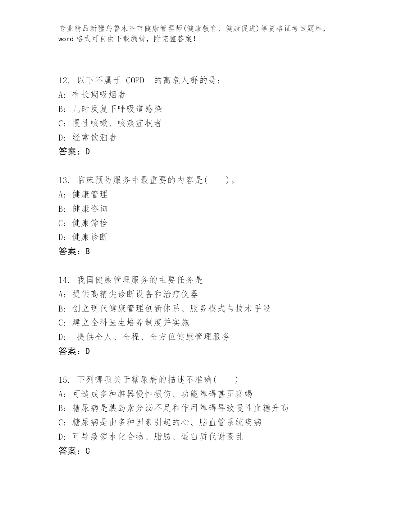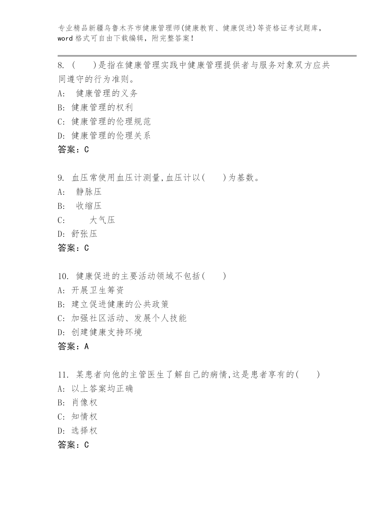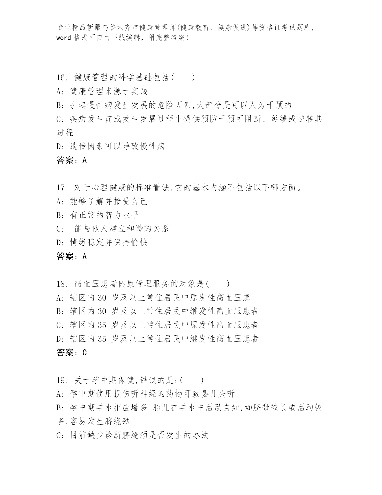 精品新疆乌鲁木齐市健康管理师(健康教育、健康促进)等资格证考试王牌题库及答案(最新).docx