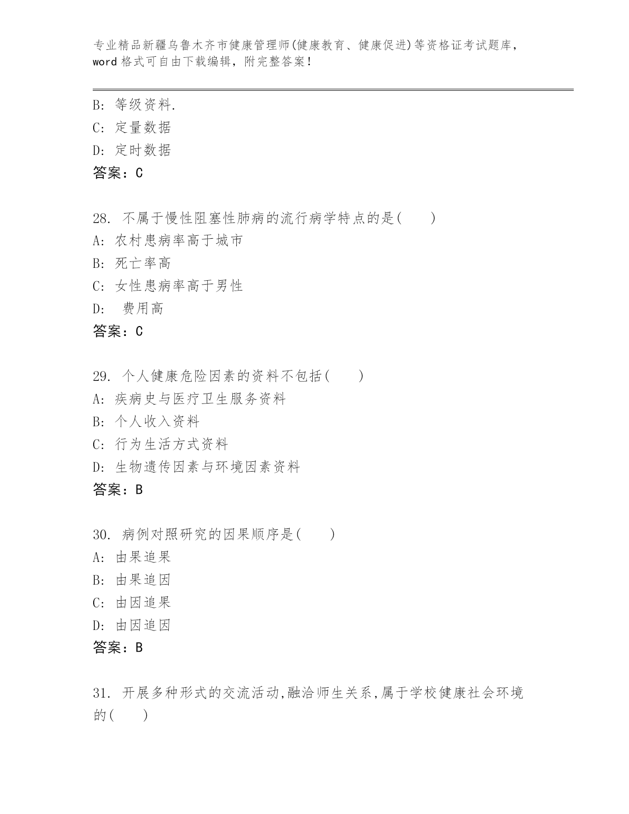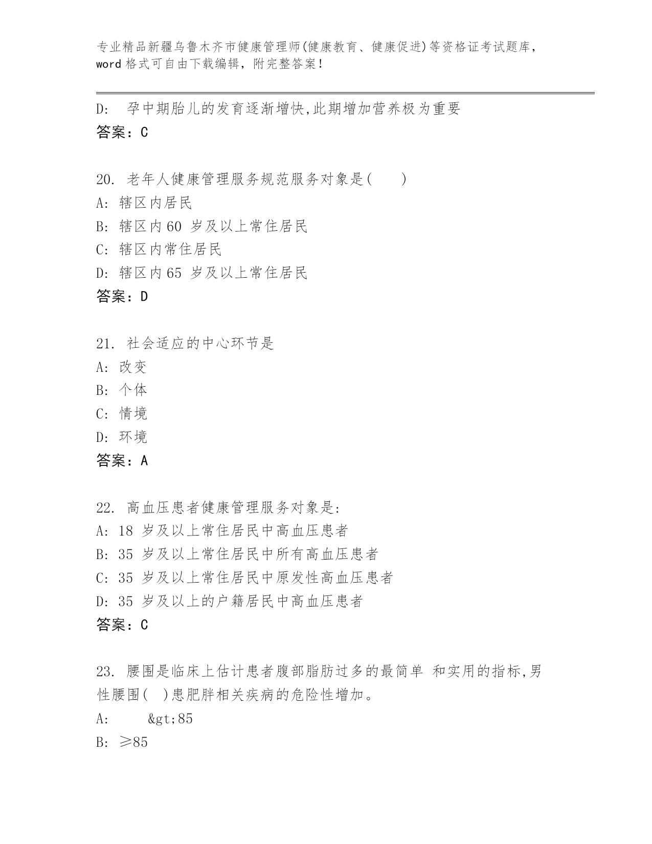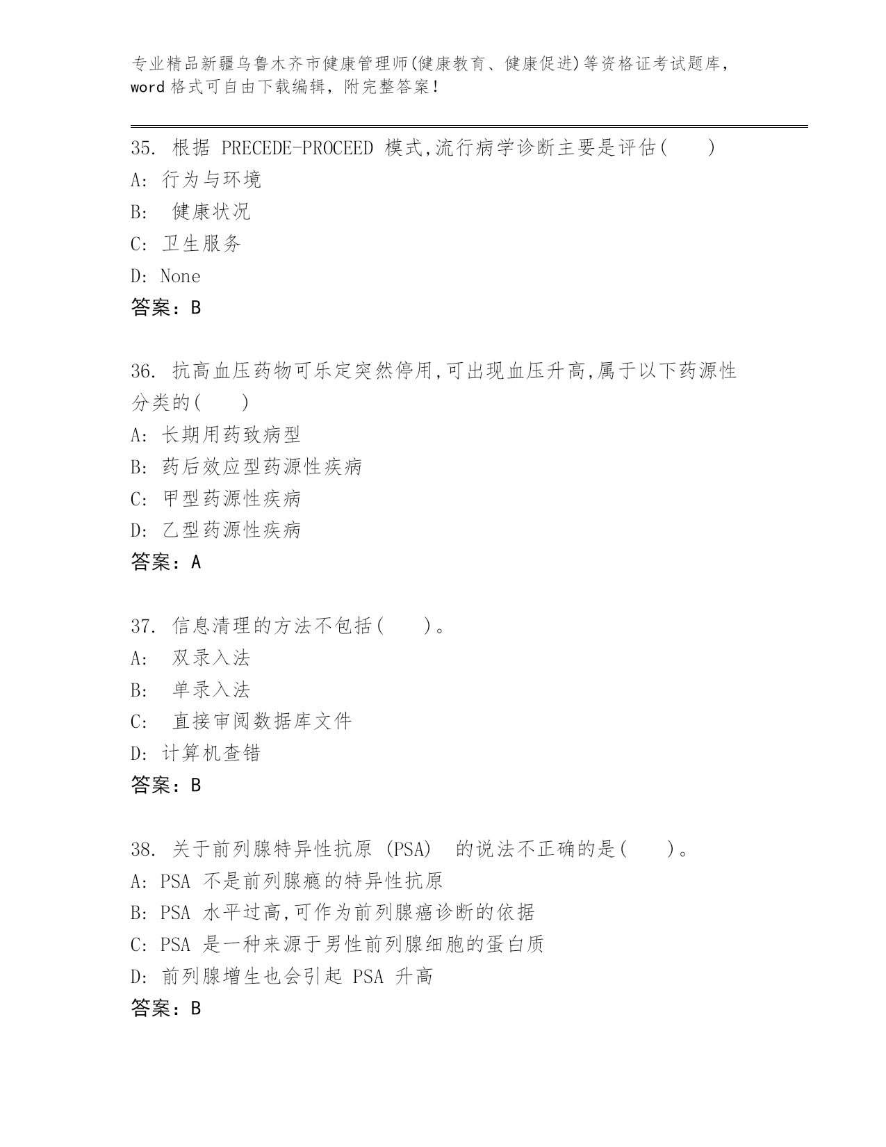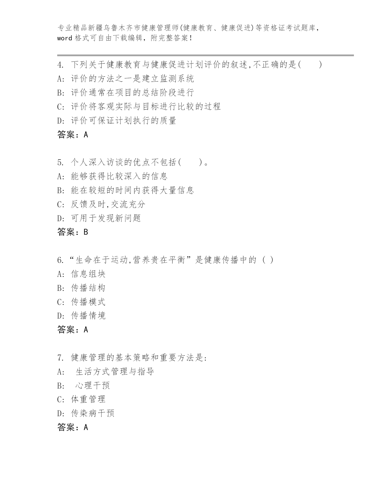 精品新疆乌鲁木齐市健康管理师(健康教育、健康促进)等资格证考试王牌题库及答案(最新).docx