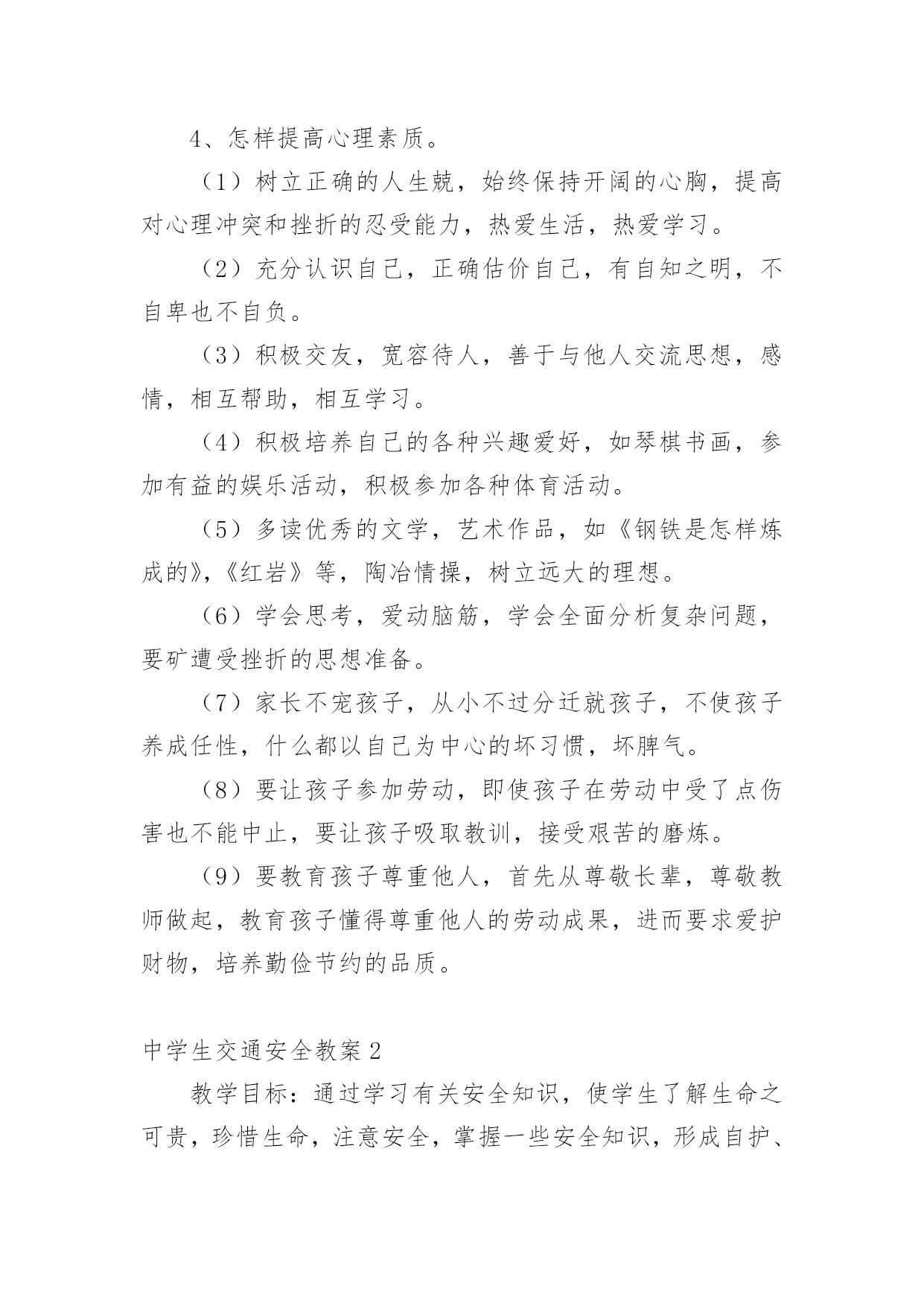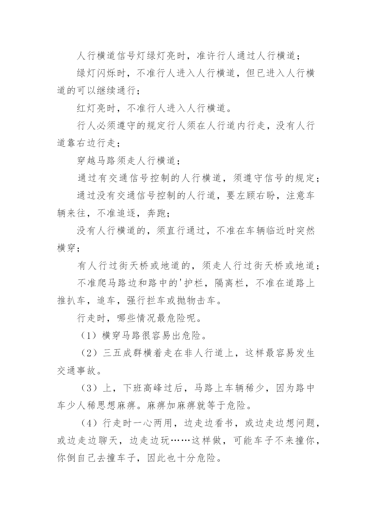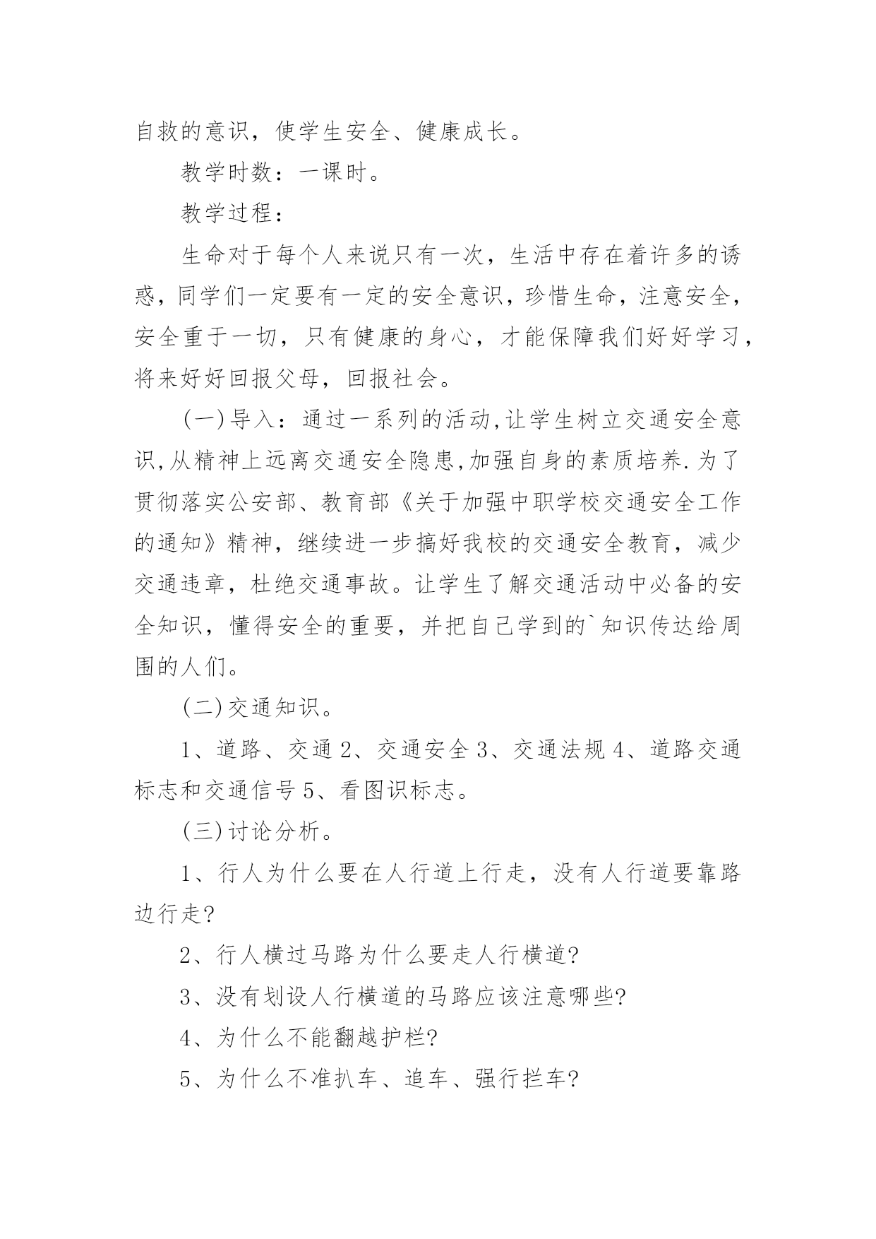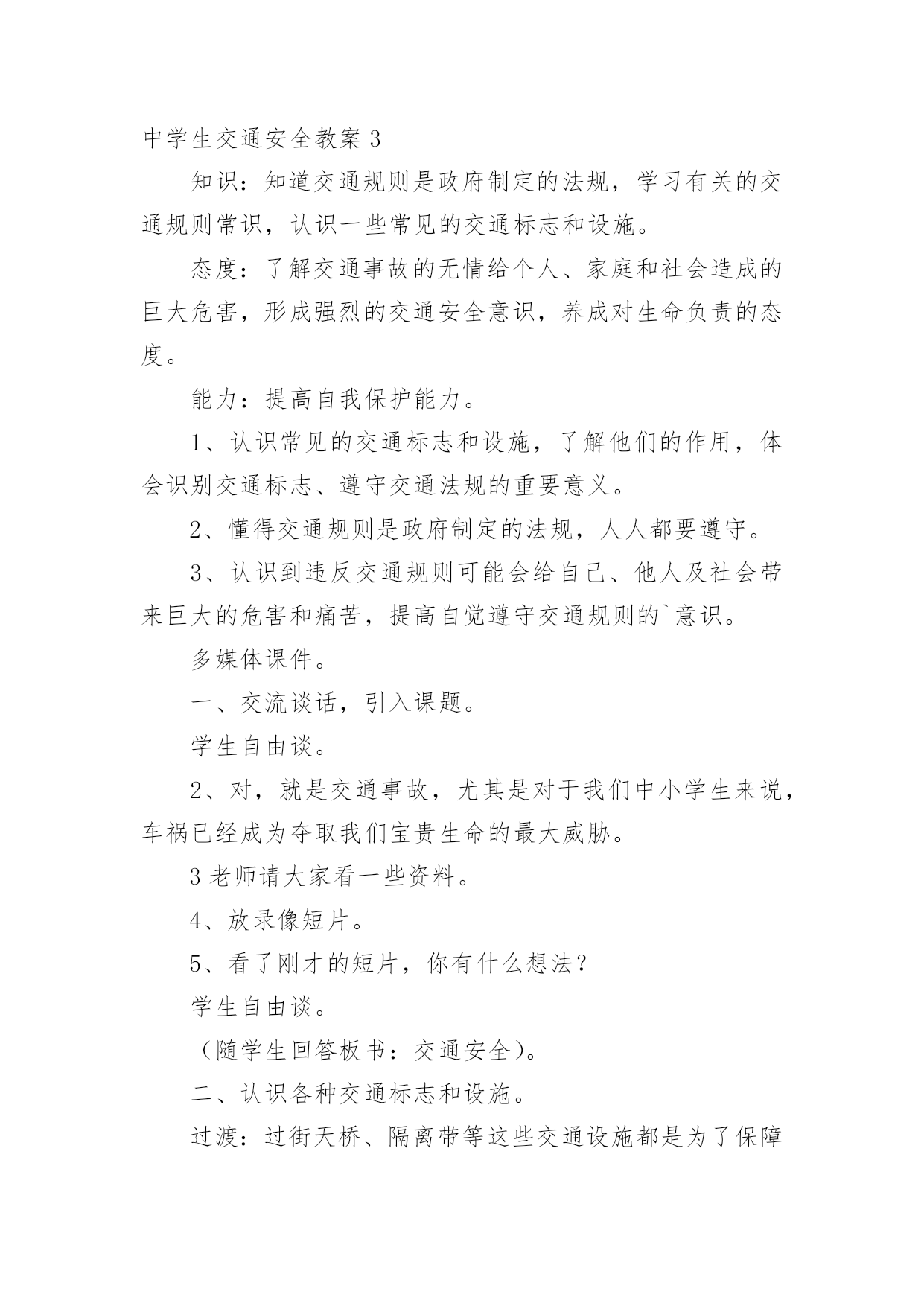 中学生交通安全教案作为一名为他人授业解惑的教育工作者,时常会需要准备好教案,借助教案可以恰当地选择和运用教学方法,调动学生学习的积极性。那么优秀的教案是什么样的呢?下面是小编收集整理的中学生交通安全教案,欢迎大家分享。中学生交通安全教案1教学目的:1、知道有关的交通安全标志和规则。2、知道不遵守交通规则会造成交通事故,给自己或别人带来痛苦。3、如何安全度过小桥。教学准备:教学平台及有关交通安全的图片.。教学过程:一、上学路上的安全。1、行走的安全常识。每位同学必须牢记如下行走安全常识:指挥灯信号绿灯亮时,准许行人通行;黄灯亮时,不准行人通行,但已进入人行道的行人,可以继续通行;红灯亮时,不准行人通行;黄灯闪烁时,行人须在确保安全的原则下通行。人行横道信号灯绿灯亮时,准许行人通过人行横道;绿灯闪烁时,不准行人进入人行横道,但已进入人行横道的可以继续通行;红灯亮时,不准行人进入人行横道。行人必须遵守的规定行人须在人行道内行走,没有人行道靠右边行走;穿越马路须走人行横道;通过有交通信号控制的人行横道,须遵守信号的规定;通过没有交通信号控制的人行道,要左顾右盼,注意车辆来往,不准追逐,奔跑;没有人行横道的,须直行通过,不准在车辆临近时突然横穿;有人行过街天桥或地道的,须走人行过街天桥或地道;不准爬马路边和路中的'护栏,隔离栏,不准在道路上推扒车,追车,强行拦车或抛物击车。行走时,哪些情况最危险呢。(1)横穿马路很容易出危险。(2)三五成群横着走在非人行道上,这样最容易发生交通事故。(3)上,下班高峰过后,马路上车辆稀少,因为路中车少人稀思想麻痹。麻痹加麻痹就等于危险。(4)行走时一心两用,边走边看书,或边走边想问题,或边走边聊天,边走边玩……这样做,可能车子不来撞你,你倒自己去撞车子,因此也十分危险。2、骑车安全。(1)不满12周岁的孩子,不能在道路上骑车。这是交通规则规定的。(2)不打伞骑车。(3)不脱手骑车。(4)不骑车带人。(5)不骑"病"车。(6)不骑快车。(7)不与机动车抢道。(8)不平行骑车。最后还要注意,在恶劣的天气如雷雨,台风,下雪,或积雪未化,道路结冰等情况下,也不要骑车。3、乘车安全。(1)上车前先看清公共汽车是哪一路,因为公共汽车停靠站,往往是几路公共汽车同一个站台,慌忙上车,容易乘错车。(2)待车子停稳后再上车或下车,上车时将书包置于胸前,以免书包被挤掉,或被车门轧住。(3)上车后不要挤在车门边,往里边走,见空处站稳,并抓住扶手,头,手,身体不能伸向窗外,否则容易发生伤害事故。(4)乘车要尊老爱幼讲礼貌,见老弱病残及孕妇要主动让座。(5)乘车时不要看书,否则会损害眼睛。4、怎样提高心理素质。(1)树立正确的人生兢,始终保持开阔的心胸,提高对心理冲突和挫折的忍受能力,热爱生活,热爱学习。(2)充分认识自己,正确估价自己,有自知之明,不自卑也不自负。(3)积极交友,宽容待人,善于与他人交流思想,感情,相互帮助,相互学习。(4)积极培养自己的各种兴趣爱好,如琴棋书画,参加有益的娱乐活动,积极参加各种体育活动。(5)多读优秀的文学,艺术作品,如《钢铁是怎样炼成的》,《红岩》等,陶冶情操,树立远大的理想。(6)学会思考,爱动脑筋,学会全面分析复杂问题,要矿遭受挫折的思想准备。(7)家长不宠孩子,从小不过分迁就孩子,不使孩子养成任性,什么都以自己为中心的坏习惯,坏脾气。(8)要让孩子参加劳动,即使孩子在劳动中受了点伤害也不能中止,要让孩子吸取教训,接受艰苦的磨炼。(9)要教育孩子尊重他人,首先从尊敬长辈,尊敬教师做起,教育孩子懂得尊重他人的劳动成果,进而要求爱护财物,培养勤俭节约的品质。中学生交通安全教案2教学目标:通过学习有关安全知识,使学生了解生命之可贵,珍惜生命,注意安全,掌握一些安全知识,形成自护、自救的意识,使学生安全、健康成长。教学时数:一课时。教学过程:生命对于每个人来说只有一次,生活中存在着许多的诱惑,同学们一定要有一定的安全意识,珍惜生命,注意安全,安全重于一切,只有健康的身心,才能保障我们好好学习,将来好好回报父母,回报社会。(一)导入:通过一系列的活动,让学生树立交通安全意识,从精神上远离交通安全隐患,加强自身的素质培养.为了贯彻落实公安部、教育部《关于加强中职学校交通安全工作的通知》精神,继续进一步搞好我校的交通安全教育,减少交通违章,杜绝交通事故。让学生了解交通活动中必备的安全知识,懂得安全的重要,并把自己学到的`知识传达给周围的人们。(二)交通知识。1、道路、交通2、交通安全3、交通法规4、道路交通标志和交通信号5、看图识标志。(三)讨论分析。1、行人为什么要在人行道上行走,没有人行道要靠路边行走?2、行人横过马路为什么要走人行横道?3、没有划设人行横道的马路应该注意哪些?4、为什么不能翻越
