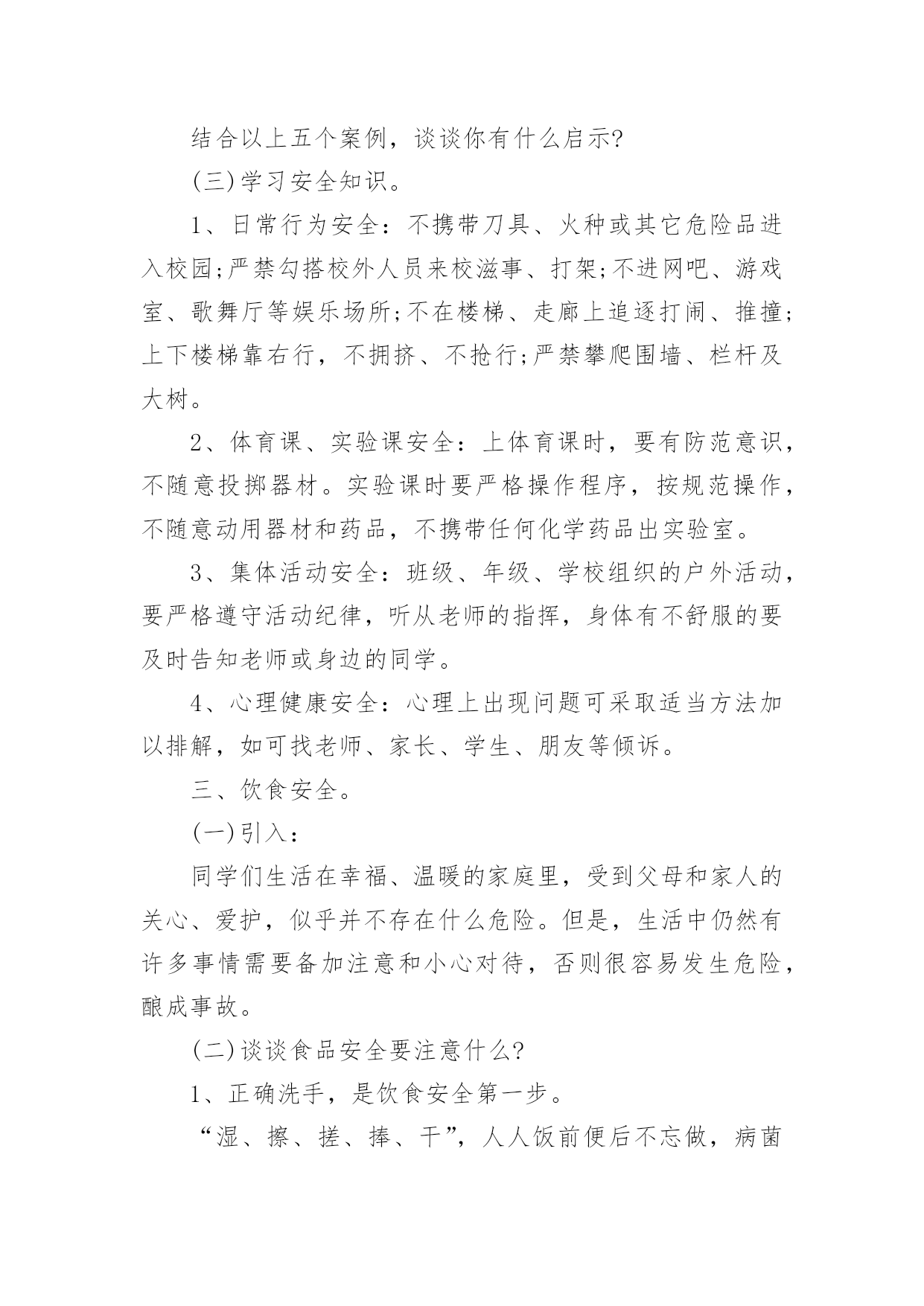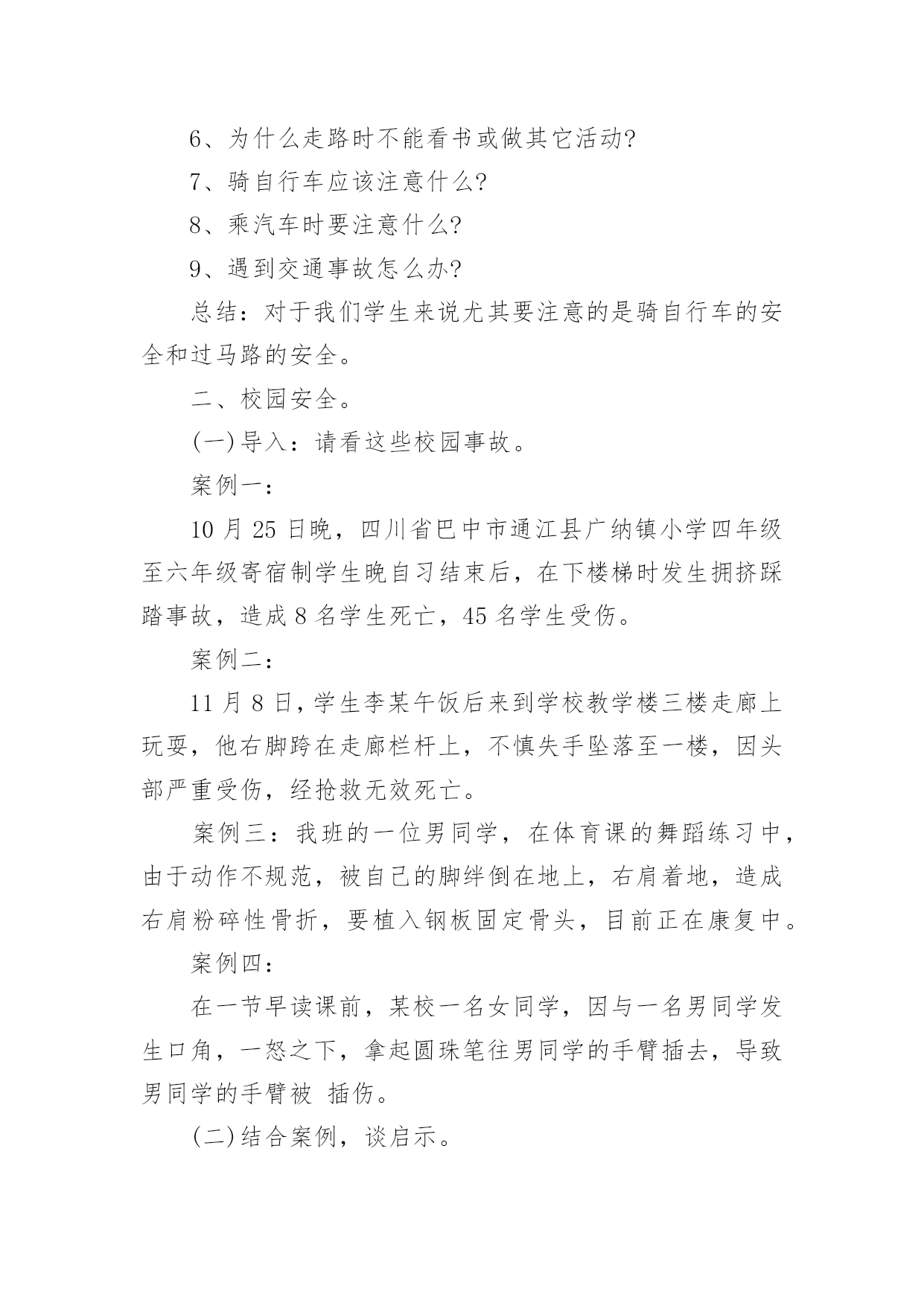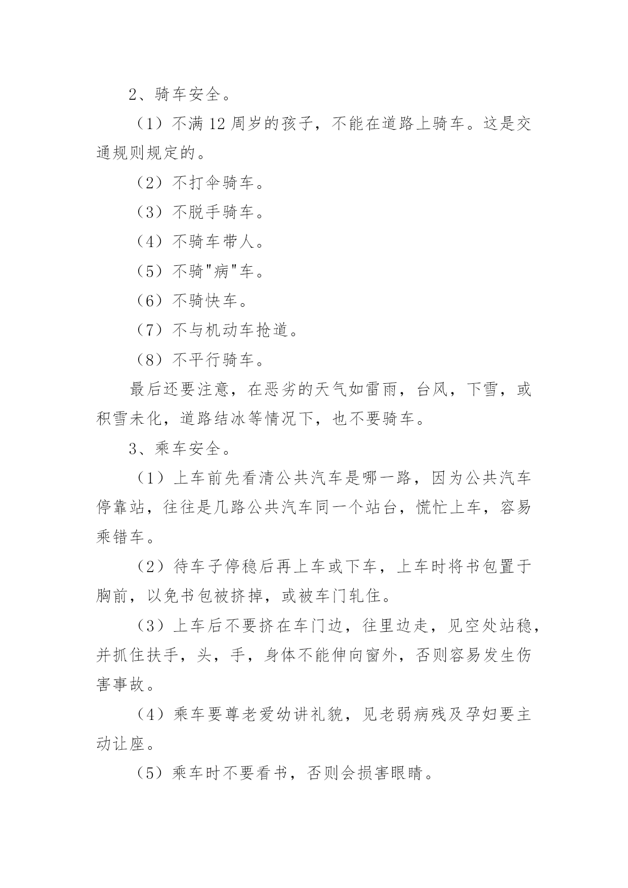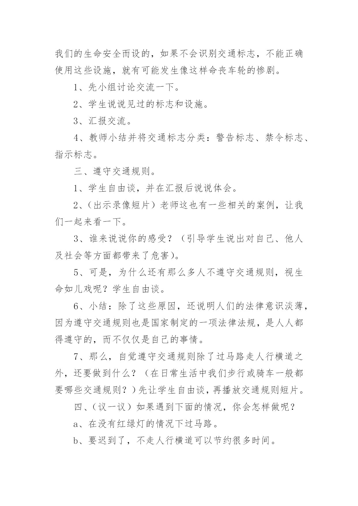 中学生交通安全教案作为一名为他人授业解惑的教育工作者,时常会需要准备好教案,借助教案可以恰当地选择和运用教学方法,调动学生学习的积极性。那么优秀的教案是什么样的呢?下面是小编收集整理的中学生交通安全教案,欢迎大家分享。中学生交通安全教案1教学目的:1、知道有关的交通安全标志和规则。2、知道不遵守交通规则会造成交通事故,给自己或别人带来痛苦。3、如何安全度过小桥。教学准备:教学平台及有关交通安全的图片.。教学过程:一、上学路上的安全。1、行走的安全常识。每位同学必须牢记如下行走安全常识:指挥灯信号绿灯亮时,准许行人通行;黄灯亮时,不准行人通行,但已进入人行道的行人,可以继续通行;红灯亮时,不准行人通行;黄灯闪烁时,行人须在确保安全的原则下通行。人行横道信号灯绿灯亮时,准许行人通过人行横道;绿灯闪烁时,不准行人进入人行横道,但已进入人行横道的可以继续通行;红灯亮时,不准行人进入人行横道。行人必须遵守的规定行人须在人行道内行走,没有人行道靠右边行走;穿越马路须走人行横道;通过有交通信号控制的人行横道,须遵守信号的规定;通过没有交通信号控制的人行道,要左顾右盼,注意车辆来往,不准追逐,奔跑;没有人行横道的,须直行通过,不准在车辆临近时突然横穿;有人行过街天桥或地道的,须走人行过街天桥或地道;不准爬马路边和路中的'护栏,隔离栏,不准在道路上推扒车,追车,强行拦车或抛物击车。行走时,哪些情况最危险呢。(1)横穿马路很容易出危险。(2)三五成群横着走在非人行道上,这样最容易发生交通事故。(3)上,下班高峰过后,马路上车辆稀少,因为路中车少人稀思想麻痹。麻痹加麻痹就等于危险。(4)行走时一心两用,边走边看书,或边走边想问题,或边走边聊天,边走边玩……这样做,可能车子不来撞你,你倒自己去撞车子,因此也十分危险。2、骑车安全。(1)不满12周岁的孩子,不能在道路上骑车。这是交通规则规定的。(2)不打伞骑车。(3)不脱手骑车。(4)不骑车带人。(5)不骑"病"车。(6)不骑快车。(7)不与机动车抢道。(8)不平行骑车。最后还要注意,在恶劣的天气如雷雨,台风,下雪,或积雪未化,道路结冰等情况下,也不要骑车。3、乘车安全。(1)上车前先看清公共汽车是哪一路,因为公共汽车停靠站,往往是几路公共汽车同一个站台,慌忙上车,容易乘错车。(2)待车子停稳后再上车或下车,上车时将书包置于胸前,以免书包被挤掉,或被车门轧住。(3)上车后不要挤在车门边,往里边走,见空处站稳,并抓住扶手,头,手,身体不能伸向窗外,否则容易发生伤害事故。(4)乘车要尊老爱幼讲礼貌,见老弱病残及孕妇要主动让座。(5)乘车时不要看书,否则会损害眼睛。4、怎样提高心理素质。(1)树立正确的人生兢,始终保持开阔的心胸,提高对心理冲突和挫折的忍受能力,热爱生活,热爱学习。(2)充分认识自己,正确估价自己,有自知之明,不自卑也不自负。(3)积极交友,宽容待人,善于与他人交流思想,感情,相互帮助,相互学习。(4)积极培养自己的各种兴趣爱好,如琴棋书画,参加有益的娱乐活动,积极参加各种体育活动。(5)多读优秀的文学,艺术作品,如《钢铁是怎样炼成的》,《红岩》等,陶冶情操,树立远大的理想。(6)学会思考,爱动脑筋,学会全面分析复杂问题,要矿遭受挫折的思想准备。(7)家长不宠孩子,从小不过分迁就孩子,不使孩子养成任性,什么都以自己为中心的坏习惯,坏脾气。(8)要让孩子参加劳动,即使孩子在劳动中受了点伤害也不能中止,要让孩子吸取教训,接受艰苦的磨炼。(9)要教育孩子尊重他人,首先从尊敬长辈,尊敬教师做起,教育孩子懂得尊重他人的劳动成果,进而要求爱护财物,培养勤俭节约的品质。中学生交通安全教案2教学目标:通过学习有关安全知识,使学生了解生命之可贵,珍惜生命,注意安全,掌握一些安全知识,形成自护、自救的意识,使学生安全、健康成长。教学时数:一课时。教学过程:生命对于每个人来说只有一次,生活中存在着许多的诱惑,同学们一定要有一定的安全意识,珍惜生命,注意安全,安全重于一切,只有健康的身心,才能保障我们好好学习,将来好好回报父母,回报社会。(一)导入:通过一系列的活动,让学生树立交通安全意识,从精神上远离交通安全隐患,加强自身的素质培养.为了贯彻落实公安部、教育部《关于加强中职学校交通安全工作的通知》精神,继续进一步搞好我校的交通安全教育,减少交通违章,杜绝交通事故。让学生了解交通活动中必备的安全知识,懂得安全的重要,并把自己学到的`知识传达给周围的人们。(二)交通知识。1、道路、交通2、交通安全3、交通法规4、道路交通标志和交通信号5、看图识标志。(三)讨论分析。1、行人为什么要在人行道上行走,没有人行道要靠路边行走?2、行人横过马路为什么要走人行横道?3、没有划设人行横道的马路应该注意哪些?4、为什么不能翻越