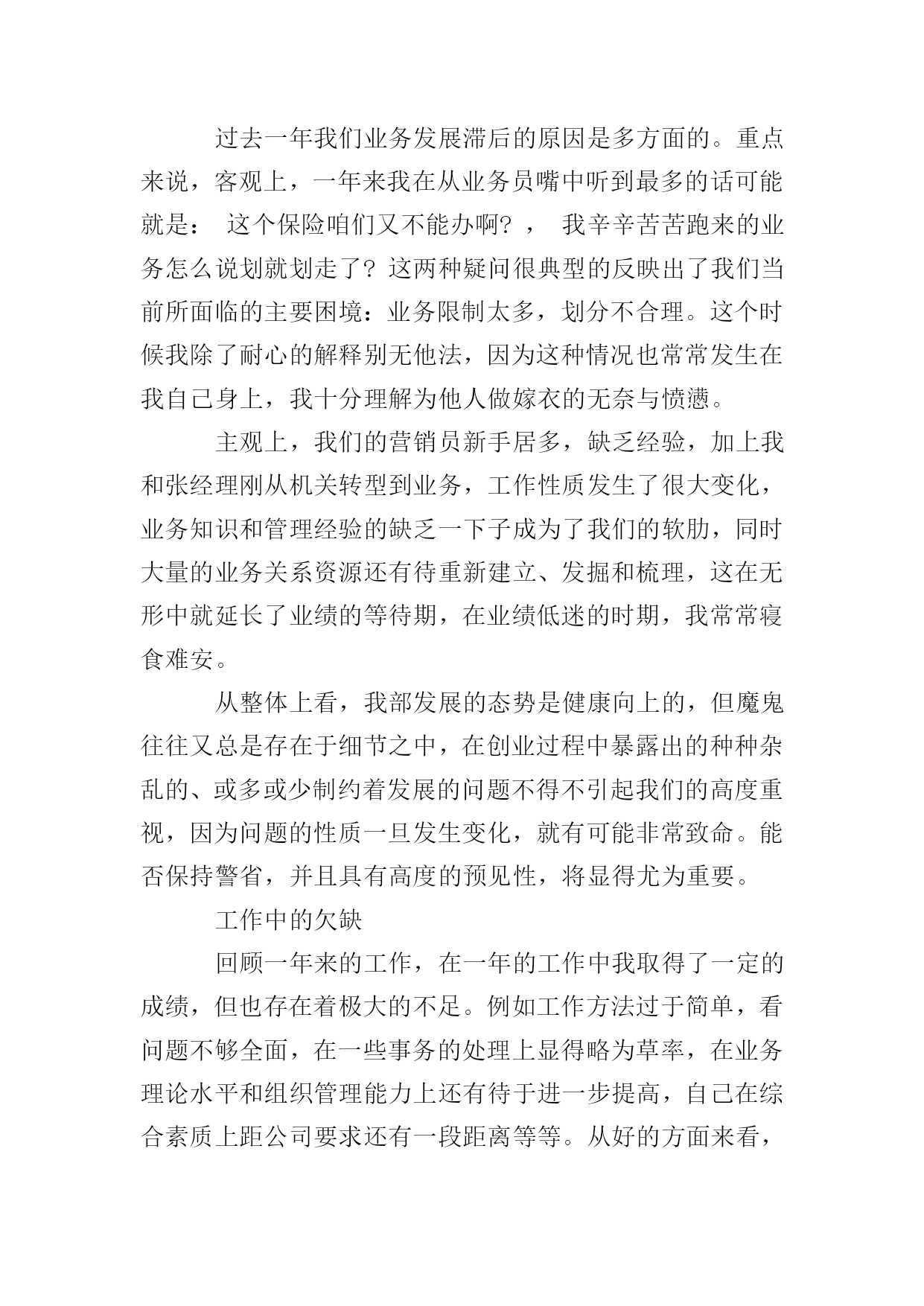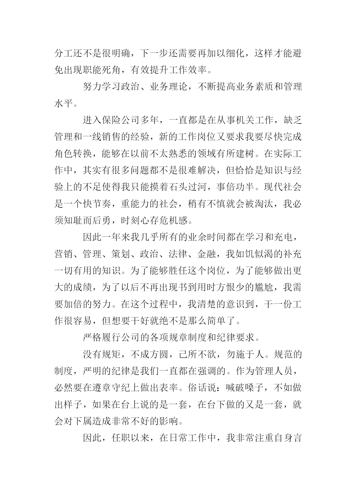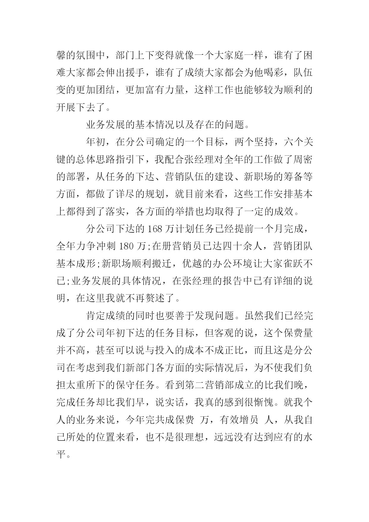 保险公司年终的述职报告时光如水,光阴似箭,充满机遇与挑战的xxxx年即将过去。一年来因为有了上级领导的正确领导,有了公司同仁的关心帮助,第一营销服务部各方面的工作均取得了可喜的成就,有了长足的进步。看到公司业务蒸蒸日上,我的内心感到无比欣慰和骄傲,因为这其中饱含着我们全体员工辛勤的劳动和汗水,是我们与时俱进,奋发有为精神风貌的体现,也是我们兢兢业业,齐心协力,迎难而上,扎实工作的结果。在这里我要感谢分公司能够给我这样一个开创事业的机会,可以让我亲身参与和见证一个新的部门的成长,我想一个人只有经过不断努力,不断奋斗,才能克服自身的缺点,才能不断超越自我,实现理想和人生的价值,这些经历对我今后的工作和生活来说都将是宝贵的财富。现就我自xx年12月任第一营销服务部经理助理以来所做的在主要工作向大家做一简要陈述,不妥之处请批评指证。深化思想认识,明确职责定位。我一直认为,干好工作的前提是不但要对自己的能力有客观的估量,而且对自己的岗位职责也要有相当清醒的认识。作为一名副职,我给自己的定位是:顾全大局,听服从安排,积极协助正职开展日常工作,此外要充分发挥主观能动性,为业务发展和内控管理出谋划策,同时不断提高自己个人的业务能力。有了这一明确的定位,在工作中我就完全可以做到有的放矢,张弛有度,全身心的投入。目前我和张经理的职能分工还不是很明确,下一步还需要再加以细化,这样才能避免出现职能死角,有效提升工作效率。努力学习政治、业务理论,不断提高业务素质和管理水平。进入保险公司多年,一直都是在从事机关工作,缺乏管理和一线销售的经验,新的工作岗位又要求我要尽快完成角色转换,能够在以前不太熟悉的领域有所建树。在实际工作中,其实有很多问题都不是很难解决,但恰恰是知识与经验上的不足使得我只能摸着石头过河,事倍功半。现代社会是一个快节奏,重能力的社会,稍有不慎就会被淘汰,我必须知耻而后勇,时刻心存危机感。因此一年来我几乎所有的业余时间都在学习和充电,营销、管理、策划、政治、法律、金融,我如饥似渴的补充一切有用的知识。为了能够胜任这个岗位,为了能够做出更大的成绩,为了以后不再出现书到用时方恨少的尴尬,我需要加倍的努力。在这个过程中,我清楚的意识到,干一份工作很容易,但想要干好就绝不是那么简单了。严格履行公司的各项规章制度和纪律要求。没有规矩,不成方圆,己所不欲,勿施于人。规范的制度,严明的纪律是我们一直都在强调的。作为管理人员,必然要在遵章守纪上做出表率。俗话说:喊破嗓子,不如做出样子,如果在台上说的是一套,在台下做的又是一套,就会对下属造成非常不好的影响。因此,任职以来,在日常工作中,我非常注重自身言行一致的形象,要求下属做到的,我自己首先坚决做到,要求部属不能做的,我带头不去违犯。在这一方面,我受到了比较高的评价。同时我自己也要克服长期从事机关工作形成的惰性,严以律己,戒骄戒躁,把饱满的工作热情和良好的精神面貌展现在大家面前。不断改进工作方法,在管理艺术上寻求新的突破。在机关时,可能习惯了一个萝卜一个坑的分工,多少有一些人浮于事的工作态度,现在初次创业,这才发现凡事都要亲历亲为,而且工作开展缺少头绪,所以有时候会觉得无从下手,在屡次受挫后甚至产生了一些消极沮丧的情绪。经过反思,我发现,作为一个管理者,个人的力量毕竟有限,很多时候都使不上劲,要想达成一个大的目标,则必须充分整合、调动所有人的力量,用集体的智慧解来决问题,这就需要管理者懂得去协调,懂得去平衡,从这个角度来说,管理绝对是一门学问。然而由于经验的缺乏,我的工作方法显得简单而粗糙,最初并不能有效的调动员工的积极性。随着自己对业务工作的逐步深入,慢慢才了解到一线销售人员的甘苦,我觉得,一定要站在员工的角度,设身处地的为他们着想,才能赢得信任和支持。本着这样的理念,我开始尝试走进员工当中去,不断与他们加强沟通交流。我们经常坐在一起探讨业务,聊聊家常,不但了解到了员工的想法和需求,而且加深了彼此的感情和信赖,我也从中得到了不少新的启发和灵感。在这种温馨的氛围中,部门上下变得就像一个大家庭一样,谁有了困难大家都会伸出援手,谁有了成绩大家都会为他喝彩,队伍变的更加团结,更加富有力量,这样工作也能够较为顺利的开展下去了。业务发展的基本情况以及存在的问题。年初,在分公司确定的一个目标,两个坚持,六个关键的总体思路指引下,我配合张经理对全年的工作做了周密的部署,从任务的下达、营销队伍的建设、新职场的筹备等方面,都做了详尽的规划,就目前来看,这些工作安排基本上都得到了落实,各方面的举措也均取得了一定的成效。分公司下达的168万计划任务已经提前一个月完成,全年力争冲刺180万;在册营销员已达四十余人,营销团队基本成形;新职场顺利搬迁,优越的办公环