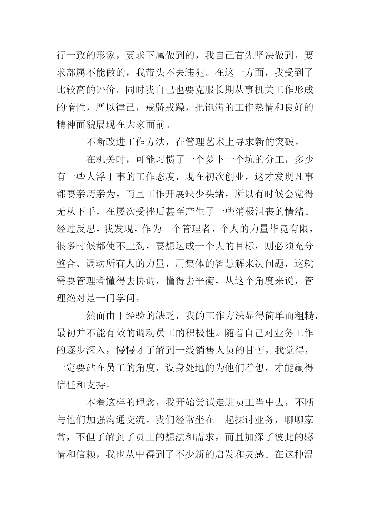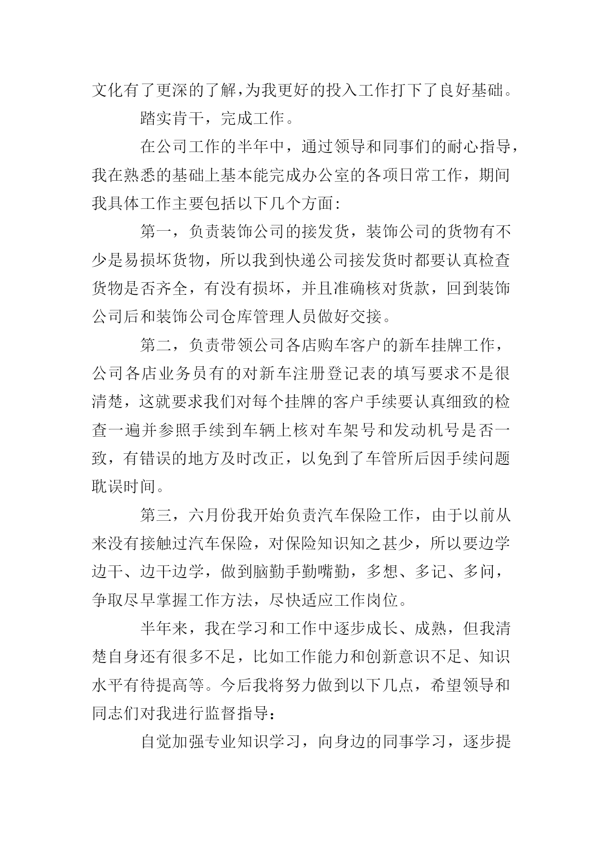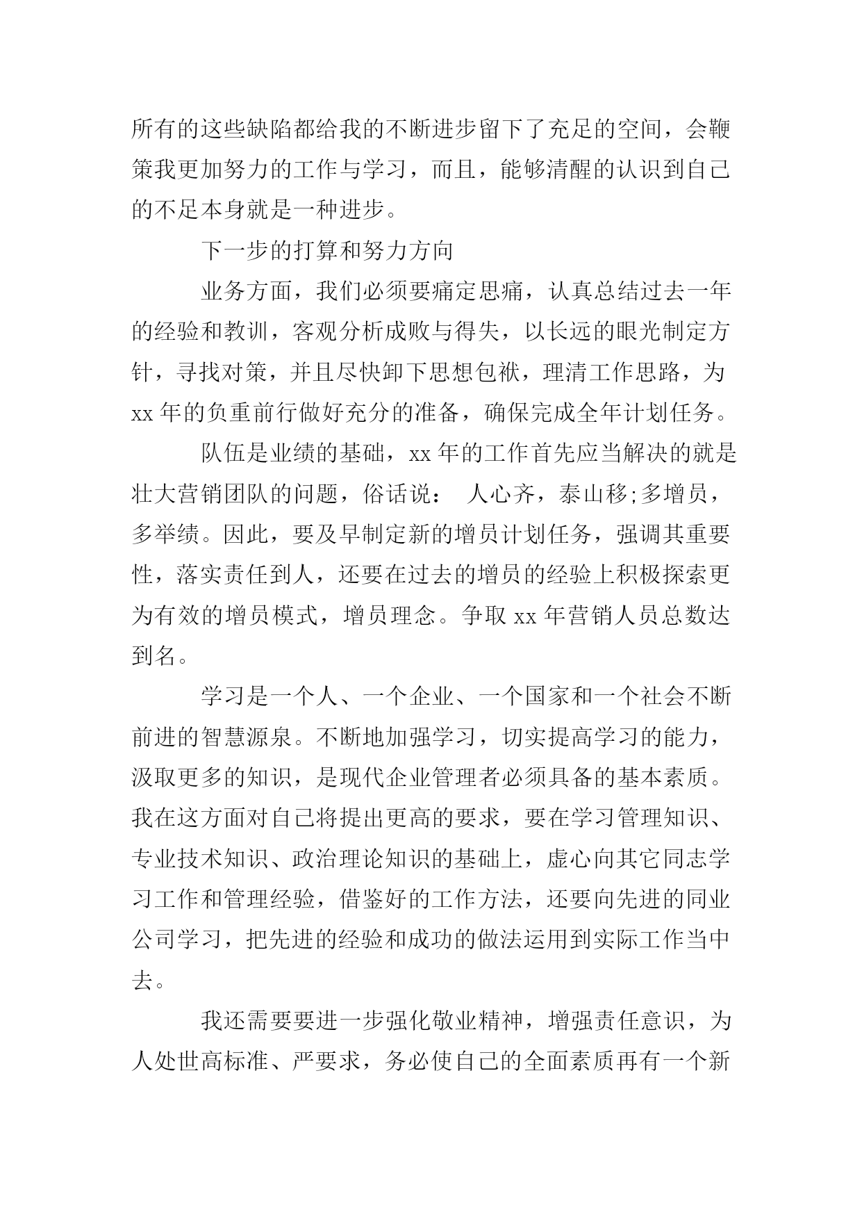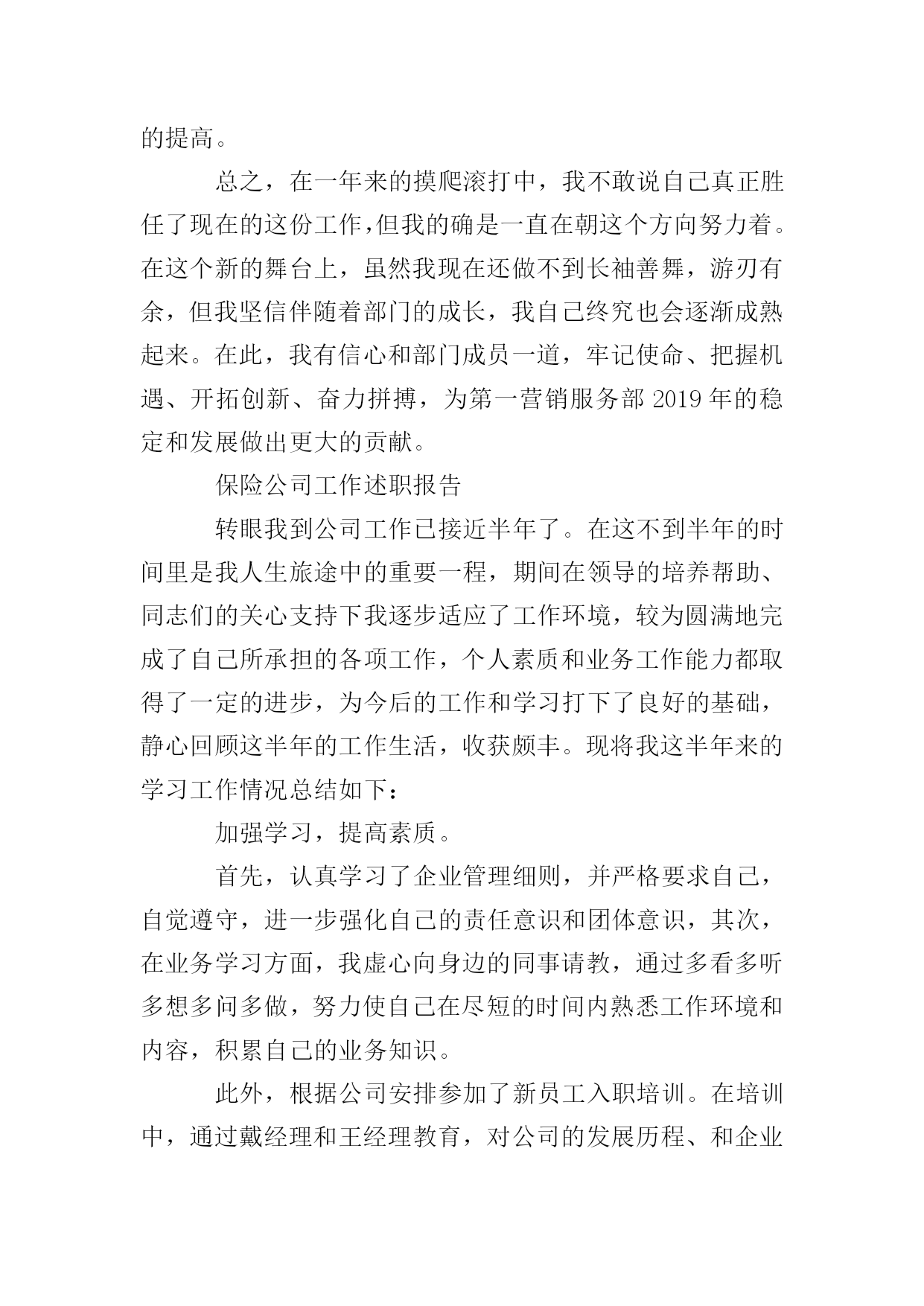 保险公司年终的述职报告时光如水,光阴似箭,充满机遇与挑战的xxxx年即将过去。一年来因为有了上级领导的正确领导,有了公司同仁的关心帮助,第一营销服务部各方面的工作均取得了可喜的成就,有了长足的进步。看到公司业务蒸蒸日上,我的内心感到无比欣慰和骄傲,因为这其中饱含着我们全体员工辛勤的劳动和汗水,是我们与时俱进,奋发有为精神风貌的体现,也是我们兢兢业业,齐心协力,迎难而上,扎实工作的结果。在这里我要感谢分公司能够给我这样一个开创事业的机会,可以让我亲身参与和见证一个新的部门的成长,我想一个人只有经过不断努力,不断奋斗,才能克服自身的缺点,才能不断超越自我,实现理想和人生的价值,这些经历对我今后的工作和生活来说都将是宝贵的财富。现就我自xx年12月任第一营销服务部经理助理以来所做的在主要工作向大家做一简要陈述,不妥之处请批评指证。深化思想认识,明确职责定位。我一直认为,干好工作的前提是不但要对自己的能力有客观的估量,而且对自己的岗位职责也要有相当清醒的认识。作为一名副职,我给自己的定位是:顾全大局,听服从安排,积极协助正职开展日常工作,此外要充分发挥主观能动性,为业务发展和内控管理出谋划策,同时不断提高自己个人的业务能力。有了这一明确的定位,在工作中我就完全可以做到有的放矢,张弛有度,全身心的投入。目前我和张经理的职能分工还不是很明确,下一步还需要再加以细化,这样才能避免出现职能死角,有效提升工作效率。努力学习政治、业务理论,不断提高业务素质和管理水平。进入保险公司多年,一直都是在从事机关工作,缺乏管理和一线销售的经验,新的工作岗位又要求我要尽快完成角色转换,能够在以前不太熟悉的领域有所建树。在实际工作中,其实有很多问题都不是很难解决,但恰恰是知识与经验上的不足使得我只能摸着石头过河,事倍功半。现代社会是一个快节奏,重能力的社会,稍有不慎就会被淘汰,我必须知耻而后勇,时刻心存危机感。因此一年来我几乎所有的业余时间都在学习和充电,营销、管理、策划、政治、法律、金融,我如饥似渴的补充一切有用的知识。为了能够胜任这个岗位,为了能够做出更大的成绩,为了以后不再出现书到用时方恨少的尴尬,我需要加倍的努力。在这个过程中,我清楚的意识到,干一份工作很容易,但想要干好就绝不是那么简单了。严格履行公司的各项规章制度和纪律要求。没有规矩,不成方圆,己所不欲,勿施于人。规范的制度,严明的纪律是我们一直都在强调的。作为管理人员,必然要在遵章守纪上做出表率。俗话说:喊破嗓子,不如做出样子,如果在台上说的是一套,在台下做的又是一套,就会对下属造成非常不好的影响。因此,任职以来,在日常工作中,我非常注重自身言行一致的形象,要求下属做到的,我自己首先坚决做到,要求部属不能做的,我带头不去违犯。在这一方面,我受到了比较高的评价。同时我自己也要克服长期从事机关工作形成的惰性,严以律己,戒骄戒躁,把饱满的工作热情和良好的精神面貌展现在大家面前。不断改进工作方法,在管理艺术上寻求新的突破。在机关时,可能习惯了一个萝卜一个坑的分工,多少有一些人浮于事的工作态度,现在初次创业,这才发现凡事都要亲历亲为,而且工作开展缺少头绪,所以有时候会觉得无从下手,在屡次受挫后甚至产生了一些消极沮丧的情绪。经过反思,我发现,作为一个管理者,个人的力量毕竟有限,很多时候都使不上劲,要想达成一个大的目标,则必须充分整合、调动所有人的力量,用集体的智慧解来决问题,这就需要管理者懂得去协调,懂得去平衡,从这个角度来说,管理绝对是一门学问。然而由于经验的缺乏,我的工作方法显得简单而粗糙,最初并不能有效的调动员工的积极性。随着自己对业务工作的逐步深入,慢慢才了解到一线销售人员的甘苦,我觉得,一定要站在员工的角度,设身处地的为他们着想,才能赢得信任和支持。本着这样的理念,我开始尝试走进员工当中去,不断与他们加强沟通交流。我们经常坐在一起探讨业务,聊聊家常,不但了解到了员工的想法和需求,而且加深了彼此的感情和信赖,我也从中得到了不少新的启发和灵感。在这种温馨的氛围中,部门上下变得就像一个大家庭一样,谁有了困难大家都会伸出援手,谁有了成绩大家都会为他喝彩,队伍变的更加团结,更加富有力量,这样工作也能够较为顺利的开展下去了。业务发展的基本情况以及存在的问题。年初,在分公司确定的一个目标,两个坚持,六个关键的总体思路指引下,我配合张经理对全年的工作做了周密的部署,从任务的下达、营销队伍的建设、新职场的筹备等方面,都做了详尽的规划,就目前来看,这些工作安排基本上都得到了落实,各方面的举措也均取得了一定的成效。分公司下达的168万计划任务已经提前一个月完成,全年力争冲刺180万;在册营销员已达四十余人,营销团队基本成形;新职场顺利搬迁,优越的办公环