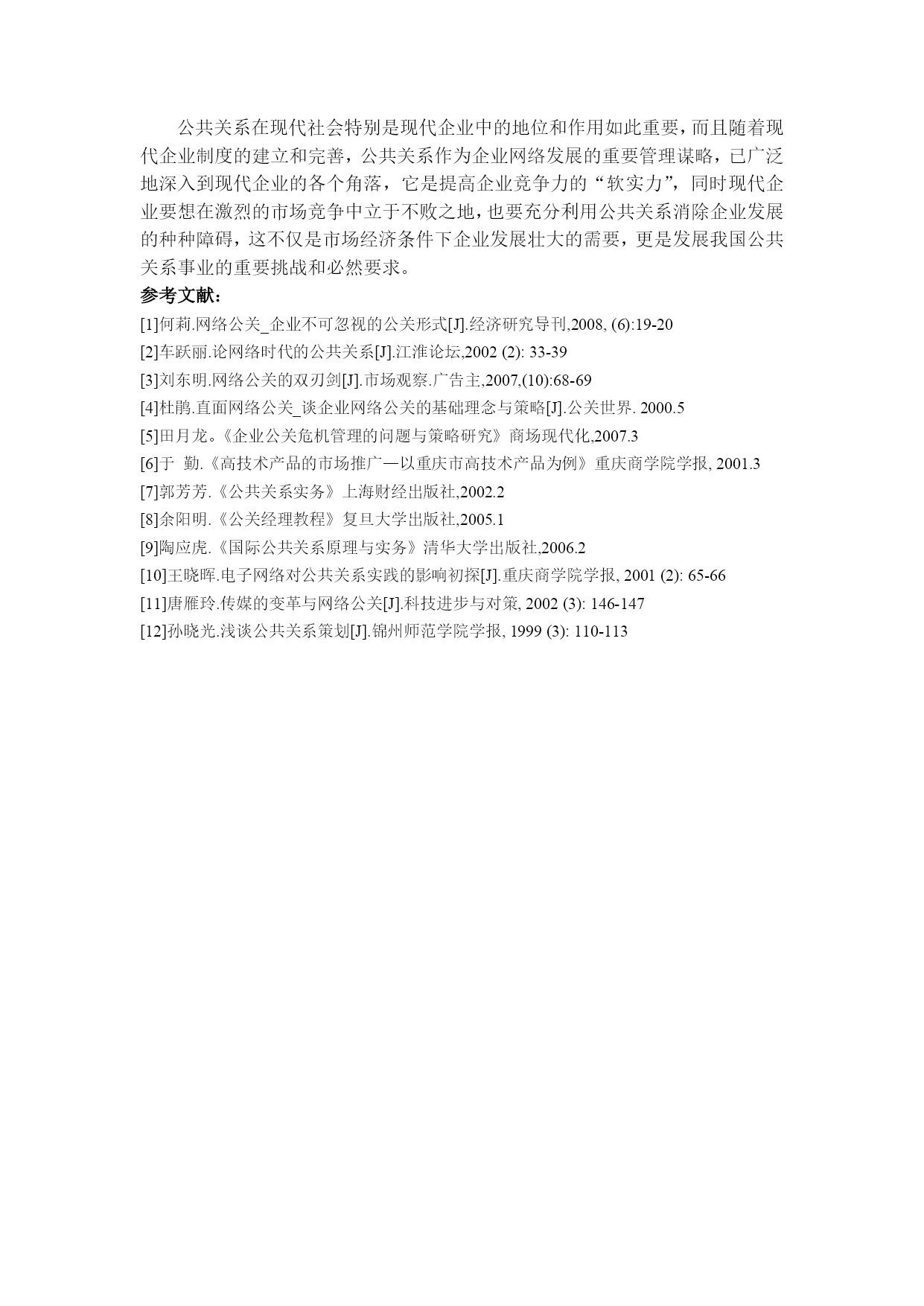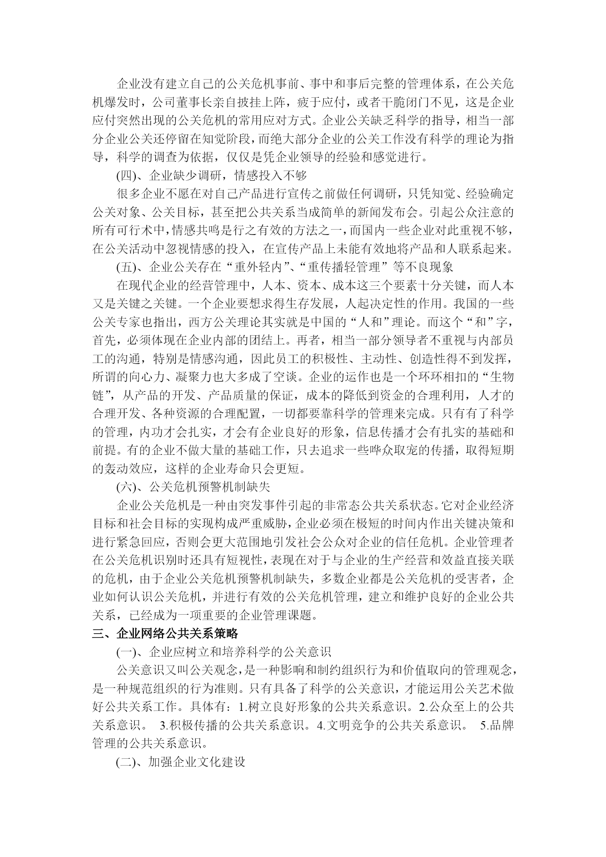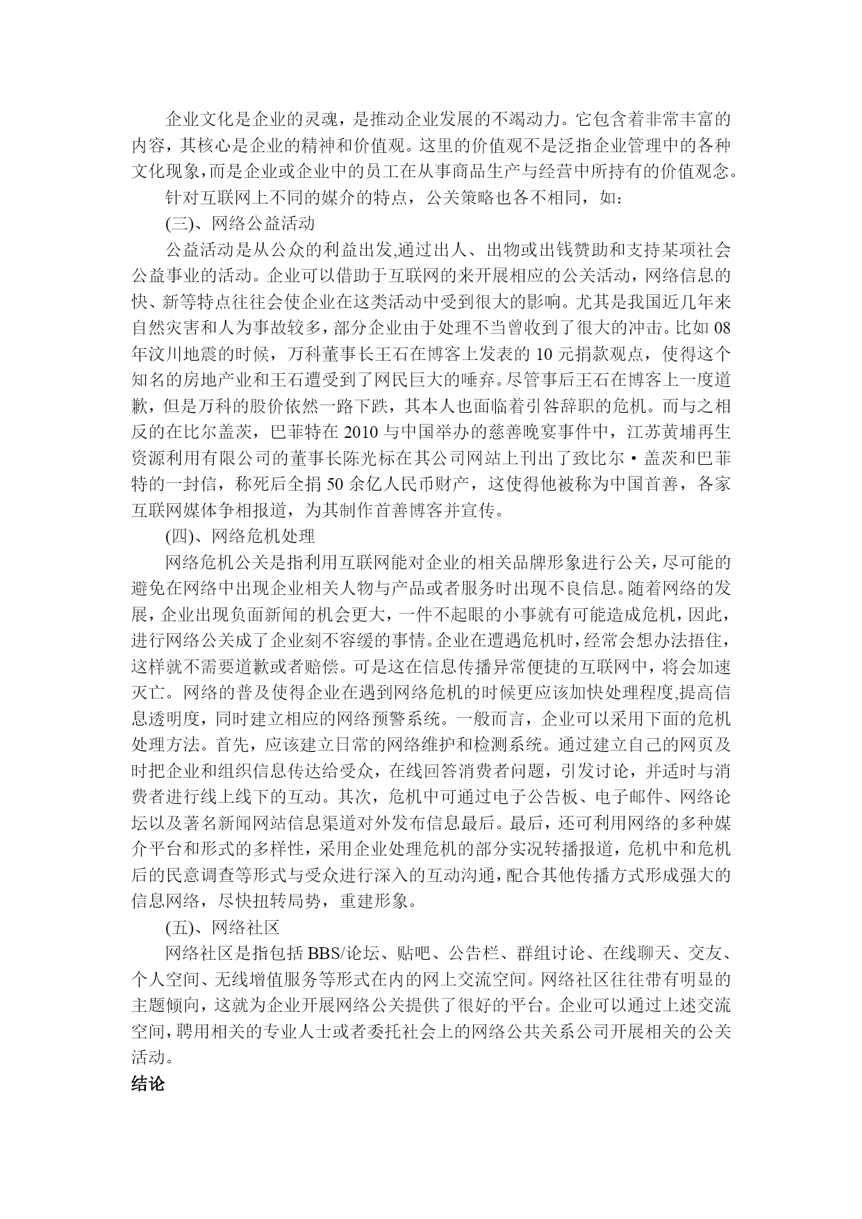 企业网络公共关系策略摘要:企业公共关系工作离不开传播媒介,传播媒介技术的每一次革命性进步都会给企业公共关系工作带来巨大的影响。互联网被称为继报刊、广播、电视等传统大众媒体之后新兴的第四媒体,它是传媒发展史上的一个新的里程碑,标志着一场传媒革命的到来,必将引起企业公共关系工作的巨大变革。由于公共关系策略在公共关系工作中起着灵魂作用,没有科学的公共关系策略就没有成功的公共关系工作。所以,在总结关于互联网的已有知识经验基础上,积极探索如何在互联网条件下以新的方式、新的策略开展企业公共关系工作无疑具有重要的理论和现实意义。关键字:企业网络;公共关系;策略一、企业网络公共关系及策略概念企业网络公共关系是指企业为了在激烈的市场竞争中寻求自身的生存空间与和谐的发展环境,通过借助国际互联网络,在电子空间中塑造企业形象,收集传递信息,同公众双向互动沟通,从而与公众结成的一种社会关系。从这个定义中我们可以看出,企业网络公共关系的组成主要有三大要素:企业组织、互联网络、网众。所以,没有上网的企业不可能开展网络公共关系,不具有上网能力的公众不可能成为网络公共关系传播沟通的对象。企业网络公共关系策略,“策略”一词在一般意义上是指为达到某种目的而采取的方法或手段。公共关系策略在公共关系工作中起着灵魂作用,没有科学的公共关系策略就没有成功的公共关系工作。所谓企业网络公共关系策略是指企业为完成特定的公共关系目标所采取的网络公共关系行动方案,它具体包括企业网站设计与推广策略、企业网络CIS策略、企业日常网络公关策略以及企业网络危机公关策略等内容。二、公共关系在企业网络发展中存在的问题(一)、对公共关系认识严重不足,重视不够很多人都程度不同地把公共关系与广告、宣传、人际关系、交际活动等相混淆,错误地认为公关就是“攻关”,就是陪客户、上级吃饭、搞接待或是送礼疏通关系,赋予了暧昧的含义。然而这种公关实质上是腐朽、庸俗的关系学在商业领域的反映,它不可能树立良好长久的信誉。有的人甚至还把我国传统社会中最腐朽、最庸俗的东西当成公共关系,把包装等同于公关形象,把知名度等同于以美誉度为核心的公关声誉,把以公众为中心理解成媚俗甚至迎合低级趣味,等等,不一而足,这些都极大地损害了公共关系的声誉,导致了对公共关系的错觉,极大地限制了公共关系作用的正常发挥。(二)、公关人才缺乏,企业公关意识薄弱企业基本上没有经过严格教育、培训的专业公关管理人才,处理公共关系还是依靠在实践中摸索的、有一定社会影响力的企业领导者来完成,容易造成公关管理的主观随意性和非专业性。(三)、公共关系管理体系存在缺陷,企业公关运作缺乏科学指导企业没有建立自己的公关危机事前、事中和事后完整的管理体系,在公关危机爆发时,公司董事长亲自披挂上阵,疲于应付,或者干脆闭门不见,这是企业应付突然出现的公关危机的常用应对方式。企业公关缺乏科学的指导,相当一部分企业公关还停留在知觉阶段,而绝大部分企业的公关工作没有科学的理论为指导,科学的调查为依据,仅仅是凭企业领导的经验和感觉进行。(四)、企业缺少调研,情感投入不够很多企业不愿在对自己产品进行宣传之前做任何调研,只凭知觉、经验确定公关对象、公关目标,甚至把公共关系当成简单的新闻发布会。引起公众注意的所有可行术中,情感共鸣是行之有效的方法之一,而国内一些企业对此重视不够,在公关活动中忽视情感的投入,在宣传产品上未能有效地将产品和人联系起来。(五)、企业公关存在“重外轻内”、“重传播轻管理”等不良现象在现代企业的经营管理中,人本、资本、成本这三个要素十分关键,而人本又是关键之关键。一个企业要想求得生存发展,人起决定性的作用。我国的一些公关专家也指出,西方公关理论其实就是中国的“人和”理论。而这个“和”字,首先,必须体现在企业内部的团结上。再者,相当一部分领导者不重视与内部员工的沟通,特别是情感沟通,因此员工的积极性、主动性、创造性得不到发挥,所谓的向心力、凝聚力也大多成了空谈。企业的运作也是一个环环相扣的“生物链”,从产品的开发、产品质量的保证,成本的降低到资金的合理利用,人才的合理开发、各种资源的合理配置,一切都要靠科学的管理来完成。只有有了科学的管理,内功才会扎实,才会有企业良好的形象,信息传播才会有扎实的基础和前提。有的企业不做大量的基础工作,只去追求一些哗众取宠的传播,取得短期的轰动效应,这样的企业寿命只会更短。(六)、公关危机预警机制缺失企业公关危机是一种由突发事件引起的非常态公共关系状态。它对企业经济目标和社会目标的实现构成严重威胁,企业必须在极短的时间内作出关键决策和进行紧急回应,否则会更大范围地引发社会公众对企业的信任危机。企业管理者在公关危机识别时还具有短视性,表现在对于与企业的生产经营和效益直接关联的危机,由于企业公关危机预警