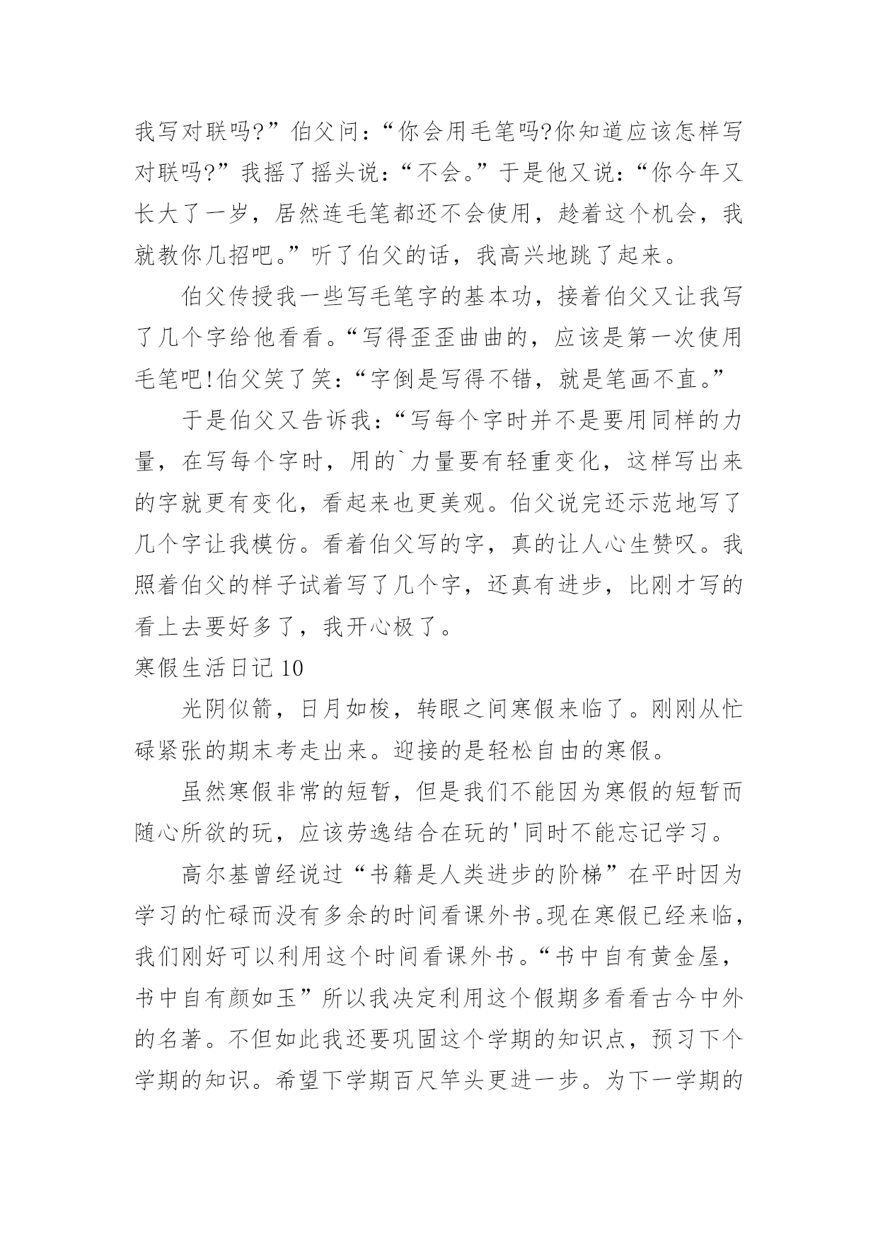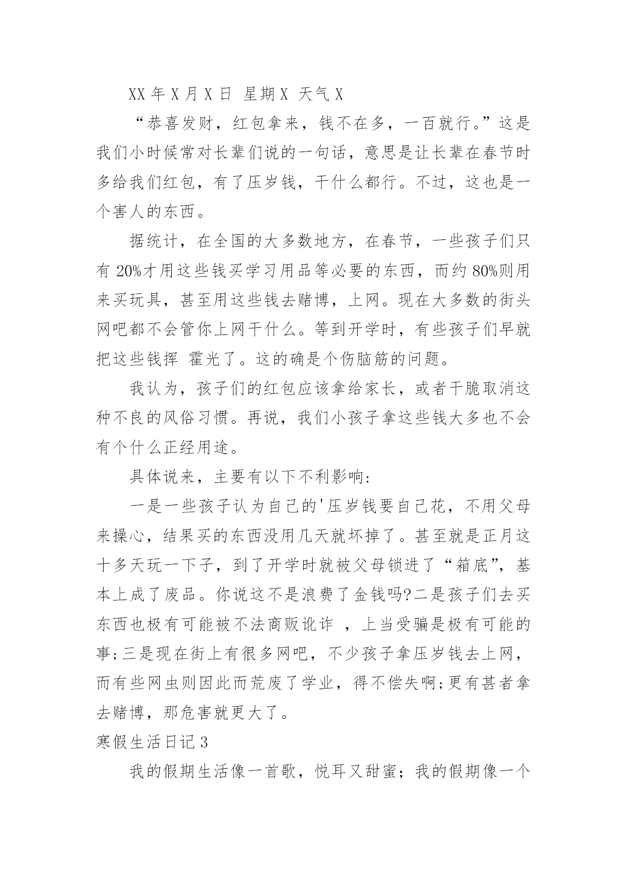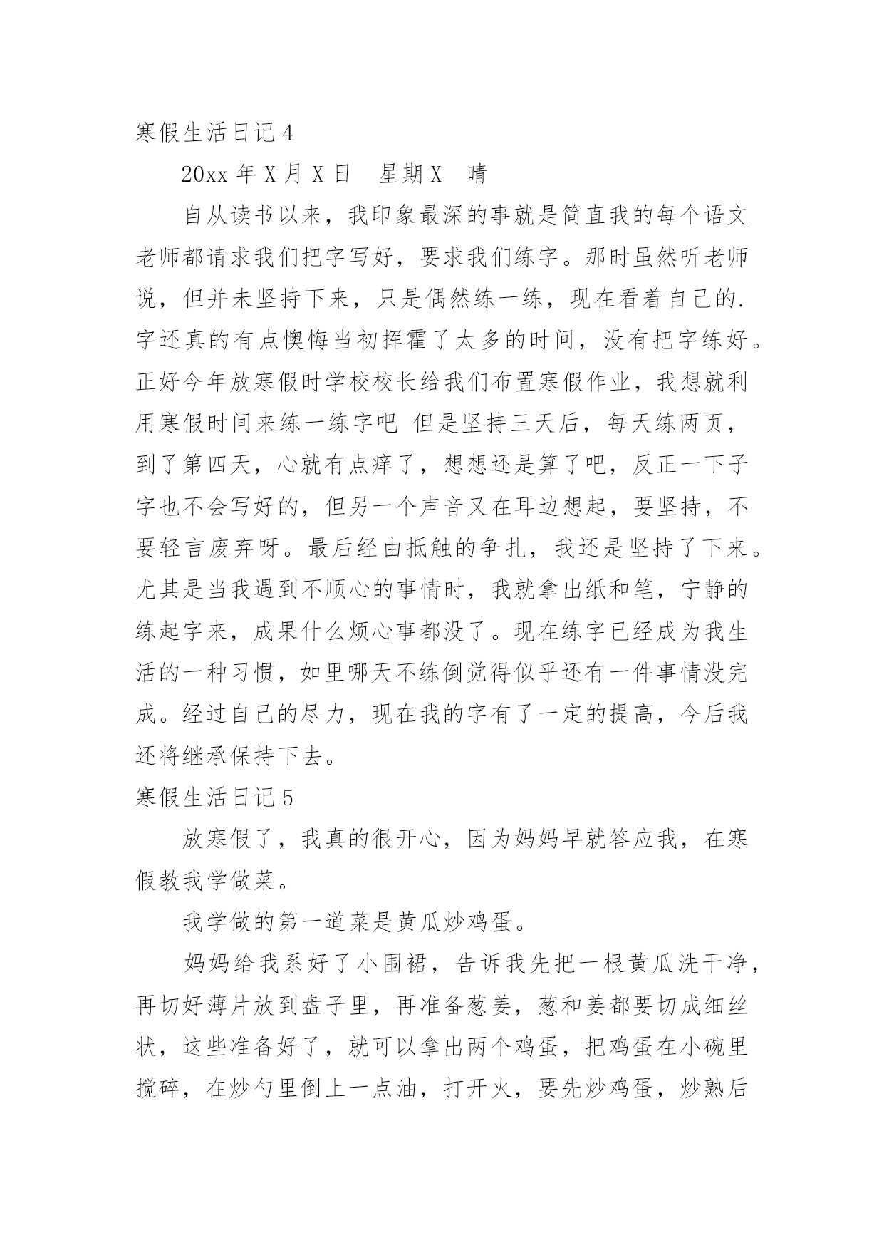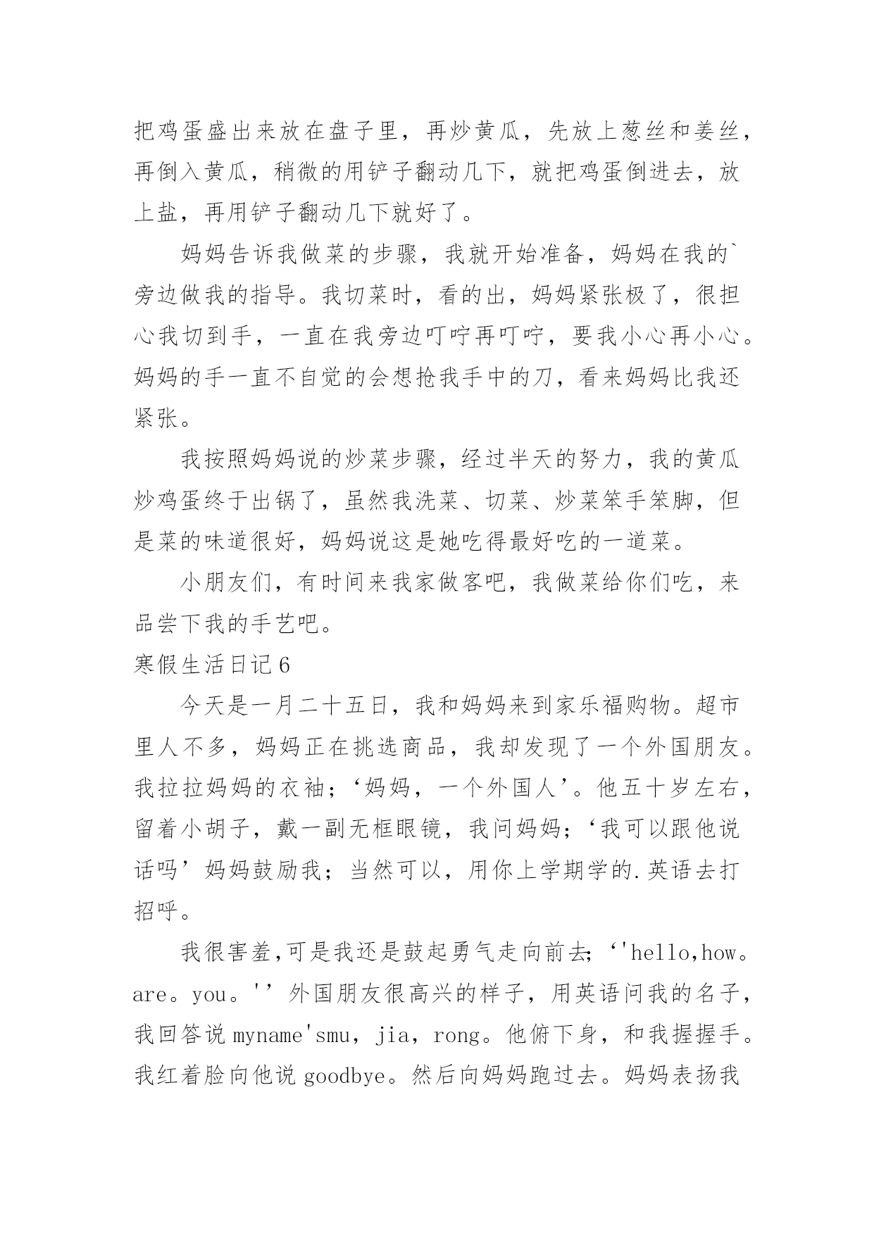 寒假生活日记寒假生活日记一天就要结束了,想必大家都学习了不少新知识,因此我们要写好日记了。日记写什么内容才新颖、丰富呢?以下是小编为大家整理的寒假生活日记,希望能够帮助到大家。寒假生活日记1盼望己久的寒假终于来了呀!我很开心,因为我不用很早就起床,可以轻松一下了。刚刚放假的第一天,我就和妈妈一起制定了寒假计划表,比如九点要起床,吃完饭后就要学习,语文,数学和英语的学习时间都是有规定的,妈妈上班,我就要按计划来做的。放假没过几天,春节就来了,今年我去了两个地方过年的,分别是在苏州乡下和丹阳外婆家过年。大年初一的习俗是要吃圆子的,两个地方都是一样的,但是在丹阳中午和晚上是要吃饺子的`,而且丹阳过年晚上是要敲锣打鼓。可热闹了,我很喜欢在丹阳过年。过年除了玩,但是妈妈还是带我去新华书店去买了下半学期的辅导书。还去看了新了《龙年大闯关》的电影,非常精彩。不知不觉,又要开学了,我在寒假里及时的完成了学校和妈妈布置的作业,过了一个丰富多彩的暑假生活。寒假生活日记2XX年X月X日星期X天气X“恭喜发财,红包拿来,钱不在多,一百就行。”这是我们小时候常对长辈们说的一句话,意思是让长辈在春节时多给我们红包,有了压岁钱,干什么都行。不过,这也是一个害人的东西。据统计,在全国的大多数地方,在春节,一些孩子们只有20%才用这些钱买学习用品等必要的东西,而约80%则用来买玩具,甚至用这些钱去赌博,上网。现在大多数的街头网吧都不会管你上网干什么。等到开学时,有些孩子们早就把这些钱挥霍光了。这的确是个伤脑筋的问题。我认为,孩子们的红包应该拿给家长,或者干脆取消这种不良的风俗习惯。再说,我们小孩子拿这些钱大多也不会有个什么正经用途。具体说来,主要有以下不利影响:一是一些孩子认为自己的'压岁钱要自己花,不用父母来操心,结果买的东西没用几天就坏掉了。甚至就是正月这十多天玩一下子,到了开学时就被父母锁进了“箱底”,基本上成了废品。你说这不是浪费了金钱吗?二是孩子们去买东西也极有可能被不法商贩讹诈,上当受骗是极有可能的事;三是现在街上有很多网吧,不少孩子拿压岁钱去上网,而有些网虫则因此而荒废了学业,得不偿失啊;更有甚者拿去赌博,那危害就更大了。寒假生活日记3我的假期生活像一首歌,悦耳又甜蜜;我的假期像一个顽童,每一天都是那么充实、快乐;我的假期像一个棒棒糖,每一天都是拿了甜。我的假期生活又像一个调味盒,有辣的,酸的`,甜的,苦的,各种各样的味道夹杂其中,真是丰富多彩。辣今天,我睁开朦胧的睡眼,伸了个懒腰,就去洗漱了。洗漱完成了,就去吃早饭,吃过早饭就要开始干活了,先擦玻璃,然后扫地、拖地,最后把桌椅和橱柜都擦干净了,花了整整一个小时才干完,累得我满头大汗。酸刚刚干完活,就传来了“噩耗”,妈妈又让我去爷爷家帮爷爷、奶奶收拾家。到了爷爷家,帮爷爷把祖宗供好,把供品摆上,把椅子摆好,地扫了,在把地拖了,我就已经“虚脱”了,累得我手脚麻木,没有一点力气。甜终于到中午了,爸爸、妈妈、姐姐都来到了爷爷家吃饭,并且把压岁钱给了我,还得到了爸爸、妈妈、爷爷、奶奶的表扬,心里美滋滋的。中午吃饭的时候,在一起谈家常,爷爷、奶奶把好吃的都给我,心里很开心。苦晚上回家,看着那没动过的作业,心里那个愁啊!可是面临开学不得不写啊!我的假期生活过的快乐而又精彩,充实而又高兴,过了这个假期我懂得了我们要去做一些有意义的事情。寒假生活日记420xx年X月X日星期X晴自从读书以来,我印象最深的事就是简直我的每个语文老师都请求我们把字写好,要求我们练字。那时虽然听老师说,但并未坚持下来,只是偶然练一练,现在看着自己的.字还真的有点懊悔当初挥霍了太多的时间,没有把字练好。正好今年放寒假时学校校长给我们布置寒假作业,我想就利用寒假时间来练一练字吧但是坚持三天后,每天练两页,到了第四天,心就有点痒了,想想还是算了吧,反正一下子字也不会写好的,但另一个声音又在耳边想起,要坚持,不要轻言废弃呀。最后经由抵触的争扎,我还是坚持了下来。尤其是当我遇到不顺心的事情时,我就拿出纸和笔,宁静的练起字来,成果什么烦心事都没了。现在练字已经成为我生活的一种习惯,如里哪天不练倒觉得似乎还有一件事情没完成。经过自己的尽力,现在我的字有了一定的提高,今后我还将继承保持下去。寒假生活日记5放寒假了,我真的很开心,因为妈妈早就答应我,在寒假教我学做菜。我学做的第一道菜是黄瓜炒鸡蛋。妈妈给我系好了小围裙,告诉我先把一根黄瓜洗干净,再切好薄片放到盘子里,再准备葱姜,葱和姜都要切成细丝状,这些准备好了,就可以拿出两个鸡蛋,把鸡蛋在小碗里搅碎,在炒勺里倒上一点油,打开火,要先炒鸡蛋,炒熟后把鸡蛋盛出来放在盘子里,再炒黄瓜,先放上葱丝和姜丝,再倒入黄瓜,稍微的用铲子翻动几下,就把鸡蛋倒进去,放上盐,再用铲子翻动几下就好了。妈妈告诉我做菜的步骤,