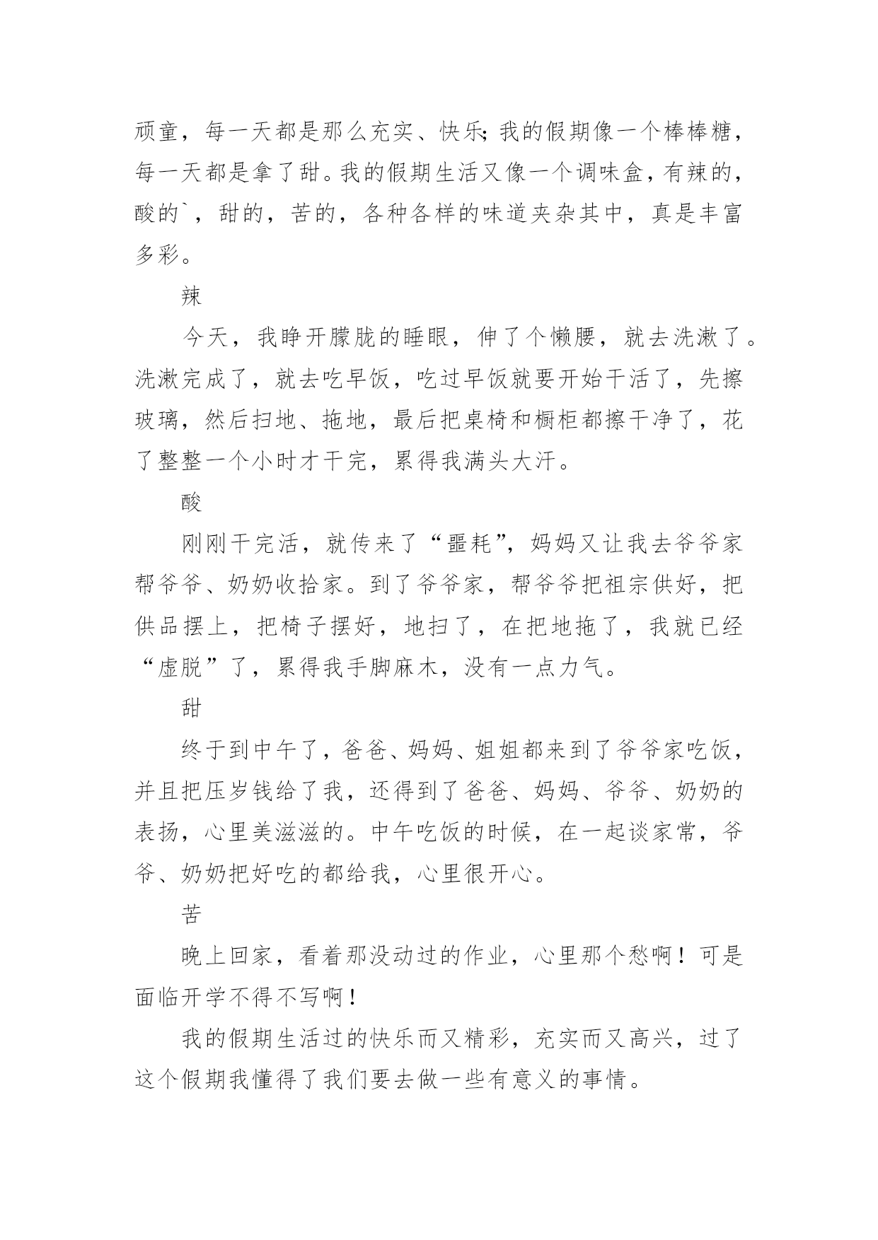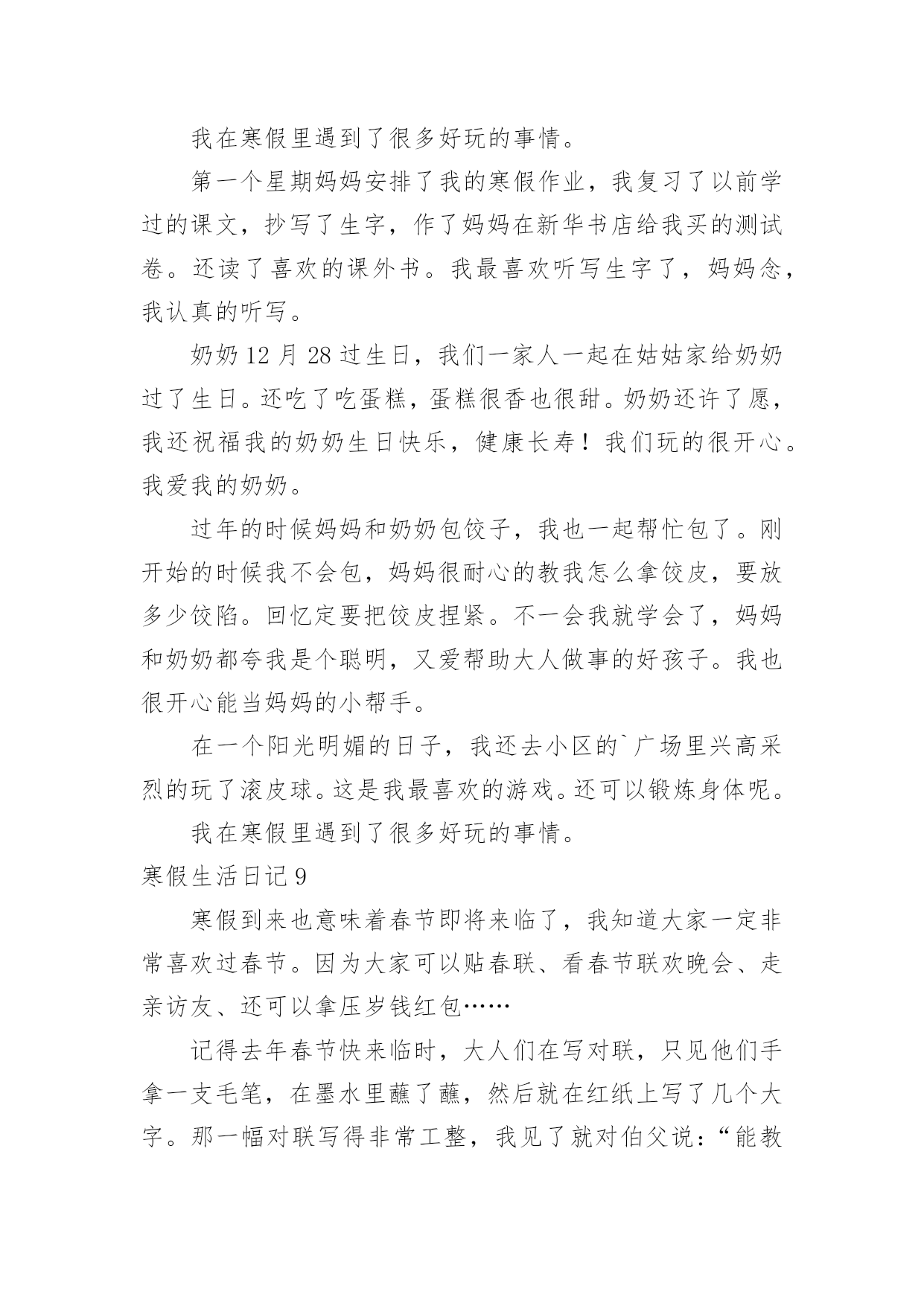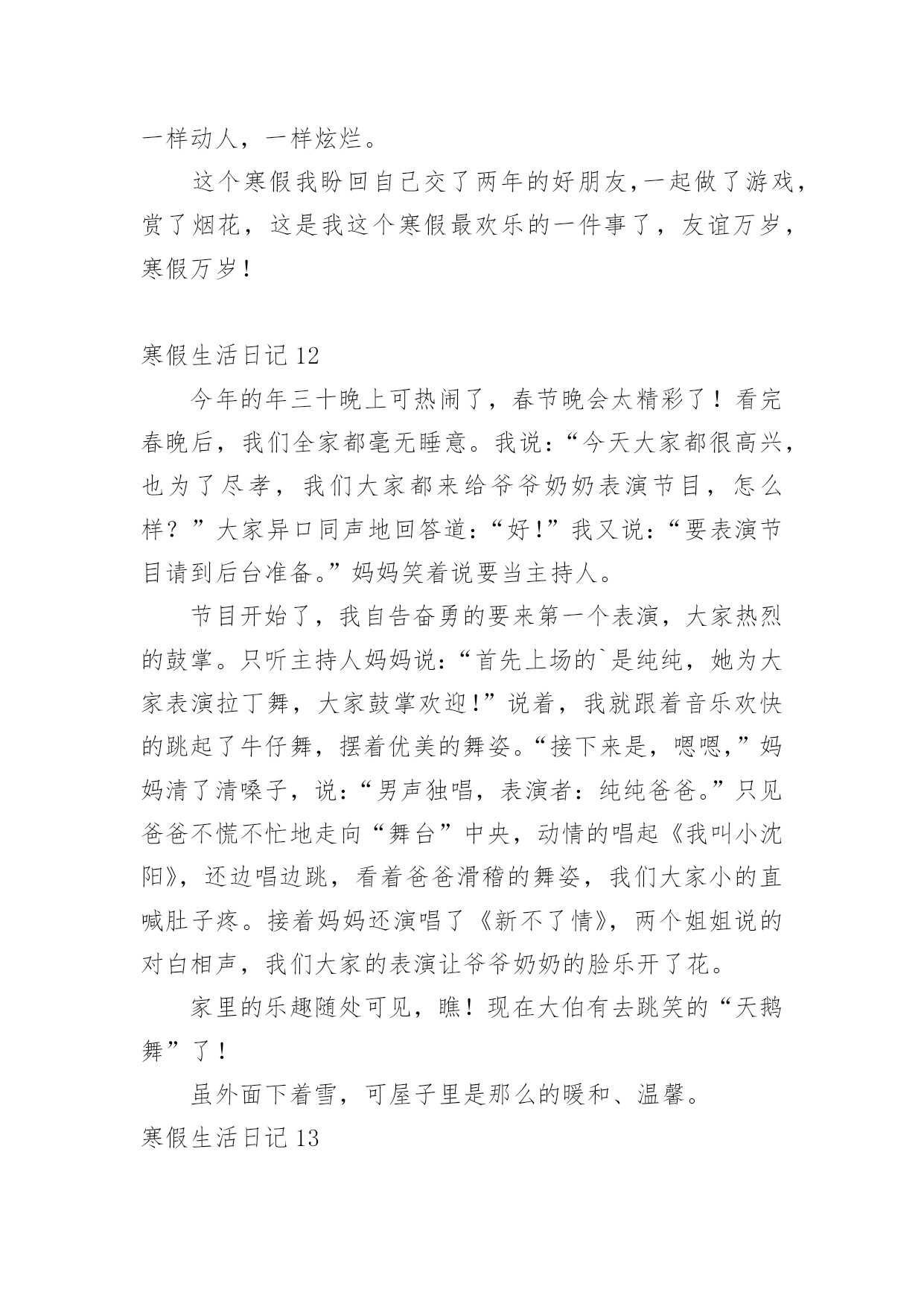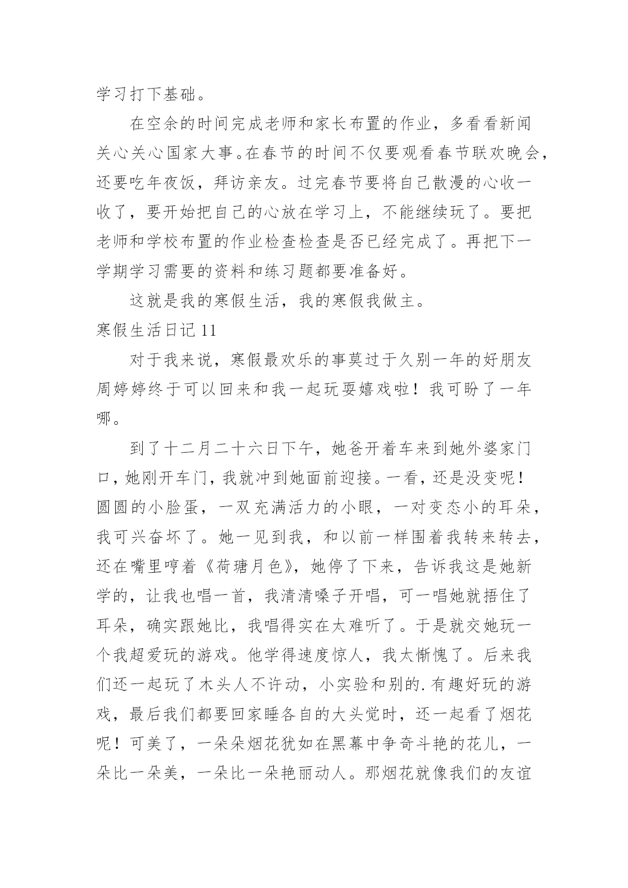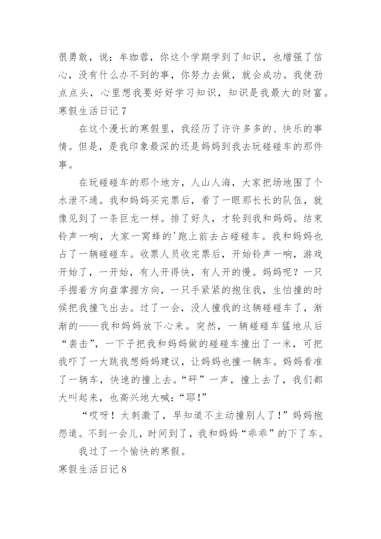 寒假生活日记寒假生活日记一天就要结束了,想必大家都学习了不少新知识,因此我们要写好日记了。日记写什么内容才新颖、丰富呢?以下是小编为大家整理的寒假生活日记,希望能够帮助到大家。寒假生活日记1盼望己久的寒假终于来了呀!我很开心,因为我不用很早就起床,可以轻松一下了。刚刚放假的第一天,我就和妈妈一起制定了寒假计划表,比如九点要起床,吃完饭后就要学习,语文,数学和英语的学习时间都是有规定的,妈妈上班,我就要按计划来做的。放假没过几天,春节就来了,今年我去了两个地方过年的,分别是在苏州乡下和丹阳外婆家过年。大年初一的习俗是要吃圆子的,两个地方都是一样的,但是在丹阳中午和晚上是要吃饺子的`,而且丹阳过年晚上是要敲锣打鼓。可热闹了,我很喜欢在丹阳过年。过年除了玩,但是妈妈还是带我去新华书店去买了下半学期的辅导书。还去看了新了《龙年大闯关》的电影,非常精彩。不知不觉,又要开学了,我在寒假里及时的完成了学校和妈妈布置的作业,过了一个丰富多彩的暑假生活。寒假生活日记2XX年X月X日星期X天气X“恭喜发财,红包拿来,钱不在多,一百就行。”这是我们小时候常对长辈们说的一句话,意思是让长辈在春节时多给我们红包,有了压岁钱,干什么都行。不过,这也是一个害人的东西。据统计,在全国的大多数地方,在春节,一些孩子们只有20%才用这些钱买学习用品等必要的东西,而约80%则用来买玩具,甚至用这些钱去赌博,上网。现在大多数的街头网吧都不会管你上网干什么。等到开学时,有些孩子们早就把这些钱挥霍光了。这的确是个伤脑筋的问题。我认为,孩子们的红包应该拿给家长,或者干脆取消这种不良的风俗习惯。再说,我们小孩子拿这些钱大多也不会有个什么正经用途。具体说来,主要有以下不利影响:一是一些孩子认为自己的'压岁钱要自己花,不用父母来操心,结果买的东西没用几天就坏掉了。甚至就是正月这十多天玩一下子,到了开学时就被父母锁进了“箱底”,基本上成了废品。你说这不是浪费了金钱吗?二是孩子们去买东西也极有可能被不法商贩讹诈,上当受骗是极有可能的事;三是现在街上有很多网吧,不少孩子拿压岁钱去上网,而有些网虫则因此而荒废了学业,得不偿失啊;更有甚者拿去赌博,那危害就更大了。寒假生活日记3我的假期生活像一首歌,悦耳又甜蜜;我的假期像一个顽童,每一天都是那么充实、快乐;我的假期像一个棒棒糖,每一天都是拿了甜。我的假期生活又像一个调味盒,有辣的,酸的`,甜的,苦的,各种各样的味道夹杂其中,真是丰富多彩。辣今天,我睁开朦胧的睡眼,伸了个懒腰,就去洗漱了。洗漱完成了,就去吃早饭,吃过早饭就要开始干活了,先擦玻璃,然后扫地、拖地,最后把桌椅和橱柜都擦干净了,花了整整一个小时才干完,累得我满头大汗。酸刚刚干完活,就传来了“噩耗”,妈妈又让我去爷爷家帮爷爷、奶奶收拾家。到了爷爷家,帮爷爷把祖宗供好,把供品摆上,把椅子摆好,地扫了,在把地拖了,我就已经“虚脱”了,累得我手脚麻木,没有一点力气。甜终于到中午了,爸爸、妈妈、姐姐都来到了爷爷家吃饭,并且把压岁钱给了我,还得到了爸爸、妈妈、爷爷、奶奶的表扬,心里美滋滋的。中午吃饭的时候,在一起谈家常,爷爷、奶奶把好吃的都给我,心里很开心。苦晚上回家,看着那没动过的作业,心里那个愁啊!可是面临开学不得不写啊!我的假期生活过的快乐而又精彩,充实而又高兴,过了这个假期我懂得了我们要去做一些有意义的事情。寒假生活日记420xx年X月X日星期X晴自从读书以来,我印象最深的事就是简直我的每个语文老师都请求我们把字写好,要求我们练字。那时虽然听老师说,但并未坚持下来,只是偶然练一练,现在看着自己的.字还真的有点懊悔当初挥霍了太多的时间,没有把字练好。正好今年放寒假时学校校长给我们布置寒假作业,我想就利用寒假时间来练一练字吧但是坚持三天后,每天练两页,到了第四天,心就有点痒了,想想还是算了吧,反正一下子字也不会写好的,但另一个声音又在耳边想起,要坚持,不要轻言废弃呀。最后经由抵触的争扎,我还是坚持了下来。尤其是当我遇到不顺心的事情时,我就拿出纸和笔,宁静的练起字来,成果什么烦心事都没了。现在练字已经成为我生活的一种习惯,如里哪天不练倒觉得似乎还有一件事情没完成。经过自己的尽力,现在我的字有了一定的提高,今后我还将继承保持下去。寒假生活日记5放寒假了,我真的很开心,因为妈妈早就答应我,在寒假教我学做菜。我学做的第一道菜是黄瓜炒鸡蛋。妈妈给我系好了小围裙,告诉我先把一根黄瓜洗干净,再切好薄片放到盘子里,再准备葱姜,葱和姜都要切成细丝状,这些准备好了,就可以拿出两个鸡蛋,把鸡蛋在小碗里搅碎,在炒勺里倒上一点油,打开火,要先炒鸡蛋,炒熟后把鸡蛋盛出来放在盘子里,再炒黄瓜,先放上葱丝和姜丝,再倒入黄瓜,稍微的用铲子翻动几下,就把鸡蛋倒进去,放上盐,再用铲子翻动几下就好了。妈妈告诉我做菜的步骤,