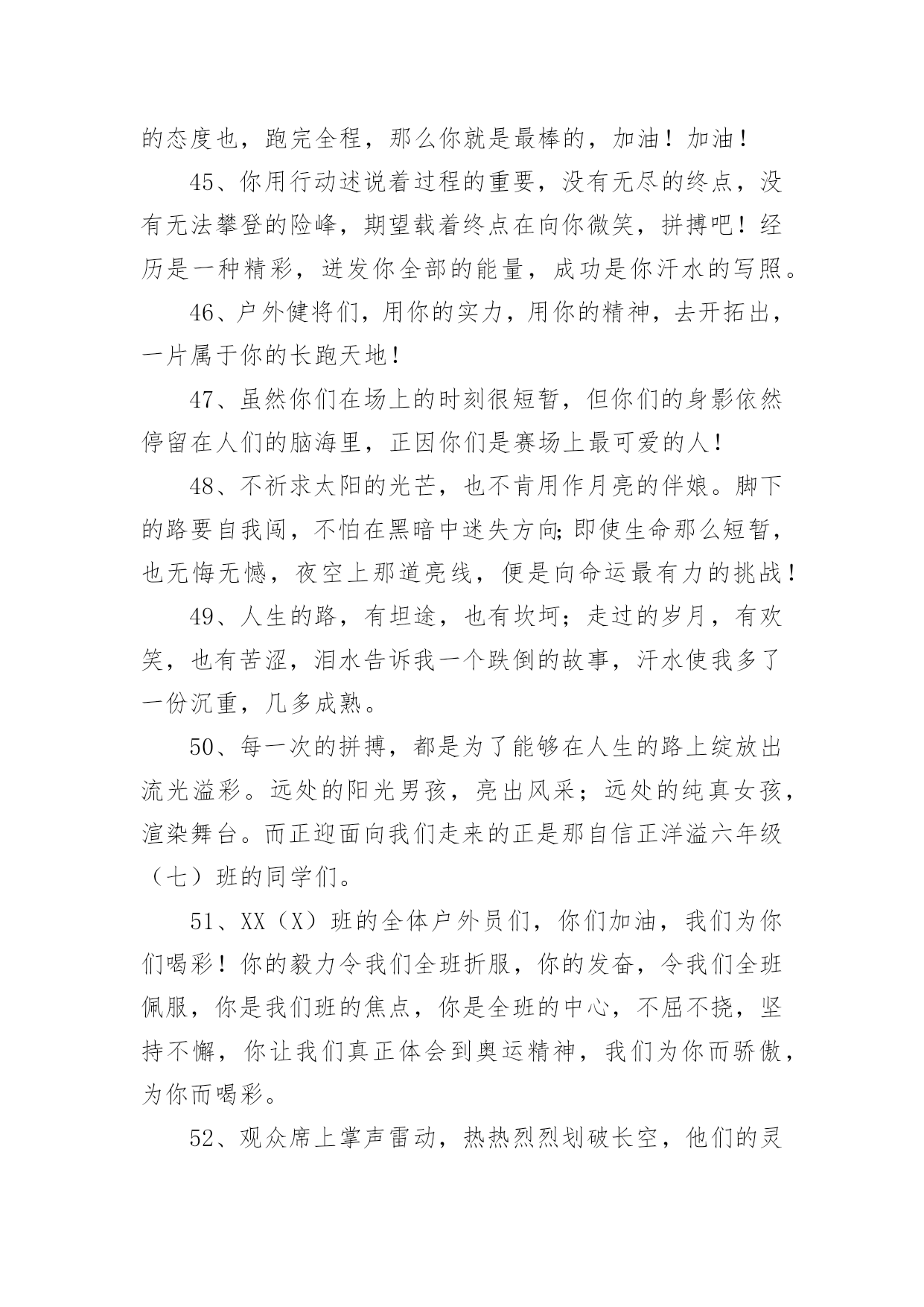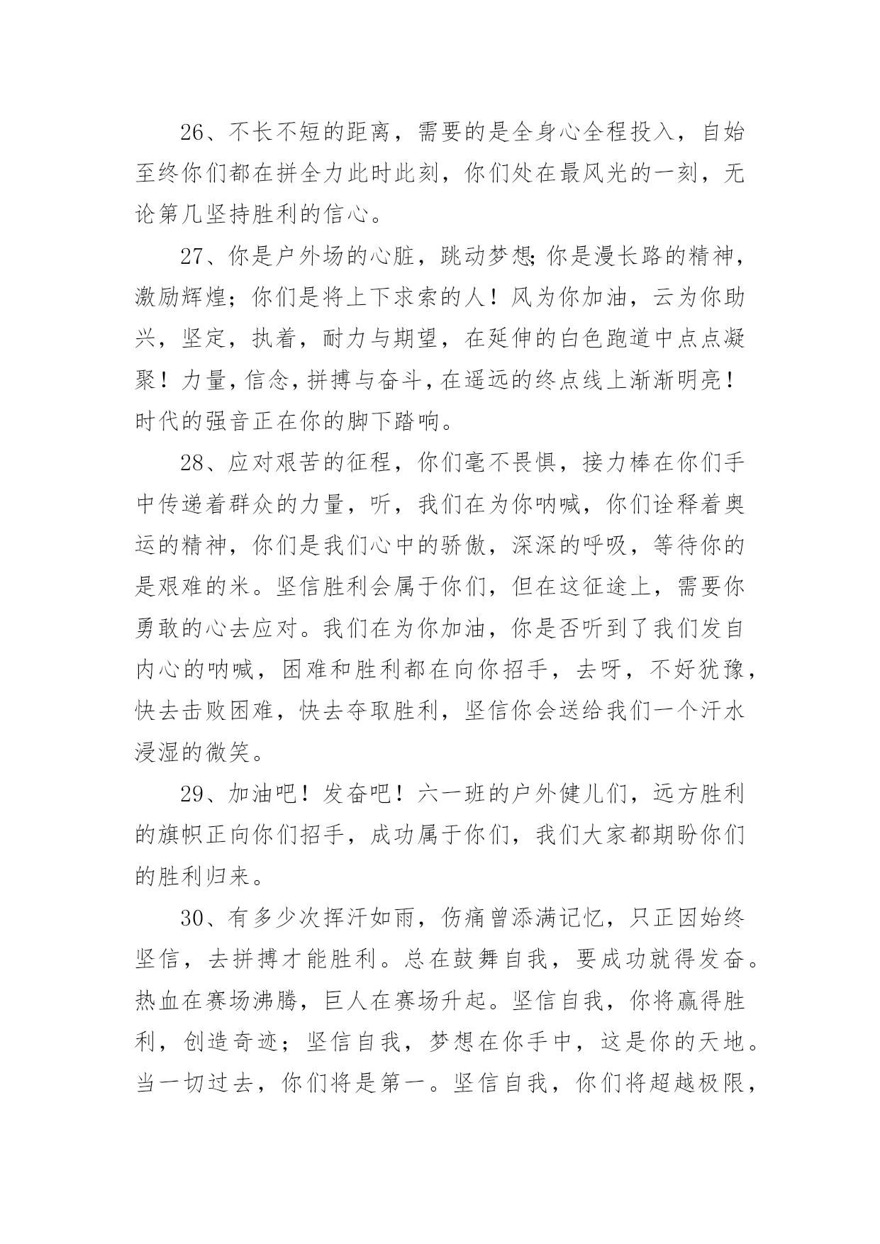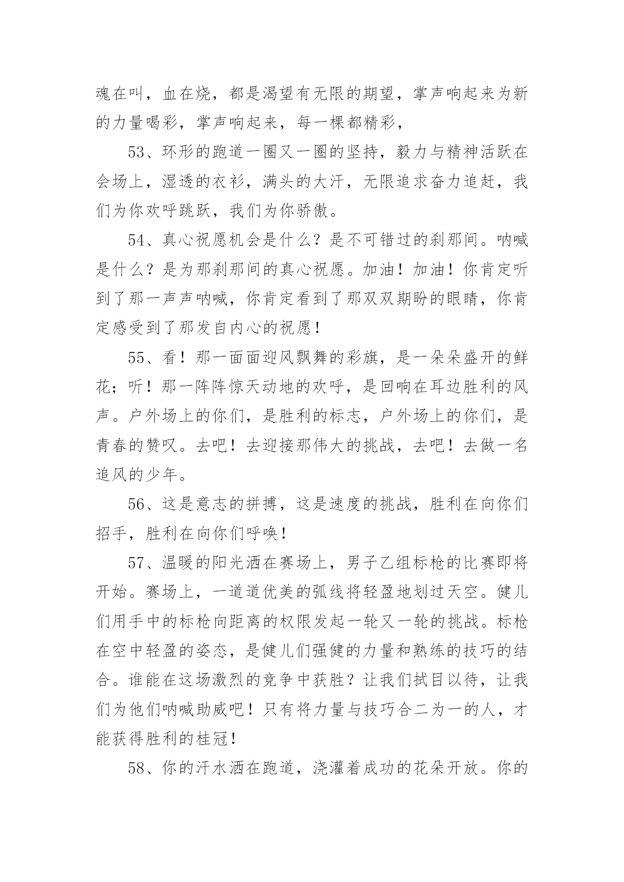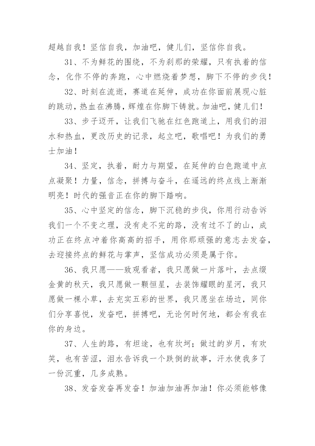 运动会加油稿运动会加油稿汇总15篇在学习、工作生活中,能够利用到加油稿的场合越来越多,借助加油稿可以表达对对方的鼓励和支持。为了让您在写加油稿时更加简单方便,下面是小编为大家整理的运动会加油稿,欢迎大家借鉴与参考,希望对大家有所帮助。运动会加油稿1人生的路,有坦途,也有坎坷;走过的岁月,有欢笑,也有苦涩。泪水告诉我一个跌倒的故事,汗水使我多了一分沉重,几多成熟。理想毕竟不同于现实,失败是生活的一部分,谁也无法选择,无法拒绝。人生要自己去拼搏,去奋斗,在风雨中百折不挠、勇往直前,在自己的每个驿站都留下一段无悔的回忆。流泪不是失落,徘徊不是迷惑,成功属于那些战胜失败,坚持不懈,勇于追求梦想的.人。朝阳用金色的光华洗亮跑道,掌声是潮起潮落的欢歌,惊喜的目光里,盛满了对运动健儿的赞叹。运动会加油稿2努力、努力、再努力!加油、加油、再加油!你一定可以像苍龙一样,光耀九州,也可以像孤鹰一样翱翔世界,相信自己。超越自我,胜利永远属于努力的拼搏的你!他们朝气蓬勃,勇往直前;他们同甘共苦,团结一心,不一样的脚步,同一样的声音,是他们团结的心声在召唤。我们的运动健儿,摩拳擦掌,跃跃欲试,要在运动场上一显身手,互论短长。运动场上,显露竞争精神,展现我辈英雄本色;运动场下,友谊第一,比赛第二;增进感情,健身才可以健康。运动健儿最漂亮!青春是不老的誓言,飞扬是年轻的梦想,金色的十月,让我们在这长长的跑道上青春飞扬,现出飒爽的风姿,亮出真我的.风采,带上同学们的热情,载着同伴们的期望,背负老师的嘱托,在这活力四射的校园里,放飞你的青春活力和运动激情。运动会加油稿31、时刻在流逝,赛道在延伸,成功在你面前展现。心脏的跳动,热血在沸腾,辉煌在你脚下铸就加油吧,健儿们!2、青春的脚步,青春的速度,青春的活力,青春的激情,将会在你们的身上尽情体现。迎接自我,挑战自我,战胜自我!我们坚信你们必须能行,加油吧,户外员!终点就在眼前!3、也许流星并不少见,但它燃烧的刹那,留给人间最美丽的回忆!也许笑脸并不少见,但胜利的喜悦,总会留给世界精彩的一瞬!是的,那些以前美妙的东西只有短短的一瞬间,但那却把最辉煌的一刻留给了人间。胜利,是每个人所追求的,胜利的喜悦,是胜利与重新开始的转折,胜利是新的开始!4、在黑白相间的跑道上,留下了你们灿烂的身影。在枪响的那一刹那,似流星似闪电,如骏马奔腾,如蛟龙腾空,如猛虎出洞,不在乎名次高低,不在乎成绩高下。发奋拼搏,顽强奋斗,即使落后,也顽强不屈,永不退缩!5、虽然你们在场上的时刻很短暂,但你们的身影依然停留在人们的脑海里,正因你们是赛场上最可爱的人。6、你的汗水洒在跑道,浇灌着成功的花朵开放;你的欢笑飞扬在赛场,为班争光数你最棒;跑吧,追吧,在这广阔的赛场上,你似骏马似离铉的箭;跑吧,追吧,你比虎猛比豹强。7、这天的你们英姿飒爽,这天的你们一马当先。不好放下,不好气馁。坚信自我,你是最棒的!你永远都是我们心中的体育健儿!加油!8、理想毕竟不一样于现实,失败是生活的一部分,谁也无法选取,无法拒绝。人生要自我去拼搏,去奋斗,在风雨中百折不挠勇往前进,在集资的每个驿站上都留下一段不悔的回忆。流泪不是失落,徘徊不是迷惑,成功属于那些战胜失败,坚持不懈勇于追求梦想的人。加油吧,户外健儿们!9、血液为你们而沸腾,声音为你们而呐喊。太阳为你们而耀眼,我们为你们而欢呼。掌声为你们而响起,加油!10、广阔的绿茵场,是为你们搭建的舞台。张扬吧,年轻的心,我们将为你永远喝彩!11、户外健将们,用你的实力,用你的精神,去开拓出,一片属于你的长跑天地。12、一根小小的木棒,连接的是团结和友爱;一根小小的木棒,传递的是勇气和力量;一根小小的木棒,演绎的是奋斗和拼搏;加油吧!让这激动人心的时刻,一向回荡在我们心中!13、户外场上有你们的飒爽英姿,户外场上有你们拼搏的身影,应对漫漫的征程,你没有畏惧和退缩,任汗水打湿脊背,任疲惫爬满全身,依然奋力追赶,只有一个目标,只有一个信念,为班级赢得荣誉,拼搏吧,我为你们呐喊,加油!14、就像花儿准备了春秋冬,就是为了红透整个盛夏。就像雪花经历了春夏秋就是为了洁白整个严冬。蹲下,昂首,出发……轻轻的一抬脚,便牵动了全场的目光。潇洒的挥挥手,便满足了那一份无言的等待。迎着朝阳,你们踏歌而去,背着期望,我们等待你们的归来。15、说你必须要赢,也必须会赢。枪声响了,四百米,九秒却又相几个世纪,你喊着跑着,迈开大步,跨过世纪。16、踏上跑道,是一种选取。离开起点,是一种勇气。驰骋赛场,是一种胜利。17、你和红色的地面有个约定,那上方,总有你奔跑的身影;你与绿色的草坪有个约定,那上方,浸着你辛劳的汗渍。你与我们有个约定,18、看,终点就在眼前;听,同学为你呼喊。鼓起勇气奋力向前,用你的荣誉带给我们期望。19、广阔的绿茵场,是为你们搭