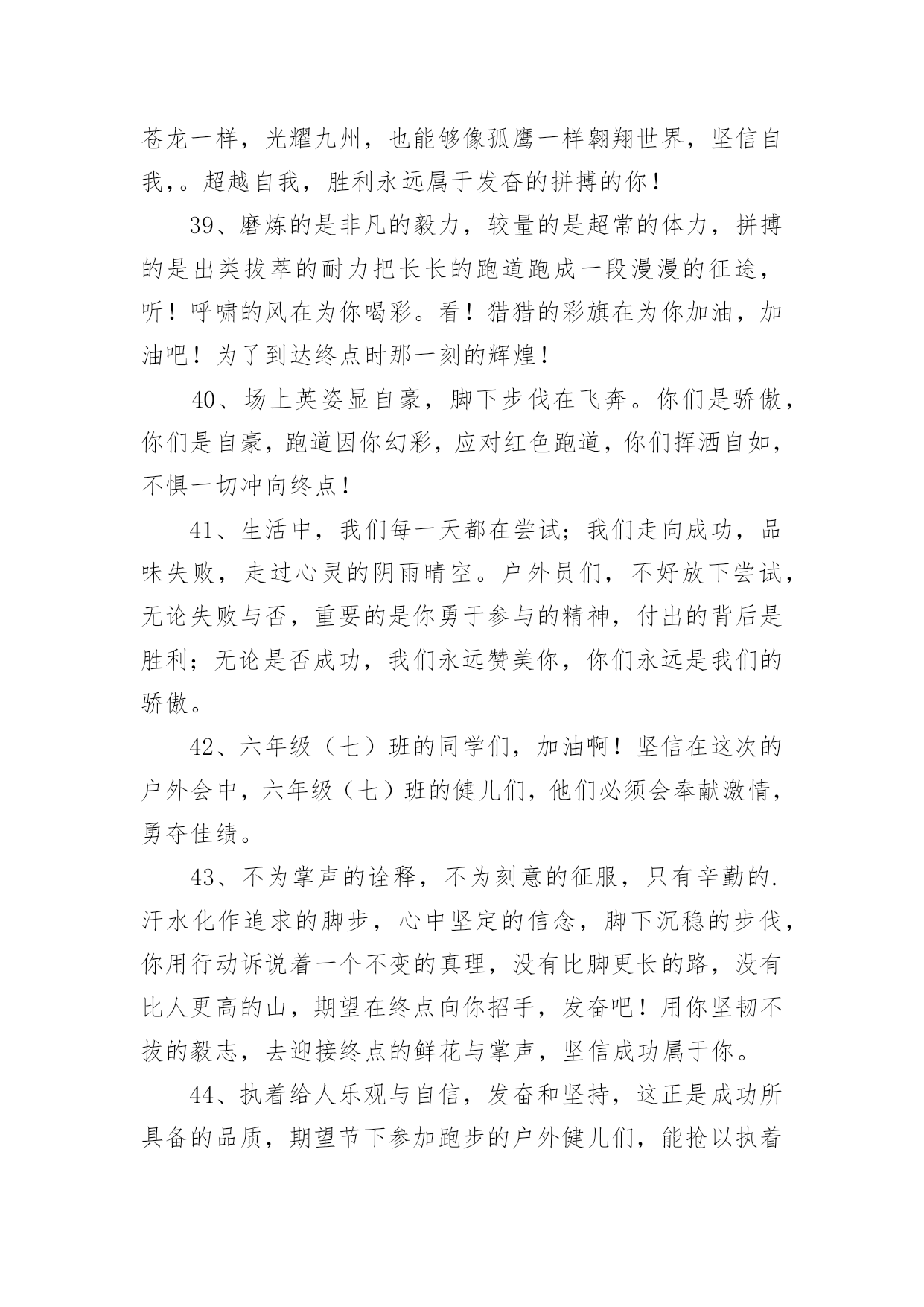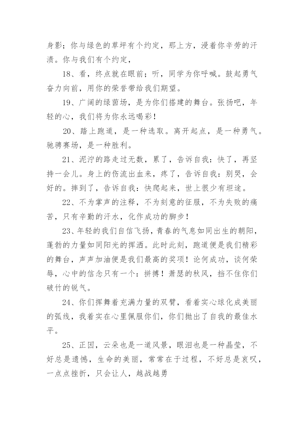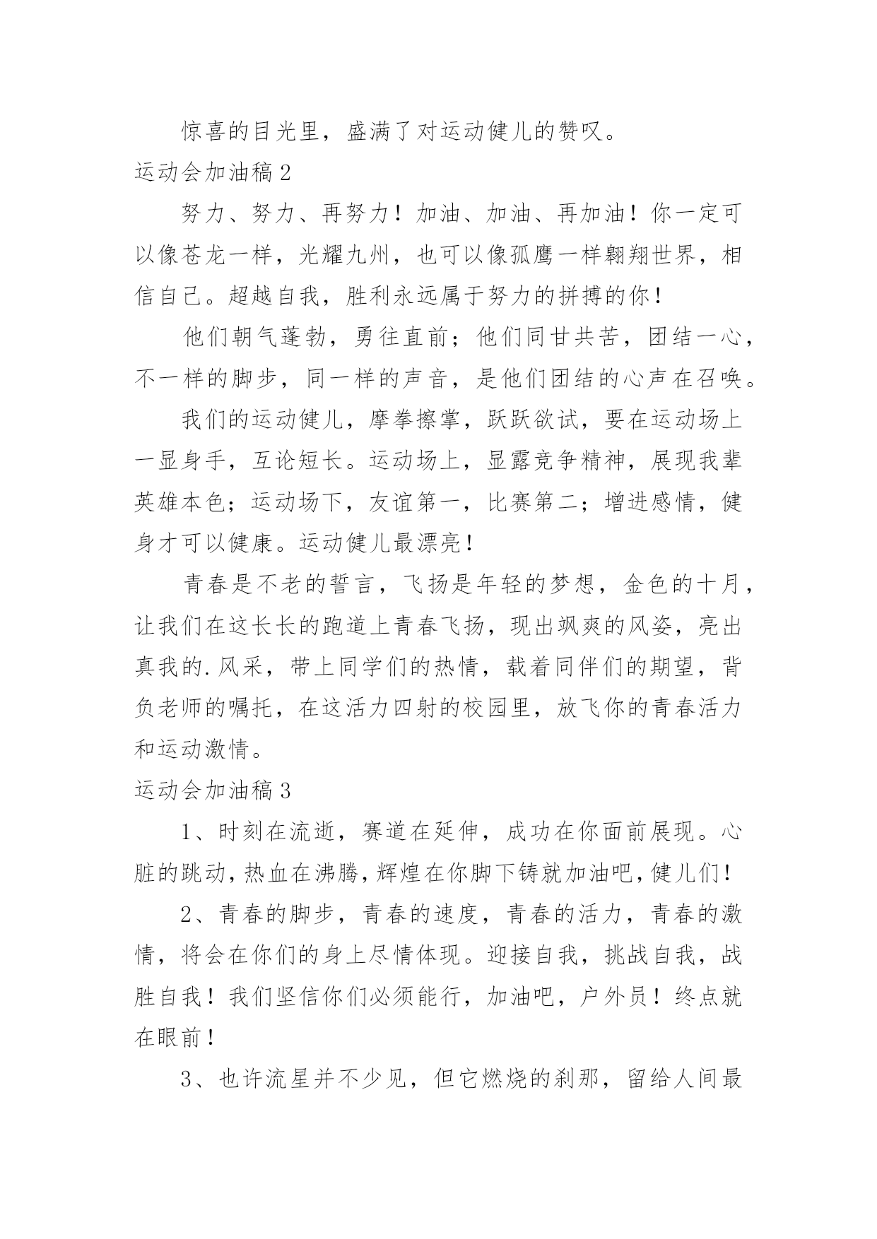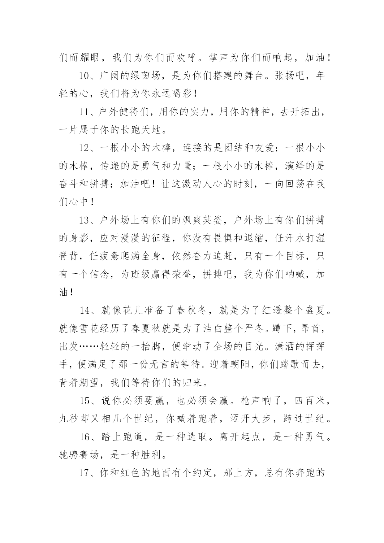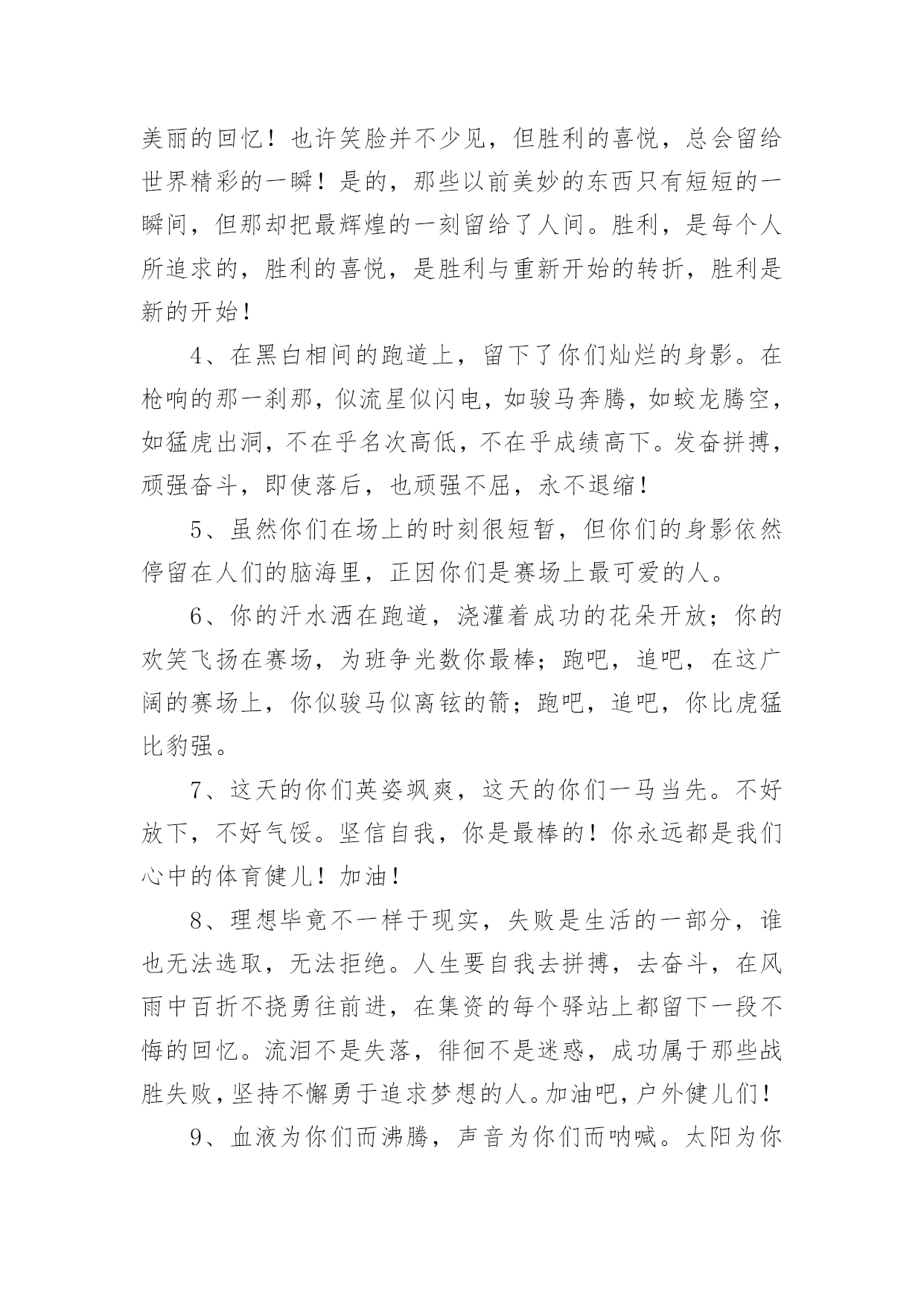 运动会加油稿运动会加油稿汇总15篇在学习、工作生活中,能够利用到加油稿的场合越来越多,借助加油稿可以表达对对方的鼓励和支持。为了让您在写加油稿时更加简单方便,下面是小编为大家整理的运动会加油稿,欢迎大家借鉴与参考,希望对大家有所帮助。运动会加油稿1人生的路,有坦途,也有坎坷;走过的岁月,有欢笑,也有苦涩。泪水告诉我一个跌倒的故事,汗水使我多了一分沉重,几多成熟。理想毕竟不同于现实,失败是生活的一部分,谁也无法选择,无法拒绝。人生要自己去拼搏,去奋斗,在风雨中百折不挠、勇往直前,在自己的每个驿站都留下一段无悔的回忆。流泪不是失落,徘徊不是迷惑,成功属于那些战胜失败,坚持不懈,勇于追求梦想的.人。朝阳用金色的光华洗亮跑道,掌声是潮起潮落的欢歌,惊喜的目光里,盛满了对运动健儿的赞叹。运动会加油稿2努力、努力、再努力!加油、加油、再加油!你一定可以像苍龙一样,光耀九州,也可以像孤鹰一样翱翔世界,相信自己。超越自我,胜利永远属于努力的拼搏的你!他们朝气蓬勃,勇往直前;他们同甘共苦,团结一心,不一样的脚步,同一样的声音,是他们团结的心声在召唤。我们的运动健儿,摩拳擦掌,跃跃欲试,要在运动场上一显身手,互论短长。运动场上,显露竞争精神,展现我辈英雄本色;运动场下,友谊第一,比赛第二;增进感情,健身才可以健康。运动健儿最漂亮!青春是不老的誓言,飞扬是年轻的梦想,金色的十月,让我们在这长长的跑道上青春飞扬,现出飒爽的风姿,亮出真我的.风采,带上同学们的热情,载着同伴们的期望,背负老师的嘱托,在这活力四射的校园里,放飞你的青春活力和运动激情。运动会加油稿31、时刻在流逝,赛道在延伸,成功在你面前展现。心脏的跳动,热血在沸腾,辉煌在你脚下铸就加油吧,健儿们!2、青春的脚步,青春的速度,青春的活力,青春的激情,将会在你们的身上尽情体现。迎接自我,挑战自我,战胜自我!我们坚信你们必须能行,加油吧,户外员!终点就在眼前!3、也许流星并不少见,但它燃烧的刹那,留给人间最美丽的回忆!也许笑脸并不少见,但胜利的喜悦,总会留给世界精彩的一瞬!是的,那些以前美妙的东西只有短短的一瞬间,但那却把最辉煌的一刻留给了人间。胜利,是每个人所追求的,胜利的喜悦,是胜利与重新开始的转折,胜利是新的开始!4、在黑白相间的跑道上,留下了你们灿烂的身影。在枪响的那一刹那,似流星似闪电,如骏马奔腾,如蛟龙腾空,如猛虎出洞,不在乎名次高低,不在乎成绩高下。发奋拼搏,顽强奋斗,即使落后,也顽强不屈,永不退缩!5、虽然你们在场上的时刻很短暂,但你们的身影依然停留在人们的脑海里,正因你们是赛场上最可爱的人。6、你的汗水洒在跑道,浇灌着成功的花朵开放;你的欢笑飞扬在赛场,为班争光数你最棒;跑吧,追吧,在这广阔的赛场上,你似骏马似离铉的箭;跑吧,追吧,你比虎猛比豹强。7、这天的你们英姿飒爽,这天的你们一马当先。不好放下,不好气馁。坚信自我,你是最棒的!你永远都是我们心中的体育健儿!加油!8、理想毕竟不一样于现实,失败是生活的一部分,谁也无法选取,无法拒绝。人生要自我去拼搏,去奋斗,在风雨中百折不挠勇往前进,在集资的每个驿站上都留下一段不悔的回忆。流泪不是失落,徘徊不是迷惑,成功属于那些战胜失败,坚持不懈勇于追求梦想的人。加油吧,户外健儿们!9、血液为你们而沸腾,声音为你们而呐喊。太阳为你们而耀眼,我们为你们而欢呼。掌声为你们而响起,加油!10、广阔的绿茵场,是为你们搭建的舞台。张扬吧,年轻的心,我们将为你永远喝彩!11、户外健将们,用你的实力,用你的精神,去开拓出,一片属于你的长跑天地。12、一根小小的木棒,连接的是团结和友爱;一根小小的木棒,传递的是勇气和力量;一根小小的木棒,演绎的是奋斗和拼搏;加油吧!让这激动人心的时刻,一向回荡在我们心中!13、户外场上有你们的飒爽英姿,户外场上有你们拼搏的身影,应对漫漫的征程,你没有畏惧和退缩,任汗水打湿脊背,任疲惫爬满全身,依然奋力追赶,只有一个目标,只有一个信念,为班级赢得荣誉,拼搏吧,我为你们呐喊,加油!14、就像花儿准备了春秋冬,就是为了红透整个盛夏。就像雪花经历了春夏秋就是为了洁白整个严冬。蹲下,昂首,出发……轻轻的一抬脚,便牵动了全场的目光。潇洒的挥挥手,便满足了那一份无言的等待。迎着朝阳,你们踏歌而去,背着期望,我们等待你们的归来。15、说你必须要赢,也必须会赢。枪声响了,四百米,九秒却又相几个世纪,你喊着跑着,迈开大步,跨过世纪。16、踏上跑道,是一种选取。离开起点,是一种勇气。驰骋赛场,是一种胜利。17、你和红色的地面有个约定,那上方,总有你奔跑的身影;你与绿色的草坪有个约定,那上方,浸着你辛劳的汗渍。你与我们有个约定,18、看,终点就在眼前;听,同学为你呼喊。鼓起勇气奋力向前,用你的荣誉带给我们期望。19、广阔的绿茵场,是为你们搭