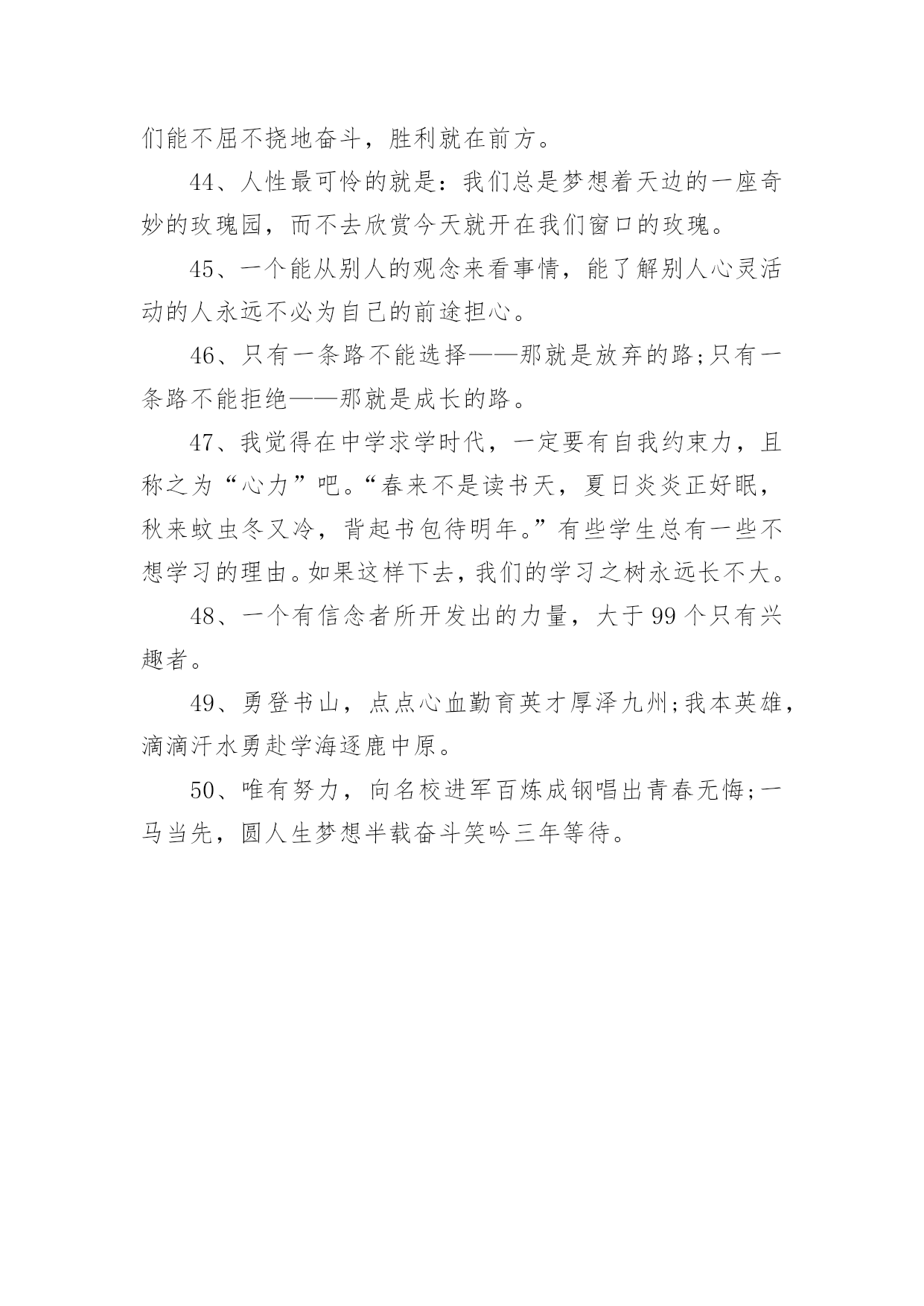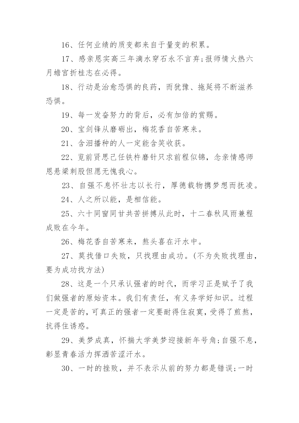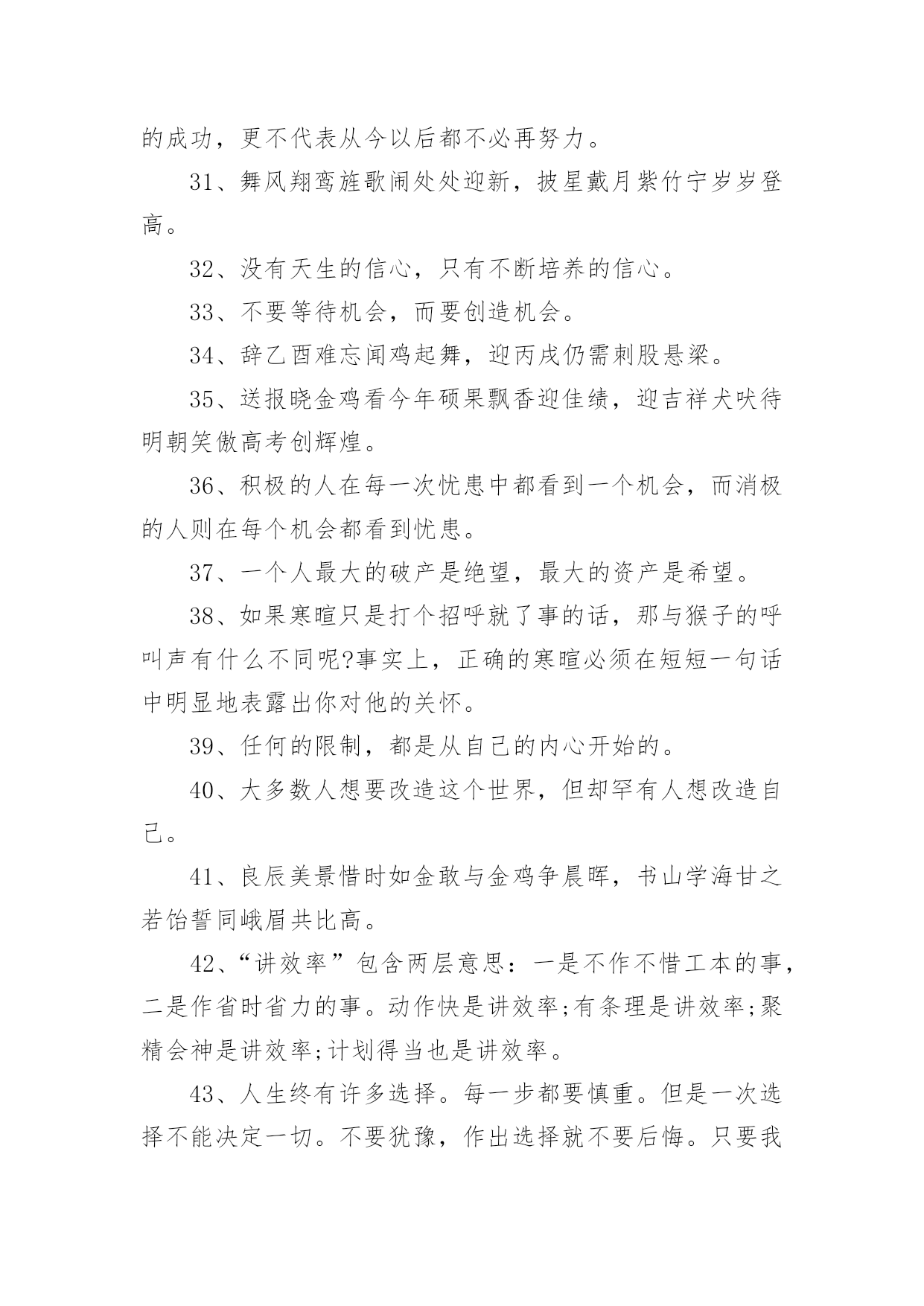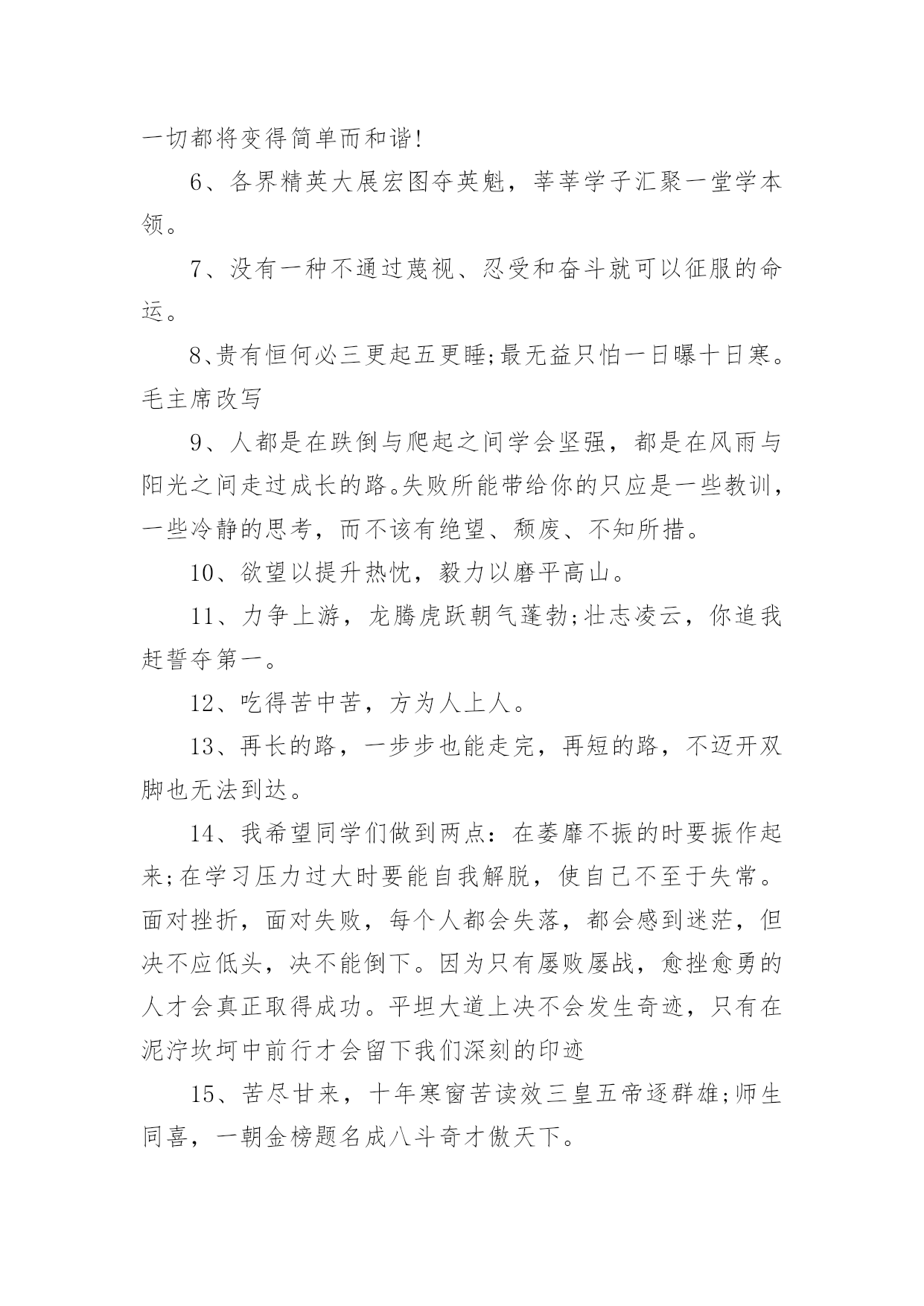 高中高考励志短语关于高中高考励志短语征服畏惧、建立自信的最快最确实的方法,就是去做你害怕的事,直到你获得成功的经验。关于高中高考励志短语有哪些?相信很多人都想知道吧?以下是小编为您整理的关于高中高考励志短语相关资料,欢迎阅读!关于高中高考励志短语1、失败是什么?没有什么,只是更走近成功一步;成功是什么?就是走过了所有通向失败的路,只剩下一条路,那就是成功的路。2、征服畏惧、建立自信的最快最确实的方法,就是去做你害怕的事,直到你获得成功的经验。3、学习很辛苦,但并不痛苦;学习没有什么捷径,苦学才是根本;在你没有找到“不用重复就可以学习好”的方法之前,请不放弃“重复”这种最简单、最有效的学习方法。4、机会从不会“失掉”,你失掉了,自有别人会得到。不要凡事在天,守株待兔,更不要寄希望于“机会”。机会只不过是相对于充分准备而又善于创造机会的人而言的.。没有机会,就要创造机会;有了机会,就要巧妙地抓住机会,而高考就是你走上成功之路的第一个机会。5、86.热爱可以创造奇迹。如果我们热爱登山,我们可以不顾旅途的危险与劳顿,勇往直前;如果我们热爱文学,我们可以废寝忘食,夜灯长明;如果我们热爱高考呢?那么,一切都将变得简单而和谐!6、各界精英大展宏图夺英魁,莘莘学子汇聚一堂学本领。7、没有一种不通过蔑视、忍受和奋斗就可以征服的命运。8、贵有恒何必三更起五更睡;最无益只怕一日曝十日寒。毛主席改写9、人都是在跌倒与爬起之间学会坚强,都是在风雨与阳光之间走过成长的路。失败所能带给你的只应是一些教训,一些冷静的思考,而不该有绝望、颓废、不知所措。10、欲望以提升热忱,毅力以磨平高山。11、力争上游,龙腾虎跃朝气蓬勃;壮志凌云,你追我赶誓夺第一。12、吃得苦中苦,方为人上人。13、再长的路,一步步也能走完,再短的路,不迈开双脚也无法到达。14、我希望同学们做到两点:在萎靡不振的时要振作起来;在学习压力过大时要能自我解脱,使自己不至于失常。面对挫折,面对失败,每个人都会失落,都会感到迷茫,但决不应低头,决不能倒下。因为只有屡败屡战,愈挫愈勇的人才会真正取得成功。平坦大道上决不会发生奇迹,只有在泥泞坎坷中前行才会留下我们深刻的印迹15、苦尽甘来,十年寒窗苦读效三皇五帝逐群雄;师生同喜,一朝金榜题名成八斗奇才傲天下。16、任何业绩的质变都来自于量变的积累。17、感亲恩实高三年滴水穿石永不言弃;报师情火热六月蟾宫折桂志在必得。18、行动是治愈恐惧的良药,而犹豫、拖延将不断滋养恐惧。19、每一发奋努力的背后,必有加倍的赏赐。20、宝剑锋从磨砺出,梅花香自苦寒来。21、含泪播种的人一定能含笑收获。22、览前贤思己任铁杵磨针只求前程似锦,念亲情感师恩悬梁刺股但愿无愧我心。23、自强不息怀壮志以长行,厚德载物携梦想而抚凌。24、人之所以能,是相信能。25、六十同窗同甘共苦拼搏从此时,十二春秋风雨兼程成败在今年。26、梅花香自苦寒来,熬头喜在汗水中。27、莫找借口失败,只找理由成功。(不为失败找理由,要为成功找方法)28、这是一个只承认强者的时代,而学习正是赋予了我们做强者的原始资本。我们有责任,有义务学好知识。过程一定是苦的,可真正的强者一定要耐得住寂寞,受得了煎熬,抗得住诱惑。29、美梦成真,怀揣大学美梦迎接新年号角;自强不息,彰显青春活力挥洒苦涩汗水。30、一时的挫败,并不表示从前的努力都是错误;一时的成功,更不代表从今以后都不必再努力。31、舞风翔鸾旌歌闹处处迎新,披星戴月紫竹宁岁岁登高。32、没有天生的信心,只有不断培养的信心。33、不要等待机会,而要创造机会。34、辞乙酉难忘闻鸡起舞,迎丙戌仍需刺股悬梁。35、送报晓金鸡看今年硕果飘香迎佳绩,迎吉祥犬吠待明朝笑傲高考创辉煌。36、积极的人在每一次忧患中都看到一个机会,而消极的人则在每个机会都看到忧患。37、一个人最大的破产是绝望,最大的资产是希望。38、如果寒暄只是打个招呼就了事的话,那与猴子的呼叫声有什么不同呢?事实上,正确的寒暄必须在短短一句话中明显地表露出你对他的关怀。39、任何的限制,都是从自己的内心开始的。40、大多数人想要改造这个世界,但却罕有人想改造自己。41、良辰美景惜时如金敢与金鸡争晨晖,书山学海甘之若饴誓同峨眉共比高。42、“讲效率”包含两层意思:一是不作不惜工本的事,二是作省时省力的事。动作快是讲效率;有条理是讲效率;聚精会神是讲效率;计划得当也是讲效率。43、人生终有许多选择。每一步都要慎重。但是一次选择不能决定一切。不要犹豫,作出选择就不要后悔。只要我们能不屈不挠地奋斗,胜利就在前方。44、人性最可怜的就是:我们总是梦想着天边的一座奇妙的玫瑰园,而不去欣赏今天就开在我们窗口的玫瑰。45、一个能从别人的观念来看事情,能了解别人心灵活动的人永远不必为自己的前途担心。46、只有一条路不能