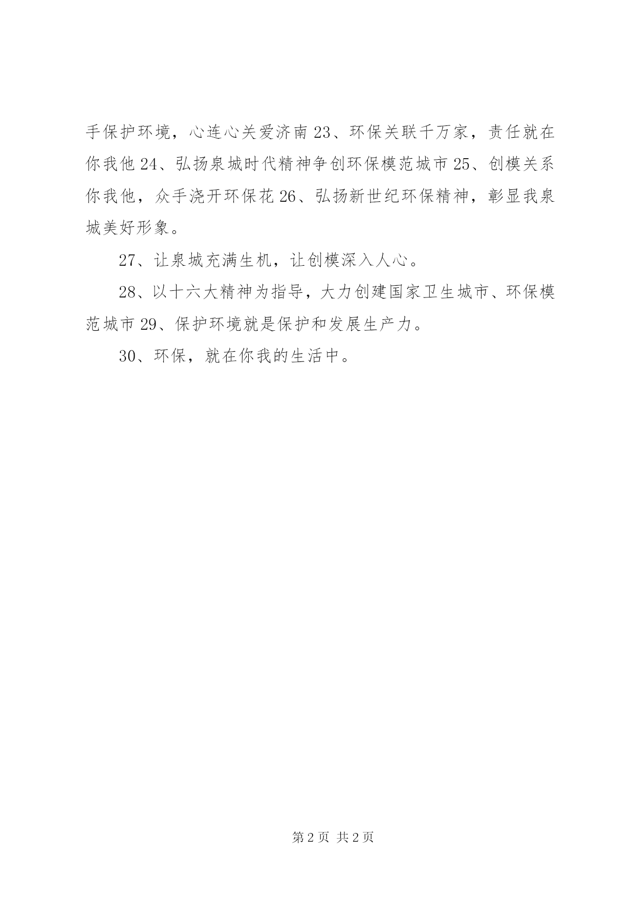 第PAGE\*Arabic\*MERGEFORMAT2页共NUMPAGES\*MERGEFORMAT2页创建环保模范城市标语1、创建国家环保模范城市提升城市品质2、建设生态环境,倡导文明新风。3、让环保进入家庭让创模变为行动4、保护环境是责任,爱护环境是美德。5、弘扬环境保护理念,营造和谐绿色家园。6、爱护环境同爱护您的孩子一样重要。7、保护环境是我们的义务,爱护河流是我们的责任。8、建优美省会城市,创环保模范家园。9、人人参与,构建人与自然和谐美丽家园。10、落实科学发展观加快建设环境友好型社会。11、创造济南绿色文明,共建环保模范新城.12、举手之劳做环保,生活环境更美好。13、保持国家环保模范城市荣誉,需要全市上下的共同努力。14、创建生态城市改善人居环境15、保护生态环境,造福子孙后代。16、环山环水环风景,保洁保绿保健康。17、共建绿色生态家园,尽享环保碧水蓝天.18、四面荷花,辉映环保城市19、爱护环境,人人有责。20、倡导文明生活方式,树立环保消费观念。21、环境与人类处处相关,创模与泉城兴衰相连22、手拉手保护环境,心连心关爱济南23、环保关联千万家,责任就在你我他24、弘扬泉城时代精神争创环保模范城市25、创模关系你我他,众手浇开环保花26、弘扬新世纪环保精神,彰显我泉城美好形象。27、让泉城充满生机,让创模深入人心。28、以十六大精神为指导,大力创建国家卫生城市、环保模范城市29、保护环境就是保护和发展生产力。30、环保,就在你我的生活中。