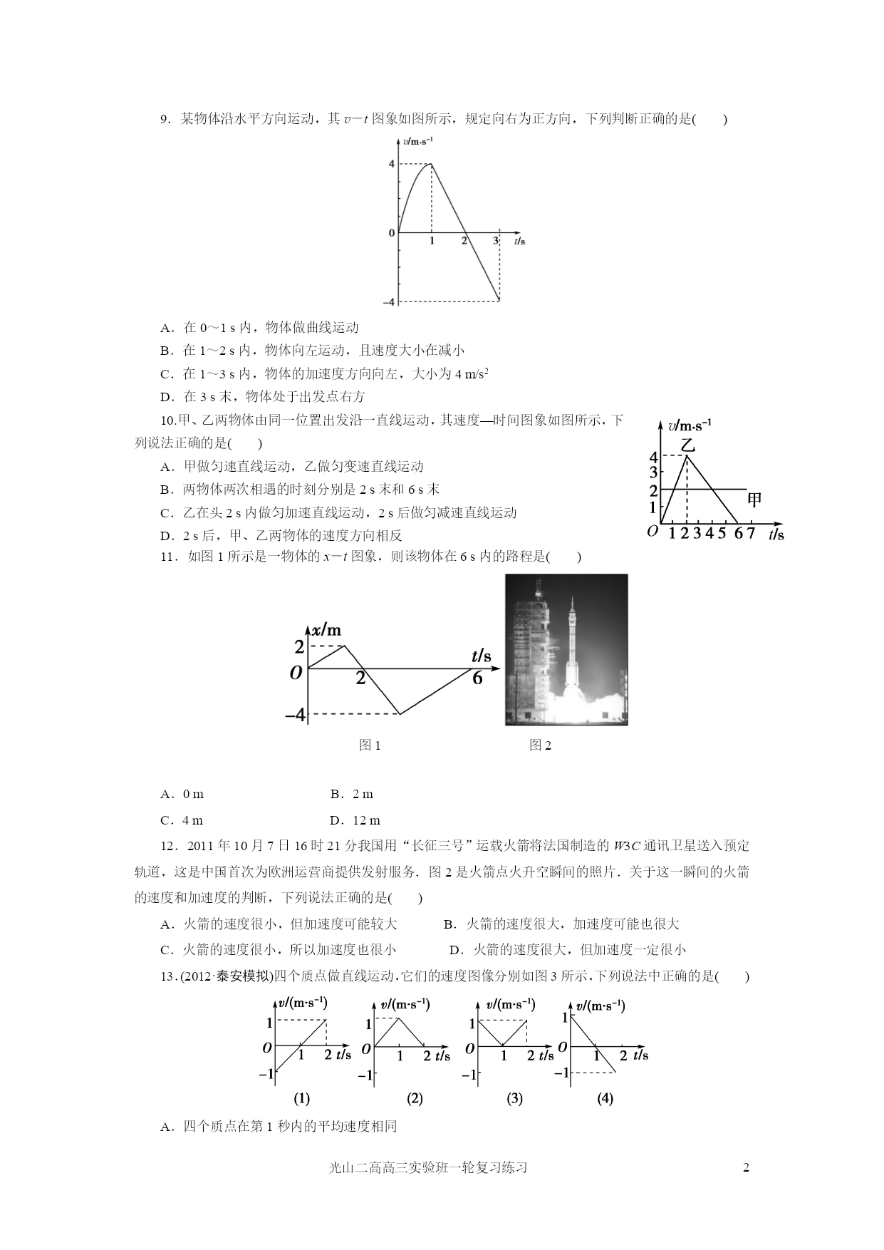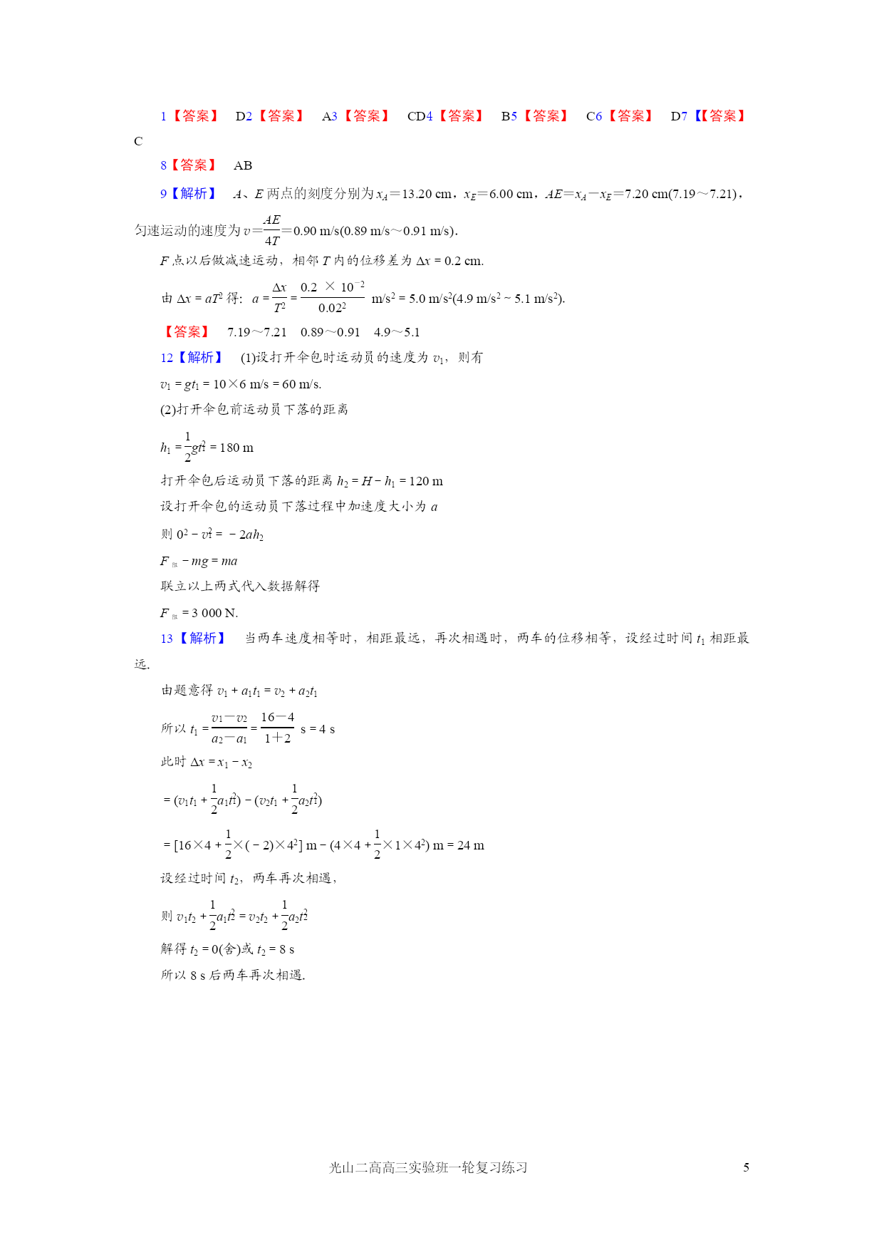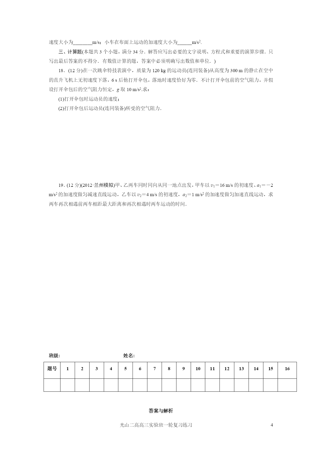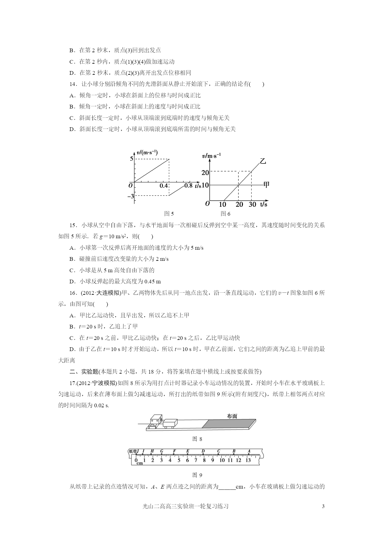 PAGEPAGE5光山二高高三实验班一轮复习练习直线运动综合练习1.A、B两物体均做匀变速直线运动,A的加速度a1=1.0m/s2,B的加速度a2=-2.0m/s2,根据这些条件做出的以下判断,其中正确的是()A.B的加速度大于A的加速度B.A做的是匀加速运动,B做的是匀减速运动C.任意时刻两个物体的速度都不可能为零D.两个物体的运动方向一定相反2.湖中O点有一观察站,一小船从O点出发向东行驶4km,又向北行驶3km,则O点的观察员对小船位置的报告最为精确的是()A.小船的位置变化了7kmB.小船向东北方向运动了7kmC.小船向东北方向运动了5kmD.小船的位置在东偏北37°方向,5km处3.以速度10m/s做匀速直线运动的汽车,在第4s末关闭发动机,在第5s内的平均速度为9m/s,则汽车在前10s内的位移为()A.45mB.56mC.64mD.65m4.汽车以20m/s的速度做匀速运动,某时刻关闭发动机而做匀减速运动,加速度大小为5m/s2,则它关闭发动机后通过37.5m所需时间为()A.3sB.4sC.5sD.6s5.以20m/s的速度做匀速直线运动的汽车,制动后能在2m内停下来,如果该汽车以40m/s的速度行驶,则它的制动距离应该是()A.2mB.4mC.8mD.16m6.静止置于水平地面的一物体质量为m=57kg,与水平地面间的动摩擦因数为0.43,在F=287N的水平拉力作用下做匀变速直线运动,则由此可知物体在运动过程中第5个7秒内的位移与第11个3秒内的位移比为()A.2∶1B.1∶2C.7∶3D.3∶77.(2012·福建师大附中模拟)一辆公共汽车进站后开始刹车,做匀减速直线运动.开始刹车后的第1s内和第2s内位移大小依次为9m和7m.则刹车后6s内的位移是()A.20mB.24mC.25mD.75m8.如图所示,在一个桌面上方有三个金属小球a、b、c,离桌面高度分别为h1∶h2∶h3=3∶2∶1.若先后顺次释放a、b、c,三球刚好同时落到桌面上,不计空气阻力,则()A.三者到达桌面时的速度之比是eq\r(3)∶eq\r(2)∶1B.三者运动时间之比为3∶2∶1C.b与a开始下落的时间差小于c与b开始下落的时间差D.三个小球运动的加速度与小球受到的重力成正比,与质量成反比9.某物体沿水平方向运动,其v-t图象如图所示,规定向右为正方向,下列判断正确的是()A.在0~1s内,物体做曲线运动B.在1~2s内,物体向左运动,且速度大小在减小C.在1~3s内,物体的加速度方向向左,大小为4m/s2D.在3s末,物体处于出发点右方10.甲、乙两物体由同一位置出发沿一直线运动,其速度—时间图象如图所示,下列说法正确的是()A.甲做匀速直线运动,乙做匀变速直线运动B.两物体两次相遇的时刻分别是2s末和6s末C.乙在头2s内做匀加速直线运动,2s后做匀减速直线运动D.2s后,甲、乙两物体的速度方向相反11.如图1所示是一物体的x-t图象,则该物体在6s内的路程是()图1图2A.0mB.2mC.4mD.12m12.2011年10月7日16时21分我国用“长征三号”运载火箭将法国制造的W3C通讯卫星送入预定轨道,这是中国首次为欧洲运营商提供发射服务.图2是火箭点火升空瞬间的照片.关于这一瞬间的火箭的速度和加速度的判断,下列说法正确的是()A.火箭的速度很小,但加速度可能较大B.火箭的速度很大,加速度可能也很大C.火箭的速度很小,所以加速度也很小D.火箭的速度很大,但加速度一定很小13.(2012·泰安模拟)四个质点做直线运动,它们的速度图像分别如图3所示,下列说法中正确的是()A.四个质点在第1秒内的平均速度相同B.在第2秒末,质点(3)回到出发点C.在第2秒内,质点(1)(3)(4)做加速运动D.在第2秒末,质点(2)(3)离开出发点位移相同14.让小球分别沿倾角不同的光滑斜面从静止开始滚下,正确的结论有()A.倾角一定时,小球在斜面上的位移与时间成正比B.倾角一定时,小球在斜面上的速度与时间成正比C.斜面长度一定时,小球从顶端滚到底端时的速度与倾角无关D.斜面长度一定时,小球从顶端滚到底端所需的时间与倾角无关图5图615.小球从空中自由下落,与水平地面每一次相碰后反弹到空中某一高度,其速度随时间变化的关系如图5所示.若g=10m/s2,则()A.小球第一次反弹后离开地面的速度的大小为5m/sB.碰撞前后速度改变量的大小为2m/sC.小球是从5m高处自由下落的D.小球反弹起的最大高度为0.45m16.(2012·大连模拟)甲、乙两物体先后从同一地