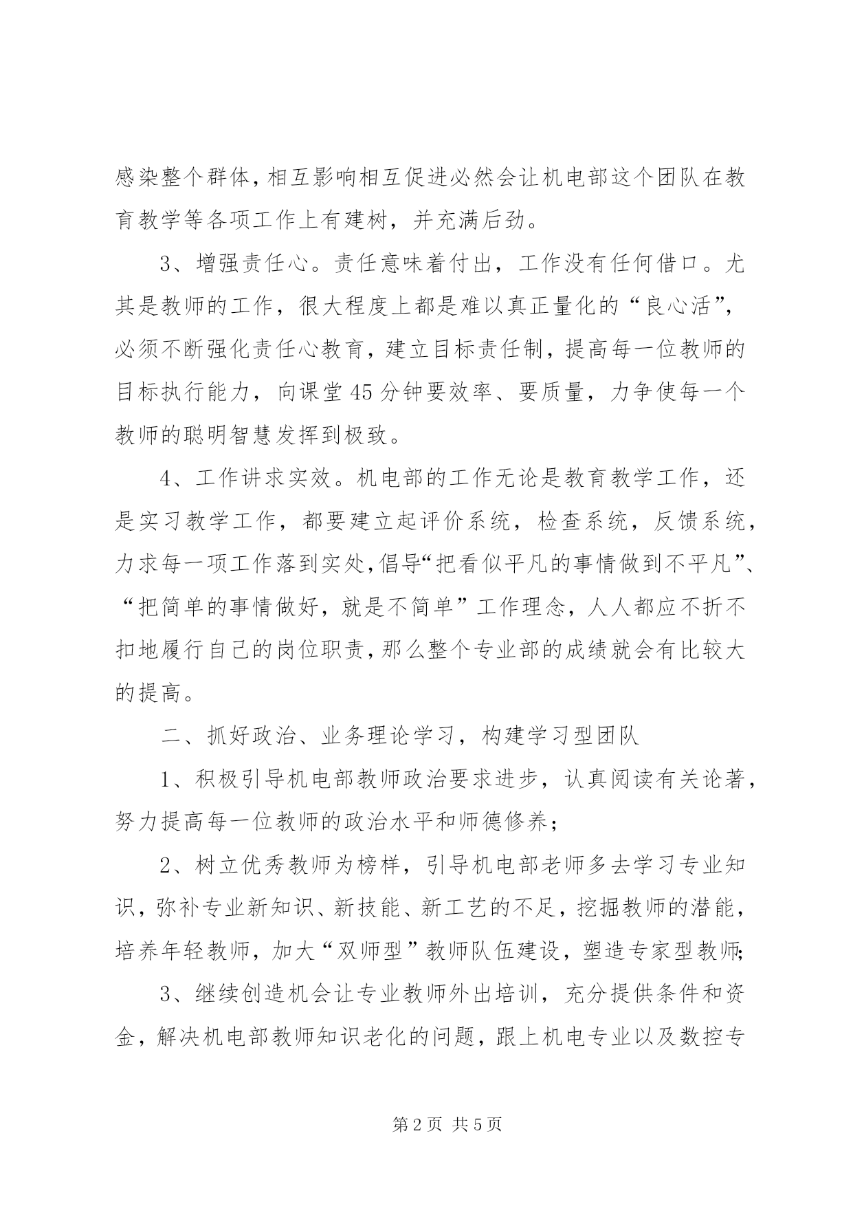 第PAGE\*Arabic\*MERGEFORMAT5页共NUMPAGES\*MERGEFORMAT5页机电部XX年XX年度工作计划为了进一步将机电部的学生管理和教学管理工作推向深入,以学校的总体办学理念为指导,倡导尊重的教育,培养学生的实践操作能力和自我管理能力,为社会培养合格的技术人才,现制订2008-2009年度工作计划如下。一、更新观念,构建和谐团队,增强凝聚力1、提高服务意识。服务有两种,一种是为赢利而服务,另一种是公益的服务。教师的服务不全为着自利,重在服务于社会公益,作为服务就要服从于服务的规范,因此作为教师,必须抛弃传统的思想的禁锢,放下架子,平等地处理教师、家长、学生的关系。只要人人都建立起了服务意识,才能心甘情愿地为他人服务,而不会去斤斤计较个人得失;才能真诚地去帮助别人,而不会彼此相轻;才能充满阳光,而不会去报怨社会的不公;才能全身心地投入工作,而不会当一天和尚撞一天钟。2、倡导合作精神:团结就是力量,随着专业部管理机制运行逐步成熟,人员几经调整后,机电部的老师达到63名。其中:文化基础教师31名,专业课教师18名,实习指导教师14名。机电部教师数量多、教师之间工作性质存在较大差别。但是分析机电部教师结构特点,老教师工作能力较强,经验丰富,年轻教师活力充沛干劲十足,且谦虚好学,只要加强交流合作,使老教师的教学智慧和经验毫无保留地传下来,使年轻教师的工作热情感染整个群体,相互影响相互促进必然会让机电部这个团队在教育教学等各项工作上有建树,并充满后劲。3、增强责任心。责任意味着付出,工作没有任何借口。尤其是教师的工作,很大程度上都是难以真正量化的“良心活”,必须不断强化责任心教育,建立目标责任制,提高每一位教师的目标执行能力,向课堂45分钟要效率、要质量,力争使每一个教师的聪明智慧发挥到极致。4、工作讲求实效。机电部的工作无论是教育教学工作,还是实习教学工作,都要建立起评价系统,检查系统,反馈系统,力求每一项工作落到实处,倡导“把看似平凡的事情做到不平凡”、“把简单的事情做好,就是不简单”工作理念,人人都应不折不扣地履行自己的岗位职责,那么整个专业部的成绩就会有比较大的提高。二、抓好政治、业务理论学习,构建学习型团队1、积极引导机电部教师政治要求进步,认真阅读有关论著,努力提高每一位教师的政治水平和师德修养;2、树立优秀教师为榜样,引导机电部老师多去学习专业知识,弥补专业新知识、新技能、新工艺的不足,挖掘教师的潜能,培养年轻教师,加大“双师型”教师队伍建设,塑造专家型教师;3、继续创造机会让专业教师外出培训,充分提供条件和资金,解决机电部教师知识老化的问题,跟上机电专业以及数控专业迅猛发展的势头,让学生学到更贴近于社会实际直接应用的知识。三、加强学生实习的力度,切实提高学生的专业技能目前机电部机电和数控两个专业在校学生达到了19个班1000人左右,这给我们专业课的教学和实习带来了较大的压力,为此:1、加大实习教学精细化管理力度,进一步落实实习管理人员的岗位职责,实行岗位目标责任制,每周对实习指导教师的工作进行全面检查一次,如实核算月工作量;搭建平台,使实习教师与任课教师交流,开足开全学生的实验实习,尽最大能力维修维护好设备,努力提高设备的利用率,为学生技能的提高创造物质条件。2、调整专业课的课时比例,确保实习课时,使学生的技能训练到位并落至实处。3、专业教师的技能的提高在于对先进的实验实习设备的操作技能。当前因部分专业教师和实习指导教师也是现学现教,新型的“双师”型教师有待进一步培养深造,一方面通过“以老带新”帮助改行教师迅速适应工作岗位,另一方面也需要创造条件让改行专业教师参与培训。4、继续开展技能活动展示月,安排一系列学生技能的活动,如技能达标,比武等,提高学生的技能水平。5、做好学生技能等级考核工作,努力提高技能等级的鉴定合格率的同时,真正使学生专业技能提高落到实处,达到经过短暂的实习就能上岗的能力。本年度拟完善技能鉴定前的常规技能考核制度。6、协同招生就业指导中心,联系学生的见习工作,主要面向即将就业的学生进行一段时间校外实习,让学生亲身感受专业的实际应用的规范和要求,体验职工的辛苦和敬业精神,使学生对所学专业有更为深刻的认识。*7、考虑到新的实习基地在本年度将交付使用,相关工种需要进一步的从深度和宽度上挖掘,本年度需要进行调研,制订更加科学的实习计划。四、抓好教科研工作,确保机电部两个专业的稳定发展1、进一步深化机电部的专业建设的研究以学生的专业技能培养为重点,合理设置专业课与文化课,尽机电部2008-2009年度工作计划内容加载中...快设计出与学校实际相符的课程设置方案,根据课程设置方案选择出适合机电部专业发展的一套专业教材,同时调动机电部教师的积极性,努力开发校本教材
