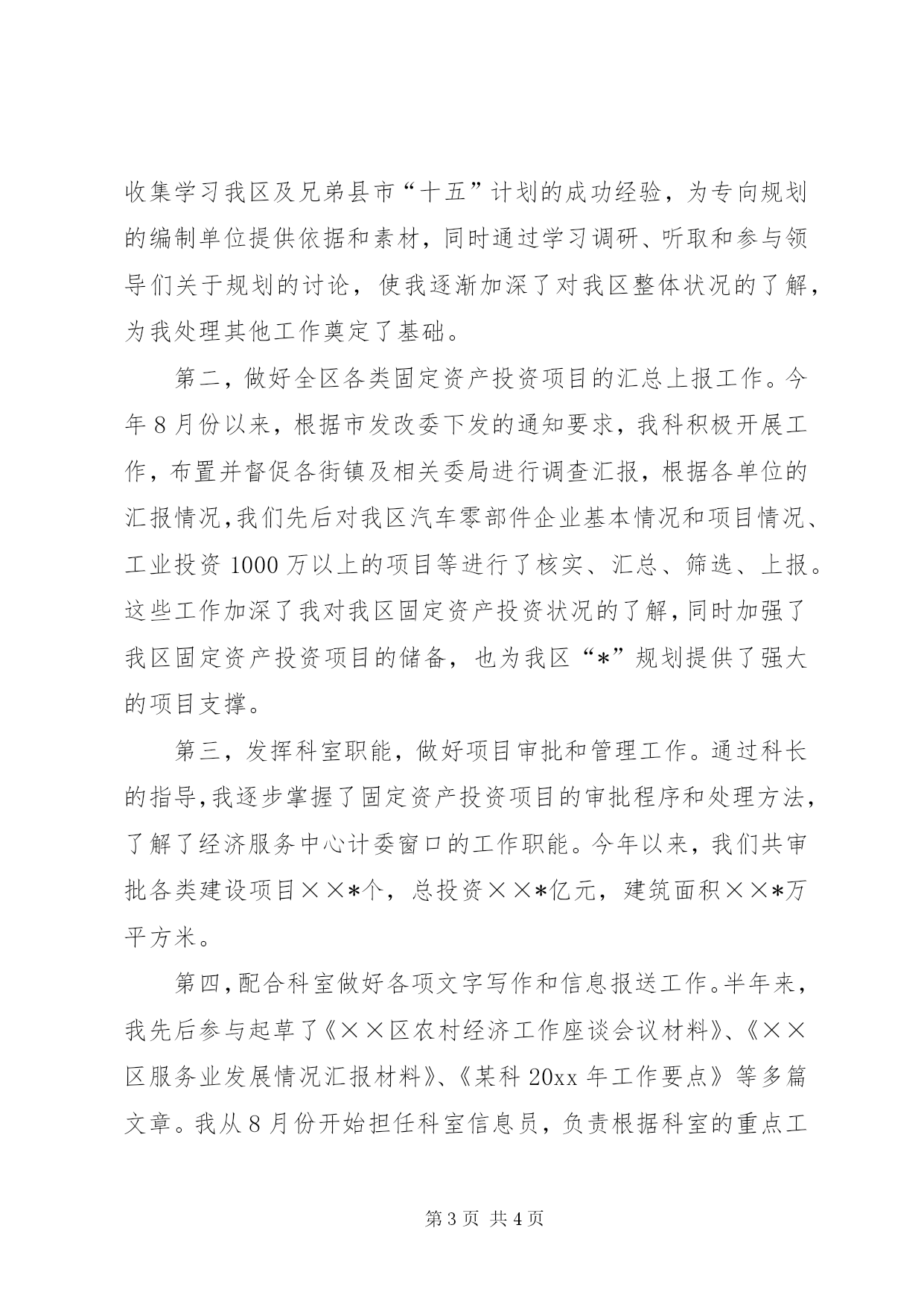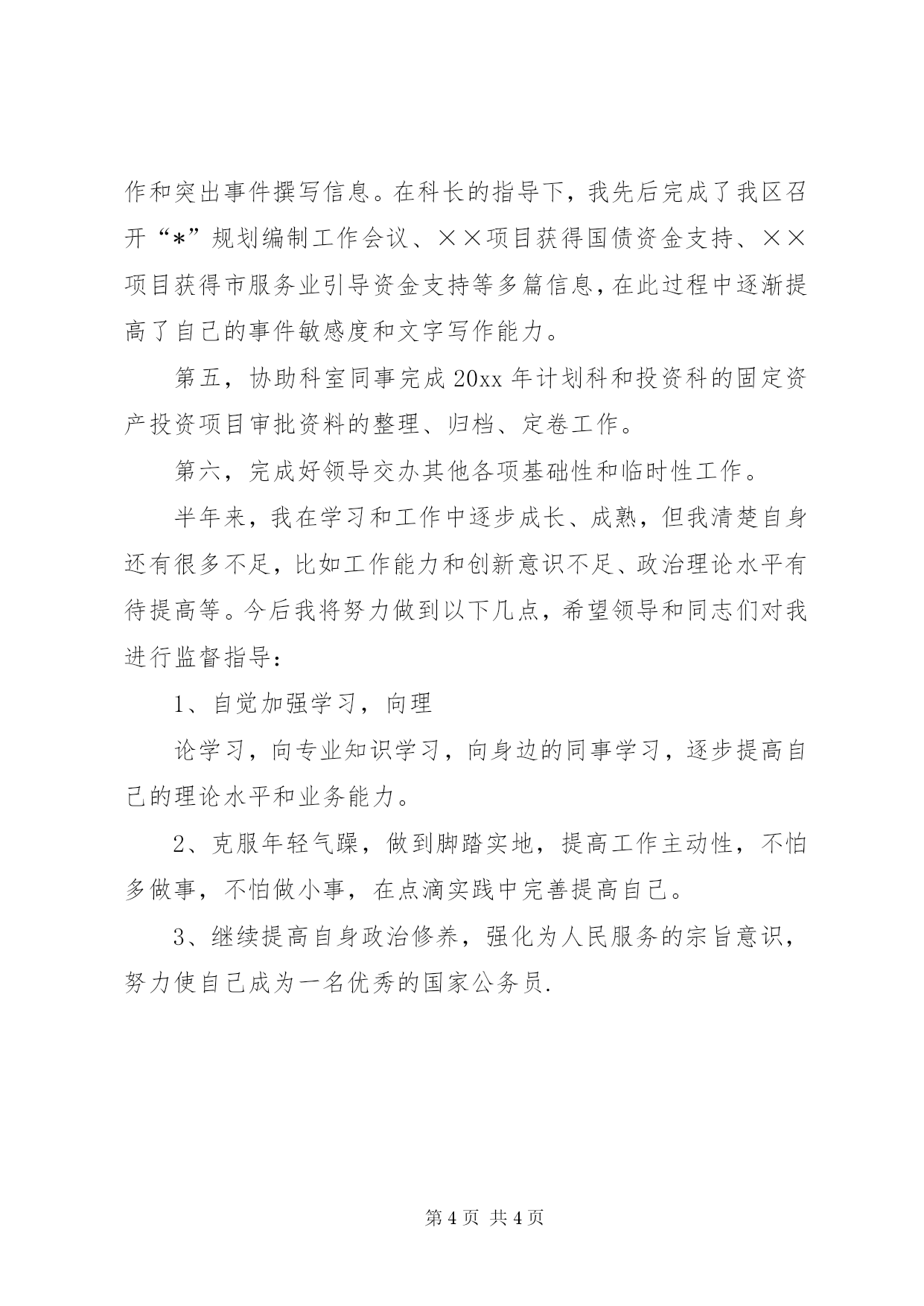 第PAGE\*Arabic\*MERGEFORMAT4页共NUMPAGES\*MERGEFORMAT4页公务员上半年的工作总结转眼我到单位工作已经半年了。这半年是我人生旅途中的重要一程,期间在领导的培养帮助、同志们的关心支持下我逐步完成着从象牙塔到政府机关、从大学生到国家公务员这种环境和角色的双重转变和适应。岁首年终,我静心回顾这半年的工作生活,收获颇丰。现将我这半年来的学习工作情况总结如下:一、自觉加强理论学习,提高个人素质首先,自觉加强政治理论学习,提高党性修养。两委浓厚的政治学习氛围深深的感染着我,我积极参加委内组织的各项学习活动,并注重自学,认真学习了胡锦涛在邓小平诞辰百年纪念大会上的讲话、胡锦涛七一重要讲话、十六届四中全会关于加强党的执政能力的决定等,进一步提高了自己的理论水平与政治素质,保证了自己在思想上和党保持一致性,强化了廉洁自律的自觉性。其次,在业务学习方面,我虚心向身边的同事请教,通过多看多听多想多问多做,努力使自己在尽短的时间内熟悉工作环境和内容。同时,我还自觉学习某市企业投资项目备案、核准暂行管理办法、行政许可法等与工作相关的政策、法律常识,积累自己的业务知识。此外,根据组织安排我参加了某市公务员初任培训。在为期三周的培训生活中,严格的军训磨练了我的意志,丰富的课程学习使我的知识储备和层次得到了提高。通过某市经济发展状况及党委政府工作的介绍,使我进一步理解了某市“三步走”战略,看到了某市经济腾飞的巨大潜力,增强了对某市的了解和热爱;通过公务员宗旨和行为规范的教育,使我树立了正确的权力观,增强了全心全意为人民服务的宗旨意识;通过办公室实务的学习,使我了解了公文写作的内涵,提高了办公室实务的处理能力,为我更好的投入工作打下了良好基础。二、踏实肯干,努力完成好各项业务工作在某科工作的半年中,通过领导和同事们的耐心指导,我在熟悉的基础上已经基本能完成科室的各项日常工作,期间我具体参与的工作主要包括以下几个方面:第一,配合领导做好我区“*”规划的编制工作。通过参加市县“*”规划研讨班,我了解了“*”规划编制的重要意义、基本原则、规划程序等,认识到“*”规划编制工作是我委乃至我区的主要工作之一。半年来,我们按照市政府统一部署和区委区政府的工作要求,制定了《编制××区国民经济和社会发展“*”规划的安排意见》,*月份配合区政府组织各街镇和有关委局召开了全区“*”规划编制工作会议,对规划编制工作进行了动员和具体部署,并为各街镇草拟了规划编写的结构示例作为参考。为及时了解和督促各专项规划及街镇规划编制工作的开展,*月又组织召开了“*”规划推动会。期间,我自觉加强相关知识的学习,密切关注国家及某市市“*”规划的政策理论和进展动态,收集学习我区及兄弟县市“十五”计划的成功经验,为专向规划的编制单位提供依据和素材,同时通过学习调研、听取和参与领导们关于规划的讨论,使我逐渐加深了对我区整体状况的了解,为我处理其他工作奠定了基础。第二,做好全区各类固定资产投资项目的汇总上报工作。今年8月份以来,根据市发改委下发的通知要求,我科积极开展工作,布置并督促各街镇及相关委局进行调查汇报,根据各单位的汇报情况,我们先后对我区汽车零部件企业基本情况和项目情况、工业投资1000万以上的项目等进行了核实、汇总、筛选、上报。这些工作加深了我对我区固定资产投资状况的了解,同时加强了我区固定资产投资项目的储备,也为我区“*”规划提供了强大的项目支撑。第三,发挥科室职能,做好项目审批和管理工作。通过科长的指导,我逐步掌握了固定资产投资项目的审批程序和处理方法,了解了经济服务中心计委窗口的工作职能。今年以来,我们共审批各类建设项目××*个,总投资××*亿元,建筑面积××*万平方米。第四,配合科室做好各项文字写作和信息报送工作。半年来,我先后参与起草了《××区农村经济工作座谈会议材料》、《××区服务业发展情况汇报材料》、《某科20xx年工作要点》等多篇文章。我从8月份开始担任科室信息员,负责根据科室的重点工作和突出事件撰写信息。在科长的指导下,我先后完成了我区召开“*”规划编制工作会议、××项目获得国债资金支持、××项目获得市服务业引导资金支持等多篇信息,在此过程中逐渐提高了自己的事件敏感度和文字写作能力。第五,协助科室同事完成20xx年计划科和投资科的固定资产投资项目审批资料的整理、归档、定卷工作。第六,完成好领导交办其他各项基础性和临时性工作。半年来,我在学习和工作中逐步成长、成熟,但我清楚自身还有很多不足,比如工作能力和创新意识不足、政治理论水平有待提高等。今后我将努力做到以下几点,希望领导和同志们对我进行监督指导:1、自觉加强学习,向理论学习,向专业知识学习,向身边的同事学习,逐步提高自己的理论水平和业务能力。2、克服年轻气躁