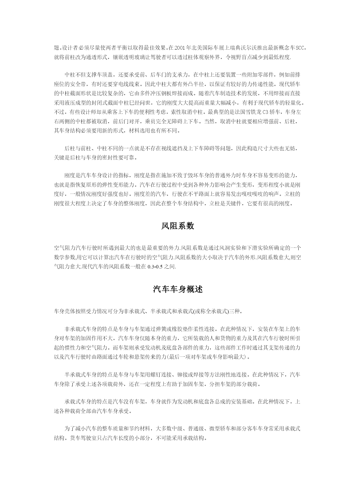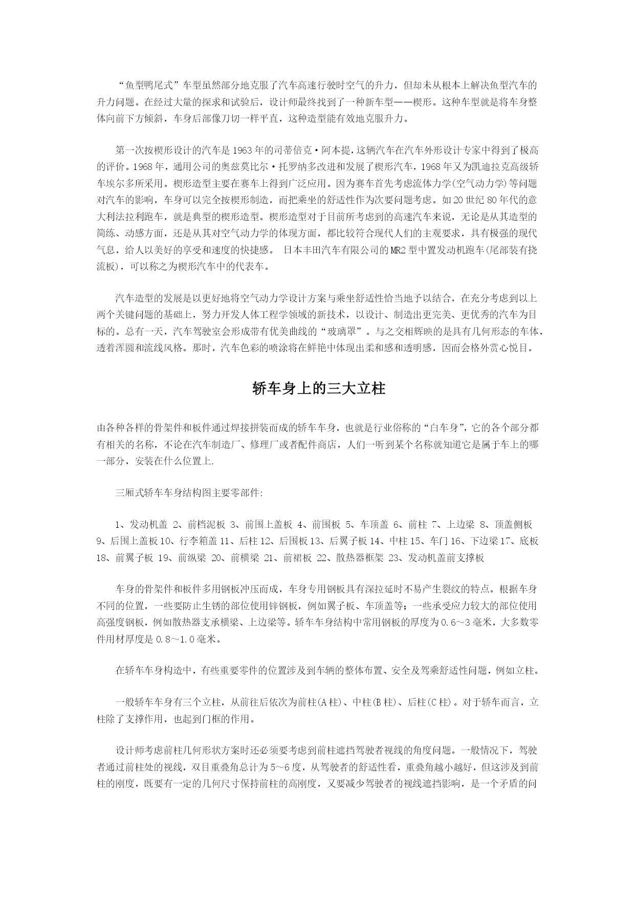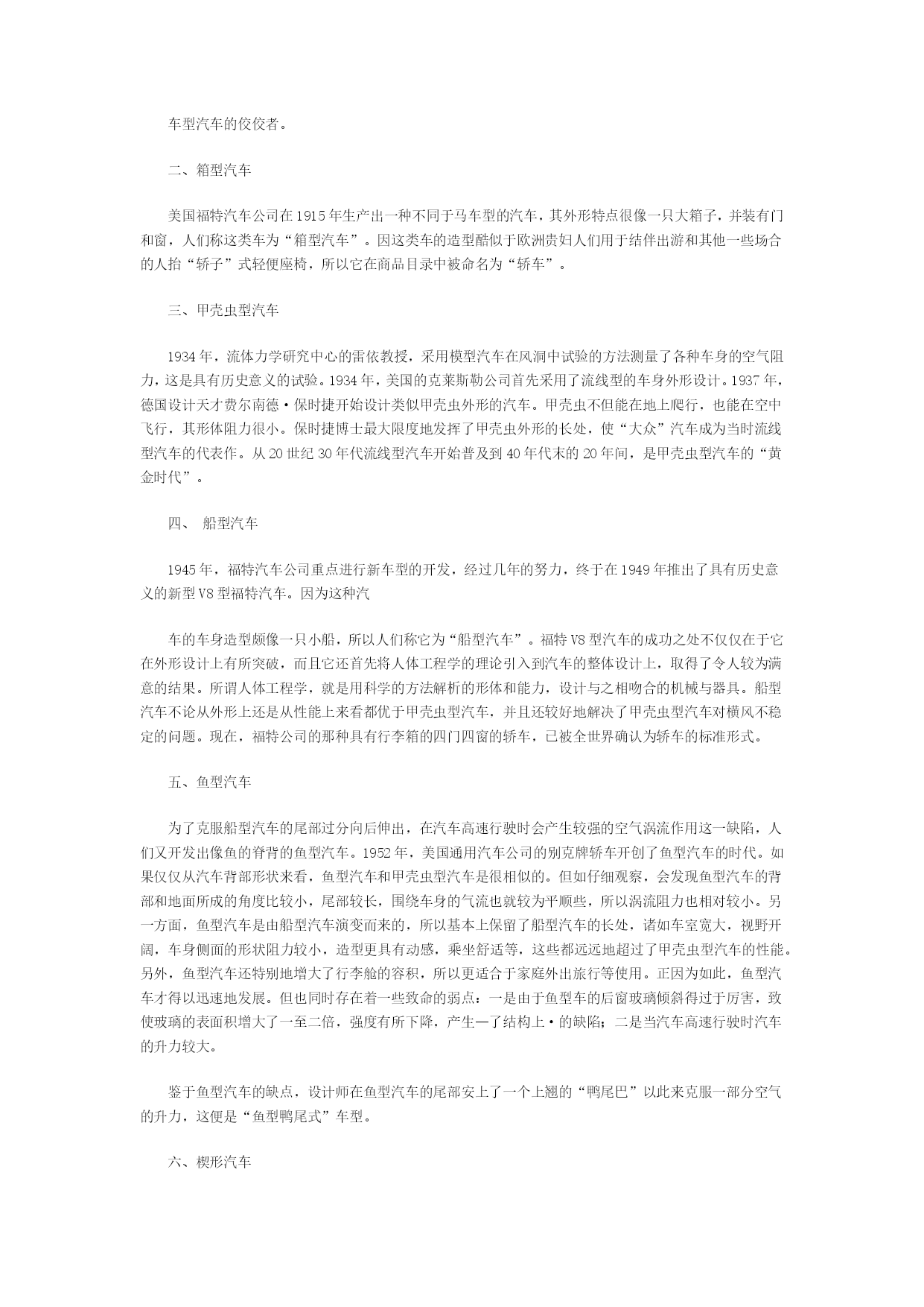 车门、车窗及其附件和密封车门是车身上重要部件之一。按其开启方式可分为顺开式、逆开式、水平移动式、上掀式和折叠式等几种。顺开式车门即使在汽车行驶时仍可借气流的压力关上,比较安全,而且便于驾驶员在倒车时向后观察,故被广泛采用。逆开式车门在汽车行驶时若关闭不严就可能被迎面气流冲开,因而用得较少,一般只是为了改善上下车方便性及适于迎宾礼仪需要的情况下才采用。水平移动式车门的优点是车身侧壁与障碍物距离较小的情况下仍能全部开启。上掀式车门广泛用作轿车及轻型客车的后门,也应用于低矮的汽车。折叠式车门则广泛应用于大、中型客车上。在有些大型客车上,还备有加速乘客撤离事故现场以及便于救援人员进入的安全门。轿车、货车驾驶室的车门以及客车驾驶员出入的车门通常由门外钣、门内钣、窗框(有的车上还装有三角窗)等组成。门内钣是各种附件的安装基体。在其上装有:门铰链、升降玻璃及其导轨、玻璃升降器、门锁、车门开度限位器等附件。有的轿车门内还布置有暖气通风管道和立体声收放音机的扬声器等等。车门借铰链安装在车身壳体上。在汽车行驶时,车身壳体将产生反复扭转变形。为避免在此情况下车门与门框摩擦产生噪声,车门与门框之间留有较大的间隙,靠橡胶密封条将间隙密封。汽车的前、后窗通常采用有利于视野而又美观的曲面玻璃,借橡胶密封条嵌在窗框上或用专门的粘合剂粘贴在窗框上。为便于自然通风,汽车的侧窗玻璃通常可上、下或前、后移动。在玻璃与导轨之间装有呢绒或植绒橡胶等材料的密封槽。某些汽车的侧窗还采用有利于汽车布置的圆柱面玻璃。侧窗玻璃采用茶色或降热层可使室内保温并具有安闲宁静的舒适感。具有完善的冷气、暖气、通风及空调设备的高级客车常常将侧窗玻璃设计成不可移动的,以提高车身的密封性。汽车车身造型的演变从19世纪末到20世纪初期,汽车设计师把主要精力都用在了汽车的机械工程学的发展和革新上。到了20世纪前半期,汽车的基本构造已经全部发明出来后,汽车设计者们开始着手从汽车外部造型上进行改进,并相继引入了空气动力学、流体力学、人体工.程学以及工业造型设计(工业美学)等概念,力求让汽车能够从外形上满足各种年龄、各种阶层,甚至各种文化背景的人的不同需求,使汽车成为真正的科学与艺术相结合的最佳表现形象,最终达到最完善的境界。汽车造型师们把汽车装扮成人类的肌体。例如:汽车的眼睛--前照灯;嘴——进风口;肺--空气滤清器;血管——油路;神经一电路;心脏一发动机;胃--油箱;脚——轮胎;肌肉--机械部分。力图将一个冷冰冰的机械注入以生命,使之具有非凡的艺术魅力,给人以美感。汽车车身形式在发展过程中主要经历了马车型汽车、箱型汽车、甲壳虫型汽车、船型汽车、鱼一、马车型汽车我国古代早有“轿车”一词,是指用骡马拉的轿子(图1-9)。当西方汽车大量进入中国时,正是封闭式方形汽车在西方流行之时。那时汽车的形状与我国古代的“轿车”相似,并与“轿车”一样让人感到荣耀。于是,人们就将当时的汽车称为轿车。最早出现的汽车,其车身造型基本上沿用了马车的形式,因此称为“无马的马车”英文名Sedan就是指欧洲贵族乘用的一种豪华马车,不仅装饰讲究,而且是封闭式的,可防风、雨和灰尘,并提高了安全度。18世纪这种车传到美国后,也只有纽约、费城等少数大城市中的富人才有资格享用。1908年福特推出T型车时,车身由原来的敞开式改为封闭式,其舒适性、安全性都有很大提高。福特将他的“封闭式汽车”(Closedcar)称为Sedan。著名的福特T型车是马车型汽车的佼佼者。二、箱型汽车美国福特汽车公司在1915年生产出一种不同于马车型的汽车,其外形特点很像一只大箱子,并装有门和窗,人们称这类车为“箱型汽车”。因这类车的造型酷似于欧洲贵妇人们用于结伴出游和其他一些场合的人抬“轿子”式轻便座椅,所以它在商品目录中被命名为“轿车”。三、甲壳虫型汽车1934年,流体力学研究中心的雷依教授,采用模型汽车在风洞中试验的方法测量了各种车身的空气阻力,这是具有历史意义的试验。1934年,美国的克莱斯勒公司首先采用了流线型的车身外形设计。1937年,德国设计天才费尔南德·保时捷开始设计类似甲壳虫外形的汽车。甲壳虫不但能在地上爬行,也能在空中飞行,其形体阻力很小。保时捷博士最大限度地发挥了甲壳虫外形的长处,使“大众”汽车成为当时流线型汽车的代表作。从20世纪30年代流线型汽车开始普及到40年代末的20年间,是甲壳虫型汽车的“黄金时代”。四、船型汽车1945年,福特汽车公司重点进行新车型的开发,经过几年的努力,终于在1949年推出了具有历史意义的新型V8型福特汽车。因为这种汽车的车身造型颇像一只小船,所以人们称它为“船型汽车”。福特V8型汽车的成功之处不仅仅在于它在外形设计上有所突破,而且它还首先将人体工程学的理论引入到汽车的整体设计上,取得了令人