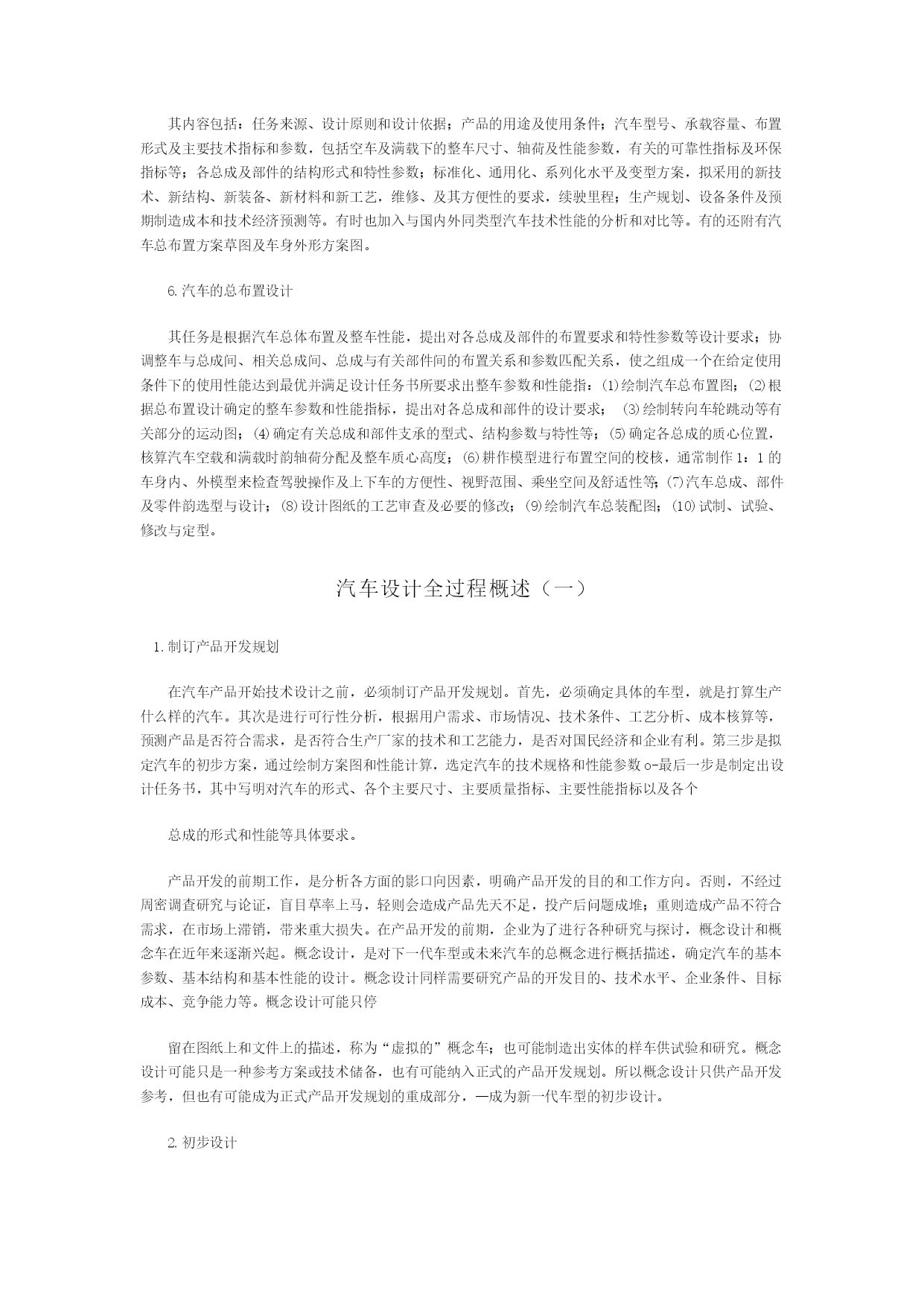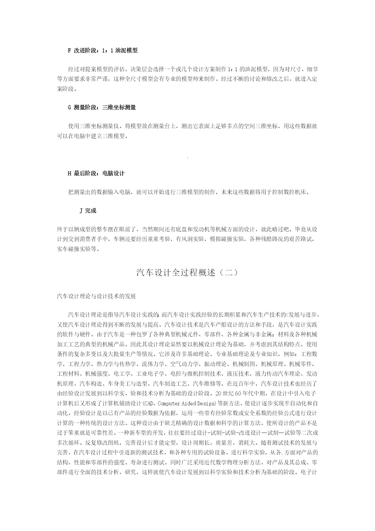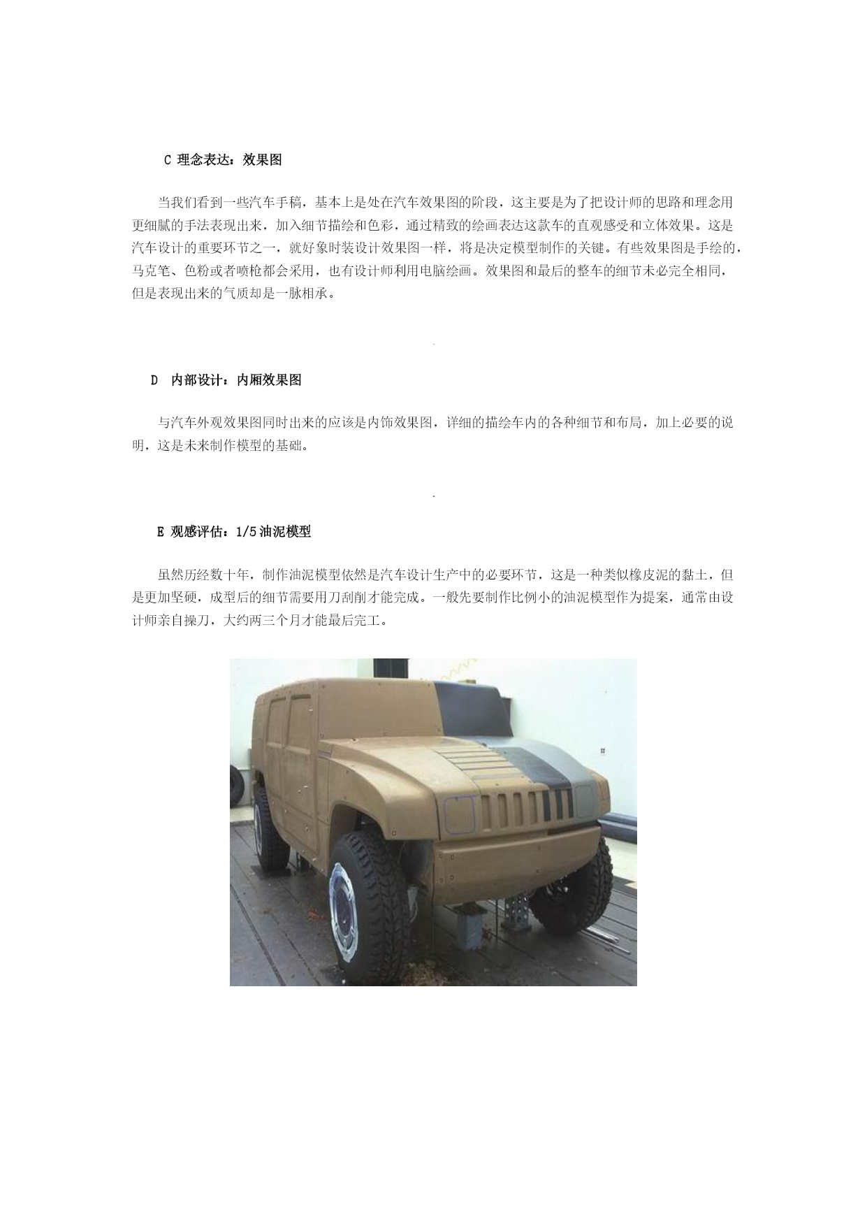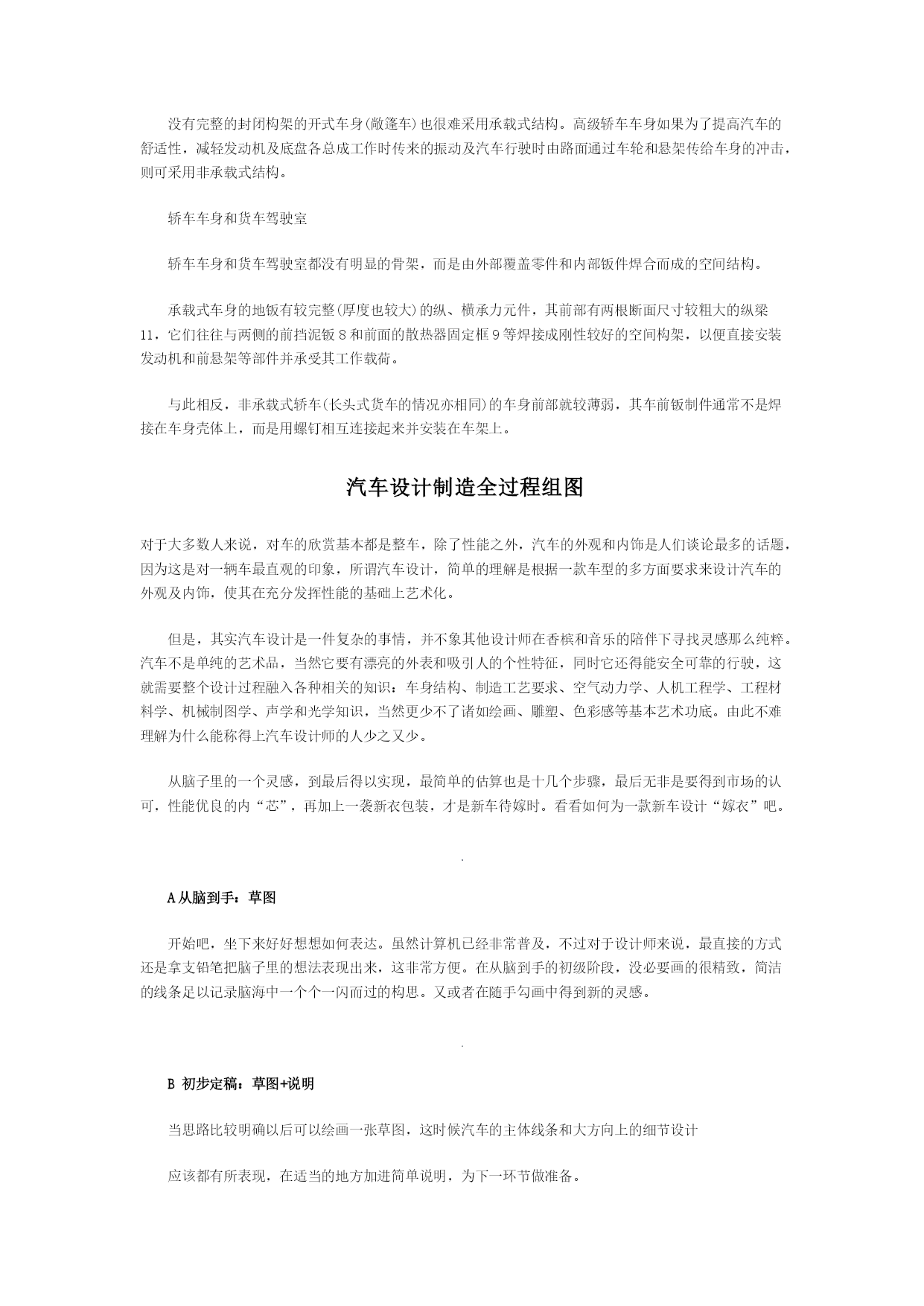 车门、车窗及其附件和密封车门是车身上重要部件之一。按其开启方式可分为顺开式、逆开式、水平移动式、上掀式和折叠式等几种。顺开式车门即使在汽车行驶时仍可借气流的压力关上,比较安全,而且便于驾驶员在倒车时向后观察,故被广泛采用。逆开式车门在汽车行驶时若关闭不严就可能被迎面气流冲开,因而用得较少,一般只是为了改善上下车方便性及适于迎宾礼仪需要的情况下才采用。水平移动式车门的优点是车身侧壁与障碍物距离较小的情况下仍能全部开启。上掀式车门广泛用作轿车及轻型客车的后门,也应用于低矮的汽车。折叠式车门则广泛应用于大、中型客车上。在有些大型客车上,还备有加速乘客撤离事故现场以及便于救援人员进入的安全门。轿车、货车驾驶室的车门以及客车驾驶员出入的车门通常由门外钣、门内钣、窗框(有的车上还装有三角窗)等组成。门内钣是各种附件的安装基体。在其上装有:门铰链、升降玻璃及其导轨、玻璃升降器、门锁、车门开度限位器等附件。有的轿车门内还布置有暖气通风管道和立体声收放音机的扬声器等等。车门借铰链安装在车身壳体上。在汽车行驶时,车身壳体将产生反复扭转变形。为避免在此情况下车门与门框摩擦产生噪声,车门与门框之间留有较大的间隙,靠橡胶密封条将间隙密封。汽车的前、后窗通常采用有利于视野而又美观的曲面玻璃,借橡胶密封条嵌在窗框上或用专门的粘合剂粘贴在窗框上。为便于自然通风,汽车的侧窗玻璃通常可上、下或前、后移动。在玻璃与导轨之间装有呢绒或植绒橡胶等材料的密封槽。某些汽车的侧窗还采用有利于汽车布置的圆柱面玻璃。侧窗玻璃采用茶色或降热层可使室内保温并具有安闲宁静的舒适感。具有完善的冷气、暖气、通风及空调设备的高级客车常常将侧窗玻璃设计成不可移动的,以提高车身的密封性。汽车车身造型的演变从19世纪末到20世纪初期,汽车设计师把主要精力都用在了汽车的机械工程学的发展和革新上。到了20世纪前半期,汽车的基本构造已经全部发明出来后,汽车设计者们开始着手从汽车外部造型上进行改进,并相继引入了空气动力学、流体力学、人体工.程学以及工业造型设计(工业美学)等概念,力求让汽车能够从外形上满足各种年龄、各种阶层,甚至各种文化背景的人的不同需求,使汽车成为真正的科学与艺术相结合的最佳表现形象,最终达到最完善的境界。汽车造型师们把汽车装扮成人类的肌体。例如:汽车的眼睛--前照灯;嘴——进风口;肺--空气滤清器;血管——油路;神经一电路;心脏一发动机;胃--油箱;脚——轮胎;肌肉--机械部分。力图将一个冷冰冰的机械注入以生命,使之具有非凡的艺术魅力,给人以美感。汽车车身形式在发展过程中主要经历了马车型汽车、箱型汽车、甲壳虫型汽车、船型汽车、鱼一、马车型汽车我国古代早有“轿车”一词,是指用骡马拉的轿子(图1-9)。当西方汽车大量进入中国时,正是封闭式方形汽车在西方流行之时。那时汽车的形状与我国古代的“轿车”相似,并与“轿车”一样让人感到荣耀。于是,人们就将当时的汽车称为轿车。最早出现的汽车,其车身造型基本上沿用了马车的形式,因此称为“无马的马车”英文名Sedan就是指欧洲贵族乘用的一种豪华马车,不仅装饰讲究,而且是封闭式的,可防风、雨和灰尘,并提高了安全度。18世纪这种车传到美国后,也只有纽约、费城等少数大城市中的富人才有资格享用。1908年福特推出T型车时,车身由原来的敞开式改为封闭式,其舒适性、安全性都有很大提高。福特将他的“封闭式汽车”(Closedcar)称为Sedan。著名的福特T型车是马车型汽车的佼佼者。二、箱型汽车美国福特汽车公司在1915年生产出一种不同于马车型的汽车,其外形特点很像一只大箱子,并装有门和窗,人们称这类车为“箱型汽车”。因这类车的造型酷似于欧洲贵妇人们用于结伴出游和其他一些场合的人抬“轿子”式轻便座椅,所以它在商品目录中被命名为“轿车”。三、甲壳虫型汽车1934年,流体力学研究中心的雷依教授,采用模型汽车在风洞中试验的方法测量了各种车身的空气阻力,这是具有历史意义的试验。1934年,美国的克莱斯勒公司首先采用了流线型的车身外形设计。1937年,德国设计天才费尔南德·保时捷开始设计类似甲壳虫外形的汽车。甲壳虫不但能在地上爬行,也能在空中飞行,其形体阻力很小。保时捷博士最大限度地发挥了甲壳虫外形的长处,使“大众”汽车成为当时流线型汽车的代表作。从20世纪30年代流线型汽车开始普及到40年代末的20年间,是甲壳虫型汽车的“黄金时代”。四、船型汽车1945年,福特汽车公司重点进行新车型的开发,经过几年的努力,终于在1949年推出了具有历史意义的新型V8型福特汽车。因为这种汽车的车身造型颇像一只小船,所以人们称它为“船型汽车”。福特V8型汽车的成功之处不仅仅在于它在外形设计上有所突破,而且它还首先将人体工程学的理论引入到汽车的整体设计上,取得了令人