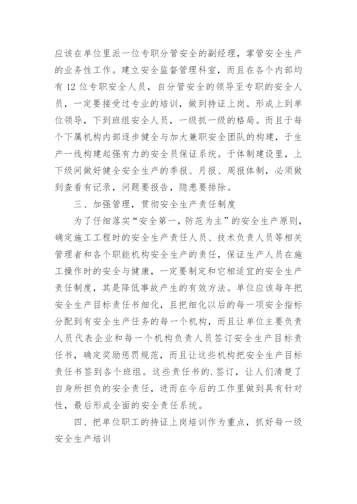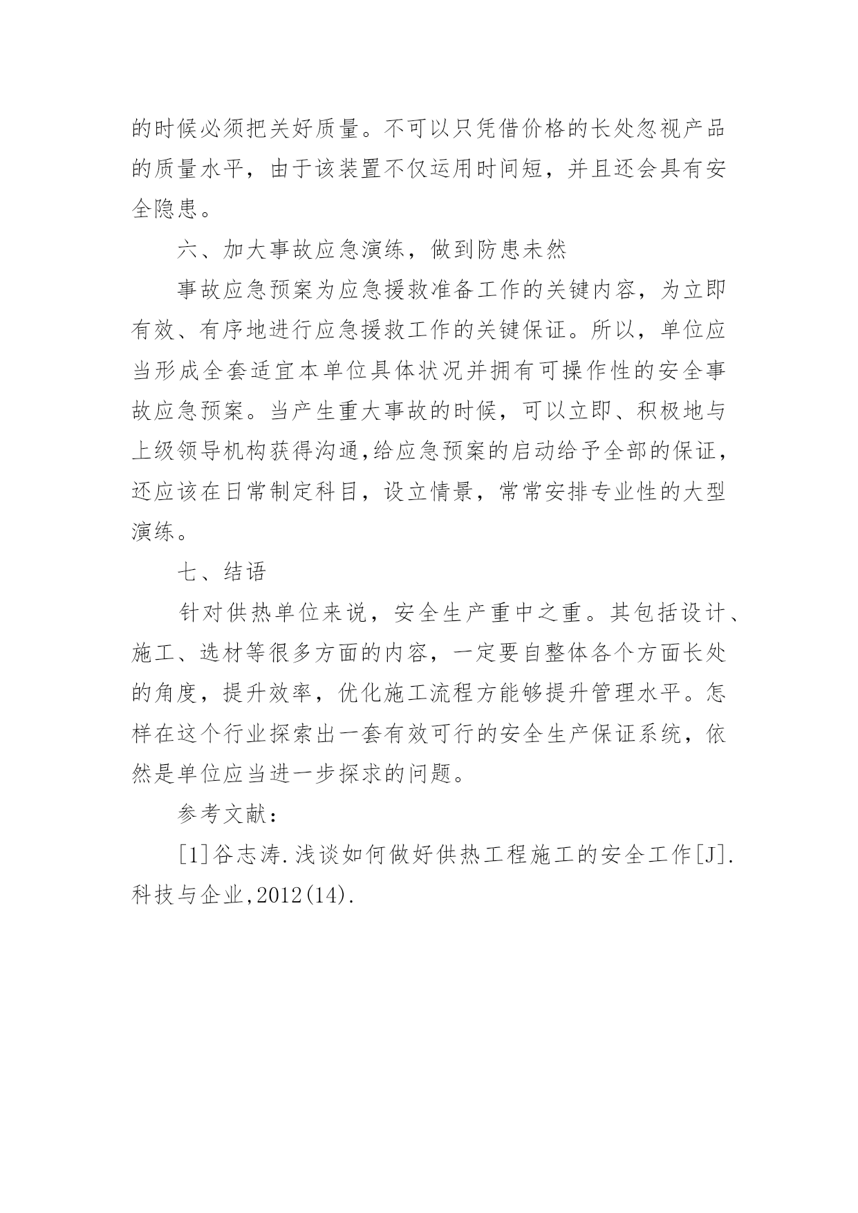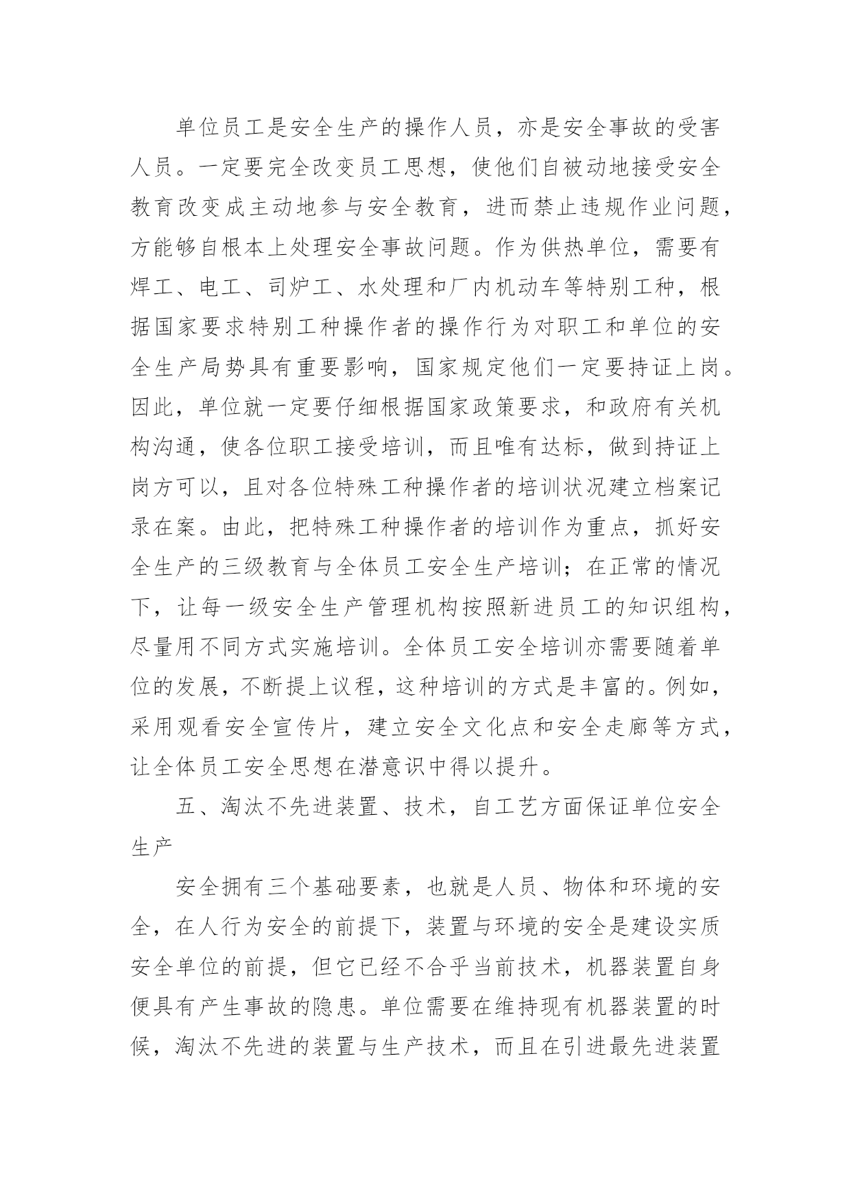 供热工程中的安全管理论文摘要:在供热工程里,特别是管网安装里,安全问题是最重要的,因此怎样在确保工程质量的基础上,做到安全施工,不出现事故,始终是单位管理者的一个难题。作者联系自身的工作经验,研究了安全生产的关键性,给出了施工时应该怎样提升安全管理的措施与提议。关键词:供热工程;安全管理;分析一、高度关注,加大领导,将安全生产工作放在明显位置单位领导是单位全部事项的最后决定人员,是单位每一项工作的引领者。强有力的组织部门建设是促进安全工作发展的组织保障,单位一定要构建强有力的安全生产领导部门,形成领导亲自抓,分管领导实际抓,一级抓一级的安全生产工作体制,将安全生产工作纳入主要议程,时常性地分析布置安全生产工作,定期或者不定期地查看安全生产工作状况,立即处理具有的问题。而且,加大与各级政府机构的沟通,立即掌握上级企业的文件,对安全生产工作开展立即组织布置,各级领导一定要从思想至行为方面的高度关注,方能够确保每一项工作的顺利实施。二、完善机构,健全体制,进一步推动安全工作标准化单位应该进一步完善安全管理机构,健全安全管理体制,大力落实安全生产的基本工作,做到施工建设有法可依。还应该在单位里派一位专职分管安全的副经理,掌管安全生产的业务性工作。建立安全监督管理科室,而且在各个内部均有12位专职安全人员,自分管安全的领导至专职的安全人员,一定要接受过专业的培训,做到持证上岗。形成上到单位领导,下到班组安全人员,一级抓一级的格局。而且于每个下属机构内部逐步健全与加大兼职安全团队的构建,于生产一线构建起强有力的安全员保证系统。于体制建设里,上下级间做好健全安全生产的季报、月报、周报体制,必须做到查看有记录,问题要报告,隐患要排除。三、加强管理,贯彻安全生产责任制度为了仔细落实“安全第一,防范为主”的安全生产原则,确定施工工程时的安全生产责任人员、技术负责人员等相关管理者和各个职能机构安全生产的责任,保证生产人员在施工操作时的安全与健康,一定要制定和它相适宜的安全生产责任制度,其是降低事故产生的有效方法。单位应该每年把安全生产目标责任书细化,且把细化以后的每一项安全指标分配到有安全生产任务的每一个机构,而且让单位主要负责人员代表企业和每一个机构负责人员签订安全生产目标责任书,确定奖励惩罚规范,而且让这些机构把安全生产目标责任书签到各个班组。这些责任书的.签订,让人们清楚了自身所担负的安全责任,进而在今后的工作里做到具有针对性,最后形成全面的安全责任系统。四、把单位职工的持证上岗培训作为重点,抓好每一级安全生产培训单位员工是安全生产的操作人员,亦是安全事故的受害人员。一定要完全改变员工思想,使他们自被动地接受安全教育改变成主动地参与安全教育,进而禁止违规作业问题,方能够自根本上处理安全事故问题。作为供热单位,需要有焊工、电工、司炉工、水处理和厂内机动车等特别工种,根据国家要求特别工种操作者的操作行为对职工和单位的安全生产局势具有重要影响,国家规定他们一定要持证上岗。因此,单位就一定要仔细根据国家政策要求,和政府有关机构沟通,使各位职工接受培训,而且唯有达标,做到持证上岗方可以,且对各位特殊工种操作者的培训状况建立档案记录在案。由此,把特殊工种操作者的培训作为重点,抓好安全生产的三级教育与全体员工安全生产培训;在正常的情况下,让每一级安全生产管理机构按照新进员工的知识组构,尽量用不同方式实施培训。全体员工安全培训亦需要随着单位的发展,不断提上议程,这种培训的方式是丰富的。例如,采用观看安全宣传片,建立安全文化点和安全走廊等方式,让全体员工安全思想在潜意识中得以提升。五、淘汰不先进装置、技术,自工艺方面保证单位安全生产安全拥有三个基础要素,也就是人员、物体和环境的安全,在人行为安全的前提下,装置与环境的安全是建设实质安全单位的前提,但它已经不合乎当前技术,机器装置自身便具有产生事故的隐患。单位需要在维持现有机器装置的时候,淘汰不先进的装置与生产技术,而且在引进最先进装置的时候必须把关好质量。不可以只凭借价格的长处忽视产品的质量水平,由于该装置不仅运用时间短,并且还会具有安全隐患。六、加大事故应急演练,做到防患未然事故应急预案为应急援救准备工作的关键内容,为立即有效、有序地进行应急援救工作的关键保证。所以,单位应当形成全套适宜本单位具体状况并拥有可操作性的安全事故应急预案。当产生重大事故的时候,可以立即、积极地与上级领导机构获得沟通,给应急预案的启动给予全部的保证,还应该在日常制定科目,设立情景,常常安排专业性的大型演练。七、结语针对供热单位来说,安全生产重中之重。其包括设计、施工、选材等很多方面的内容,一定要自整体各个方面长处的角度,提升效率,优化施工流程方能够提升管理水平。怎样在这个行业探索出一套有效可行的安全生产保证系统,依然是单位应当进