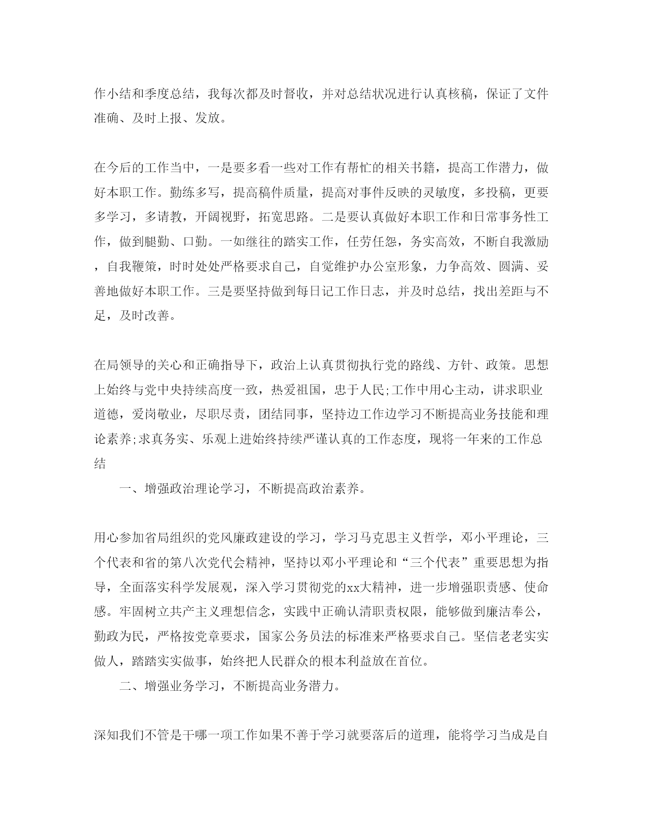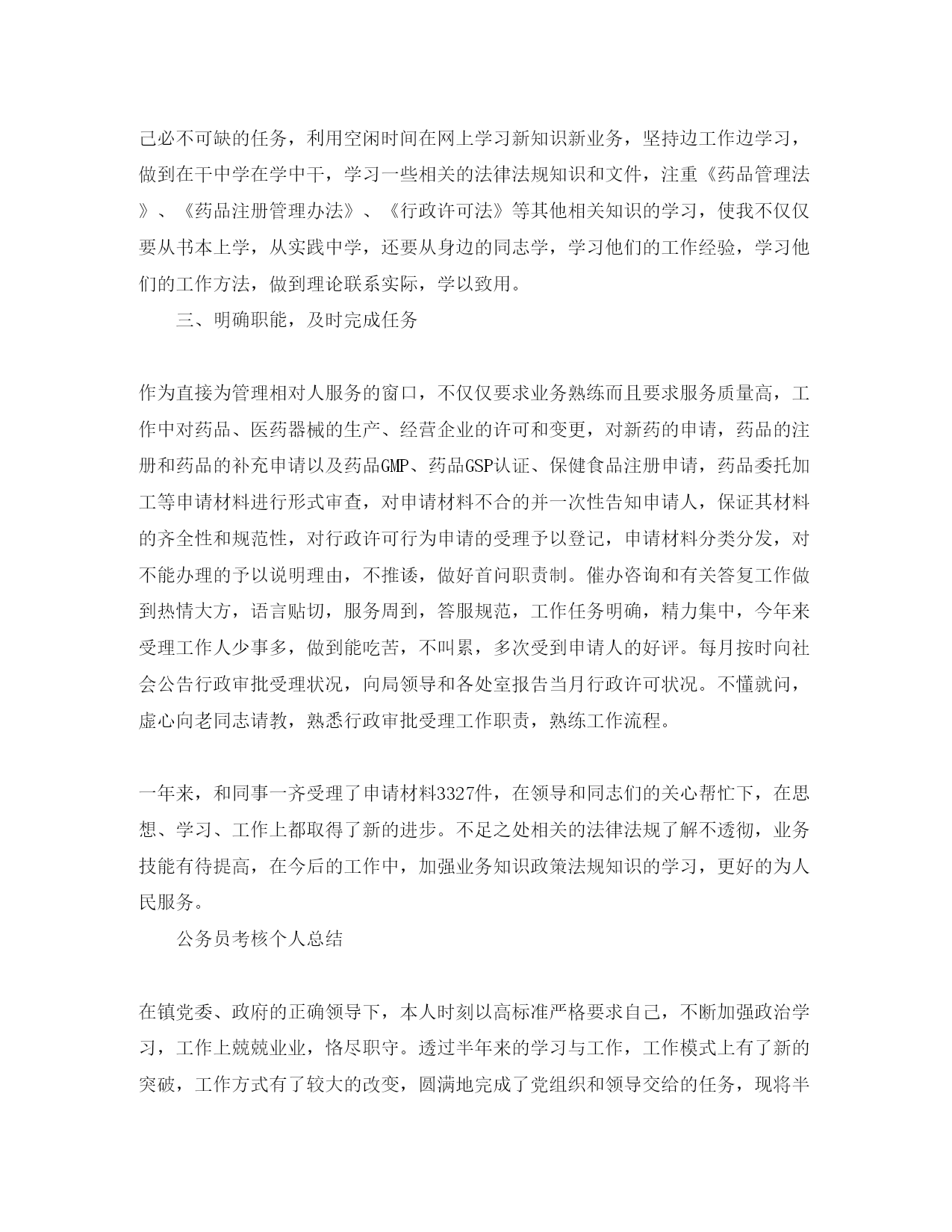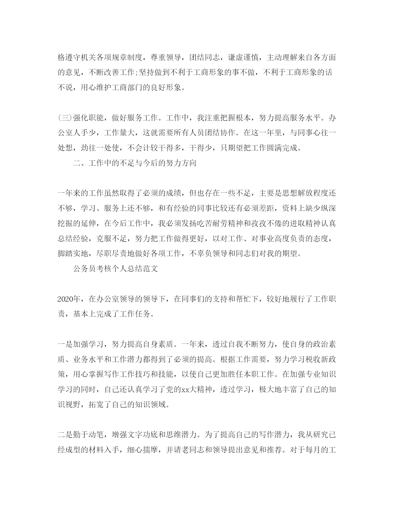 此资料由网络收集而来,如有侵权请告知上传者立即删除。资料共分享,我们负责传递知识。公务员个人考核总结报告相信很多的人都想要报考公务员,那么你知道公务员考核总结所以怎么写的吗?下面小编就和大家分享公务员个人考核总结,来欣赏一下吧。公务员个人考核总结xx年即将结束,下面我对本年度个人工作思想状况简要总结如下:在领导和同志们的关怀、帮忙、支持下,紧紧围绕本所工作,充分发挥岗位职能,不断改善工作方法,提高工作效率,以“服从领导、团结同志、认真学习、扎实工作”为准则,始终坚持高标准、严要求,较好地完成了各项工作任务。我始终把学习放在重要位置,努力在提高自身综合素质上下功夫。在政治学习方面,透过学习邓小平理论及“三个代表”、胡总书记的“科学发展观”的重要思想,尤其是学习xx大精神,进一步增强了党性,提高了自己政治洞察力,牢固树立了全心全意为人民服务的宗旨和正确的世界观、人生观、价值观。一、一年来的工作表现(一)强化形象,提高自身素质。为做好督查工作,我坚持严格要求自己,注重以身作则,以诚待人,一是爱岗敬业讲奉献。,我正确认识自身的工作和价值,正确处理苦与乐,得与失、个人利益和群众利益的关系,坚持甘于奉献、诚实敬业,二是锤炼业务讲提高。经过学习和锻炼,自己在文字功夫上取得必须的进步,撰写简报5篇,利用办公室学习资料,细心学习他人长处,改掉自己不足,并虚心向领导、同事请教,在不断学习和探索中使自己在文字材料上有所提高。(二)严于律已,不断加强作风建设。一年来我对自身严格要求,始终把耐得平淡、舍得付出、默默无闻作为自己的准则,始终把作风建设的重点放在严谨、细致、扎实、求实脚踏实地埋头苦干上。在工作中,以制度、纪律规范自己的一切言行,严格遵守机关各项规章制度,尊重领导,团结同志,谦虚谨慎,主动理解来自各方面的意见,不断改善工作;坚持做到不利于工商形象的事不做,不利于工商形象的话不说,用心维护工商部门的良好形象。(三)强化职能,做好服务工作。工作中,我注重把握根本,努力提高服务水平。办公室人手少,工作量大,这就需要所有人员团结协作。在这一年里,与同事心往一处想,劲往一处使,不会计较干得多,干得少,只期望把工作圆满完成。二、工作中的不足与今后的努力方向一年来的工作虽然取得了必须的成绩,但也存在一些不足,主要是思想解放程度还不够,学习、服务上还不够,和有经验的同事比较还有必须差距,资料上缺少纵深挖掘的延伸,在今后工作中,我必须发扬吃苦耐劳精神和孜孜不倦的进取精神认真总结经验,克服不足,努力把工作做得更好,以对工作、对事业高度负责的态度,脚踏实地,尽职尽责地做好各项工作,不辜负领导和同志们对我的期望。公务员考核个人总结范文2020年,在办公室领导的领导下,在同事们的支持和帮忙下,较好地履行了工作职责,基本上完成了工作任务。一是加强学习,努力提高自身素质。一年来,透过自我不断努力,使自身的政治素质、业务水平和工作潜力都得到了必须的提高。根据工作需要,努力学习税收新政策,用心掌握写作工作技巧和技能,以使自己更加胜任本职工作。在加强专业知识学习的同时,自己还认真学习了党的xx大精神,透过学习,极大地丰富了自己的知识视野,拓宽了自己的知识领域。二是勤于动笔,增强文字功底和思维潜力。为了提高自己的写作潜力,我从研究已经成型的材料入手,细心揣摩,并请老同志和领导提出意见和推荐。对于每月的工作小结和季度总结,我每次都及时督收,并对总结状况进行认真核稿,保证了文件准确、及时上报、发放。在今后的工作当中,一是要多看一些对工作有帮忙的相关书籍,提高工作潜力,做好本职工作。勤练多写,提高稿件质量,提高对事件反映的灵敏度,多投稿,更要多学习,多请教,开阔视野,拓宽思路。二是要认真做好本职工作和日常事务性工作,做到腿勤、口勤。一如继往的踏实工作,任劳任怨,务实高效,不断自我激励,自我鞭策,时时处处严格要求自己,自觉维护办公室形象,力争高效、圆满、妥善地做好本职工作。三是要坚持做到每日记工作日志,并及时总结,找出差距与不足,及时改善。在局领导的关心和正确指导下,政治上认真贯彻执行党的路线、方针、政策。思想上始终与党中央持续高度一致,热爱祖国,忠于人民;工作中用心主动,讲求职业道德,爱岗敬业,尽职尽责,团结同事,坚持边工作边学习不断提高业务技能和理论素养;求真务实、乐观上进始终持续严谨认真的工作态度,现将一年来的工作总结一、增强政治理论学习,不断提高政治素养。用心参加省局组织的党风廉政建设的学习,学习马克思主义哲学,邓小平理论,三个代表和省的第八次党代会精神,坚持以邓小平理论和“三个代表”重要思想为指导,全面落实科学发展观,深入学习贯彻党的xx大精神,进一步增强职责感、使命感。牢固树立共产主义理想信念,实践中正确认清职责权限,能够做到廉洁奉公,勤