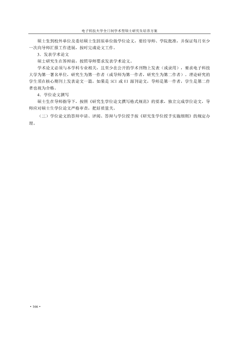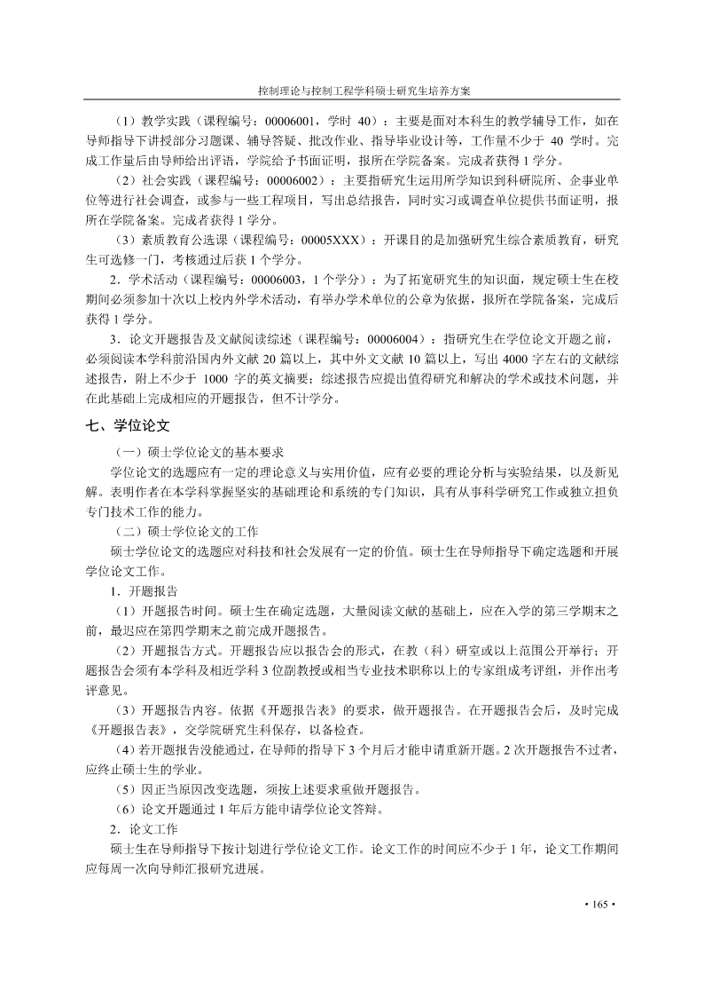 控制理论与控制工程学科硕士研究生培养方案控制理论与控制工程学科硕士研究生培养方案(专业代码:081101)控制理论与控制工程学科是控制科学与工程一级学科下的二级学科,控制理论及工程实践的发展,是20世纪以来推动人类社会进步的重要动力,在工业生产、人民生活及国防建设等各个方面起着举足轻重的作用,自动化水平的高低是衡量一个国家现代化进程的重要标志。本学科的研究范畴涵盖系统的建模、优化、控制算法、控制系统设计以及系统仿真等,本学科与电子科学与技术、仪器科学与技术、计算机科学与技术、系统科学等多学科有十分密切的联系。一、培养目标硕士学位获得者应在控制理论与控制工程学科领域具有坚实的专业基础理论和系统的专门知识;了解本学科某一方向的发展现状和科学与技术前沿;具有独立进行理论和实验研究的基本能力和从事技术开发的能力,有严谨求实的科学作风;掌握一门外国语;能作为骨干人才从事本学科或相近学科的科研、教学、工程技术和管理工作。二、研究方向1.智能信息处理与控制2.无线传感网络3.测控系统及信号处理技术4.复杂系统分析与控制5.电气传动及自动控制6.新型导航定位及精确制导技术7.飞行器控制与仿真技术8.非线性系统的建模与控制9.优化控制10.新能源控制技术三、培养方式和学习年限全日制硕士研究生学习年限一般为两年半至三年;在职硕士研究生学习年限一般为三年半至四年;提前完成硕士学业者,可提前半年毕业;若因客观原因不能按时完成学业者,可申请适当延长学习年限,但最长学习年限不得超过四年。四、学分与课程学习基本要求总学分要求不低于26个学分,其中课程总学分不低于24学分,基础课不多于6个学分,必修环节不低于2学分。课程学习中,学位课不低于15学分,其中公共基础课必修,基础课至少选修一门。专业基础课中有“*”标志的为全校共选专业基础课。允许在导师指导下、在相同学科门类之间、工科与理科之间跨学科选修1~2门学位课作为本学科的学位课。学位课可以代替非学位课,但非学位课不能代替学位课;跨学科专业录取的硕士研究生至少补修本专业本科核心课程2门,通过考试,但不计学分。未通过者不能选修专业课。研究生导师负责指导研究生制定个人培养计划和选课。研究生学习与研究课题有关的专业知识,可由导师指定内容学习某些课程,并列入个人培养计划,但不计学分。·163·电子科技大学全日制学术型硕士研究生培养方案五、课程设置研究生课程主要划分为学位课、非学位选修课、必修环节三大部分。控制理论与控制工程学科硕士研究生课程设置类别课程编号课程名称学时学分开课学期考核方式备注16005004中国特色社会主义理论与实践研究3621考试公共13005001硕士生英语阅读与翻译6021/2考试基础课13005002硕士生英语听说与写作3011/2考试10005001矩阵理论6031考试学10005002数理统计学4022考试基础课位10006001泛函分析6031考试课20005001随机过程及应用6031考试20006003*最优化理论与应用502.51考试专业07015012信号处理方法及应用4022考试基础课07026003线性系统理论502.51考试07026005自适应控制4022考试07025001电气传动与自动控制201207026004系统建模方法4022控制理论与控制07026006非线性系统理论4022工程二级学科非07027001复杂系统性能评价和优化2012专业学07027005智能控制理论及应用4022选修课位检测技术与自动07036001无线传感器网络2011选化装置二级学科修模式识别与智能07047002模式识别与机器学习6032课系统二级学科16005005自然辨证法1812公共选修课其它07887001学科前沿知识专题讲座2011选修课跨学科相关课程必修环节详见第“六”条说明跨学科专业自动控制原理考试考生补修本微机原理与应用不计学分考试科核心课程脉冲与数字电路考试六、必修环节硕士研究生必修环节包含三大部分,要求研究生分别完成以下内容:1.教学实践、社会实践、素质教育公选课要求三选一,完成后获得1学分。·164·控制理论与控制工程学科硕士研究生培养方案(1)教学实践(课程编号:00006001,学时40):主要是面对本科生的教学辅导工作,如在导师指导下讲授部分习题课、辅导答疑、批改作业、指导毕业设计等,工作量不少于40学时。完成工作量后由导师给出评语,学院给予书面证明,报所在学院备案。完成者获得1学分。(2)社会实践(课程编号:00006002):主要指研究生运用所学