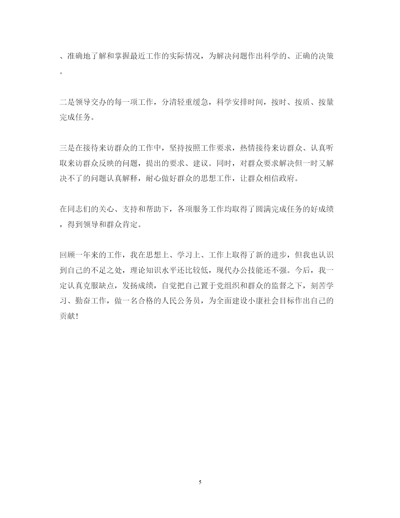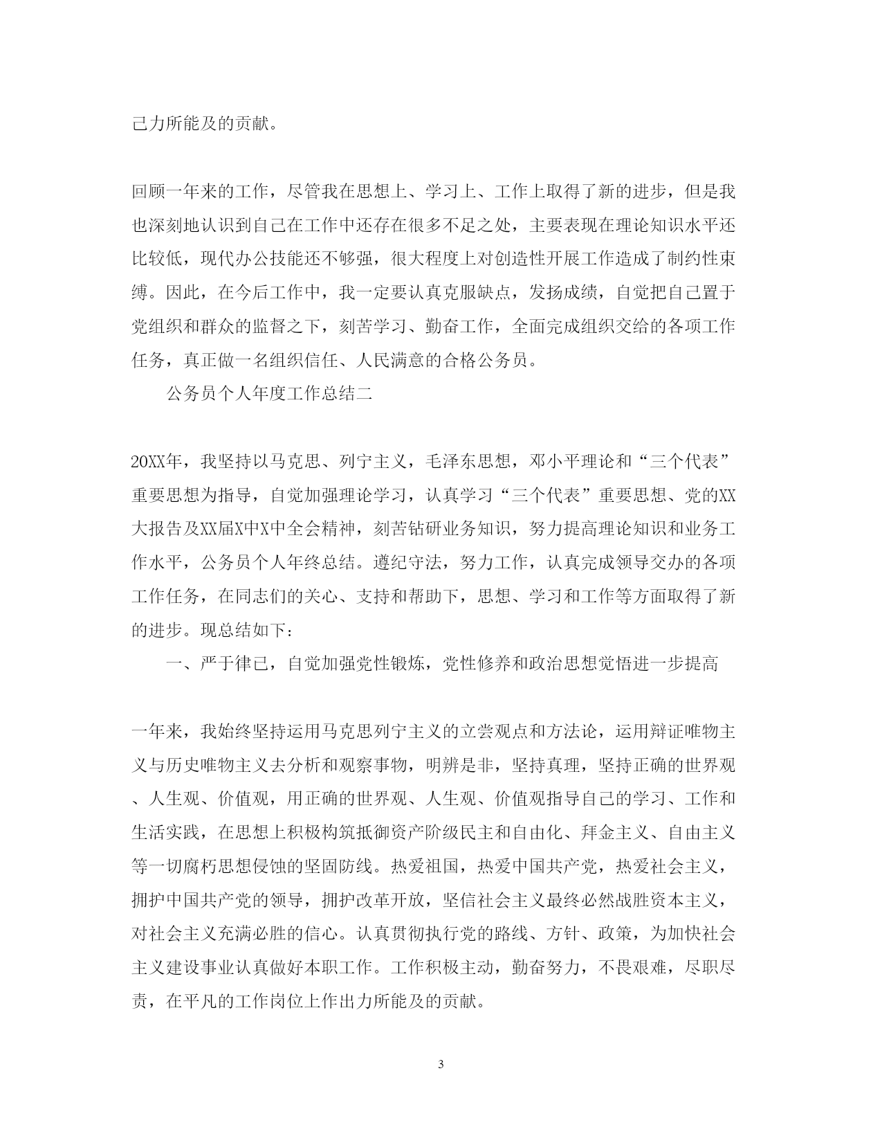 此资料由网络收集而来,如有侵权请告知上传者立即删除。资料共分享,我们负责传递知识。PAGEPAGE5公务员个人工作年度总结作为一名合格的公务员,要及时的去做好工作的总结。下面是小编搜集整理的公务员个人年度工作总结,欢迎阅读。公务员个人年度工作总结一一年来,在局领导班子的正确领导下,在同志们的大力支持帮助下,我始终坚持把学习建设具有中国特色社会主义创新理论作为提高自身政治素质的主要途径,认真学习和领会邓小平理论、“xxxx”重要思想及科学发展观深刻内涵,全面了解掌握了党的xx届三中、四中、五中全会精神及加强党的执政能力建设等方面的重大理论知识,不断提高自身政策理论水平,以增强自身在实际工作中发现问题、分析问题、解决问题的能力。与此同时,我积极参与全县创先争优活动及局上组织的各类学习教育活动,主动分析查找本人在思想认识、工作作风等方面存在的不足和问题,认真开展批评与自我批评,解放思想,转变观念,积极整改,力求实效,从根本上改变以往自由散漫、思想保守、爱发牢骚等不良习惯,真正做到大事讲原则,小事讲风格,使自己的党性和人品得到很好锻炼。通过不懈努力,较好地完成了局上交办的各项工作任务,现将XX年个人工作总结如下:一、内强素质,外树形象。一年来,我始终坚持马列主义立场和观点,熟练掌握科学发展观的方法论,灵活应用辩证唯物主义与历史唯物主义去分析和发现解决工作中遇到的新情况、新问题,明辨是非,坚持真理,坚持用正确的世界观、人生观、价值观指导自己的学习、工作和生活实践,在思想上积极构筑抵御一切腐朽思想侵蚀的坚固道德防线,全面提升自身综合素质。自觉服从组织工作安排,严格遵守工作纪律,顾大局、识大体,克己奉公,按章办事,作风正派,团结同志,从不计较个人得失。在实际工作中,始终坚持以人民群众根本利益为本的思想路线,一切从实际出发,讲实话,办实事,求实效,真抓实干,真正按照人民群众的意愿依法履行好自己的职责,积极参与各种形式的社会救助实践活动,以实际行动兑现自己作为一名构建社会主义和谐社会的坚定拥护者、执政为民的实践者、遵纪守法的倡导者的庄严承诺。二、强化理论和业务学习,不断提高自身综合素质。在实际工作中,我始终坚持把理论学习作为提高自身综合素质的最有效途径抓实抓好,抓出成效。一方面我积极参与局上组织各类学习教育活动,不断积累理论知识、努力提高工作技能的同时,踊跃报名参加省、市、县组织的各类业务技能知识培训,有针对性地重点学习掌握了公文写作、电脑操作技能及法律法规知识,使自己在实际工作技能上有较大提高和进步,真正做到学习工作两不误、两促进、两提高。三、努力加强党性锻炼,不断增强拒腐防变能力。多年来,我积极倡导勤政廉洁的优良作风。无论在生活上还是在工作上,我始终保持着节俭习惯,慎细慎微,从不大意,时刻检点着自己的言行,严格执行审计干部工作纪律,从不向被审计单位吃拿卡要,并自觉接受社会监督;时刻牢记党的宗旨,严守党的纪律,坚决与享乐主义、拜金主义、形式主义、官僚思想作斗争,反对一切形式的浪费之风、奢靡之风、腐化之风,以实际行动维护社会公平正义。四、努力工作,按时全面完成各项工作任务。一年来,我遵照领导安排,对局上交办的每一项工作任务,都能做到分清轻重缓急,科学安排时间,按时、按质、按量地完成各项工作任务。特别是一年来,在开展全局创先争优活动中,我尽心尽职,积极配合办公室开展工作,较好地完成地县委创先争优活动领导小组办公室安排的各项工作任务,得到领导和同志们肯定和认可。同时,我积极配合其他同志开展工作,为创建“六型”机关做出了自己力所能及的贡献。回顾一年来的工作,尽管我在思想上、学习上、工作上取得了新的进步,但是我也深刻地认识到自己在工作中还存在很多不足之处,主要表现在理论知识水平还比较低,现代办公技能还不够强,很大程度上对创造性开展工作造成了制约性束缚。因此,在今后工作中,我一定要认真克服缺点,发扬成绩,自觉把自己置于党组织和群众的监督之下,刻苦学习、勤奋工作,全面完成组织交给的各项工作任务,真正做一名组织信任、人民满意的合格公务员。公务员个人年度工作总结二20XX年,我坚持以马克思、列宁主义,毛泽东思想,邓小平理论和“三个代表”重要思想为指导,自觉加强理论学习,认真学习“三个代表”重要思想、党的XX大报告及XX届X中X中全会精神,刻苦钻研业务知识,努力提高理论知识和业务工作水平,公务员个人年终总结。遵纪守法,努力工作,认真完成领导交办的各项工作任务,在同志们的关心、支持和帮助下,思想、学习和工作等方面取得了新的进步。现总结如下:一、严于律已,自觉加强党性锻炼,党性修养和政治思想觉悟进一步提高一年来,我始终坚持运用马克思列宁主义的立尝观点和方法论,运用辩证唯物主义与历史唯物主义去分析和观察事物,明辨