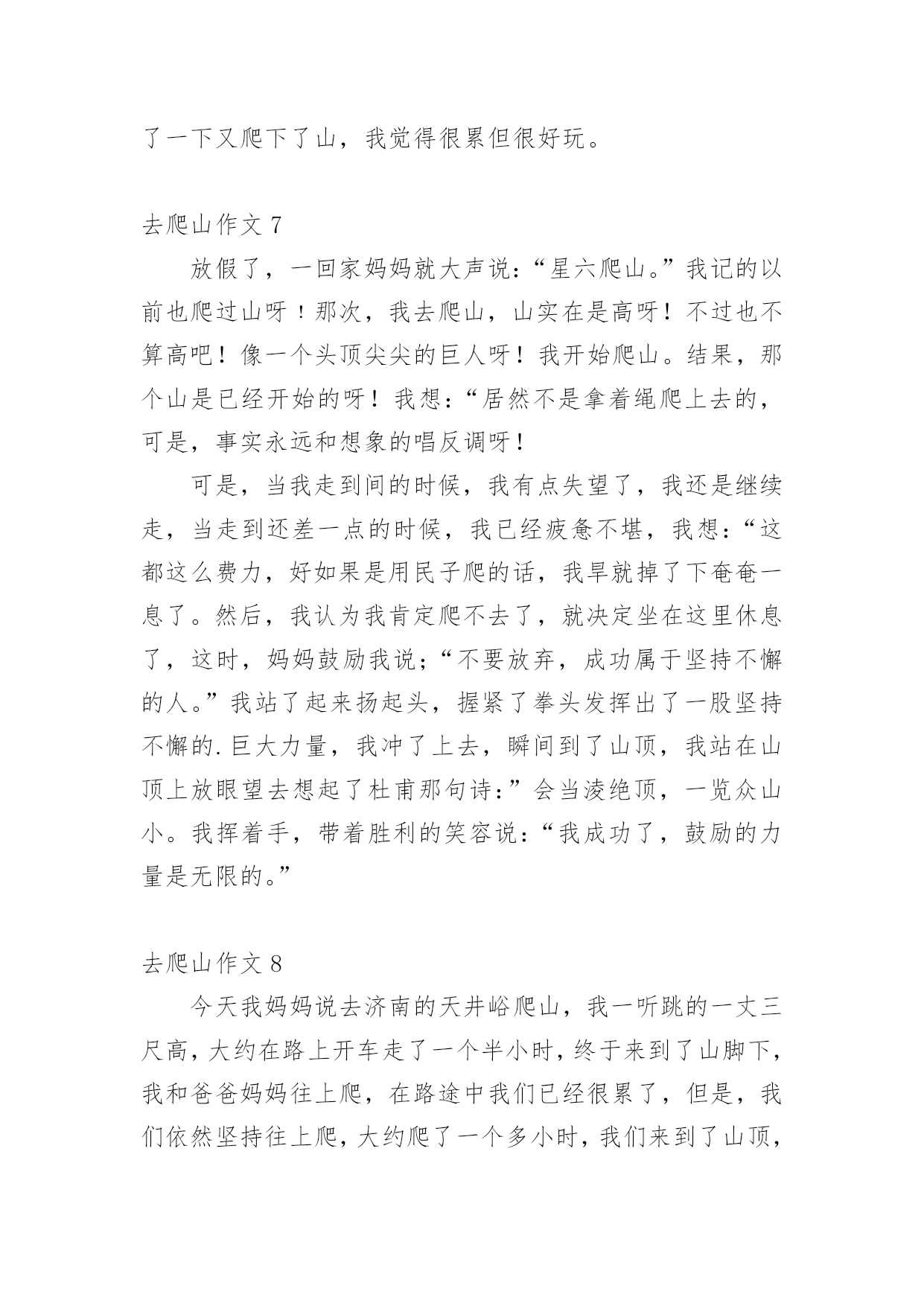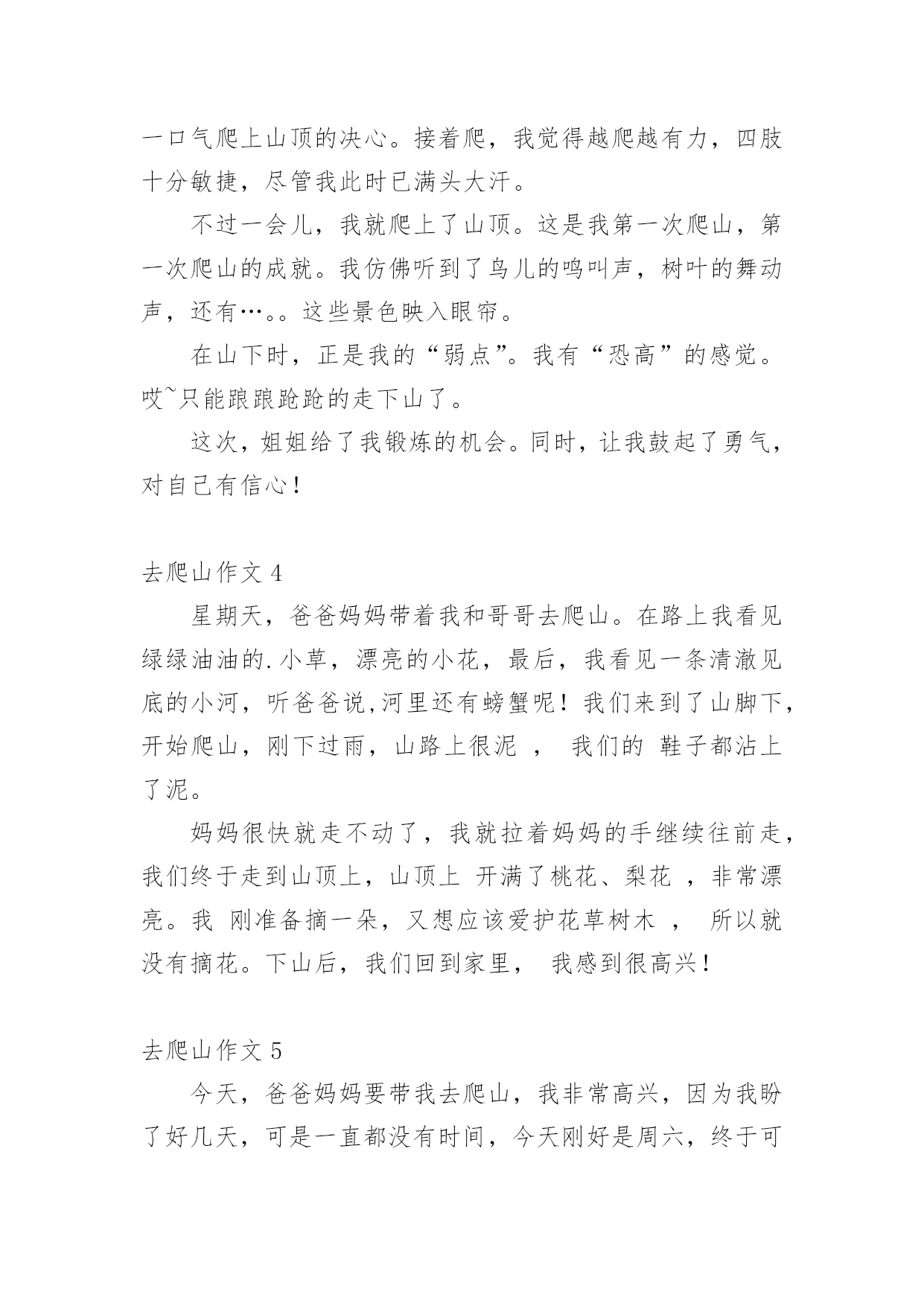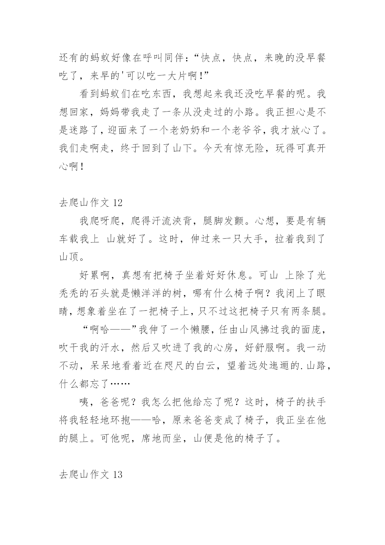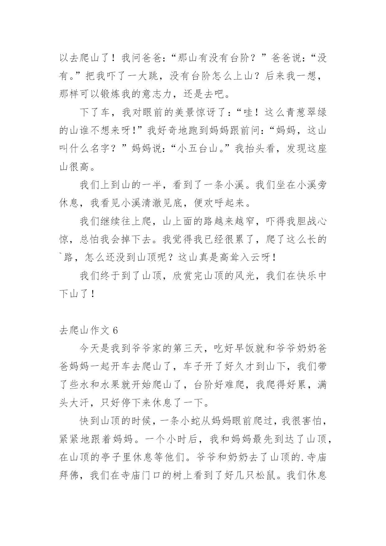 去爬山作文去爬山作文【热门】在日复一日的学习、工作或生活中,大家都接触过作文吧,作文一定要做到主题集中,围绕同一主题作深入阐述,切忌东拉西扯,主题涣散甚至无主题。那么你知道一篇好的作文该怎么写吗?下面是小编整理的去爬山作文,仅供参考,希望能够帮助到大家。去爬山作文1一个春光明媚的上午,我、妈妈、哥哥和妹妹一起去爬山。我们走着弯弯曲曲的'山路,走进了绿色的世界。大自然的绿色世界里,藏着数不清的宝贝,有竹林、生果、茶树,我还看见了大河、、、、、、大河看上去非常孤独,于是找来小鱼、太阳、小船和树来做伴,我们听到浪花的声音,那是它在向我们问好。下山的时候,我看见了许许多多生产油的茶树,于是摘下一个茶果做纪念。突然,妹妹像一震风一样奔跑,跑得无影无踪,原来她早已回家了。爬山真有趣呀!去爬山作文2过年乐事可多了,吃年夜饭、看联欢会、收压岁钱┄┈,但我只对“爬山”情有独钟。那天大年三十,我们坐着汽车,欣赏着宜人的景色,一路狂奔着,不知不觉中来到了山脚下。往上一瞧,哇!那山似乎屹立在云层之中让人胆战心惊。接着,那惊心动魄的旅程开始了。我们一不步步艰难而又小心谨慎地走在那崎岖不平的山路上。走了许久,山路渐渐变得好走。有一块块石头奇形怪状在前面给我们当阶梯,我用那轻快的步伐走在升往“云层”的变异“电梯”上。走了许久,我们来到了庙前,里面供奉的都是各位神通广大的'神仙、佛祖。我们点燃香、蜡烛,虔诚的拜着:一叩一拜,诉说着马年的愿望和理想┄┄,在一旁的石壁上拍照留念,“咔嚓”——“咔嚓”——的“小曲”流动耳际。一张张照片记录了幸福快乐的一刻。天色渐渐暗下来了,我们也应该离开了。这次爬山中我不仅收获了快乐,还明白了:坚持就是胜利。”去爬山作文3看到这个题目,我就想到一件难忘的事,而且,这件事让我受益匪浅。以前,我一向是很怕高的,跟得了“恐高症”差不多。有一次,我和姐姐去爬山。我一听到“爬山”二字,就跟吃了“药”一般,非常高兴。这次,是我第一回爬山,还不知道怎么样才是爬山。现在来到山脚下,望着险峻的`山岭,鼓起勇气,开始爬。一直爬到半山腰,姐姐累了,而我,还是精神充沛,有一口气爬上山顶的决心。接着爬,我觉得越爬越有力,四肢十分敏捷,尽管我此时已满头大汗。不过一会儿,我就爬上了山顶。这是我第一次爬山,第一次爬山的成就。我仿佛听到了鸟儿的鸣叫声,树叶的舞动声,还有…。。这些景色映入眼帘。在山下时,正是我的“弱点”。我有“恐高”的感觉。哎~只能踉踉跄跄的走下山了。这次,姐姐给了我锻炼的机会。同时,让我鼓起了勇气,对自己有信心!去爬山作文4星期天,爸爸妈妈带着我和哥哥去爬山。在路上我看见绿绿油油的.小草,漂亮的小花,最后,我看见一条清澈见底的小河,听爸爸说,河里还有螃蟹呢!我们来到了山脚下,开始爬山,刚下过雨,山路上很泥,我们的鞋子都沾上了泥。妈妈很快就走不动了,我就拉着妈妈的手继续往前走,我们终于走到山顶上,山顶上开满了桃花、梨花,非常漂亮。我刚准备摘一朵,又想应该爱护花草树木,所以就没有摘花。下山后,我们回到家里,我感到很高兴!去爬山作文5今天,爸爸妈妈要带我去爬山,我非常高兴,因为我盼了好几天,可是一直都没有时间,今天刚好是周六,终于可以去爬山了!我问爸爸:“那山有没有台阶?”爸爸说:“没有。”把我吓了一大跳,没有台阶怎么上山?后来我一想,那样可以锻炼我的意志力,还是去吧。下了车,我对眼前的美景惊讶了:“哇!这么青葱翠绿的山谁不想来呀!”我好奇地跑到妈妈跟前问:“妈妈,这山叫什么名字?”妈妈说:“小五台山。”我抬头看,发现这座山很高。我们上到山的一半,看到了一条小溪。我们坐在小溪旁休息,我看见小溪清澈见底,便欢呼起来。我们继续往上爬,山上面的路越来越窄,吓得我胆战心惊,总怕我会掉下去。我觉得我已经很累了,爬了这么长的`路,怎么还没到山顶呢?这山真是高耸入云呀!我们终于到了山顶,欣赏完山顶的风光,我们在快乐中下山了!去爬山作文6今天是我到爷爷家的第三天,吃好早饭就和爷爷奶奶爸爸妈妈一起开车去爬山了,车子开了好久才到山下,我们带了些水和水果就开始爬山了,台阶好难爬,我爬得好累,满头大汗,只好停下来休息了一下。快到山顶的时候,一条小蛇从妈妈眼前爬过,我很害怕,紧紧地跟着妈妈。一个小时后,我和妈妈最先到达了山顶,在山顶的亭子里休息等他们。爷爷和奶奶去了山顶的.寺庙拜佛,我们在寺庙门口的树上看到了好几只松鼠。我们休息了一下又爬下了山,我觉得很累但很好玩。去爬山作文7放假了,一回家妈妈就大声说:“星六爬山。”我记的以前也爬过山呀﹗那次,我去爬山,山实在是高呀!不过也不算高吧!像一个头顶尖尖的巨人呀!我开始爬山。结果,那个山是已经开始的呀!我想:“居然不是拿着绳爬上去的,可是,事实永远和想象的唱反调呀!可是,当我走到间的时候,我有点失望了,我还是继续走,当走到还差一