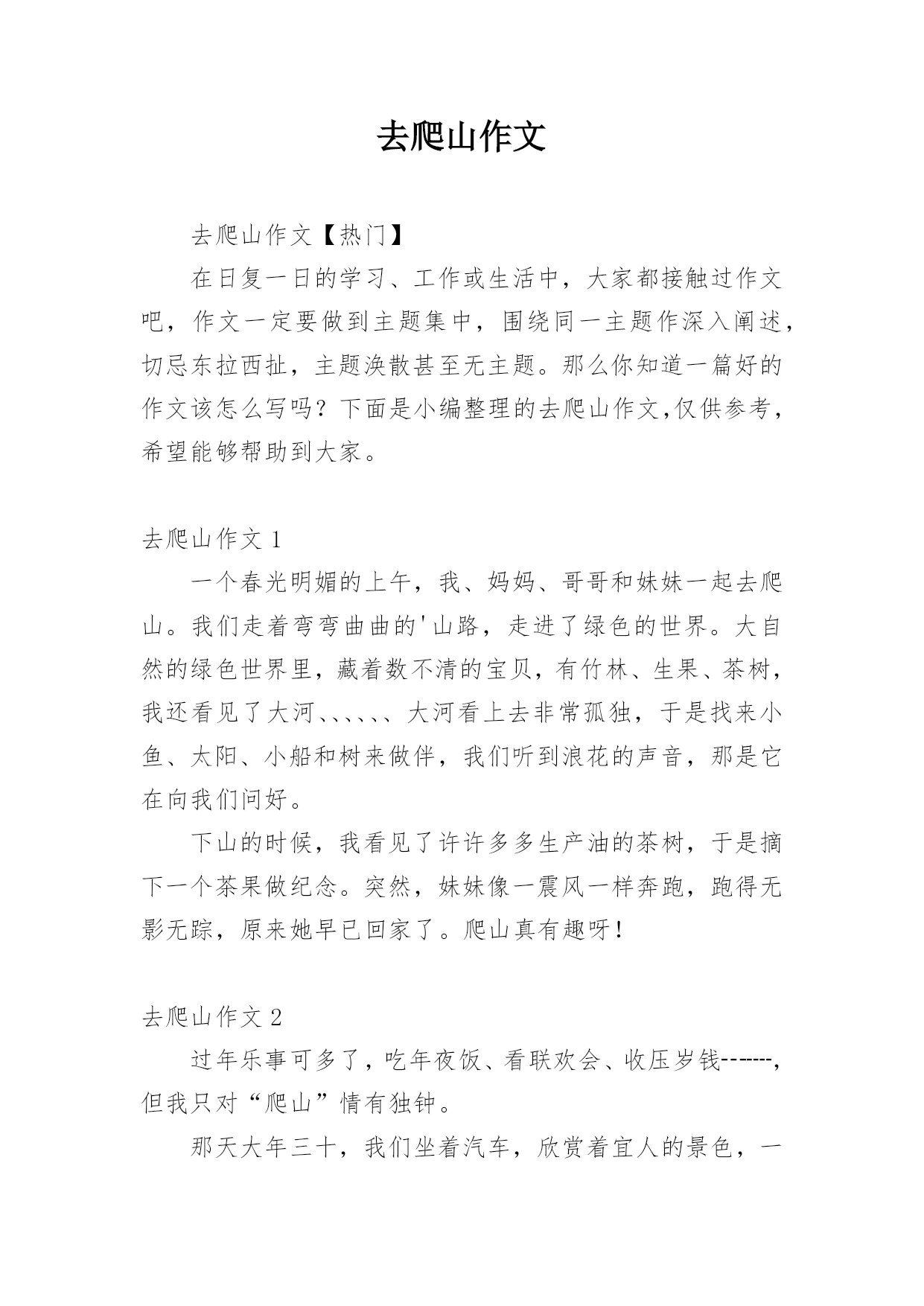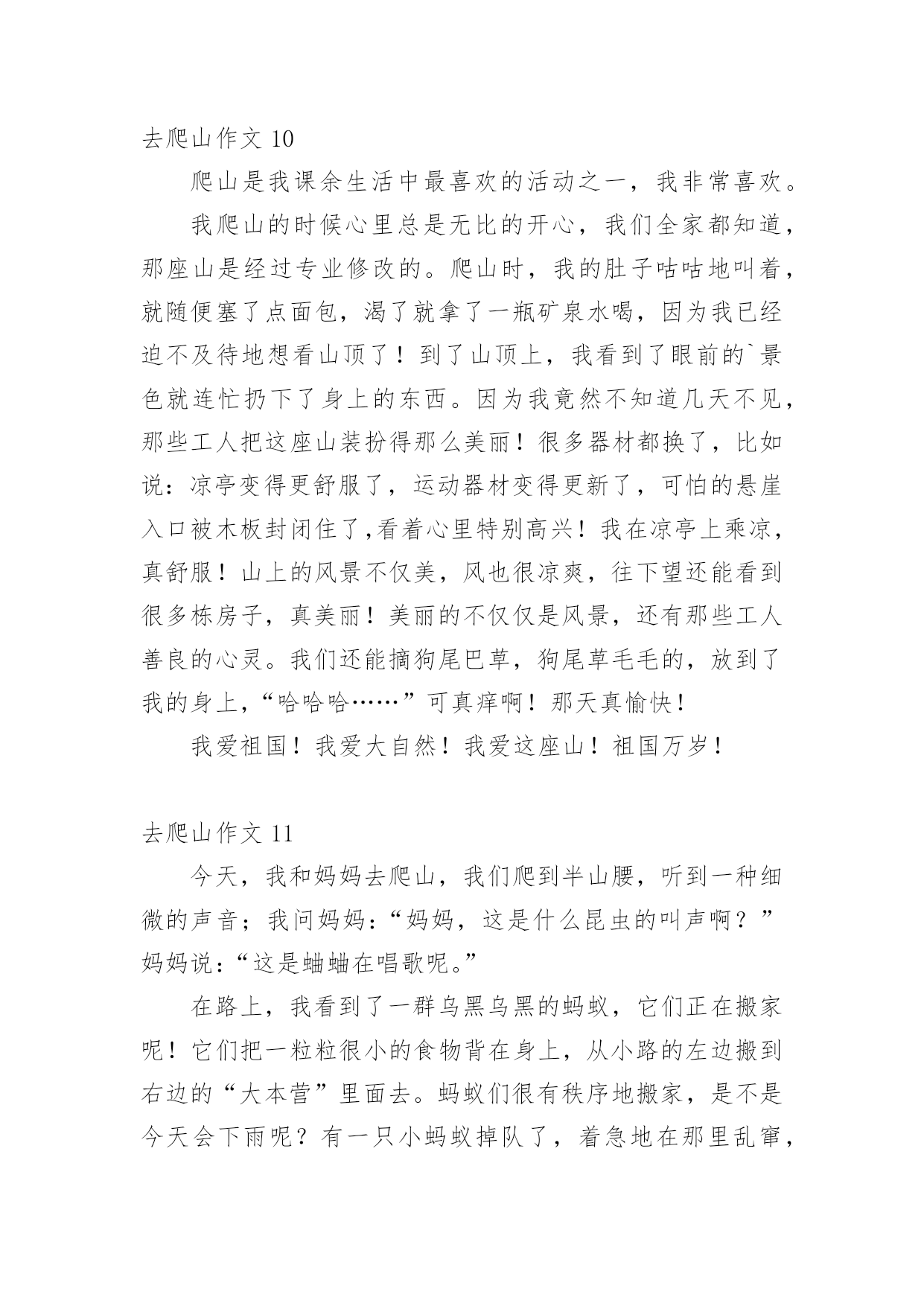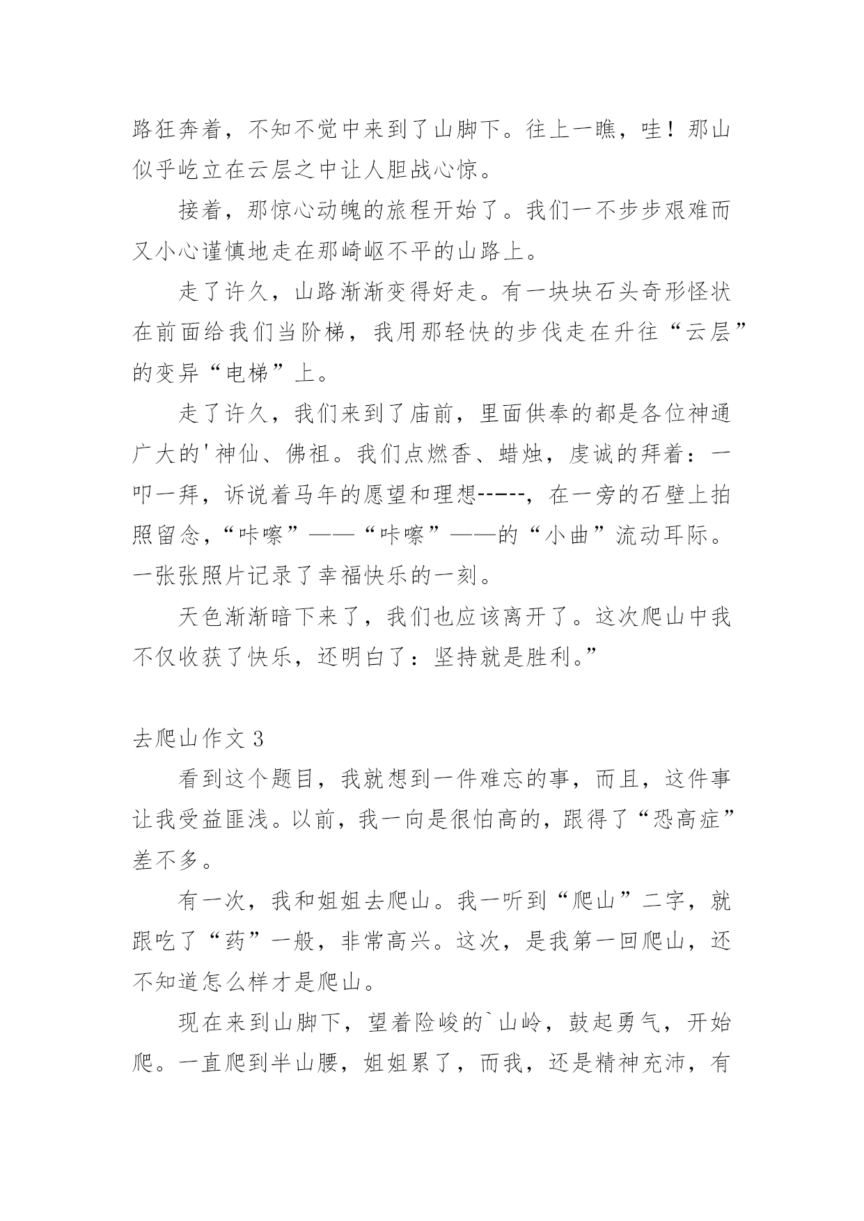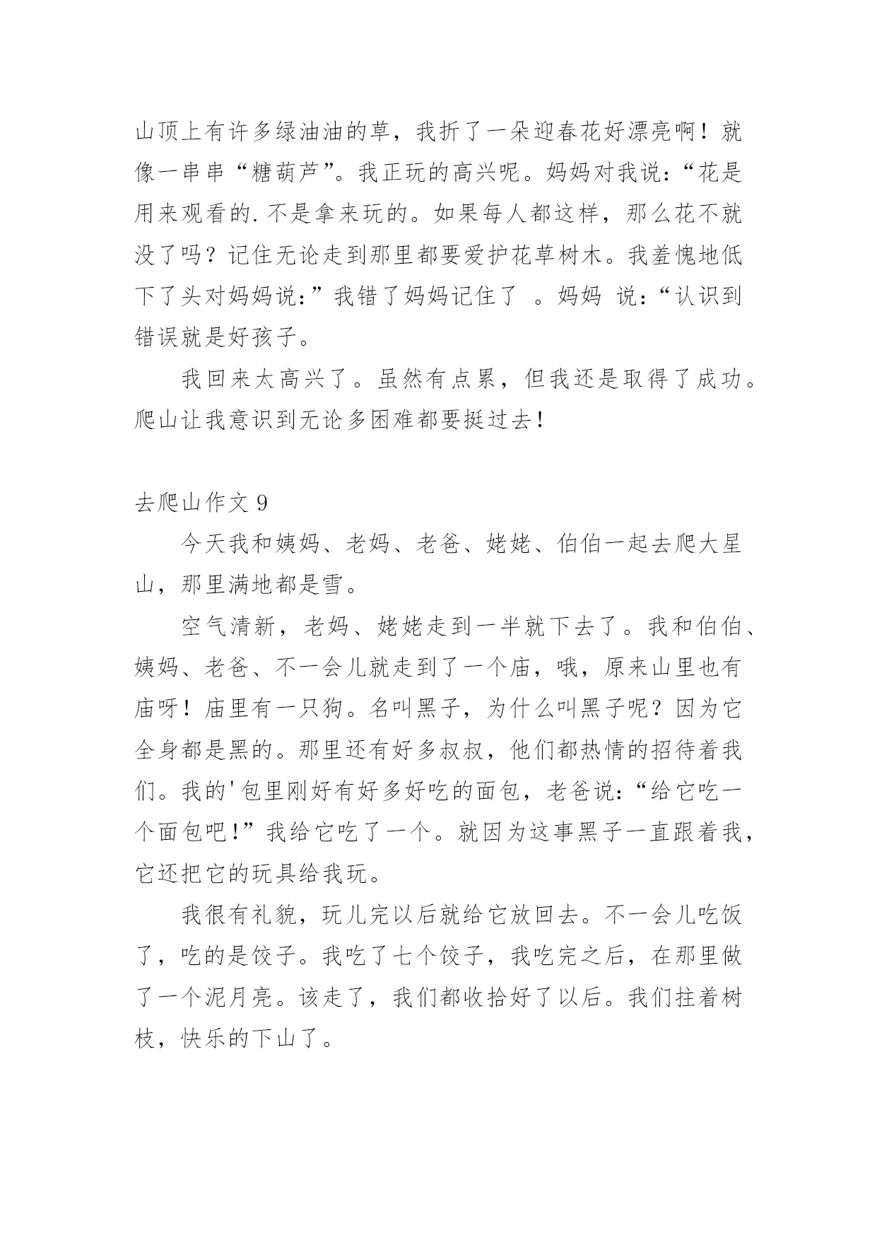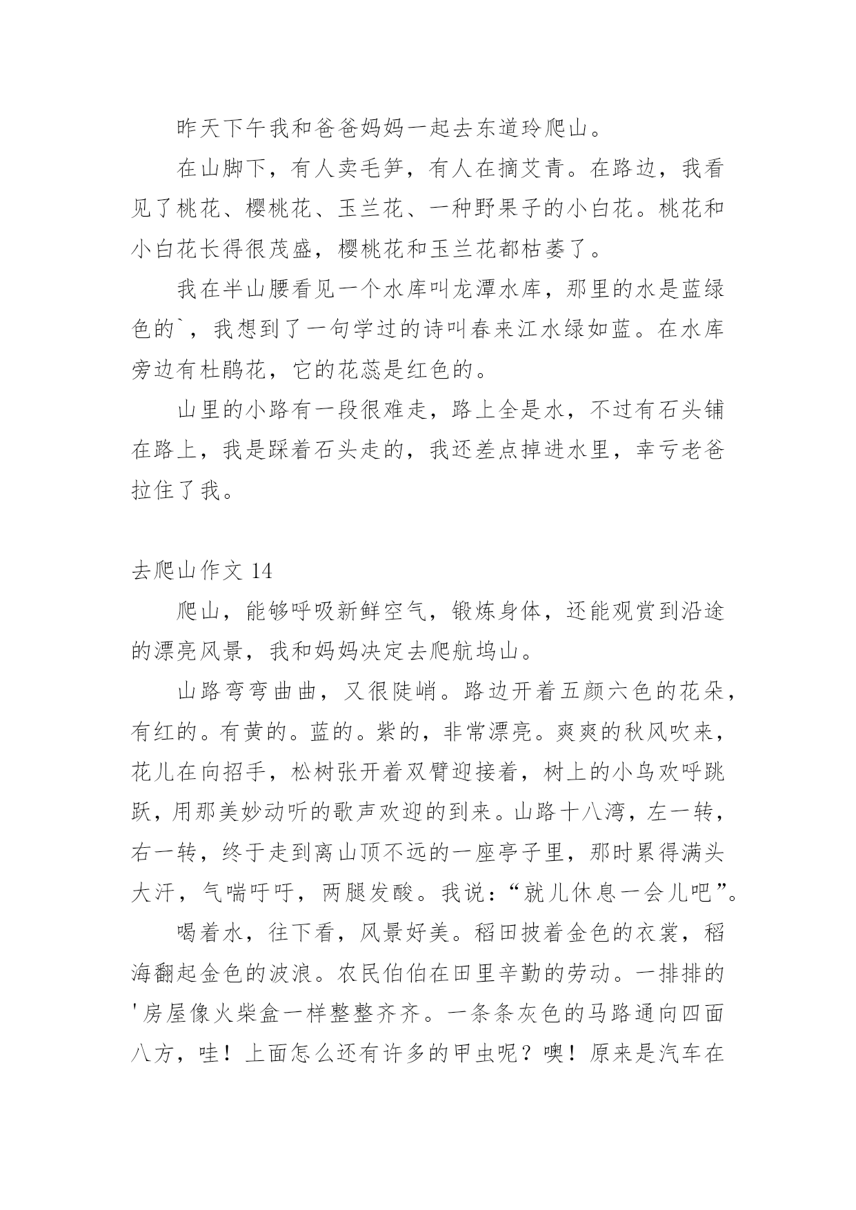 去爬山作文去爬山作文【热门】在日复一日的学习、工作或生活中,大家都接触过作文吧,作文一定要做到主题集中,围绕同一主题作深入阐述,切忌东拉西扯,主题涣散甚至无主题。那么你知道一篇好的作文该怎么写吗?下面是小编整理的去爬山作文,仅供参考,希望能够帮助到大家。去爬山作文1一个春光明媚的上午,我、妈妈、哥哥和妹妹一起去爬山。我们走着弯弯曲曲的'山路,走进了绿色的世界。大自然的绿色世界里,藏着数不清的宝贝,有竹林、生果、茶树,我还看见了大河、、、、、、大河看上去非常孤独,于是找来小鱼、太阳、小船和树来做伴,我们听到浪花的声音,那是它在向我们问好。下山的时候,我看见了许许多多生产油的茶树,于是摘下一个茶果做纪念。突然,妹妹像一震风一样奔跑,跑得无影无踪,原来她早已回家了。爬山真有趣呀!去爬山作文2过年乐事可多了,吃年夜饭、看联欢会、收压岁钱┄┈,但我只对“爬山”情有独钟。那天大年三十,我们坐着汽车,欣赏着宜人的景色,一路狂奔着,不知不觉中来到了山脚下。往上一瞧,哇!那山似乎屹立在云层之中让人胆战心惊。接着,那惊心动魄的旅程开始了。我们一不步步艰难而又小心谨慎地走在那崎岖不平的山路上。走了许久,山路渐渐变得好走。有一块块石头奇形怪状在前面给我们当阶梯,我用那轻快的步伐走在升往“云层”的变异“电梯”上。走了许久,我们来到了庙前,里面供奉的都是各位神通广大的'神仙、佛祖。我们点燃香、蜡烛,虔诚的拜着:一叩一拜,诉说着马年的愿望和理想┄┄,在一旁的石壁上拍照留念,“咔嚓”——“咔嚓”——的“小曲”流动耳际。一张张照片记录了幸福快乐的一刻。天色渐渐暗下来了,我们也应该离开了。这次爬山中我不仅收获了快乐,还明白了:坚持就是胜利。”去爬山作文3看到这个题目,我就想到一件难忘的事,而且,这件事让我受益匪浅。以前,我一向是很怕高的,跟得了“恐高症”差不多。有一次,我和姐姐去爬山。我一听到“爬山”二字,就跟吃了“药”一般,非常高兴。这次,是我第一回爬山,还不知道怎么样才是爬山。现在来到山脚下,望着险峻的`山岭,鼓起勇气,开始爬。一直爬到半山腰,姐姐累了,而我,还是精神充沛,有一口气爬上山顶的决心。接着爬,我觉得越爬越有力,四肢十分敏捷,尽管我此时已满头大汗。不过一会儿,我就爬上了山顶。这是我第一次爬山,第一次爬山的成就。我仿佛听到了鸟儿的鸣叫声,树叶的舞动声,还有…。。这些景色映入眼帘。在山下时,正是我的“弱点”。我有“恐高”的感觉。哎~只能踉踉跄跄的走下山了。这次,姐姐给了我锻炼的机会。同时,让我鼓起了勇气,对自己有信心!去爬山作文4星期天,爸爸妈妈带着我和哥哥去爬山。在路上我看见绿绿油油的.小草,漂亮的小花,最后,我看见一条清澈见底的小河,听爸爸说,河里还有螃蟹呢!我们来到了山脚下,开始爬山,刚下过雨,山路上很泥,我们的鞋子都沾上了泥。妈妈很快就走不动了,我就拉着妈妈的手继续往前走,我们终于走到山顶上,山顶上开满了桃花、梨花,非常漂亮。我刚准备摘一朵,又想应该爱护花草树木,所以就没有摘花。下山后,我们回到家里,我感到很高兴!去爬山作文5今天,爸爸妈妈要带我去爬山,我非常高兴,因为我盼了好几天,可是一直都没有时间,今天刚好是周六,终于可以去爬山了!我问爸爸:“那山有没有台阶?”爸爸说:“没有。”把我吓了一大跳,没有台阶怎么上山?后来我一想,那样可以锻炼我的意志力,还是去吧。下了车,我对眼前的美景惊讶了:“哇!这么青葱翠绿的山谁不想来呀!”我好奇地跑到妈妈跟前问:“妈妈,这山叫什么名字?”妈妈说:“小五台山。”我抬头看,发现这座山很高。我们上到山的一半,看到了一条小溪。我们坐在小溪旁休息,我看见小溪清澈见底,便欢呼起来。我们继续往上爬,山上面的路越来越窄,吓得我胆战心惊,总怕我会掉下去。我觉得我已经很累了,爬了这么长的`路,怎么还没到山顶呢?这山真是高耸入云呀!我们终于到了山顶,欣赏完山顶的风光,我们在快乐中下山了!去爬山作文6今天是我到爷爷家的第三天,吃好早饭就和爷爷奶奶爸爸妈妈一起开车去爬山了,车子开了好久才到山下,我们带了些水和水果就开始爬山了,台阶好难爬,我爬得好累,满头大汗,只好停下来休息了一下。快到山顶的时候,一条小蛇从妈妈眼前爬过,我很害怕,紧紧地跟着妈妈。一个小时后,我和妈妈最先到达了山顶,在山顶的亭子里休息等他们。爷爷和奶奶去了山顶的.寺庙拜佛,我们在寺庙门口的树上看到了好几只松鼠。我们休息了一下又爬下了山,我觉得很累但很好玩。去爬山作文7放假了,一回家妈妈就大声说:“星六爬山。”我记的以前也爬过山呀﹗那次,我去爬山,山实在是高呀!不过也不算高吧!像一个头顶尖尖的巨人呀!我开始爬山。结果,那个山是已经开始的呀!我想:“居然不是拿着绳爬上去的,可是,事实永远和想象的唱反调呀!可是,当我走到间的时候,我有点失望了,我还是继续走,当走到还差一