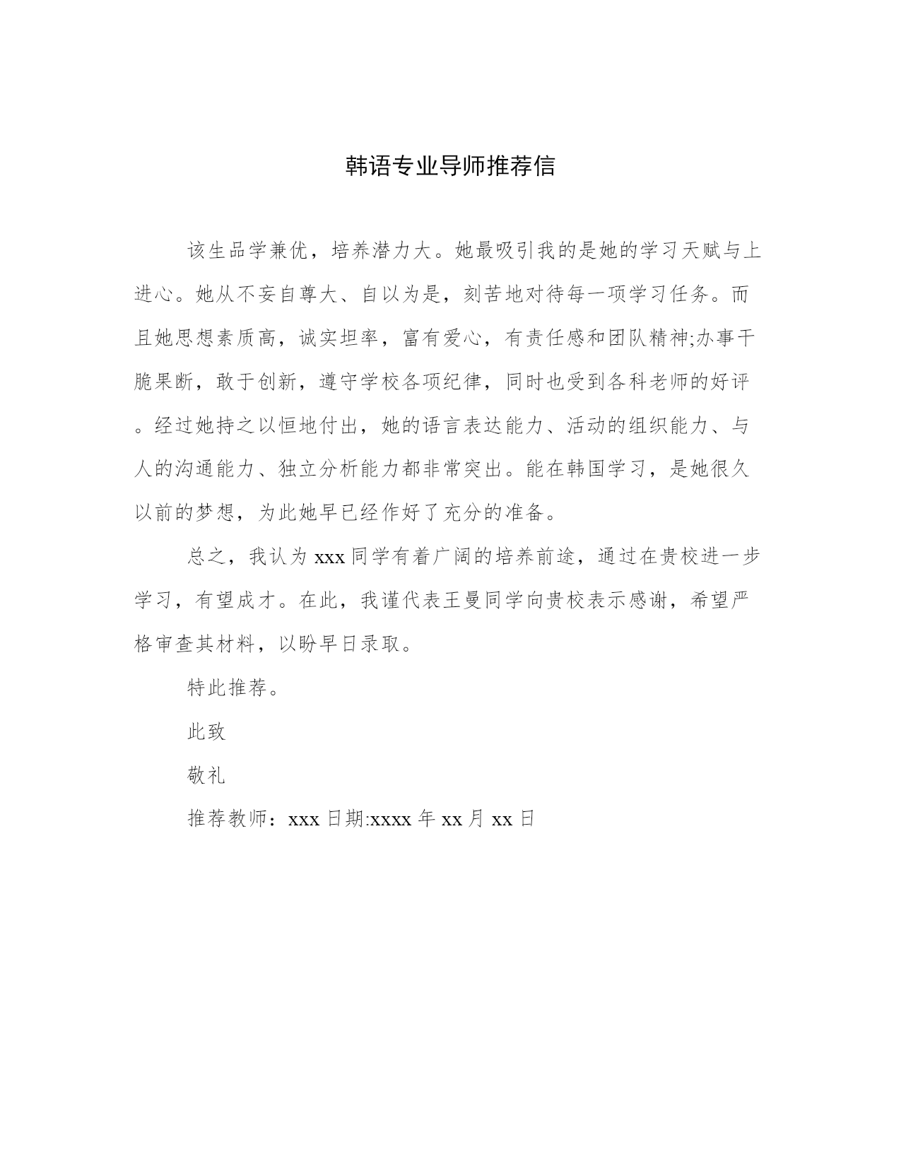 韩语专业导师推荐信该生品学兼优,培养潜力大。她最吸引我的是她的学习天赋与上进心。她从不妄自尊大、自以为是,刻苦地对待每一项学习任务。而且她思想素质高,诚实坦率,富有爱心,有责任感和团队精神;办事干脆果断,敢于创新,遵守学校各项纪律,同时也受到各科老师的好评。经过她持之以恒地付出,她的语言表达能力、活动的组织能力、与人的沟通能力、独立分析能力都非常突出。能在韩国学习,是她很久以前的梦想,为此她早已经作好了充分的准备。总之,我认为xxx同学有着广阔的培养前途,通过在贵校进一步学习,有望成才。在此,我谨代表王曼同学向贵校表示感谢,希望严格审查其材料,以盼早日录取。特此推荐。此致敬礼推荐教师:xxx日期:xxxx年xx月xx日