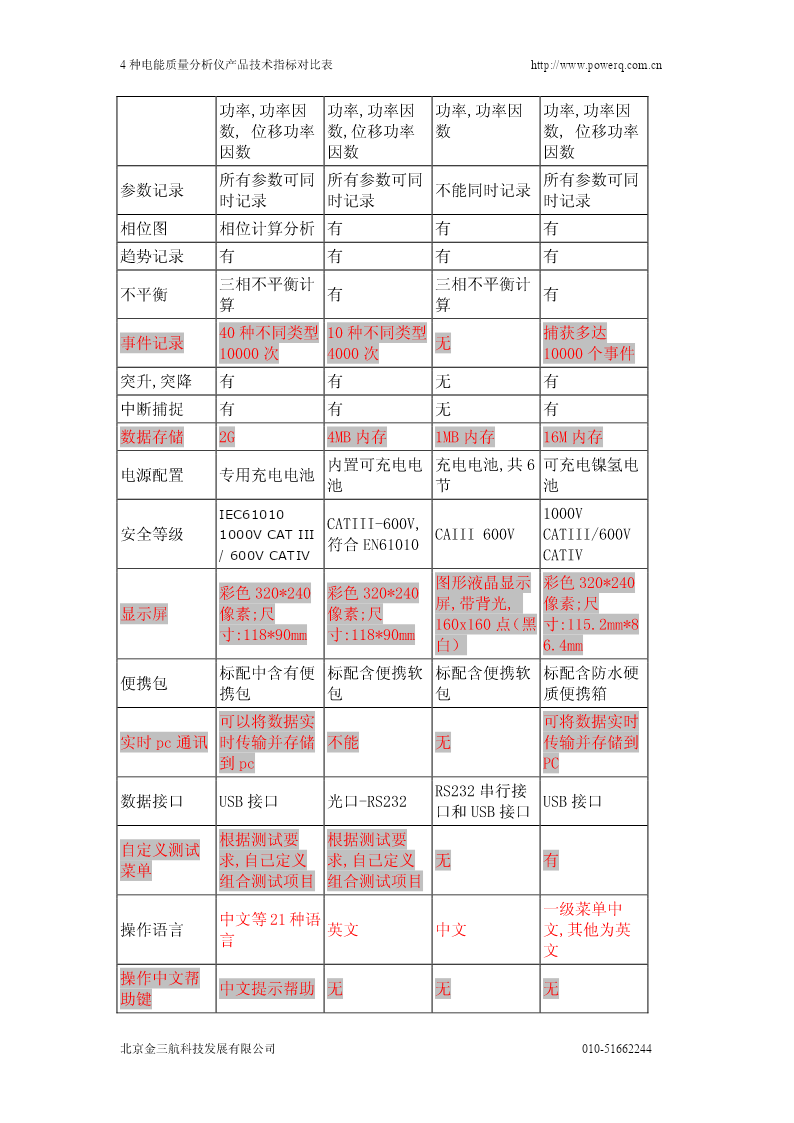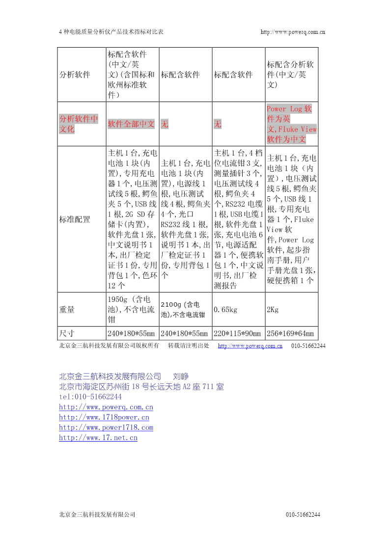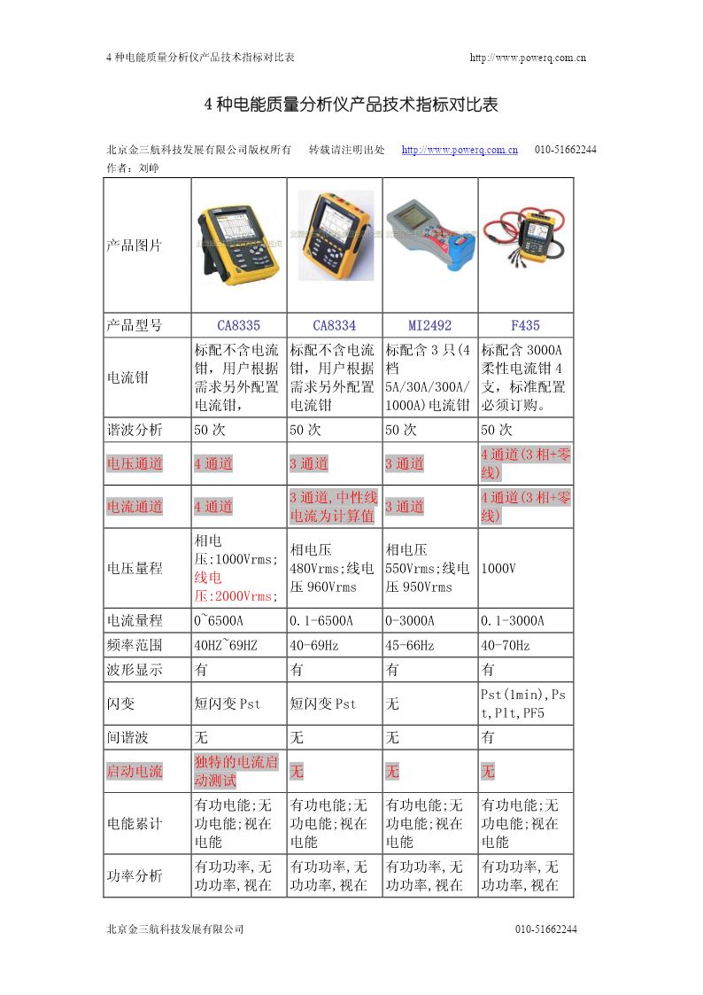 4种电能质量分析仪产品技术指标对比表http://www.powerq.com.cn4种电能质量分析仪产品技术指标对比表北京金三航科技发展有限公司版权所有转载请注明出处http://www.powerq.com.cn010-51662244作者:刘峥产品图片产品型号CA8335CA8334MI2492F435标配不含电流标配不含电流标配含3只(4标配含3000A钳,用户根据钳,用户根据档柔性电流钳4电流钳需求另外配置需求另外配置5A/30A/300A/支,标准配置电流钳,电流钳1000A)电流钳必须订购。谐波分析50次50次50次50次4通道(3相+零电压通道4通道3通道3通道线)3通道,中性线4通道(3相+零电流通道4通道3通道电流为计算值线)相电相电压相电压压:1000Vrms;电压量程480Vrms;线电550Vrms;线电1000V线电压960Vrms压950Vrms压:2000Vrms;电流量程0~6500A0.1-6500A0-3000A0.1-3000A频率范围40HZ~69HZ40-69Hz45-66Hz40-70Hz波形显示有有有有Pst(1min),Ps闪变短闪变Pst短闪变Pst无t,Plt,PF5间谐波无无无有独特的电流启启动电流无无无动测试有功电能;无有功电能;无有功电能;无有功电能;无电能累计功电能;视在功电能;视在功电能;视在功电能;视在电能电能电能电能有功功率,无有功功率,无有功功率,无有功功率,无功率分析功功率,视在功功率,视在功功率,视在功功率,视在北京金三航科技发展有限公司010-516622444种电能质量分析仪产品技术指标对比表http://www.powerq.com.cn功率,功率因功率,功率因功率,功率因功率,功率因数,位移功率数,位移功率数数,位移功率因数因数因数所有参数可同所有参数可同所有参数可同参数记录不能同时记录时记录时记录时记录相位图相位计算分析有有有趋势记录有有有有三相不平衡计三相不平衡计不平衡有有算算40种不同类型10种不同类型捕获多达事件记录无10000次4000次10000个事件突升,突降有有无有中断捕捉有有无有数据存储2G4MB内存1MB内存16M内存内置可充电电充电电池,共6可充电镍氢电电源配置专用充电电池池节池IEC610101000VCATIII-600V,安全等级1000VCATIIICAIII600VCATIII/600V符合EN61010/600VCATIVCATIV图形液晶显示彩色320*240彩色320*240彩色320*240屏,带背光,像素;尺显示屏像素;尺像素;尺160x160点(黑寸:115.2mm*8寸:118*90mm寸:118*90mm白)6.4mm标配中含有便标配含便携软标配含便携软标配含防水硬便携包携包包包质便携箱可以将数据实可将数据实时实时pc通讯时传输并存储不能无传输并存储到到pcPCRS232串行接数据接口USB接口光口-RS232USB接口口和USB接口根据测试要根据测试要自定义测试求,自己定义求,自己定义无有菜单组合测试项目组合测试项目一级菜单中中文等21种语操作语言英文中文文,其他为英言文操作中文帮中文提示帮助无无无助键北京金三航科技发展有限公司010-516622444种电能质量分析仪产品技术指标对比表http://www.powerq.com.cn标配含软件(中文/英标配含分析软分析软件文)(含国标和标配含软件标配含软件件(中文/英欧州标准软文)件)PowerLog软分析软件中件为英软件全部中文无无文化文,FlukeView软件为中文主机1台,充电主机1台,4档主机1台,充电电池1块(内主机1台,充电位电流钳3支,电池1块(内置),专用充电电池1块(内测量插针3个,置),电压测试器1个,电压测置),电源线1电压测试线4线5根,鳄鱼夹试线5根,鳄鱼根,电压测试根,鳄鱼夹45个,USB线1夹5个,USB线线4根,鳄鱼夹个,RS232电缆根,专用充电1根,2GSD存4个,光口1根,USB电缆1标准配置器1个,Fluke储卡(内置),RS232线1根,根,软件光盘1View软软件光盘1张,软件光盘1张,张,充电电池6件,PowerLog中文说明书1说明书1本,出节,电源适配软件,起步指本,出厂检定厂检定证书1器1个,便携软南手册,用户证书1份,专用份,专用背包1包1个,中文说手册光盘1张,背包1个,色环个明书,出厂检硬便携