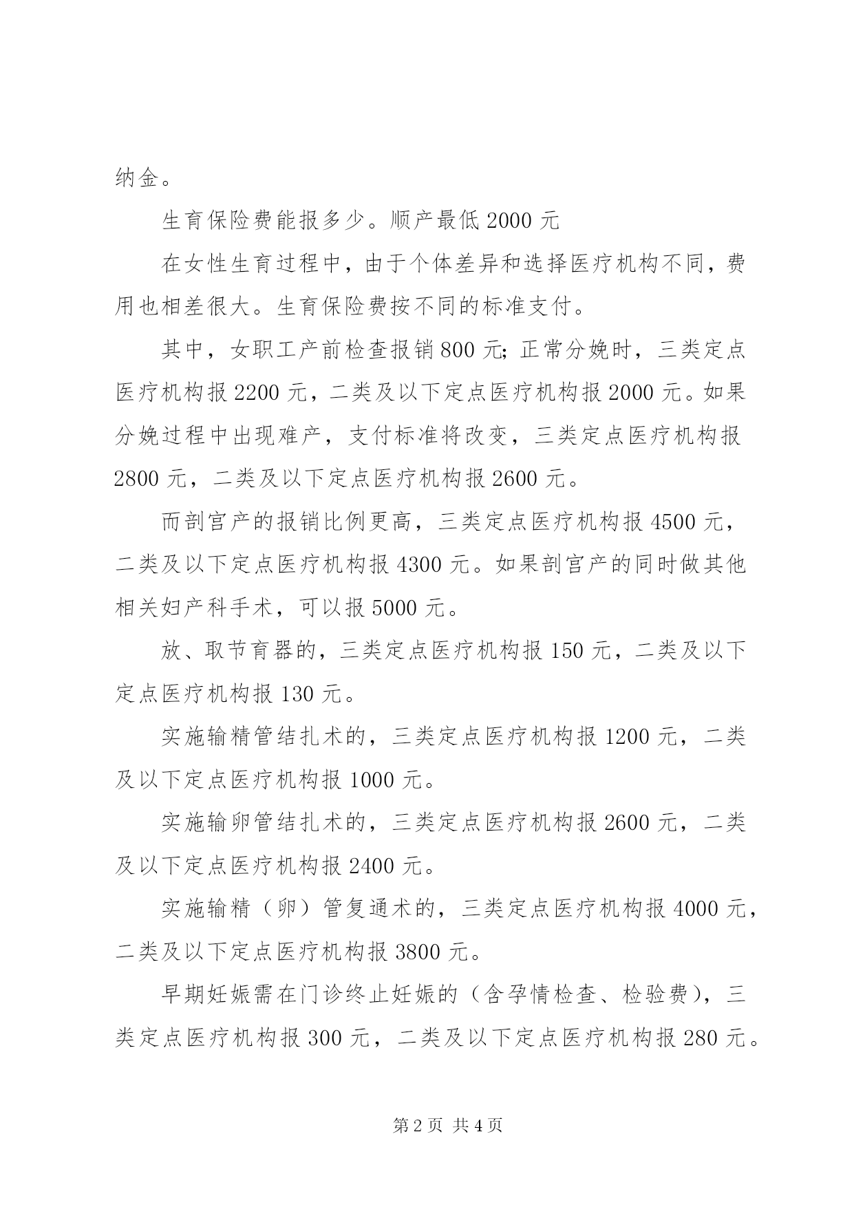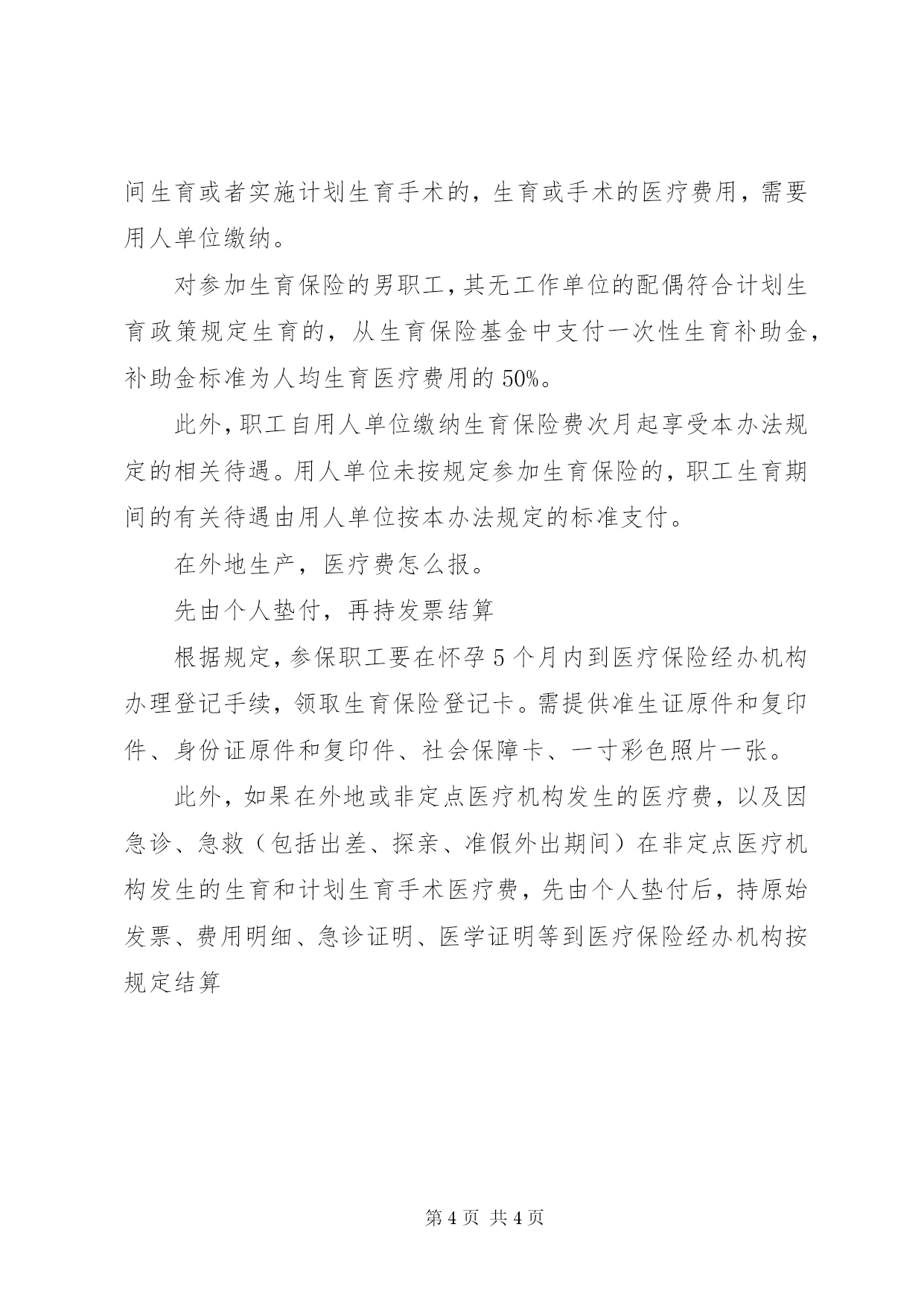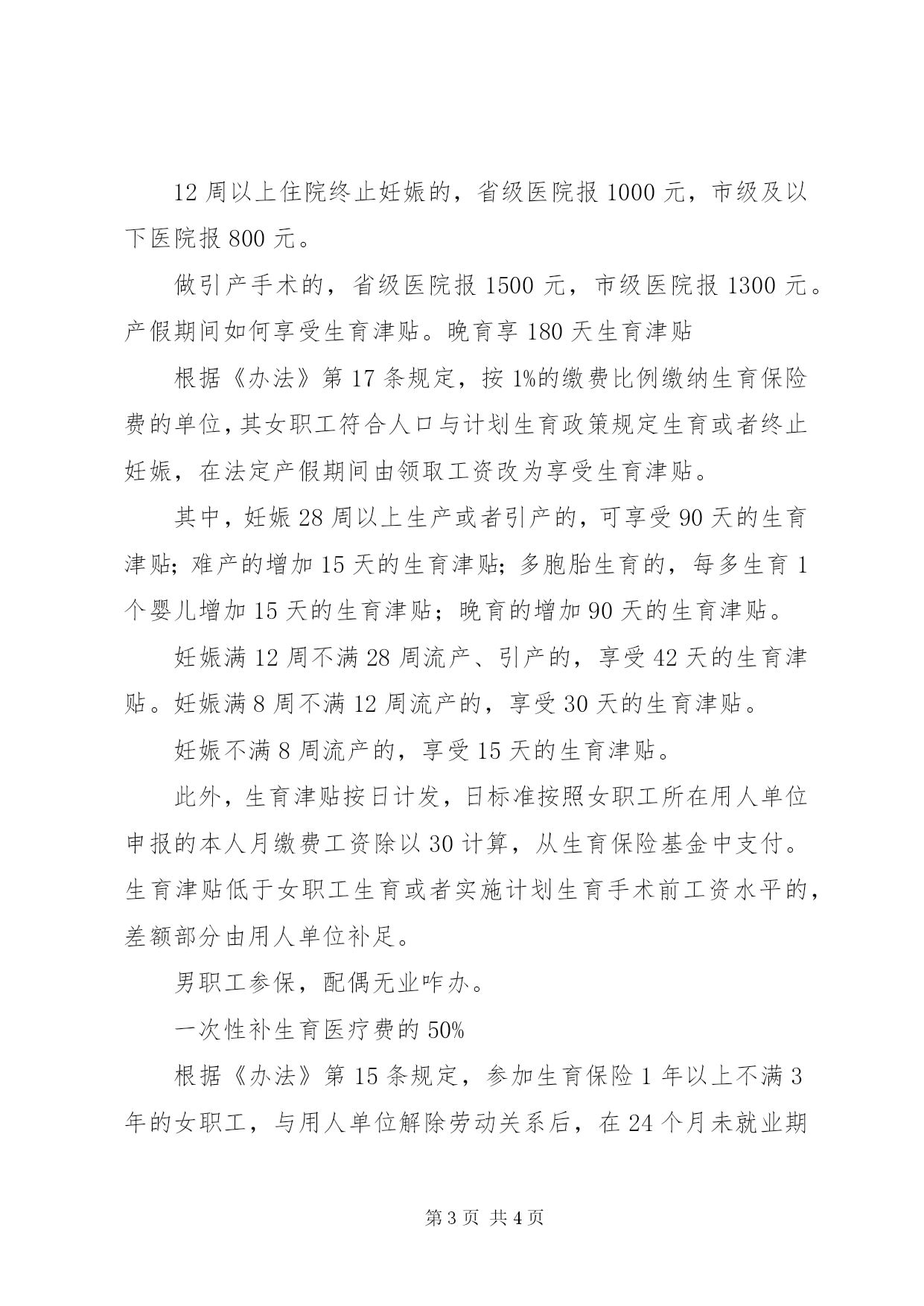 第PAGE\*Arabic\*MERGEFORMAT4页共NUMPAGES\*MERGEFORMAT4页XX市区职工生育保险操作办法郑州职工生育保险出台顺产最低2000元剖宫产4300元昨日,XX市政府公布了《XX市职工生育保险办法》(以下简称《办法》),规定了XX市各类企业和国家机关、事业单位、社会团体、民办非企业单位、有雇工的个体工商户(以下统称用人单位)都应参加生育保险,为其职工缴纳生育保险费。明年1月1日起,XX市女职工生孩子、坐月子期间,不但能拿到生育津贴,还能报销部分手术费和医疗费。昨日,XX市政府公布了《XX市职工生育保险办法》(以下简称《办法》),规定了XX市各类企业和国家机关、事业单位、社会团体、民办非企业单位、有雇工的个体工商户(以下统称用人单位)都应参加生育保险,为其职工缴纳生育保险费。生育保险费钱谁出。用人单位缴费生育保险费由谁来缴纳,是大家最为关注的。《办法》里明确规定,生育保险费由用人单位缴纳,职工个人不需缴费。用人单位以本单位上年度职工月平均工资总额的1%按月缴纳生育保险费。国家机关和财政全供事业单位按照本单位上年度职工月平均工资总额的0.5%按月缴纳生育保险费。根据规定,用人单位必须如实申报职工人数、工资总额,按时足额缴纳生育保险费。逾期不缴纳的,按日加收千分之二的滞纳金。生育保险费能报多少。顺产最低2000元在女性生育过程中,由于个体差异和选择医疗机构不同,费用也相差很大。生育保险费按不同的标准支付。其中,女职工产前检查报销800元;正常分娩时,三类定点医疗机构报2200元,二类及以下定点医疗机构报2000元。如果分娩过程中出现难产,支付标准将改变,三类定点医疗机构报2800元,二类及以下定点医疗机构报2600元。而剖宫产的报销比例更高,三类定点医疗机构报4500元,二类及以下定点医疗机构报4300元。如果剖宫产的同时做其他相关妇产科手术,可以报5000元。放、取节育器的,三类定点医疗机构报150元,二类及以下定点医疗机构报130元。实施输精管结扎术的,三类定点医疗机构报1200元,二类及以下定点医疗机构报1000元。实施输卵管结扎术的,三类定点医疗机构报2600元,二类及以下定点医疗机构报2400元。实施输精(卵)管复通术的,三类定点医疗机构报4000元,二类及以下定点医疗机构报3800元。早期妊娠需在门诊终止妊娠的(含孕情检查、检验费),三类定点医疗机构报300元,二类及以下定点医疗机构报280元。12周以上住院终止妊娠的,省级医院报1000元,市级及以下医院报800元。做引产手术的,省级医院报1500元,市级医院报1300元。产假期间如何享受生育津贴。晚育享180天生育津贴根据《办法》第17条规定,按1%的缴费比例缴纳生育保险费的单位,其女职工符合人口与计划生育政策规定生育或者终止妊娠,在法定产假期间由领取工资改为享受生育津贴。其中,妊娠28周以上生产或者引产的,可享受90天的生育津贴;难产的增加15天的生育津贴;多胞胎生育的,每多生育1个婴儿增加15天的生育津贴;晚育的增加90天的生育津贴。妊娠满12周不满28周流产、引产的,享受42天的生育津贴。妊娠满8周不满12周流产的,享受30天的生育津贴。妊娠不满8周流产的,享受15天的生育津贴。此外,生育津贴按日计发,日标准按照女职工所在用人单位申报的本人月缴费工资除以30计算,从生育保险基金中支付。生育津贴低于女职工生育或者实施计划生育手术前工资水平的,差额部分由用人单位补足。男职工参保,配偶无业咋办。一次性补生育医疗费的50%根据《办法》第15条规定,参加生育保险1年以上不满3年的女职工,与用人单位解除劳动关系后,在24个月未就业期间生育或者实施计划生育手术的,生育或手术的医疗费用,需要用人单位缴纳。对参加生育保险的男职工,其无工作单位的配偶符合计划生育政策规定生育的,从生育保险基金中支付一次性生育补助金,补助金标准为人均生育医疗费用的50%。此外,职工自用人单位缴纳生育保险费次月起享受本办法规定的相关待遇。用人单位未按规定参加生育保险的,职工生育期间的有关待遇由用人单位按本办法规定的标准支付。在外地生产,医疗费怎么报。先由个人垫付,再持发票结算根据规定,参保职工要在怀孕5个月内到医疗保险经办机构办理登记手续,领取生育保险登记卡。需提供准生证原件和复印件、身份证原件和复印件、社会保障卡、一寸彩色照片一张。此外,如果在外地或非定点医疗机构发生的医疗费,以及因急诊、急救(包括出差、探亲、准假外出期间)在非定点医疗机构发生的生育和计划生育手术医疗费,先由个人垫付后,持原始发票、费用明细、急诊证明、医学证明等到医疗保险经办机构按规定结算