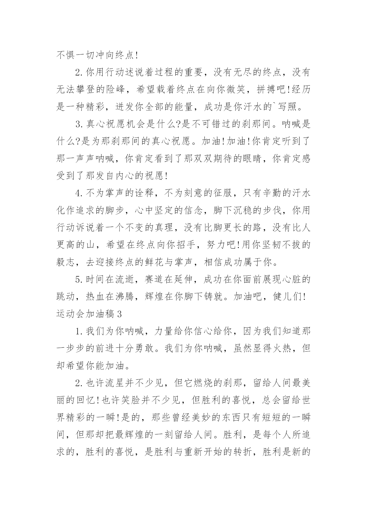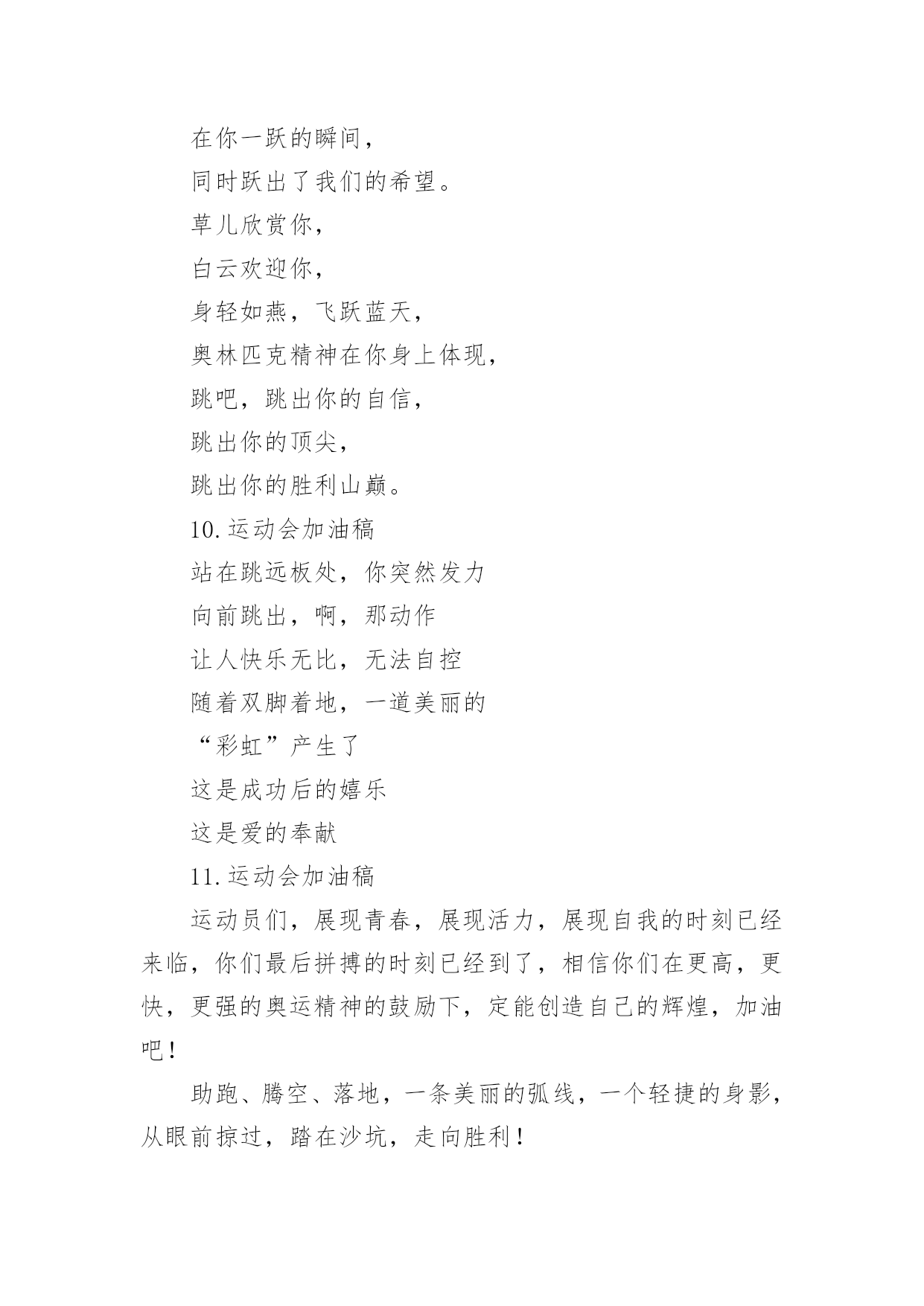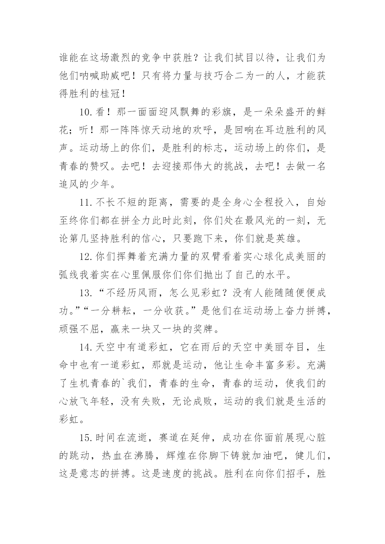 运动会加油稿运动会加油稿在日新月异的现代社会中,我们可以使用加油稿的机会越来越多,加油稿可以促进对方完成目标的进程。那么问题来了,到底应如何写好一份加油稿呢?以下是小编精心整理的运动会加油稿,欢迎大家分享。运动会加油稿11.踏着春天的气息,迈着轻盈的脚步,我们迎来了心仪已久的运动会。这里就是展示自我的舞台。我们向往高山的坚忍不拔,我们渴望大海的博大精深,还有,我们更痴迷于你们的速度激情。来吧,尽情释放你的活力。你的每一次冲刺,都叩动着我们的心弦;你的每一次跨越,都吸引着我们的视线;你的每一次起跳,都绷紧我们的神经。我们为你呐喊,我们为你自豪,我们为你疯狂。2.加油吧,运动健儿们!阵阵有力的步伐,声声有劲的呐喊,运动场上洒下我们青春的点点滴滴。旗摇摇,鼓声声,这里挡不助的是青春活力;枪声响起,“预备起跑”,挡不助的是健儿们如火般的气势。英雄舍我其谁,胜利当仁不让,声声誓言浸透着健儿们的昂扬斗志。3.微微的风,远远的地方吹来一阵微风,夹着轻轻的私语。侧耳仔细听,那是同学们的加油声,裁判的枪声,就像一种音乐,为我校第x届运动会伴奏的音乐。夏夜蛙虫的鸣唱,春晨鸟雀的啾唧,这些自然的声音都不及一声枪响令人震惊,似乎身体里的血液都为之沸腾。4.一根小小的木棒,连接的是团结和友爱一根小小的木棒,传递的是勇气和力量一根小小的木棒,演绎的是奋斗和拼搏加油吧!让这激动人心的时刻,一直回荡在我们心中!5.就像花儿准备了春、秋、冬,就是为了红透整个盛夏。就像雪花经历了春、夏、秋就是为了洁白整个严冬。蹲下,昂首,出发????轻轻的一抬脚,便牵动了全场的目光潇洒的迫挥挥手,便满足了那一份无言的等待。迎着朝阳,你们踏歌而去,背着希望,我们等待你们的归来。6.理想毕竟不同于现实,失败是生活的一部分,谁也无法选择,无法抗拒,人生要自己去拼搏,去奋斗,在风雨中百折不饶勇往直前。流泪不是失落,徘徊不是迷惑,成功属于那些战胜失败,坚持不懈,勇于追求梦想的人。7.步子迈开,让我们飞驰在红色跑道上,用我们的泪水和热血,更改历史的记录,起立吧,歌唱吧!为我们的勇士加油!8.时间在流逝,赛道在延伸,成功在你面前展现心脏的跳动,热血在沸腾,辉煌在你脚下铸就加油吧,健儿们。9.温暖的阳光洒在赛场上,男子乙组标枪的比赛即将开始。赛场上,一道道优美的弧线将轻盈地划过天空。健儿们用手中的标枪向距离的权限发起一轮又一轮的挑战。标枪在空中轻盈的姿态,是健儿们强健的力量和熟练的技巧的结合。谁能在这场激烈的竞争中获胜?让我们拭目以待,让我们为他们呐喊助威吧!只有将力量与技巧合二为一的人,才能获得胜利的桂冠!10.看!那一面面迎风飘舞的彩旗,是一朵朵盛开的鲜花;听!那一阵阵惊天动地的欢呼,是回响在耳边胜利的风声。运动场上的你们,是胜利的标志,运动场上的你们,是青春的赞叹。去吧!去迎接那伟大的挑战,去吧!去做一名追风的少年。11.不长不短的距离,需要的是全身心全程投入,自始至终你们都在拼全力此时此刻,你们处在最风光的一刻,无论第几坚持胜利的信心,只要跑下来,你们就是英雄。12.你们挥舞着充满力量的双臂看着实心球化成美丽的弧线我着实在心里佩服你们你们抛出了自己的水平。13.“不经历风雨,怎么见彩虹?没有人能随随便便成功。”“一分耕耘,一分收获。”是他们在运动场上奋力拼搏,顽强不屈,赢来一块又一块的奖牌。14.天空中有道彩虹,它在雨后的天空中美丽夺目,生命中也有一道彩虹,那就是运动,他让生命丰富多彩。充满了生机青春的`我们,青春的生命,青春的运动,使我们的心放飞年轻,没有失败,无论成败,运动的我们就是生活的彩虹。15.时间在流逝,赛道在延伸,成功在你面前展现心脏的跳动,热血在沸腾,辉煌在你脚下铸就加油吧,健儿们,这是意志的拼搏。这是速度的挑战。胜利在向你们招手,胜利在向你们呼唤。16.不为掌声的诠释,不为刻意的征服,只有辛勤的汗水化作追求的脚步,心中坚定的信念,脚下沉稳的步伐,你用行动诉说着一个不变的真理,没有比脚更长的路,没有比人更高的山,希望在终点向你招手,努力吧用你坚韧不拔的毅志,去迎接终点的鲜花与掌声,相信成功属于你。17.汗水浸着衣衫,烈日灼着躯体,在这里,在那边,在运动员的每份成绩中,殊不知藏着裁判员的多少付出。正是他们,是他们造就了我们!谢谢你,我们的裁判员,我们会用自己的信念去搏取胜利,为此换来您一点点的欣慰。来吧,让我们为敬爱的裁判员们也来一些掌声吧!18.真心祝愿机会是什么?是不可错过的刹那间。呐喊是什么?是为那刹那间的真心祝愿。加油加油你肯定听到了那一声声呐喊你肯定看到了那双双期待的眼睛你肯定感受到了那发自内心的祝愿。19.广阔的绿茵场,是为你们搭建的舞台。张扬吧,年轻的心,我们将为你永远喝彩!20.风为你加油,云为你助兴,坚定,执着,耐力与希望,在延伸的白色跑道中点点凝聚
