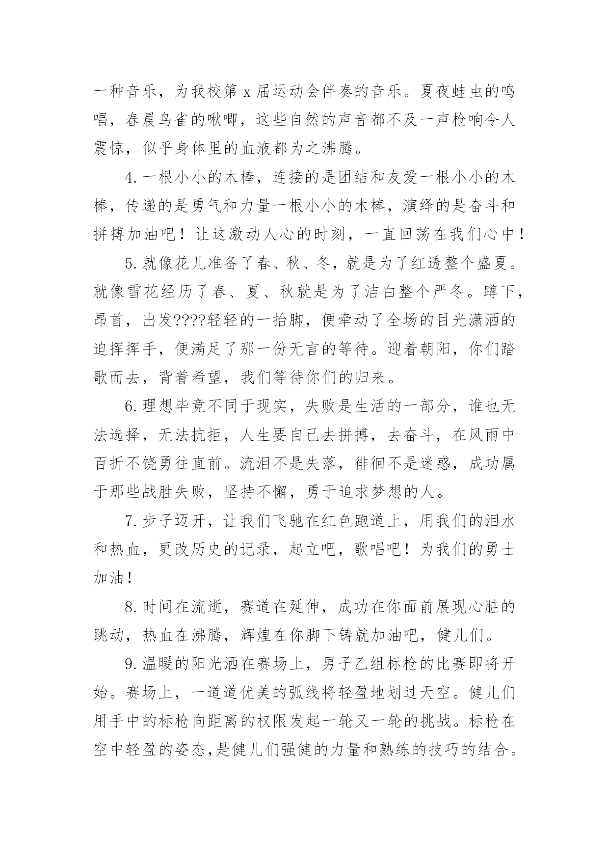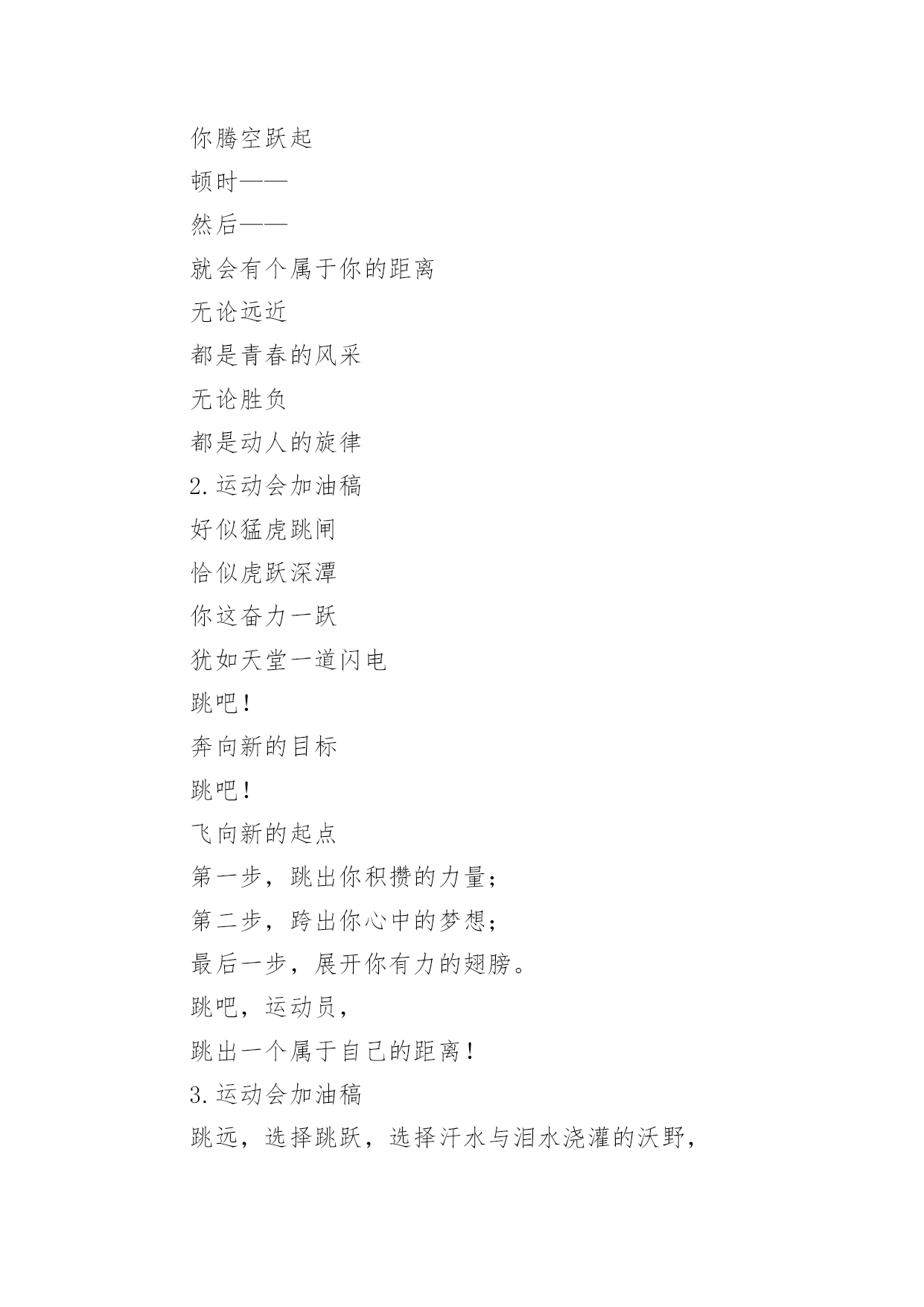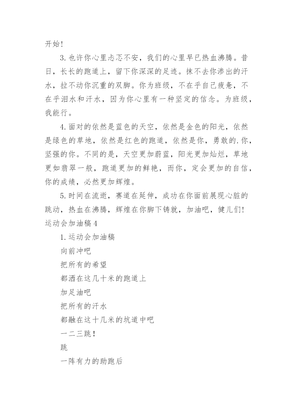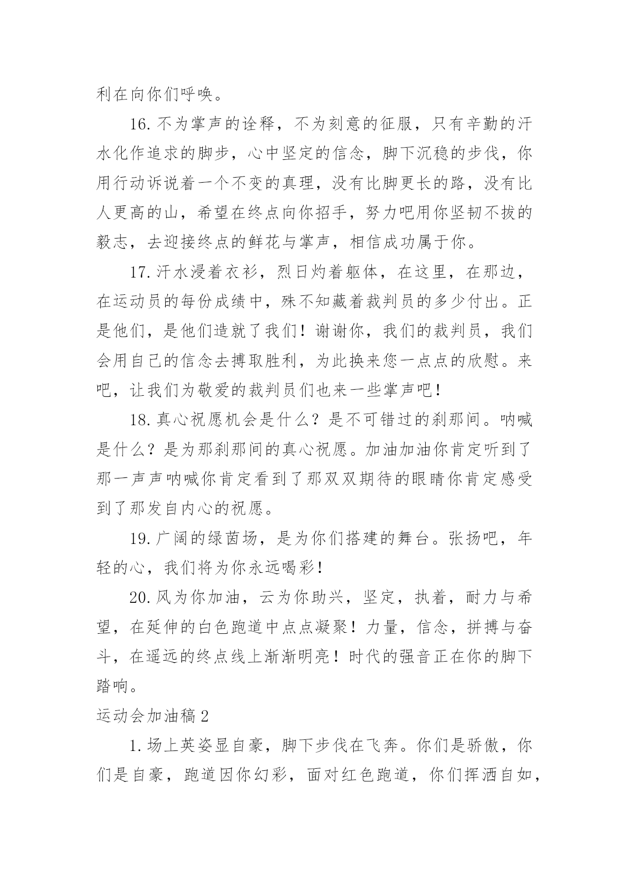 运动会加油稿运动会加油稿在日新月异的现代社会中,我们可以使用加油稿的机会越来越多,加油稿可以促进对方完成目标的进程。那么问题来了,到底应如何写好一份加油稿呢?以下是小编精心整理的运动会加油稿,欢迎大家分享。运动会加油稿11.踏着春天的气息,迈着轻盈的脚步,我们迎来了心仪已久的运动会。这里就是展示自我的舞台。我们向往高山的坚忍不拔,我们渴望大海的博大精深,还有,我们更痴迷于你们的速度激情。来吧,尽情释放你的活力。你的每一次冲刺,都叩动着我们的心弦;你的每一次跨越,都吸引着我们的视线;你的每一次起跳,都绷紧我们的神经。我们为你呐喊,我们为你自豪,我们为你疯狂。2.加油吧,运动健儿们!阵阵有力的步伐,声声有劲的呐喊,运动场上洒下我们青春的点点滴滴。旗摇摇,鼓声声,这里挡不助的是青春活力;枪声响起,“预备起跑”,挡不助的是健儿们如火般的气势。英雄舍我其谁,胜利当仁不让,声声誓言浸透着健儿们的昂扬斗志。3.微微的风,远远的地方吹来一阵微风,夹着轻轻的私语。侧耳仔细听,那是同学们的加油声,裁判的枪声,就像一种音乐,为我校第x届运动会伴奏的音乐。夏夜蛙虫的鸣唱,春晨鸟雀的啾唧,这些自然的声音都不及一声枪响令人震惊,似乎身体里的血液都为之沸腾。4.一根小小的木棒,连接的是团结和友爱一根小小的木棒,传递的是勇气和力量一根小小的木棒,演绎的是奋斗和拼搏加油吧!让这激动人心的时刻,一直回荡在我们心中!5.就像花儿准备了春、秋、冬,就是为了红透整个盛夏。就像雪花经历了春、夏、秋就是为了洁白整个严冬。蹲下,昂首,出发????轻轻的一抬脚,便牵动了全场的目光潇洒的迫挥挥手,便满足了那一份无言的等待。迎着朝阳,你们踏歌而去,背着希望,我们等待你们的归来。6.理想毕竟不同于现实,失败是生活的一部分,谁也无法选择,无法抗拒,人生要自己去拼搏,去奋斗,在风雨中百折不饶勇往直前。流泪不是失落,徘徊不是迷惑,成功属于那些战胜失败,坚持不懈,勇于追求梦想的人。7.步子迈开,让我们飞驰在红色跑道上,用我们的泪水和热血,更改历史的记录,起立吧,歌唱吧!为我们的勇士加油!8.时间在流逝,赛道在延伸,成功在你面前展现心脏的跳动,热血在沸腾,辉煌在你脚下铸就加油吧,健儿们。9.温暖的阳光洒在赛场上,男子乙组标枪的比赛即将开始。赛场上,一道道优美的弧线将轻盈地划过天空。健儿们用手中的标枪向距离的权限发起一轮又一轮的挑战。标枪在空中轻盈的姿态,是健儿们强健的力量和熟练的技巧的结合。谁能在这场激烈的竞争中获胜?让我们拭目以待,让我们为他们呐喊助威吧!只有将力量与技巧合二为一的人,才能获得胜利的桂冠!10.看!那一面面迎风飘舞的彩旗,是一朵朵盛开的鲜花;听!那一阵阵惊天动地的欢呼,是回响在耳边胜利的风声。运动场上的你们,是胜利的标志,运动场上的你们,是青春的赞叹。去吧!去迎接那伟大的挑战,去吧!去做一名追风的少年。11.不长不短的距离,需要的是全身心全程投入,自始至终你们都在拼全力此时此刻,你们处在最风光的一刻,无论第几坚持胜利的信心,只要跑下来,你们就是英雄。12.你们挥舞着充满力量的双臂看着实心球化成美丽的弧线我着实在心里佩服你们你们抛出了自己的水平。13.“不经历风雨,怎么见彩虹?没有人能随随便便成功。”“一分耕耘,一分收获。”是他们在运动场上奋力拼搏,顽强不屈,赢来一块又一块的奖牌。14.天空中有道彩虹,它在雨后的天空中美丽夺目,生命中也有一道彩虹,那就是运动,他让生命丰富多彩。充满了生机青春的`我们,青春的生命,青春的运动,使我们的心放飞年轻,没有失败,无论成败,运动的我们就是生活的彩虹。15.时间在流逝,赛道在延伸,成功在你面前展现心脏的跳动,热血在沸腾,辉煌在你脚下铸就加油吧,健儿们,这是意志的拼搏。这是速度的挑战。胜利在向你们招手,胜利在向你们呼唤。16.不为掌声的诠释,不为刻意的征服,只有辛勤的汗水化作追求的脚步,心中坚定的信念,脚下沉稳的步伐,你用行动诉说着一个不变的真理,没有比脚更长的路,没有比人更高的山,希望在终点向你招手,努力吧用你坚韧不拔的毅志,去迎接终点的鲜花与掌声,相信成功属于你。17.汗水浸着衣衫,烈日灼着躯体,在这里,在那边,在运动员的每份成绩中,殊不知藏着裁判员的多少付出。正是他们,是他们造就了我们!谢谢你,我们的裁判员,我们会用自己的信念去搏取胜利,为此换来您一点点的欣慰。来吧,让我们为敬爱的裁判员们也来一些掌声吧!18.真心祝愿机会是什么?是不可错过的刹那间。呐喊是什么?是为那刹那间的真心祝愿。加油加油你肯定听到了那一声声呐喊你肯定看到了那双双期待的眼睛你肯定感受到了那发自内心的祝愿。19.广阔的绿茵场,是为你们搭建的舞台。张扬吧,年轻的心,我们将为你永远喝彩!20.风为你加油,云为你助兴,坚定,执着,耐力与希望,在延伸的白色跑道中点点凝聚