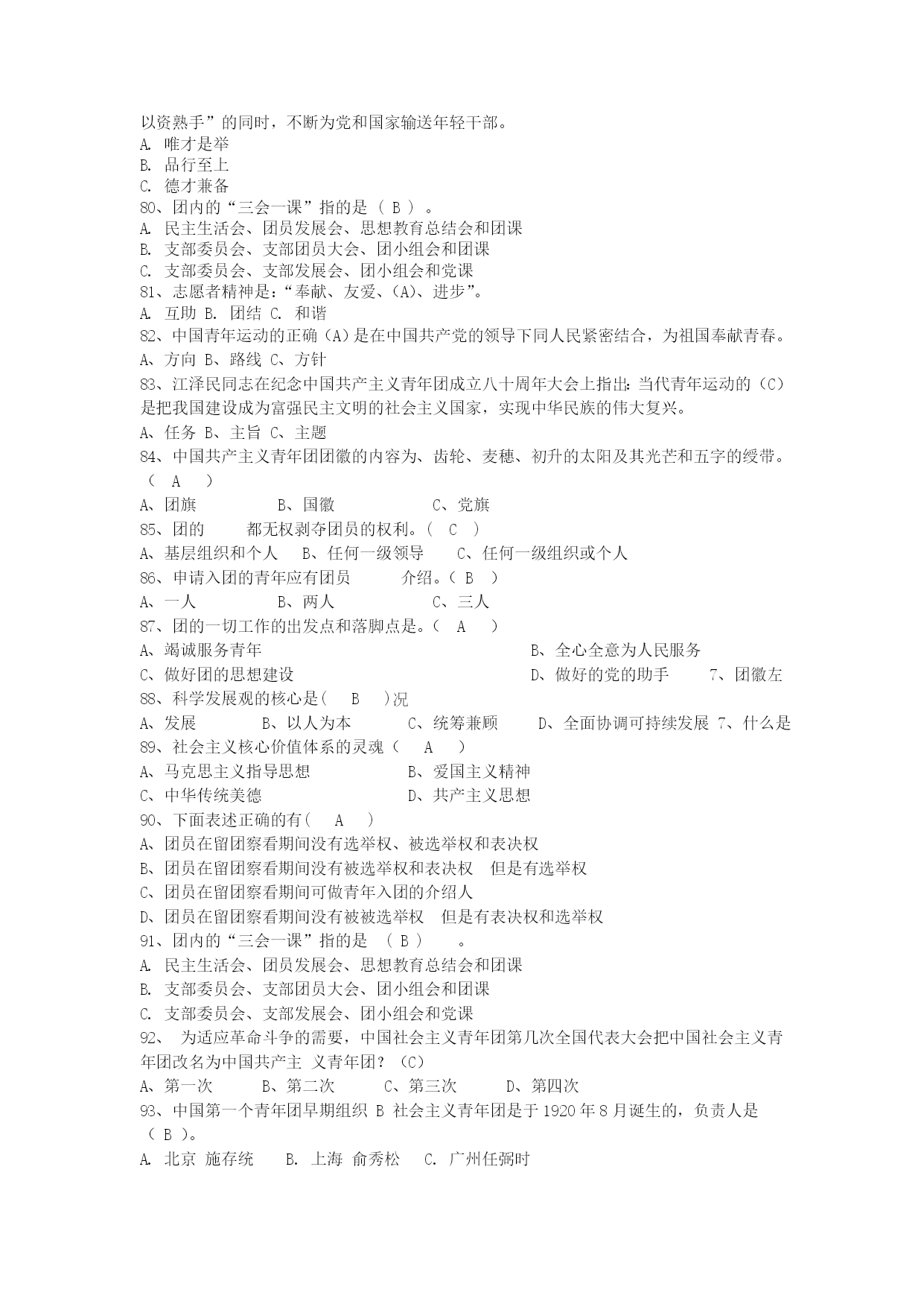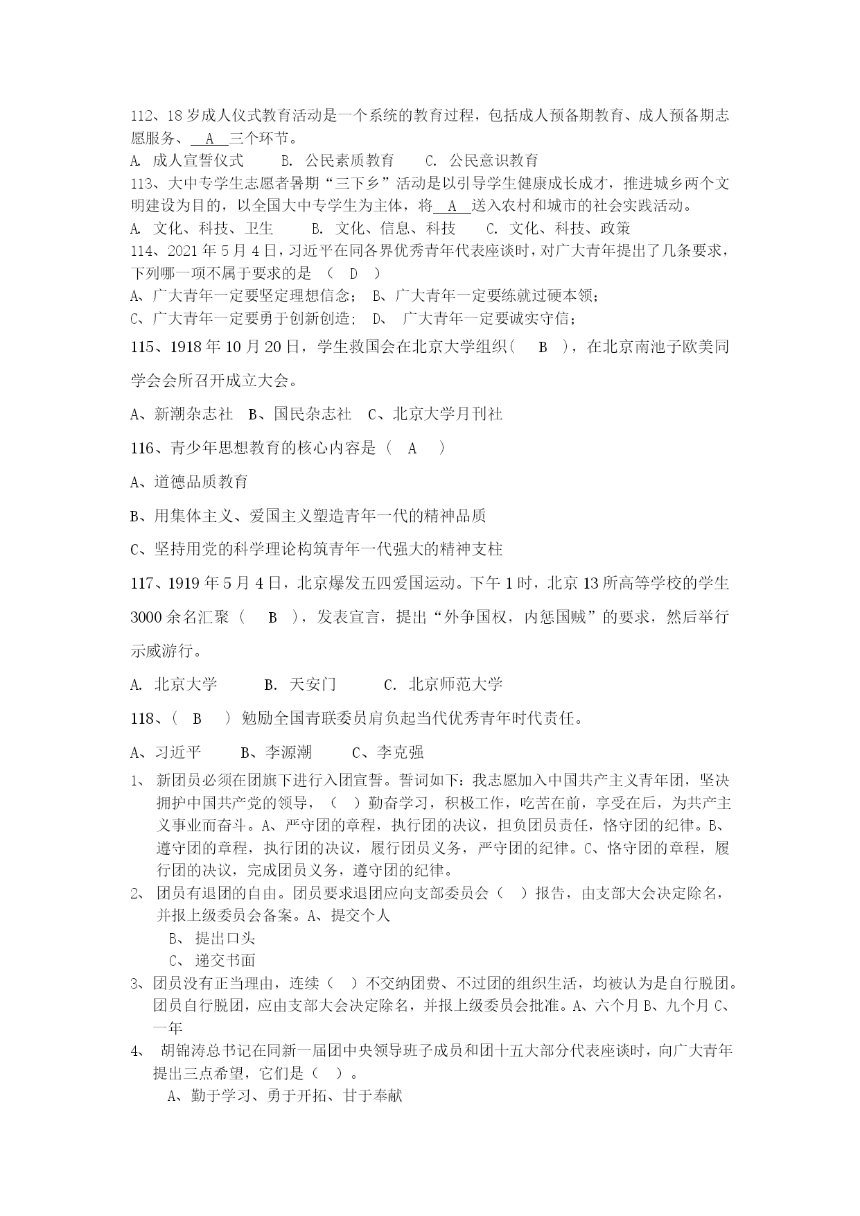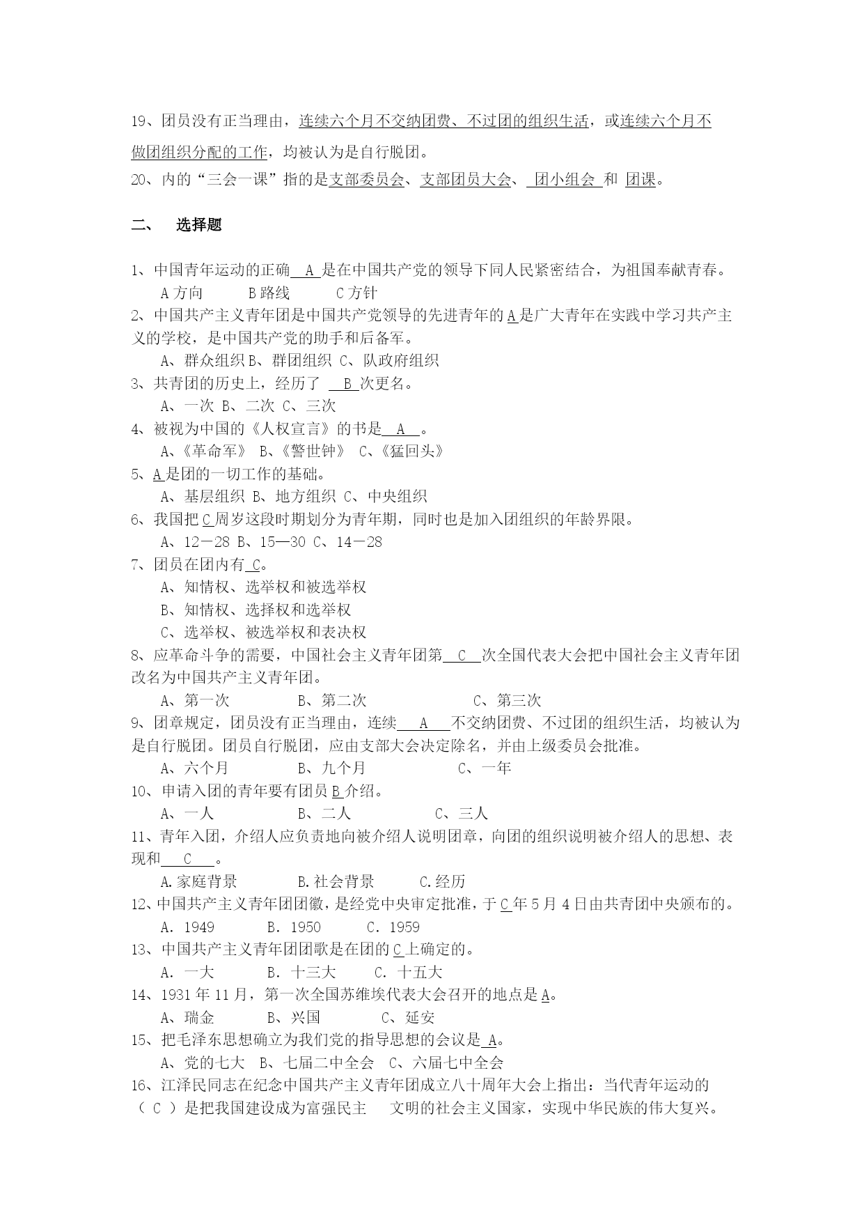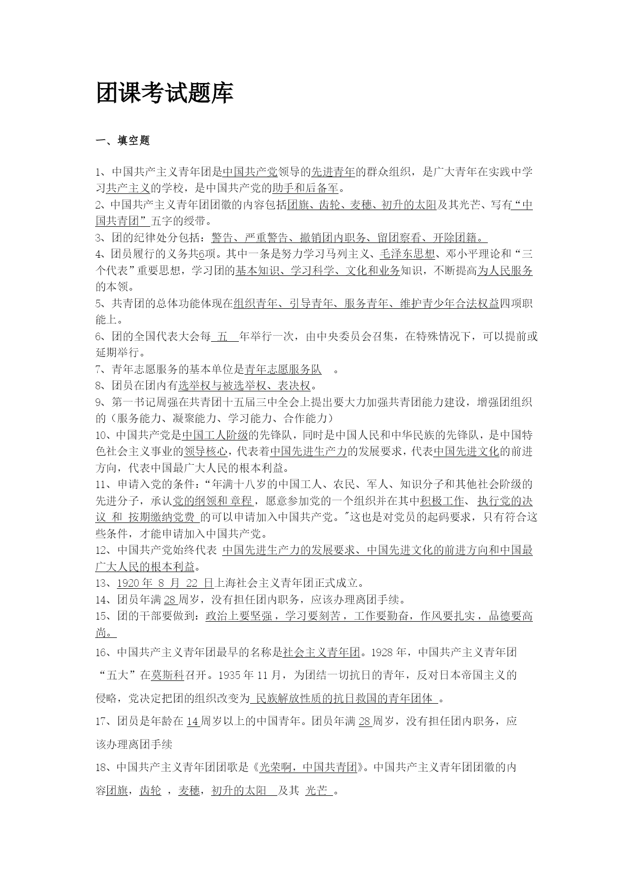 团课考试题库优质资料(可以直接使用,可编辑优质资料,欢迎下载)团课考试题库一、填空题1、中国共产主义青年团是中国共产党领导的先进青年的群众组织,是广大青年在实践中学习共产主义的学校,是中国共产党的助手和后备军。2、中国共产主义青年团团徽的内容包括团旗、齿轮、麦穗、初升的太阳及其光芒、写有“中国共青团”五字的绶带。3、团的纪律处分包括:警告、严重警告、撤销团内职务、留团察看、开除团籍。4、团员履行的义务共6项。其中一条是努力学习马列主义、毛泽东思想、邓小平理论和“三个代表”重要思想,学习团的基本知识、学习科学、文化和业务知识,不断提高为人民服务的本领。5、共青团的总体功能体现在组织青年、引导青年、服务青年、维护青少年合法权益四项职能上。6、团的全国代表大会每五年举行一次,由中央委员会召集,在特殊情况下,可以提前或延期举行。7、青年志愿服务的基本单位是青年志愿服务队。8、团员在团内有选举权与被选举权、表决权。9、第一书记周强在共青团十五届三中全会上提出要大力加强共青团能力建设,增强团组织的(服务能力、凝聚能力、学习能力、合作能力)10、中国共产党是中国工人阶级的先锋队,同时是中国人民和中华民族的先锋队,是中国特色社会主义事业的领导核心,代表着中国先进生产力的发展要求,代表中国先进文化的前进方向,代表中国最广大人民的根本利益。11、申请入党的条件:“年满十八岁的中国工人、农民、军人、知识分子和其他社会阶级的先进分子,承认党的纲领和章程,愿意参加党的一个组织并在其中积极工作、执行党的决议和按期缴纳党费的可以申请加入中国共产党。"这也是对党员的起码要求,只有符合这些条件,才能申请加入中国共产党。12、中国共产党始终代表中国先进生产力的发展要求、中国先进文化的前进方向和中国最广大人民的根本利益。13、1920年8月22日上海社会主义青年团正式成立。14、团员年满28周岁,没有担任团内职务,应该办理离团手续。15、团的干部要做到:政治上要坚强,学习要刻苦,工作要勤奋,作风要扎实,品德要高尚。16、中国共产主义青年团最早的名称是社会主义青年团。1928年,中国共产主义青年团“五大”在莫斯科召开。1935年11月,为团结一切抗日的青年,反对日本帝国主义的侵略,党决定把团的组织改变为民族解放性质的抗日救国的青年团体。17、团员是年龄在14周岁以上的中国青年。团员年满28周岁,没有担任团内职务,应该办理离团手续18、中国共产主义青年团团歌是《光荣啊,中国共青团》。中国共产主义青年团团徽的内容团旗,齿轮,麦穗,初升的太阳及其光芒。19、团员没有正当理由,连续六个月不交纳团费、不过团的组织生活,或连续六个月不做团组织分配的工作,均被认为是自行脱团。20、内的“三会一课”指的是支部委员会、支部团员大会、团小组会和团课。二、选择题1、中国青年运动的正确A是在中国共产党的领导下同人民紧密结合,为祖国奉献青春。A方向B路线C方针2、中国共产主义青年团是中国共产党领导的先进青年的A是广大青年在实践中学习共产主义的学校,是中国共产党的助手和后备军。A、群众组织B、群团组织C、队政府组织3、共青团的历史上,经历了B次更名。A、一次B、二次C、三次4、被视为中国的《人权宣言》的书是A。A、《革命军》B、《警世钟》C、《猛回头》5、A是团的一切工作的基础。A、基层组织B、地方组织C、中央组织6、我国把C周岁这段时期划分为青年期,同时也是加入团组织的年龄界限。A、12-28B、15—30C、14-287、团员在团内有C。A、知情权、选举权和被选举权B、知情权、选择权和选举权C、选举权、被选举权和表决权8、应革命斗争的需要,中国社会主义青年团第C次全国代表大会把中国社会主义青年团改名为中国共产主义青年团。A、第一次B、第二次C、第三次9、团章规定,团员没有正当理由,连续A不交纳团费、不过团的组织生活,均被认为是自行脱团。团员自行脱团,应由支部大会决定除名,并由上级委员会批准。A、六个月B、九个月C、一年10、申请入团的青年要有团员B介绍。A、一人B、二人C、三人11、青年入团,介绍人应负责地向被介绍人说明团章,向团的组织说明被介绍人的思想、表现和C。A.家庭背景B.社会背景C.经历12、中国共产主义青年团团徽,是经党中央审定批准,于C年5月4日由共青团中央颁布的。A.1949B.1950C.195913、中国共产主义青年团团歌是在团的C上确定的。A.一大B.十三大C.十五大14、1931年11月,第一次全国苏维埃代表大会召开的地点是A。A、瑞金B、兴国C、延安15、把毛泽东思想确立为我们党的指导思想的会议是A。A、党的七大B、七届二中全会C、六届七中全会