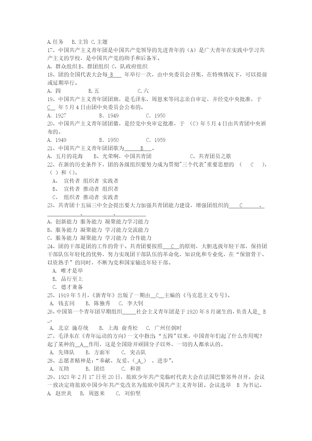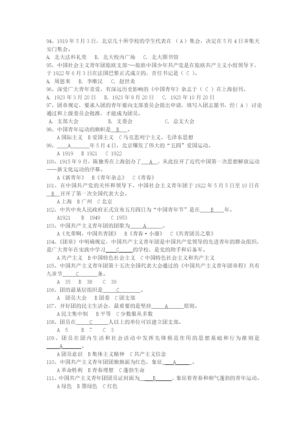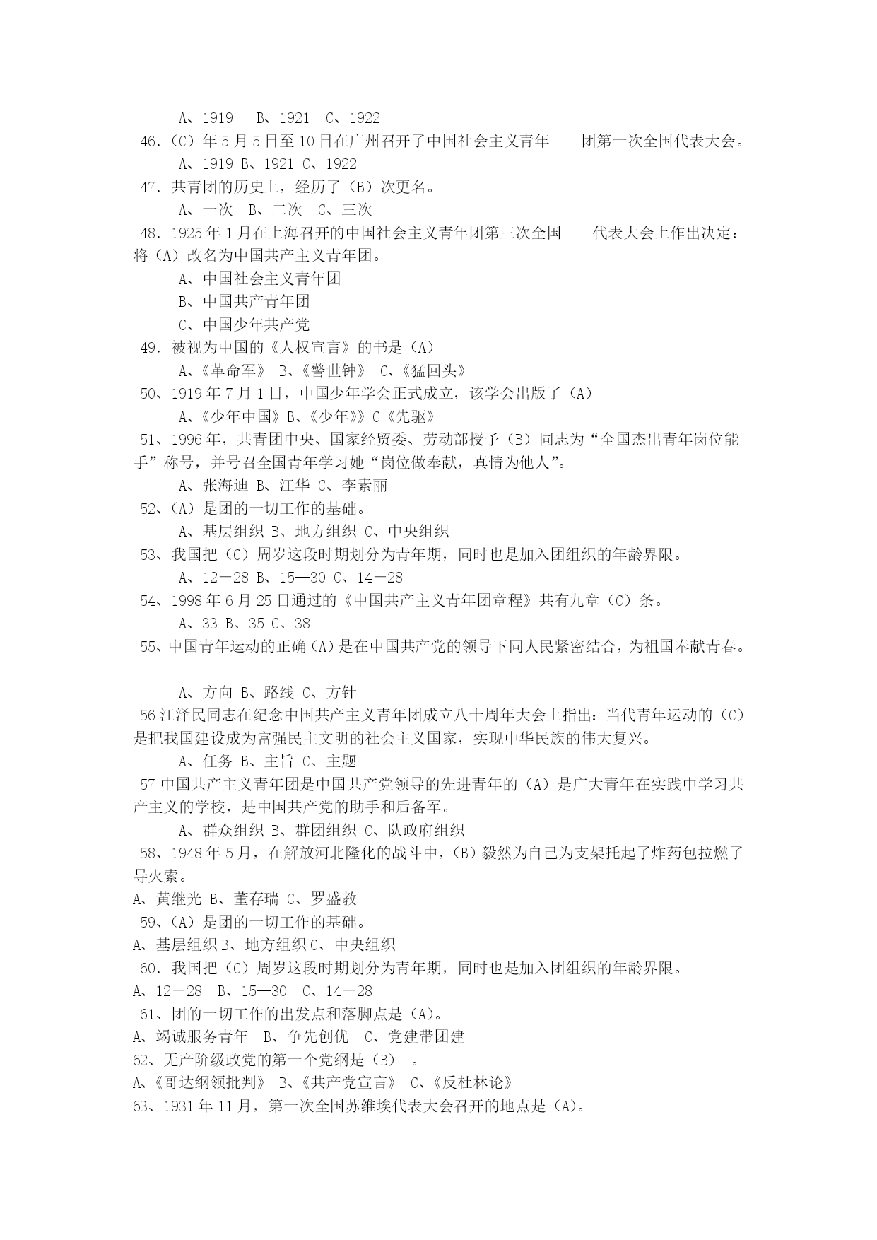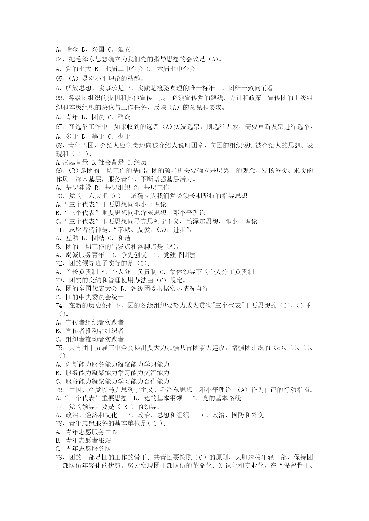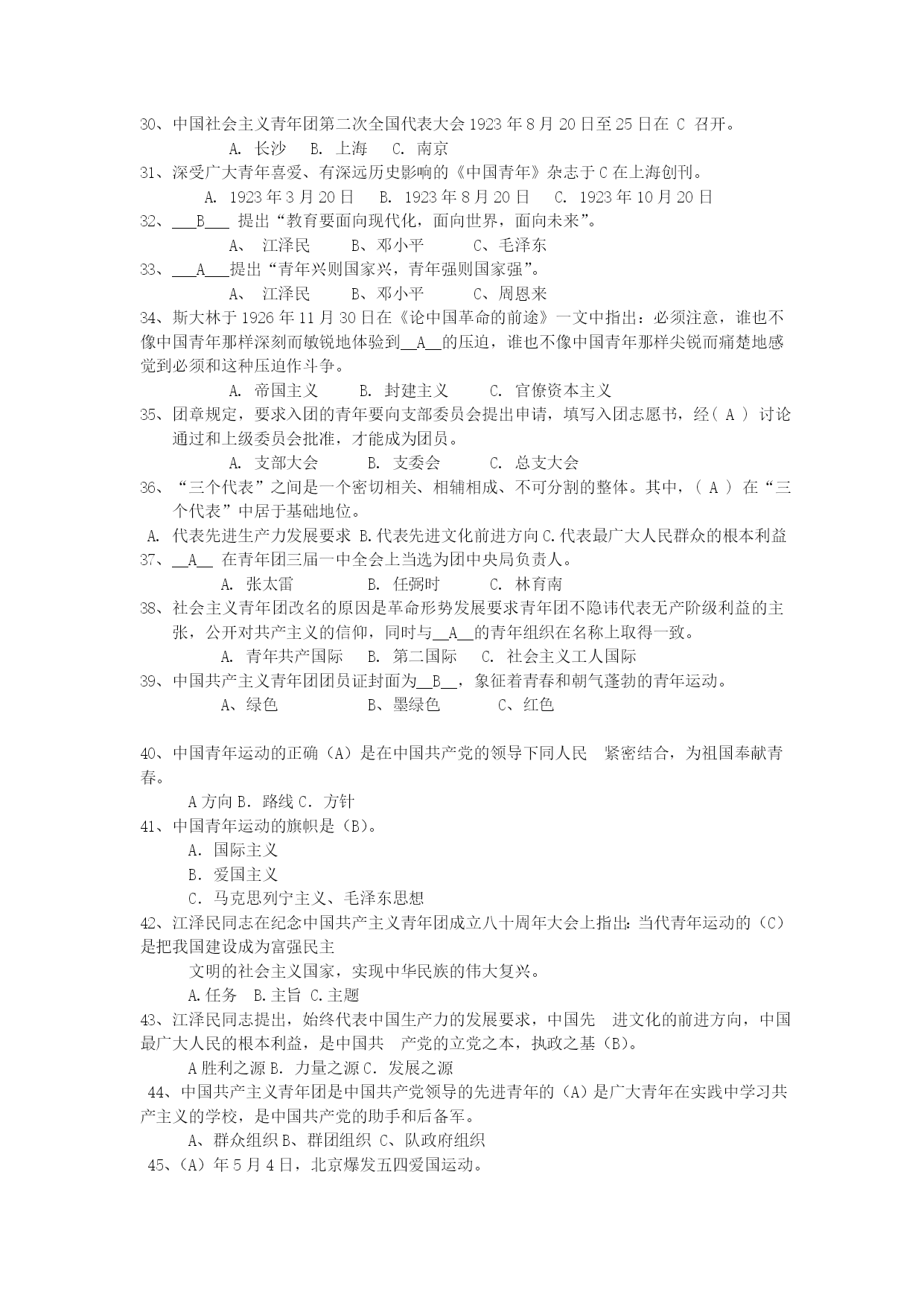 团课考试题库优质资料(可以直接使用,可编辑优质资料,欢迎下载)团课考试题库一、填空题1、中国共产主义青年团是中国共产党领导的先进青年的群众组织,是广大青年在实践中学习共产主义的学校,是中国共产党的助手和后备军。2、中国共产主义青年团团徽的内容包括团旗、齿轮、麦穗、初升的太阳及其光芒、写有“中国共青团”五字的绶带。3、团的纪律处分包括:警告、严重警告、撤销团内职务、留团察看、开除团籍。4、团员履行的义务共6项。其中一条是努力学习马列主义、毛泽东思想、邓小平理论和“三个代表”重要思想,学习团的基本知识、学习科学、文化和业务知识,不断提高为人民服务的本领。5、共青团的总体功能体现在组织青年、引导青年、服务青年、维护青少年合法权益四项职能上。6、团的全国代表大会每五年举行一次,由中央委员会召集,在特殊情况下,可以提前或延期举行。7、青年志愿服务的基本单位是青年志愿服务队。8、团员在团内有选举权与被选举权、表决权。9、第一书记周强在共青团十五届三中全会上提出要大力加强共青团能力建设,增强团组织的(服务能力、凝聚能力、学习能力、合作能力)10、中国共产党是中国工人阶级的先锋队,同时是中国人民和中华民族的先锋队,是中国特色社会主义事业的领导核心,代表着中国先进生产力的发展要求,代表中国先进文化的前进方向,代表中国最广大人民的根本利益。11、申请入党的条件:“年满十八岁的中国工人、农民、军人、知识分子和其他社会阶级的先进分子,承认党的纲领和章程,愿意参加党的一个组织并在其中积极工作、执行党的决议和按期缴纳党费的可以申请加入中国共产党。"这也是对党员的起码要求,只有符合这些条件,才能申请加入中国共产党。12、中国共产党始终代表中国先进生产力的发展要求、中国先进文化的前进方向和中国最广大人民的根本利益。13、1920年8月22日上海社会主义青年团正式成立。14、团员年满28周岁,没有担任团内职务,应该办理离团手续。15、团的干部要做到:政治上要坚强,学习要刻苦,工作要勤奋,作风要扎实,品德要高尚。16、中国共产主义青年团最早的名称是社会主义青年团。1928年,中国共产主义青年团“五大”在莫斯科召开。1935年11月,为团结一切抗日的青年,反对日本帝国主义的侵略,党决定把团的组织改变为民族解放性质的抗日救国的青年团体。17、团员是年龄在14周岁以上的中国青年。团员年满28周岁,没有担任团内职务,应该办理离团手续18、中国共产主义青年团团歌是《光荣啊,中国共青团》。中国共产主义青年团团徽的内容团旗,齿轮,麦穗,初升的太阳及其光芒。19、团员没有正当理由,连续六个月不交纳团费、不过团的组织生活,或连续六个月不做团组织分配的工作,均被认为是自行脱团。20、内的“三会一课”指的是支部委员会、支部团员大会、团小组会和团课。二、选择题1、中国青年运动的正确A是在中国共产党的领导下同人民紧密结合,为祖国奉献青春。A方向B路线C方针2、中国共产主义青年团是中国共产党领导的先进青年的A是广大青年在实践中学习共产主义的学校,是中国共产党的助手和后备军。A、群众组织B、群团组织C、队政府组织3、共青团的历史上,经历了B次更名。A、一次B、二次C、三次4、被视为中国的《人权宣言》的书是A。A、《革命军》B、《警世钟》C、《猛回头》5、A是团的一切工作的基础。A、基层组织B、地方组织C、中央组织6、我国把C周岁这段时期划分为青年期,同时也是加入团组织的年龄界限。A、12-28B、15—30C、14-287、团员在团内有C。A、知情权、选举权和被选举权B、知情权、选择权和选举权C、选举权、被选举权和表决权8、应革命斗争的需要,中国社会主义青年团第C次全国代表大会把中国社会主义青年团改名为中国共产主义青年团。A、第一次B、第二次C、第三次9、团章规定,团员没有正当理由,连续A不交纳团费、不过团的组织生活,均被认为是自行脱团。团员自行脱团,应由支部大会决定除名,并由上级委员会批准。A、六个月B、九个月C、一年10、申请入团的青年要有团员B介绍。A、一人B、二人C、三人11、青年入团,介绍人应负责地向被介绍人说明团章,向团的组织说明被介绍人的思想、表现和C。A.家庭背景B.社会背景C.经历12、中国共产主义青年团团徽,是经党中央审定批准,于C年5月4日由共青团中央颁布的。A.1949B.1950C.195913、中国共产主义青年团团歌是在团的C上确定的。A.一大B.十三大C.十五大14、1931年11月,第一次全国苏维埃代表大会召开的地点是A。A、瑞金B、兴国C、延安15、把毛泽东思想确立为我们党的指导思想的会议是A。A、党的七大B、七届二中全会C、六届七中全会