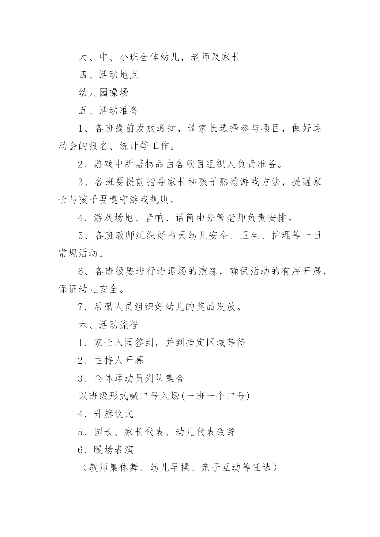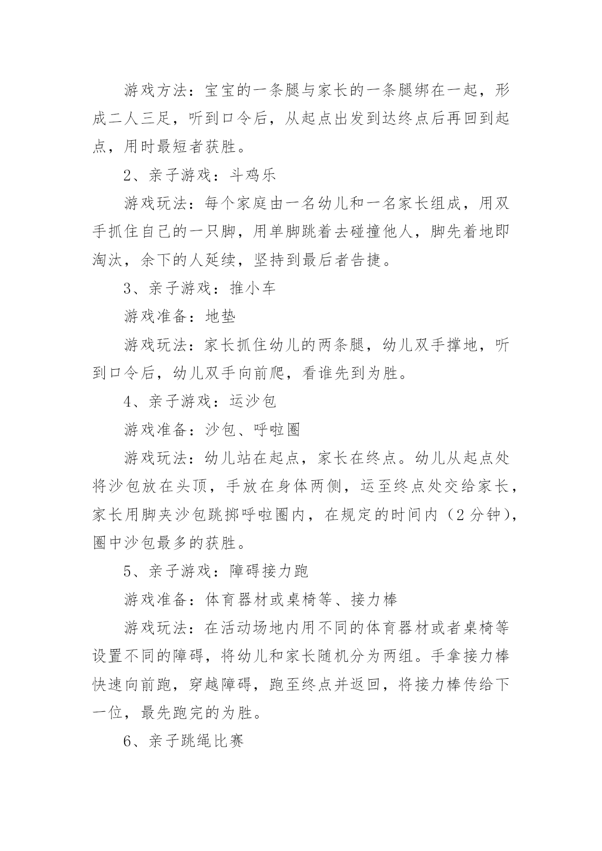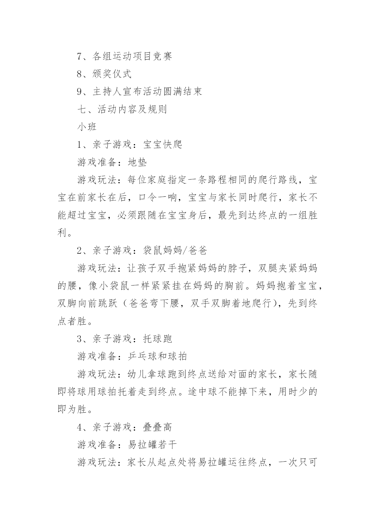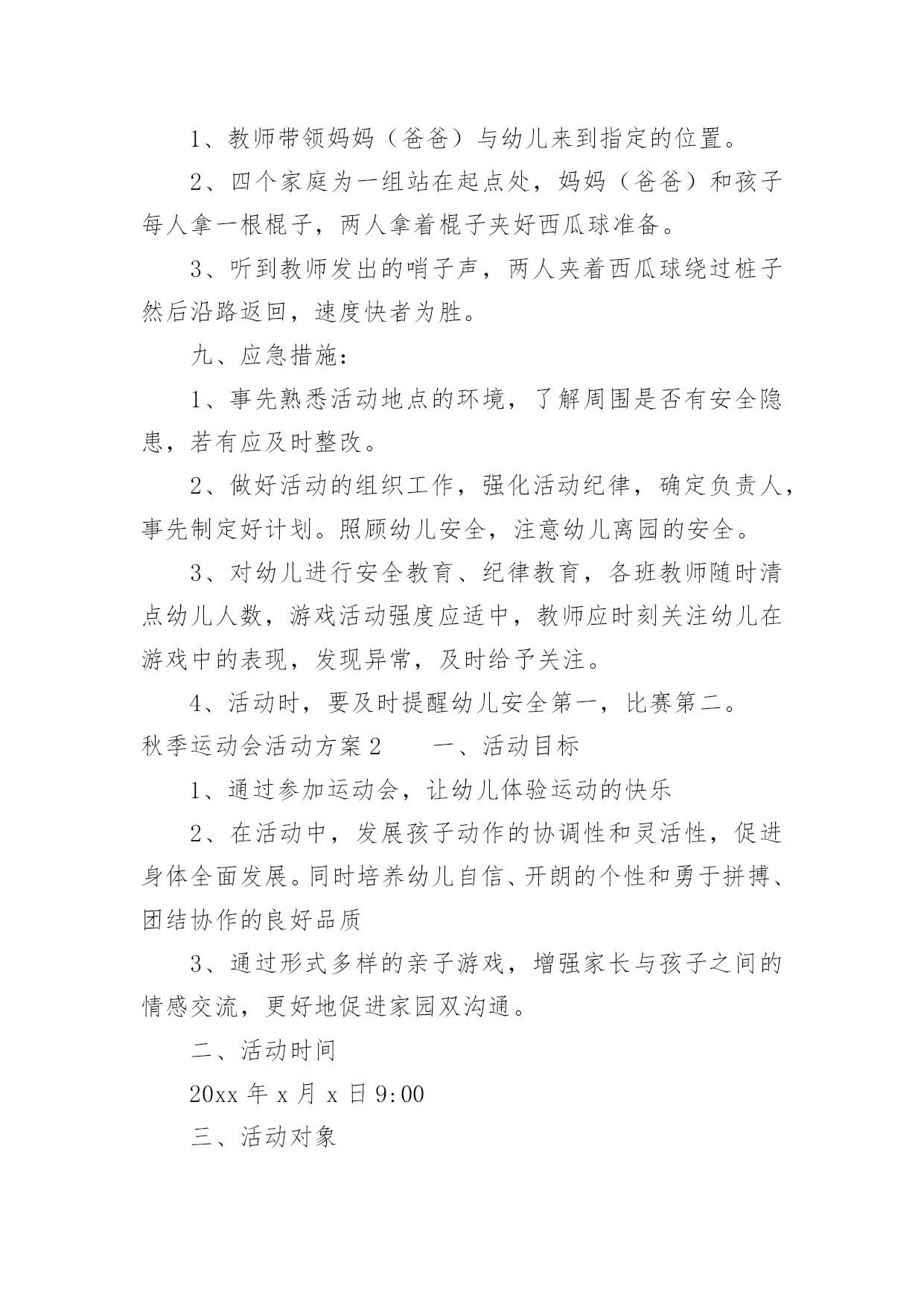 秋季运动会活动方案秋季运动会活动方案汇编15篇为了确保我们的努力取得实效,往往需要预先进行方案制定工作,方案是书面计划,是具体行动实施办法细则,步骤等。我们应该怎么制定方案呢?以下是小编精心整理的秋季运动会活动方案,仅供参考,欢迎大家阅读。秋季运动会活动方案1一、指导思想:《幼儿园教育纲要》中明确指出:"幼儿与成人之间的共同生活、交往、探索、游戏等,是其学习的重要途径之一。"亲子活动是以亲缘关系为主要维系基础,以幼儿与家长互动游戏为核心内容,全方位开发孩子的多种能力,帮助孩子初步完成自然人向社会人的过渡的一种活动。为了帮助家长进一步学习亲子游戏的方式、方法,我园决定开展秋季亲子运动会,邀请家长到幼儿园来进行集体的亲子活动,从而使家长对亲子活动目的、准备过程、如何引导活动有了更详尽的了解。二、活动主题:大手牵小手一起来加油三、活动目的:1、情感目标:体验运动的快乐,竞争的乐趣以及规则意识及协作精神;2、能力目标:在与父母游戏中发展幼儿的走、投掷和跑的能力;3、知识目标:学习走、投准和助跑跨栏等基本动作;4、亲子目标:督促家长关注孩子的体能发展,和孩子一起培养对体育活动的爱好,为孩子的将来建立良好的运动习惯。四、活动形式:体操表演、亲子体能比赛。五、活动准备:1、制定活动方案,邀请幼儿家长来园参加亲子活动。2、准备游戏需要的材料。3、布置活动场地。六、活动时间和地点:10月28日,操场七、活动原则:1、安全第一。不管在园里举行还是在外面租场地举行,必须保证每一个孩子的安全。2、家长和孩子齐参与。让每一位家长和孩子都参与到我们活动中来,家长不再是单纯的观众和欣赏者,要积极参与做一个让孩子自豪骄傲的爸爸妈妈!3、公平、博爱原则。活动中体现公平竞争,公平比赛原则,让孩子们树立良好的竞赛风格,体验成功的快乐,同时要给每个孩子准备一份奖品,奖励孩子和家长们的全心投入。八、具体活动方案:中一班《听话的小球》目标:发展幼儿的腿部力量和控制能力。准备:四条跑道、每个家庭一只皮球玩法:爸爸或妈妈、小朋友分别站在场地的两边,游戏开始,爸爸用脚运球至小朋友处,,小朋友接球后,爸爸或妈妈和小朋友背靠背,夹住皮球运至出发点,先到者为胜。规则:爸爸必须用脚带球走,不能用力踢球。中二班《袋鼠过河》游戏准备:呼啦圈,面袋游戏规则:1、分四队,分别由家长和孩子合作,孩子站在呼啦圈里,口令起,家长把呼啦圈拿起绕过孩子的头再扔到前面,孩子往前跳,依次这样,到达岸边。2、家长和孩子站在各自的袋子里,家长的一边手牵着孩子的手,各自抓紧自己的袋子,口令起,从起点跳到终点,先到者获胜,注意:1、呼啦圈一定要绕过孩子的头,而且孩子必须是跳到呼啦圈里,不能走或跨到圈里,不能脱圈跳,否则判失败。2、必须人和袋不分离,家长的手和孩子的手要牵着到达终点。3、如跳到中途袋子脱落,应把袋子拉好再继续跳,不能脱袋跳,否则判失败。中三班:《撕名牌》活动准备:每个幼儿背后贴一张自己的名牌玩法:每个家庭由一名家长和一名幼儿参加,八个家庭为一组,家长将孩子抱在怀里,在幼儿的背部贴上一张自己的名牌,听到口令后开始游戏,在保护好自己的名牌的同时将别人的名牌揪下来。中四班《过河寻宝》活动目标:1、发展幼儿的手部精细动作和控制能力。2、培养亲子间合作配合的能力,增进亲子情感的交流。准备:每个家庭三块纸板、长筷子(四双)、乒乓球若干、四个装满沙子和宝贝的玩具筐。玩法:1、分四组家长与孩子利用三块纸板,以最快的速度过小河,家长与孩子的脚不能接触地面。到达终点孩子在玩具筐里寻找宝贝,找到后把宝贝夹到指定的'地方。完成任务后家长和孩子面对面抱紧协调跑回终点。速度快的家庭获胜。中五班《运西瓜》活动目标:1、锻炼幼儿手臂力度的控制能力。2、增强幼儿与父母之间的团结协作的精神。3、增进幼儿与父母之间的情感。活动准备:西瓜球若干、棍子4跟、装球的纸箱一个、桩子6个。游戏玩法:1、教师带领妈妈(爸爸)与幼儿来到指定的位置。2、四个家庭为一组站在起点处,妈妈(爸爸)和孩子每人拿一根棍子,两人拿着棍子夹好西瓜球准备。3、听到教师发出的哨子声,两人夹着西瓜球绕过桩子然后沿路返回,速度快者为胜。九、应急措施:1、事先熟悉活动地点的环境,了解周围是否有安全隐患,若有应及时整改。2、做好活动的组织工作,强化活动纪律,确定负责人,事先制定好计划。照顾幼儿安全,注意幼儿离园的安全。3、对幼儿进行安全教育、纪律教育,各班教师随时清点幼儿人数,游戏活动强度应适中,教师应时刻关注幼儿在游戏中的表现,发现异常,及时给予关注。4、活动时,要及时提醒幼儿安全第一,比赛第二。秋季运动会活动方案2一、活动目标1、通过参加运动会,让幼儿体验运动的快乐2、在活动中,发展孩子动作的协调性和灵活性,促进身体全面发展。同时培养幼儿自信、开朗的个性和勇于拼搏、团结