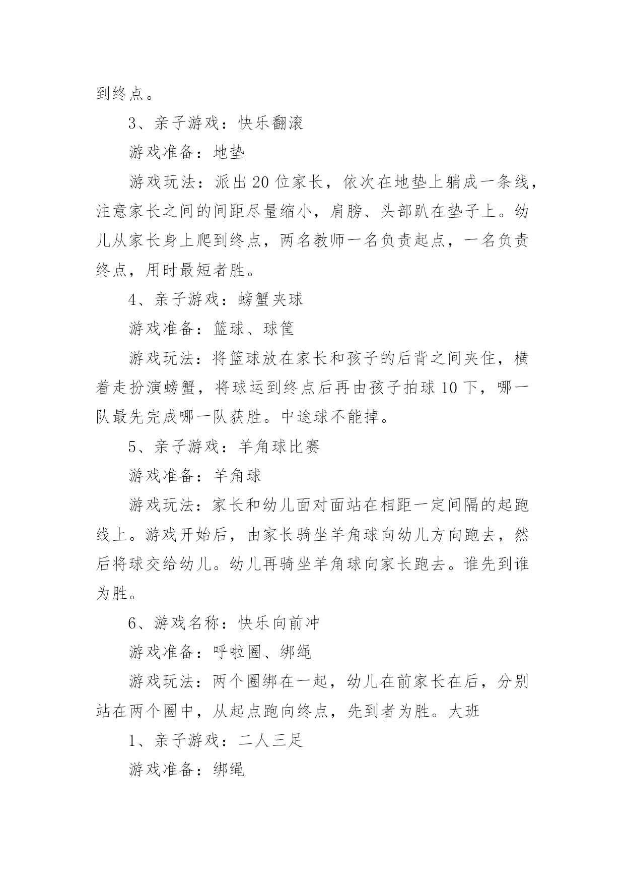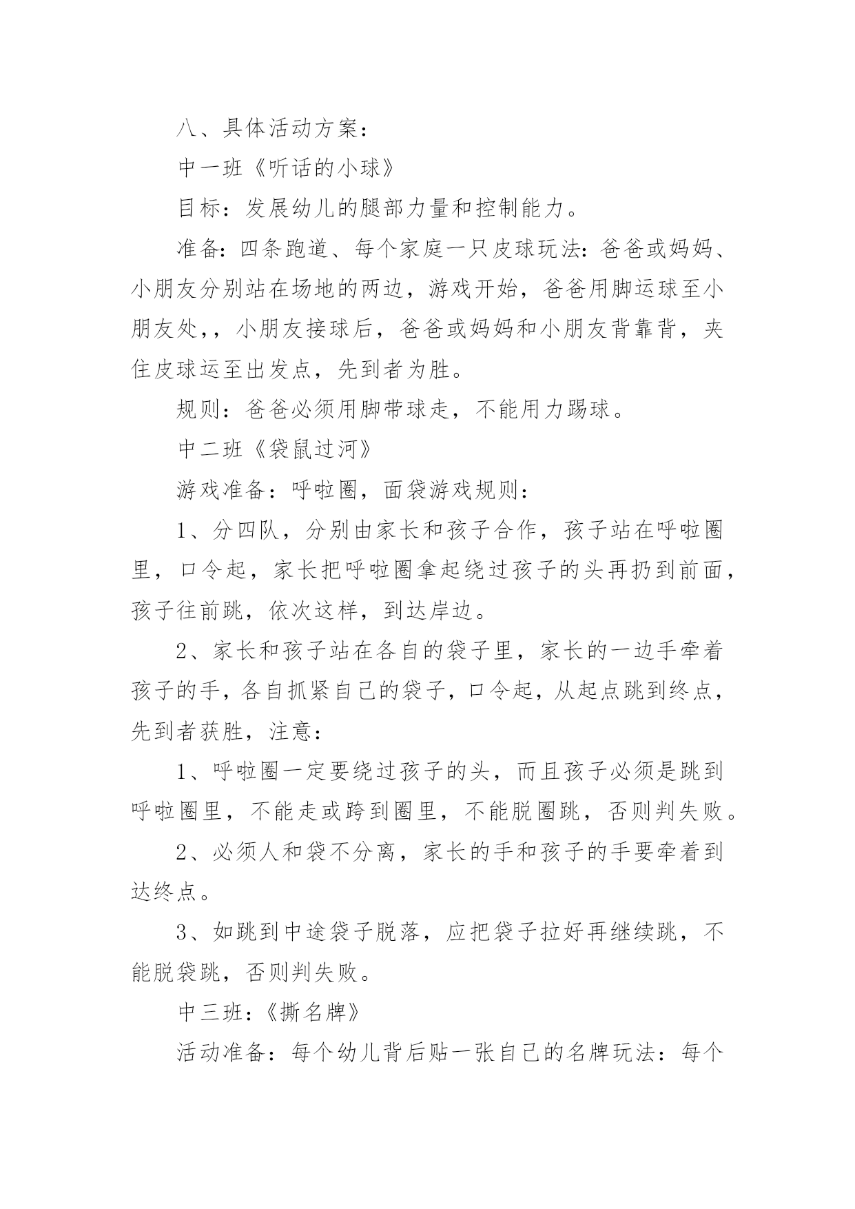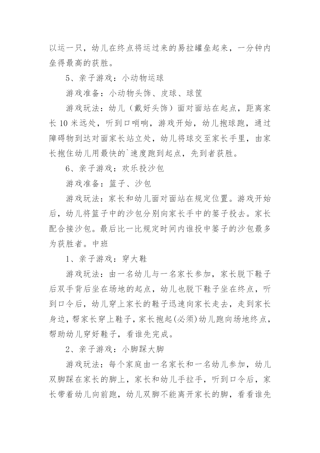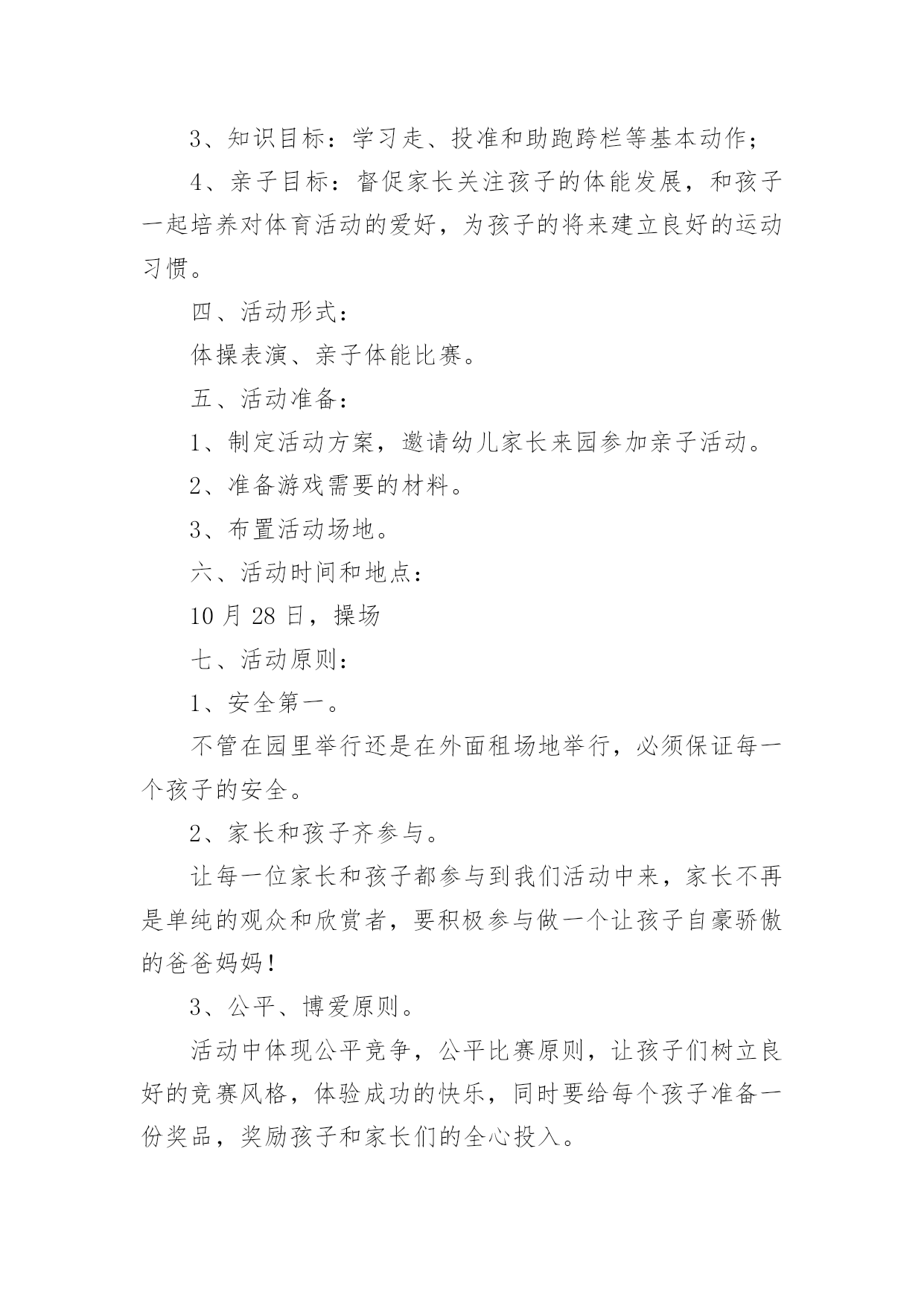 秋季运动会活动方案秋季运动会活动方案汇编15篇为了确保我们的努力取得实效,往往需要预先进行方案制定工作,方案是书面计划,是具体行动实施办法细则,步骤等。我们应该怎么制定方案呢?以下是小编精心整理的秋季运动会活动方案,仅供参考,欢迎大家阅读。秋季运动会活动方案1一、指导思想:《幼儿园教育纲要》中明确指出:"幼儿与成人之间的共同生活、交往、探索、游戏等,是其学习的重要途径之一。"亲子活动是以亲缘关系为主要维系基础,以幼儿与家长互动游戏为核心内容,全方位开发孩子的多种能力,帮助孩子初步完成自然人向社会人的过渡的一种活动。为了帮助家长进一步学习亲子游戏的方式、方法,我园决定开展秋季亲子运动会,邀请家长到幼儿园来进行集体的亲子活动,从而使家长对亲子活动目的、准备过程、如何引导活动有了更详尽的了解。二、活动主题:大手牵小手一起来加油三、活动目的:1、情感目标:体验运动的快乐,竞争的乐趣以及规则意识及协作精神;2、能力目标:在与父母游戏中发展幼儿的走、投掷和跑的能力;3、知识目标:学习走、投准和助跑跨栏等基本动作;4、亲子目标:督促家长关注孩子的体能发展,和孩子一起培养对体育活动的爱好,为孩子的将来建立良好的运动习惯。四、活动形式:体操表演、亲子体能比赛。五、活动准备:1、制定活动方案,邀请幼儿家长来园参加亲子活动。2、准备游戏需要的材料。3、布置活动场地。六、活动时间和地点:10月28日,操场七、活动原则:1、安全第一。不管在园里举行还是在外面租场地举行,必须保证每一个孩子的安全。2、家长和孩子齐参与。让每一位家长和孩子都参与到我们活动中来,家长不再是单纯的观众和欣赏者,要积极参与做一个让孩子自豪骄傲的爸爸妈妈!3、公平、博爱原则。活动中体现公平竞争,公平比赛原则,让孩子们树立良好的竞赛风格,体验成功的快乐,同时要给每个孩子准备一份奖品,奖励孩子和家长们的全心投入。八、具体活动方案:中一班《听话的小球》目标:发展幼儿的腿部力量和控制能力。准备:四条跑道、每个家庭一只皮球玩法:爸爸或妈妈、小朋友分别站在场地的两边,游戏开始,爸爸用脚运球至小朋友处,,小朋友接球后,爸爸或妈妈和小朋友背靠背,夹住皮球运至出发点,先到者为胜。规则:爸爸必须用脚带球走,不能用力踢球。中二班《袋鼠过河》游戏准备:呼啦圈,面袋游戏规则:1、分四队,分别由家长和孩子合作,孩子站在呼啦圈里,口令起,家长把呼啦圈拿起绕过孩子的头再扔到前面,孩子往前跳,依次这样,到达岸边。2、家长和孩子站在各自的袋子里,家长的一边手牵着孩子的手,各自抓紧自己的袋子,口令起,从起点跳到终点,先到者获胜,注意:1、呼啦圈一定要绕过孩子的头,而且孩子必须是跳到呼啦圈里,不能走或跨到圈里,不能脱圈跳,否则判失败。2、必须人和袋不分离,家长的手和孩子的手要牵着到达终点。3、如跳到中途袋子脱落,应把袋子拉好再继续跳,不能脱袋跳,否则判失败。中三班:《撕名牌》活动准备:每个幼儿背后贴一张自己的名牌玩法:每个家庭由一名家长和一名幼儿参加,八个家庭为一组,家长将孩子抱在怀里,在幼儿的背部贴上一张自己的名牌,听到口令后开始游戏,在保护好自己的名牌的同时将别人的名牌揪下来。中四班《过河寻宝》活动目标:1、发展幼儿的手部精细动作和控制能力。2、培养亲子间合作配合的能力,增进亲子情感的交流。准备:每个家庭三块纸板、长筷子(四双)、乒乓球若干、四个装满沙子和宝贝的玩具筐。玩法:1、分四组家长与孩子利用三块纸板,以最快的速度过小河,家长与孩子的脚不能接触地面。到达终点孩子在玩具筐里寻找宝贝,找到后把宝贝夹到指定的'地方。完成任务后家长和孩子面对面抱紧协调跑回终点。速度快的家庭获胜。中五班《运西瓜》活动目标:1、锻炼幼儿手臂力度的控制能力。2、增强幼儿与父母之间的团结协作的精神。3、增进幼儿与父母之间的情感。活动准备:西瓜球若干、棍子4跟、装球的纸箱一个、桩子6个。游戏玩法:1、教师带领妈妈(爸爸)与幼儿来到指定的位置。2、四个家庭为一组站在起点处,妈妈(爸爸)和孩子每人拿一根棍子,两人拿着棍子夹好西瓜球准备。3、听到教师发出的哨子声,两人夹着西瓜球绕过桩子然后沿路返回,速度快者为胜。九、应急措施:1、事先熟悉活动地点的环境,了解周围是否有安全隐患,若有应及时整改。2、做好活动的组织工作,强化活动纪律,确定负责人,事先制定好计划。照顾幼儿安全,注意幼儿离园的安全。3、对幼儿进行安全教育、纪律教育,各班教师随时清点幼儿人数,游戏活动强度应适中,教师应时刻关注幼儿在游戏中的表现,发现异常,及时给予关注。4、活动时,要及时提醒幼儿安全第一,比赛第二。秋季运动会活动方案2一、活动目标1、通过参加运动会,让幼儿体验运动的快乐2、在活动中,发展孩子动作的协调性和灵活性,促进身体全面发展。同时培养幼儿自信、开朗的个性和勇于拼搏、团结