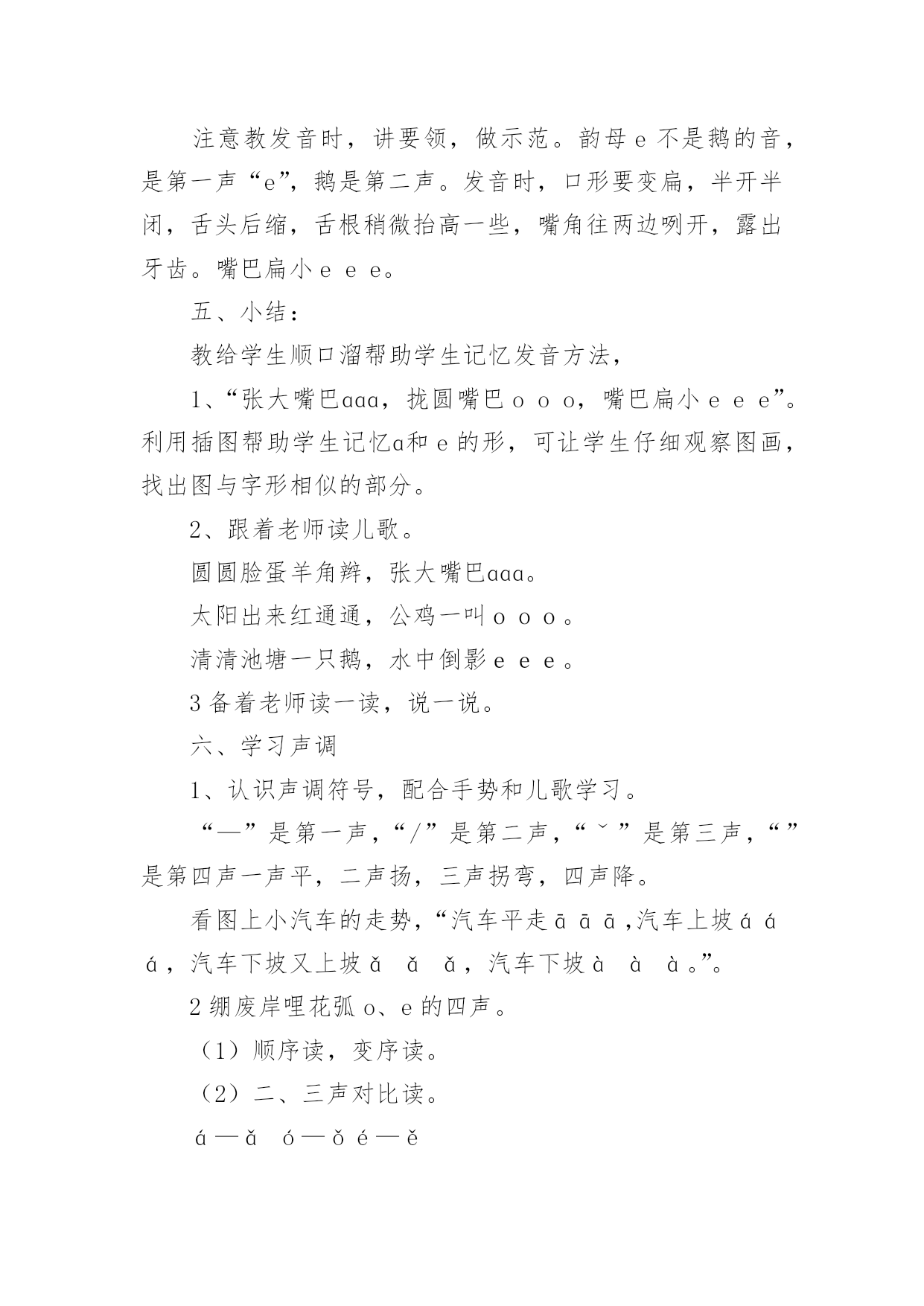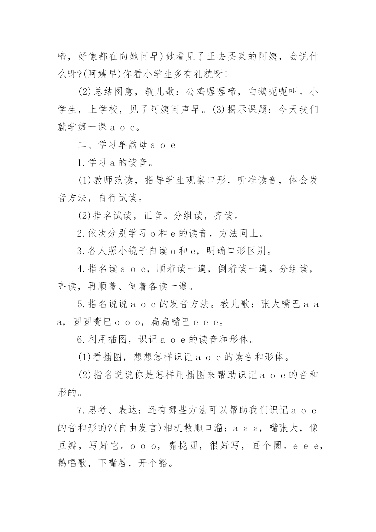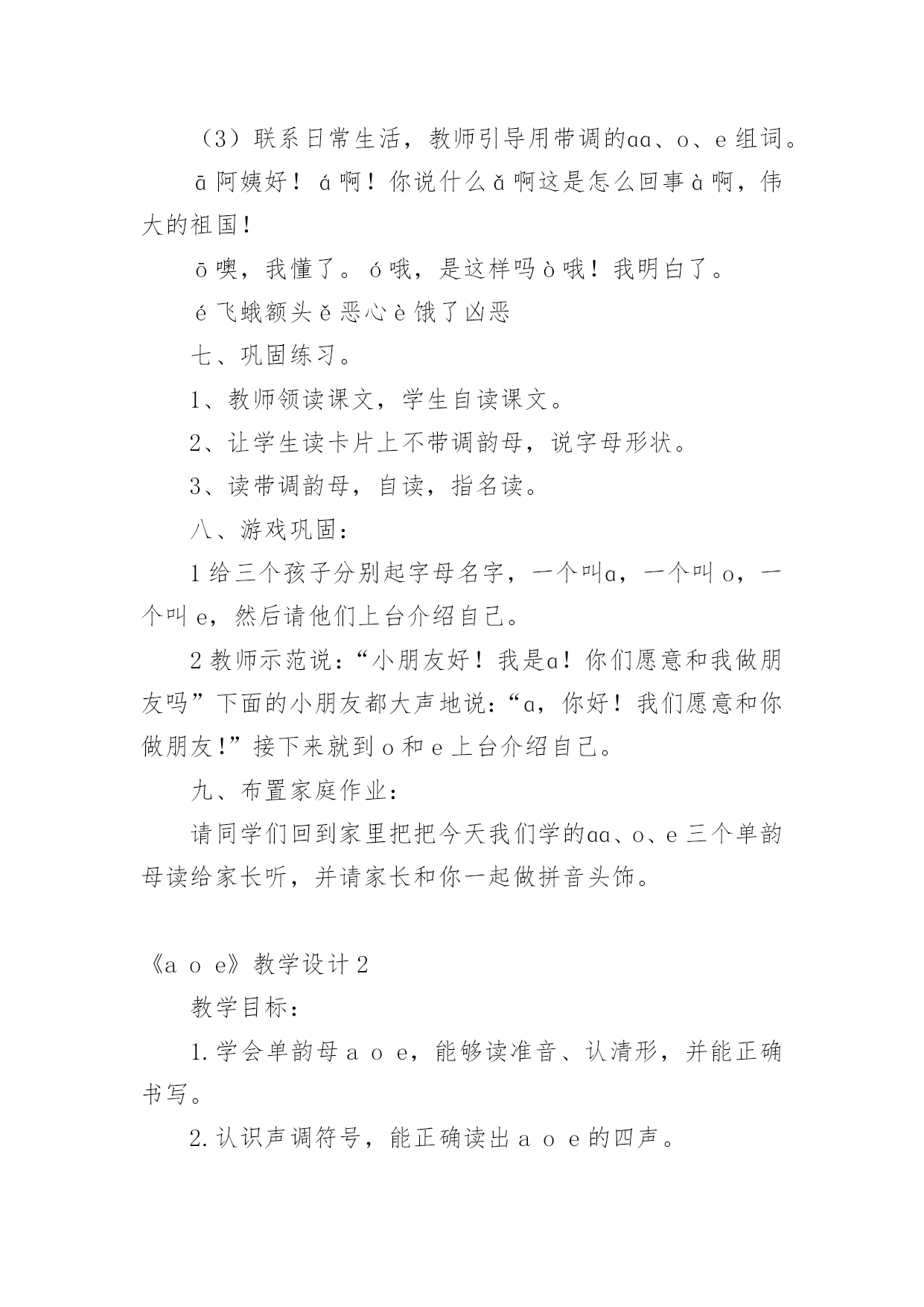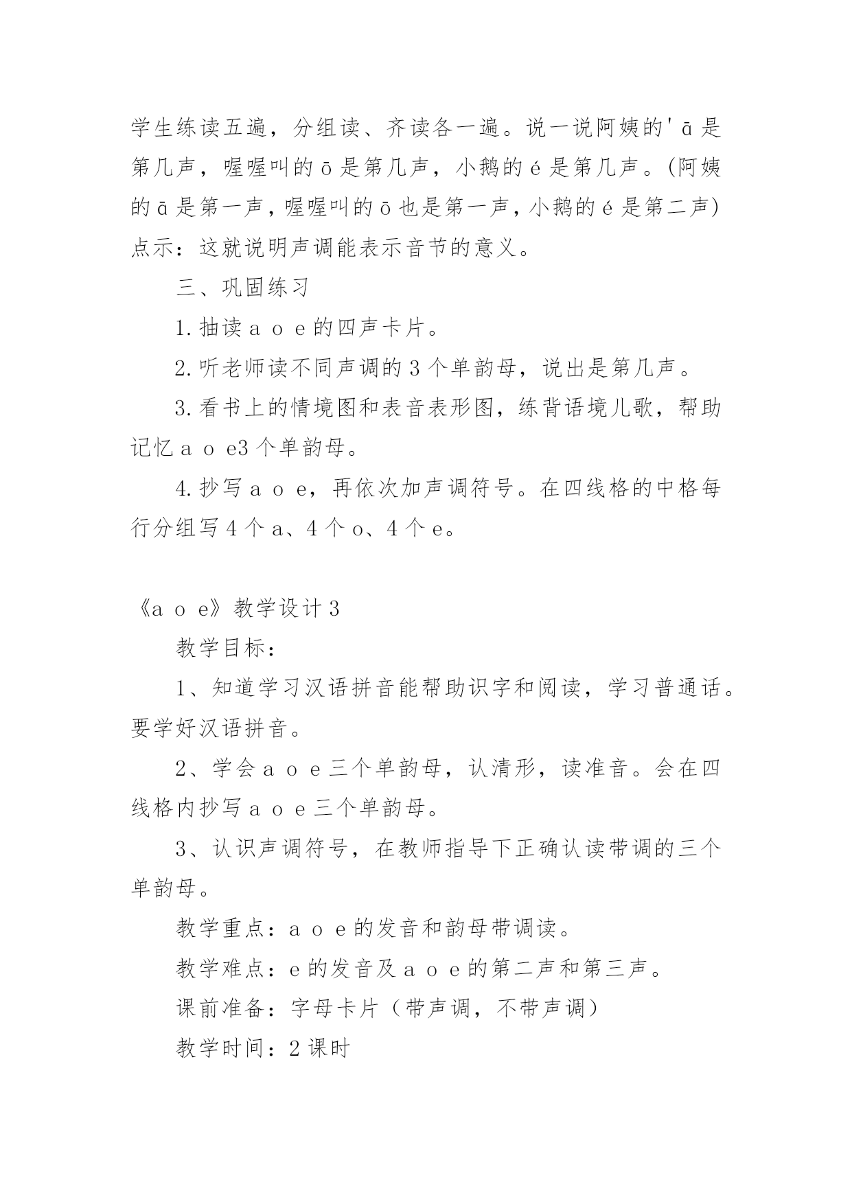 《aoe》教学设计作为一名教职工,总归要编写教学设计,教学设计一般包括教学目标、教学重难点、教学方法、教学步骤与时间分配等环节。教学设计应该怎么写呢?下面是小编帮大家整理的《aoe》教学设计,希望对大家有所帮助。《aoe》教学设计1教学目标1、学会ɑɑ、o、e3个单韵母,读准音,认清形,正确书写;知道单韵母有4个声调,认识声调符号。2、能直接读出带声调ɑɑ、o、e的音。3、激发学生学习汉语拼音的兴趣,培养良好的写字习惯。教学重难点e的发音及ɑ、o、e的第二声和第三声。教学准备配合学习ɑɑ、o、e发音的录音带。教学过程一、明确学习目的,激发学习兴趣1、告诉学生学会汉语拼音自己就能阅读注音读物了,以后学习查字典、学习普通话都离不开汉语拼音,借以激发学生的`学习兴趣。2、教读儿歌:汉语拼音用处大,学习生字需要它,帮助学好普通话,我们决心学好它。3、看图讲故事(依据课本插图教师编讲),激发学习兴趣。二、学习单韵母ɑ1、看图引出单韵母ɑ,板书“ɑ”。2、教师示范发ɑ的音,边读边讲发音方法,讲解发音要领,并做示范。嘴张大,舌头居中,舌位低,嘴唇呈自然状态(不圆唇),发音过程中口形不能变动。学生观察、模仿,体会发音要领。学生反复练读。可以利用插图,借助“啊”读准ɑ的音;编成顺口溜帮助学生记忆发音方法,“张大嘴巴ɑɑɑ”。3、引导学生看图:小女孩的头部像ɑ的形,小女孩张大嘴巴发的就是ɑ的音。教儿歌,帮助学生记忆ɑ的音和形。4、学生反复练习发ɑ的音。教师巡视指导纠正,单个练习(开小火车,指名读)。三、学习单韵母o(方法同上)注意教发o音时,讲要领,做示范。发“o”音时,嘴半开半闭,嘴唇圆拢,舌尖向后缩,舌面后部隆起。发音方法,把“喔喔”的音拉长,口形舌位不变,接着呼气发音,就能发出正确的字母音了。拢圆嘴巴ooo四、学习单韵母e(方法同上)注意教发音时,讲要领,做示范。韵母e不是鹅的音,是第一声“e”,鹅是第二声。发音时,口形要变扁,半开半闭,舌头后缩,舌根稍微抬高一些,嘴角往两边咧开,露出牙齿。嘴巴扁小eee。五、小结:教给学生顺口溜帮助学生记忆发音方法,1、“张大嘴巴ɑɑɑ,拢圆嘴巴ooo,嘴巴扁小eee”。利用插图帮助学生记忆ɑ和e的形,可让学生仔细观察图画,找出图与字形相似的部分。2、跟着老师读儿歌。圆圆脸蛋羊角辫,张大嘴巴ɑɑɑ。太阳出来红通通,公鸡一叫ooo。清清池塘一只鹅,水中倒影eee。3备着老师读一读,说一说。六、学习声调1、认识声调符号,配合手势和儿歌学习。“—”是第一声,“/”是第二声,“ˇ”是第三声,“”是第四声一声平,二声扬,三声拐弯,四声降。看图上小汽车的走势,“汽车平走āāā,汽车上坡ááá,汽车下坡又上坡ǎǎǎ,汽车下坡ààà。”。2绷废岸哩花弧o、e的四声。(1)顺序读,变序读。(2)二、三声对比读。á—ǎó—ǒé—ě(3)联系日常生活,教师引导用带调的ɑɑ、o、e组词。ā阿姨好!á啊!你说什么ǎ啊这是怎么回事à啊,伟大的祖国!ō噢,我懂了。ó哦,是这样吗ò哦!我明白了。é飞蛾额头ě恶心è饿了凶恶七、巩固练习。1、教师领读课文,学生自读课文。2、让学生读卡片上不带调韵母,说字母形状。3、读带调韵母,自读,指名读。八、游戏巩固:1给三个孩子分别起字母名字,一个叫ɑ,一个叫o,一个叫e,然后请他们上台介绍自己。2教师示范说:“小朋友好!我是ɑ!你们愿意和我做朋友吗”下面的小朋友都大声地说:“ɑ,你好!我们愿意和你做朋友!”接下来就到o和e上台介绍自己。九、布置家庭作业:请同学们回到家里把把今天我们学的ɑɑ、o、e三个单韵母读给家长听,并请家长和你一起做拼音头饰。《aoe》教学设计2教学目标:1.学会单韵母aoe,能够读准音、认清形,并能正确书写。2.认识声调符号,能正确读出aoe的四声。3.认识汉语拼音四线格并学习使用。教学重点、难点:1.aoe的正确发音,a和e读音的比较。2.aoe的四声读法。教学准备:彩色挂图、aoe的四声卡片、画有四线格和描红笔顺的小黑板,学生各带小镜子一面。教学时间:两课时第一课时教学内容:学习单韵母aoe教学过程:一、看图激趣,揭示课题1.谈话导入。小朋友,你们已经是一年级小学生了。每天到学校读书识字学本领,那怎样学会读书识字呢?首先要学好汉语拼音。学好了汉语拼音就能识很多字,读很多书,学很多本领。2.下面跟老师学儿歌:汉语拼音用处大,识字读书需要它,帮助说好普通话,我们一起学好它。3.指导看图,引出字母。(1)请小朋友看书上的插图,图上画的是什么时间,什么地方,谁在干什么。(早晨,太阳出来了,一年级小学生背着书包高高兴兴上学去,路旁的白鹅呃呃叫,大公鸡喔喔啼,好像都在向她问早)她看见了正去买菜的阿姨,会说什么呀?(阿姨早)你看小学生多有礼貌呀!(2)总结图意,教儿歌:公鸡喔喔啼,白鹅