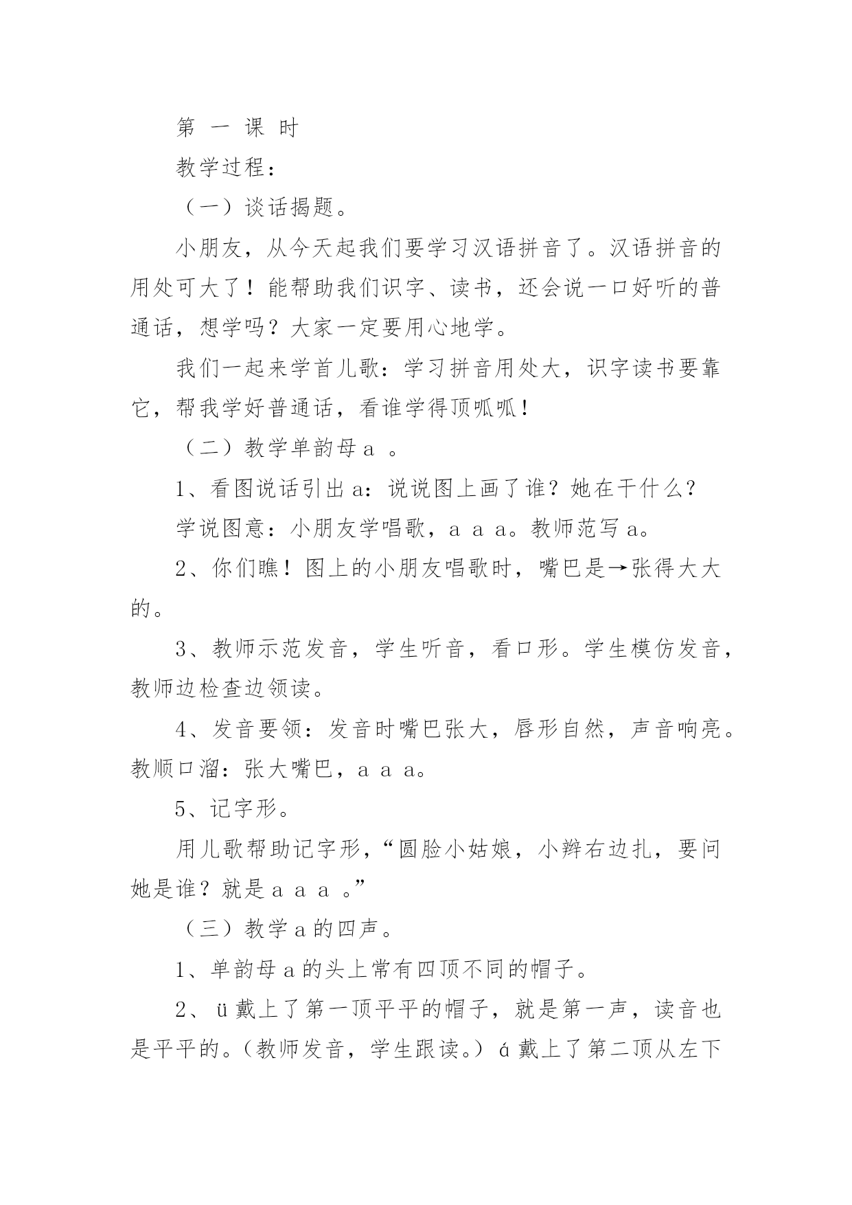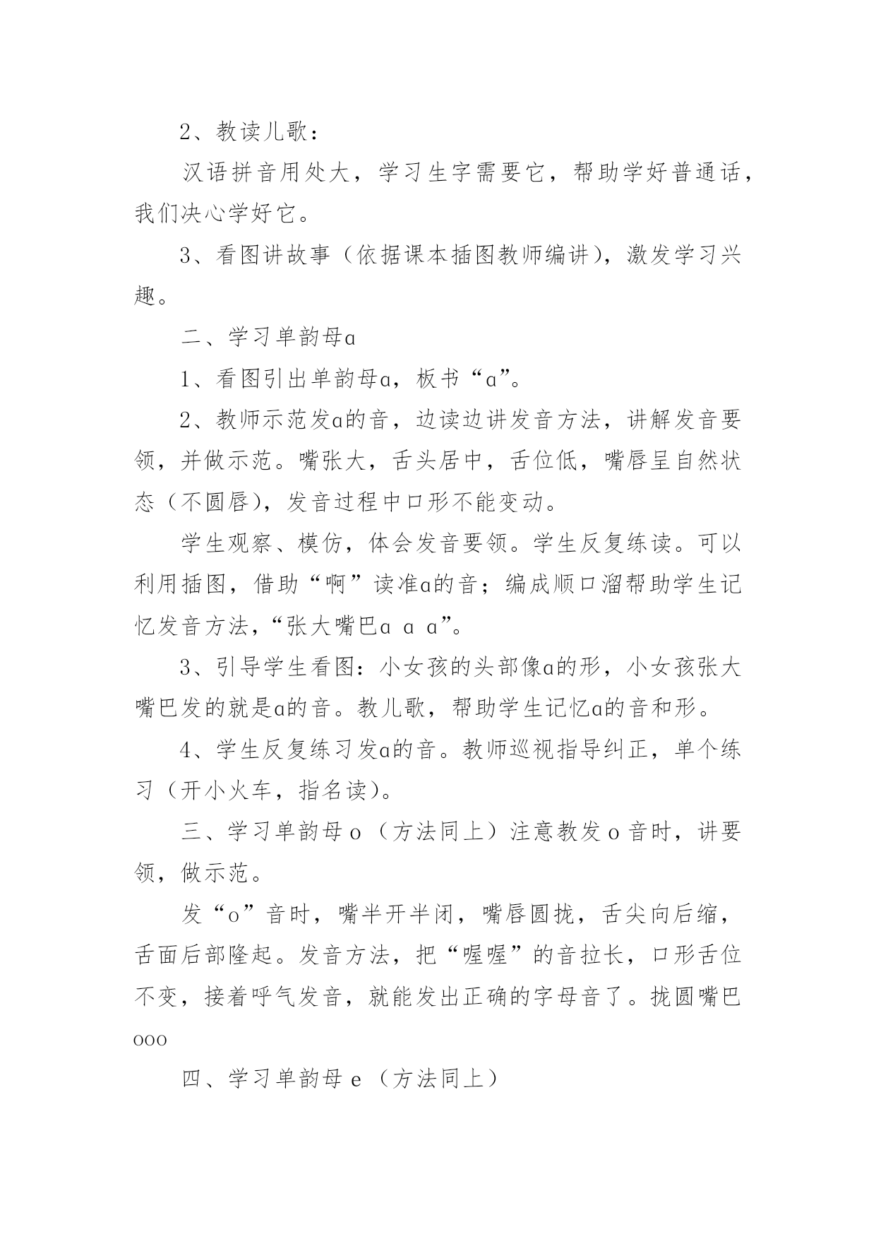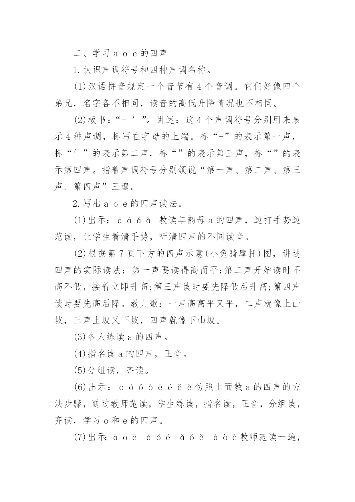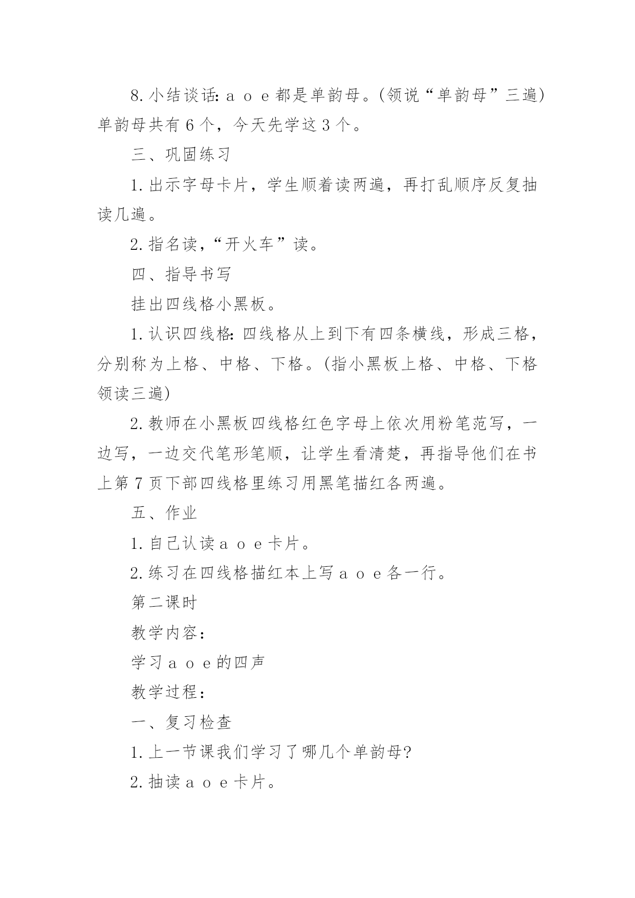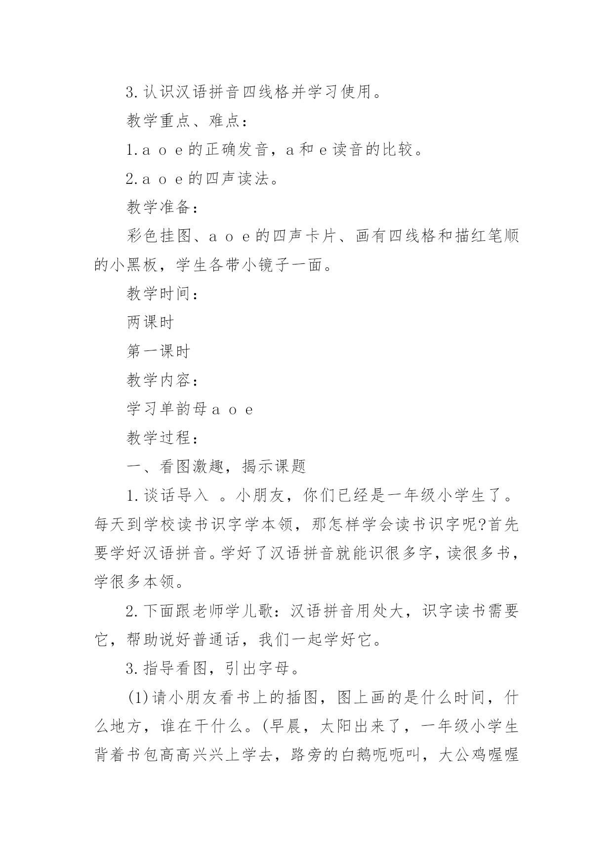 《aoe》教学设计作为一名教职工,总归要编写教学设计,教学设计一般包括教学目标、教学重难点、教学方法、教学步骤与时间分配等环节。教学设计应该怎么写呢?下面是小编帮大家整理的《aoe》教学设计,希望对大家有所帮助。《aoe》教学设计1教学目标1、学会ɑɑ、o、e3个单韵母,读准音,认清形,正确书写;知道单韵母有4个声调,认识声调符号。2、能直接读出带声调ɑɑ、o、e的音。3、激发学生学习汉语拼音的兴趣,培养良好的写字习惯。教学重难点e的发音及ɑ、o、e的第二声和第三声。教学准备配合学习ɑɑ、o、e发音的录音带。教学过程一、明确学习目的,激发学习兴趣1、告诉学生学会汉语拼音自己就能阅读注音读物了,以后学习查字典、学习普通话都离不开汉语拼音,借以激发学生的`学习兴趣。2、教读儿歌:汉语拼音用处大,学习生字需要它,帮助学好普通话,我们决心学好它。3、看图讲故事(依据课本插图教师编讲),激发学习兴趣。二、学习单韵母ɑ1、看图引出单韵母ɑ,板书“ɑ”。2、教师示范发ɑ的音,边读边讲发音方法,讲解发音要领,并做示范。嘴张大,舌头居中,舌位低,嘴唇呈自然状态(不圆唇),发音过程中口形不能变动。学生观察、模仿,体会发音要领。学生反复练读。可以利用插图,借助“啊”读准ɑ的音;编成顺口溜帮助学生记忆发音方法,“张大嘴巴ɑɑɑ”。3、引导学生看图:小女孩的头部像ɑ的形,小女孩张大嘴巴发的就是ɑ的音。教儿歌,帮助学生记忆ɑ的音和形。4、学生反复练习发ɑ的音。教师巡视指导纠正,单个练习(开小火车,指名读)。三、学习单韵母o(方法同上)注意教发o音时,讲要领,做示范。发“o”音时,嘴半开半闭,嘴唇圆拢,舌尖向后缩,舌面后部隆起。发音方法,把“喔喔”的音拉长,口形舌位不变,接着呼气发音,就能发出正确的字母音了。拢圆嘴巴ooo四、学习单韵母e(方法同上)注意教发音时,讲要领,做示范。韵母e不是鹅的音,是第一声“e”,鹅是第二声。发音时,口形要变扁,半开半闭,舌头后缩,舌根稍微抬高一些,嘴角往两边咧开,露出牙齿。嘴巴扁小eee。五、小结:教给学生顺口溜帮助学生记忆发音方法,1、“张大嘴巴ɑɑɑ,拢圆嘴巴ooo,嘴巴扁小eee”。利用插图帮助学生记忆ɑ和e的形,可让学生仔细观察图画,找出图与字形相似的部分。2、跟着老师读儿歌。圆圆脸蛋羊角辫,张大嘴巴ɑɑɑ。太阳出来红通通,公鸡一叫ooo。清清池塘一只鹅,水中倒影eee。3备着老师读一读,说一说。六、学习声调1、认识声调符号,配合手势和儿歌学习。“—”是第一声,“/”是第二声,“ˇ”是第三声,“”是第四声一声平,二声扬,三声拐弯,四声降。看图上小汽车的走势,“汽车平走āāā,汽车上坡ááá,汽车下坡又上坡ǎǎǎ,汽车下坡ààà。”。2绷废岸哩花弧o、e的四声。(1)顺序读,变序读。(2)二、三声对比读。á—ǎó—ǒé—ě(3)联系日常生活,教师引导用带调的ɑɑ、o、e组词。ā阿姨好!á啊!你说什么ǎ啊这是怎么回事à啊,伟大的祖国!ō噢,我懂了。ó哦,是这样吗ò哦!我明白了。é飞蛾额头ě恶心è饿了凶恶七、巩固练习。1、教师领读课文,学生自读课文。2、让学生读卡片上不带调韵母,说字母形状。3、读带调韵母,自读,指名读。八、游戏巩固:1给三个孩子分别起字母名字,一个叫ɑ,一个叫o,一个叫e,然后请他们上台介绍自己。2教师示范说:“小朋友好!我是ɑ!你们愿意和我做朋友吗”下面的小朋友都大声地说:“ɑ,你好!我们愿意和你做朋友!”接下来就到o和e上台介绍自己。九、布置家庭作业:请同学们回到家里把把今天我们学的ɑɑ、o、e三个单韵母读给家长听,并请家长和你一起做拼音头饰。《aoe》教学设计2教学目标:1.学会单韵母aoe,能够读准音、认清形,并能正确书写。2.认识声调符号,能正确读出aoe的四声。3.认识汉语拼音四线格并学习使用。教学重点、难点:1.aoe的正确发音,a和e读音的比较。2.aoe的四声读法。教学准备:彩色挂图、aoe的四声卡片、画有四线格和描红笔顺的小黑板,学生各带小镜子一面。教学时间:两课时第一课时教学内容:学习单韵母aoe教学过程:一、看图激趣,揭示课题1.谈话导入。小朋友,你们已经是一年级小学生了。每天到学校读书识字学本领,那怎样学会读书识字呢?首先要学好汉语拼音。学好了汉语拼音就能识很多字,读很多书,学很多本领。2.下面跟老师学儿歌:汉语拼音用处大,识字读书需要它,帮助说好普通话,我们一起学好它。3.指导看图,引出字母。(1)请小朋友看书上的插图,图上画的是什么时间,什么地方,谁在干什么。(早晨,太阳出来了,一年级小学生背着书包高高兴兴上学去,路旁的白鹅呃呃叫,大公鸡喔喔啼,好像都在向她问早)她看见了正去买菜的阿姨,会说什么呀?(阿姨早)你看小学生多有礼貌呀!(2)总结图意,教儿歌:公鸡喔喔啼,白鹅