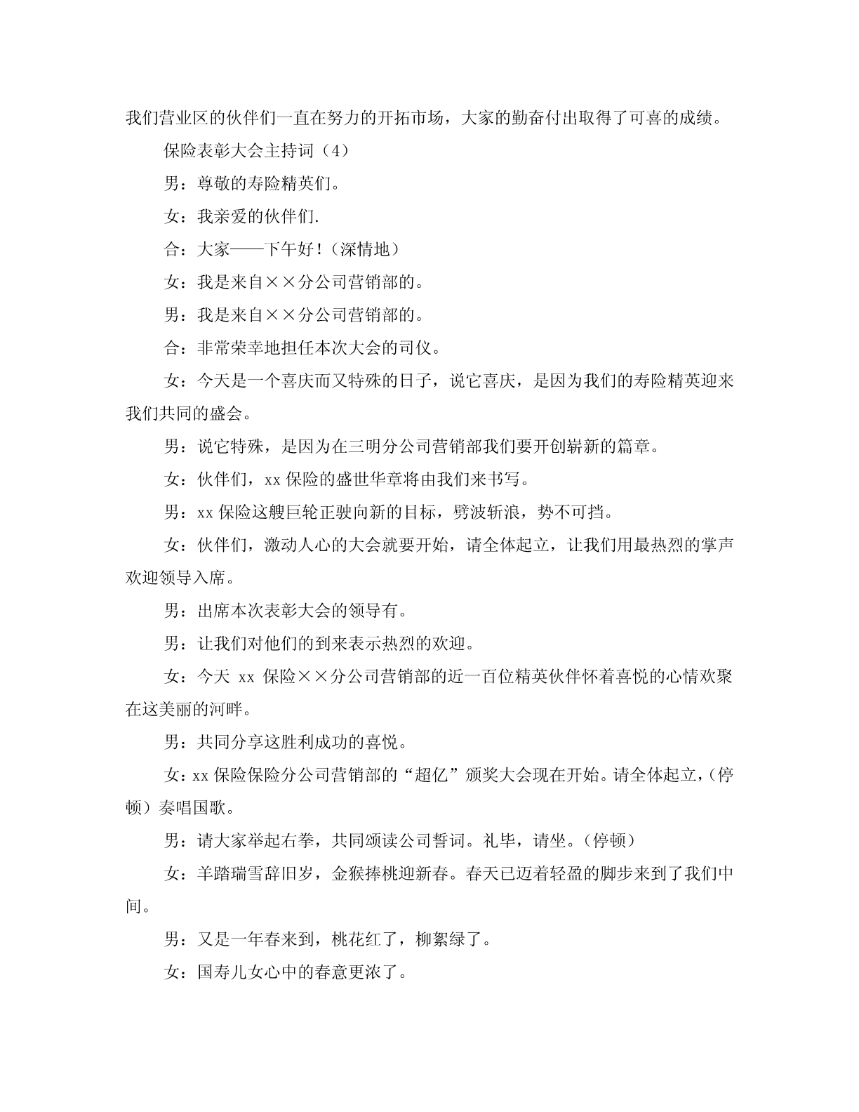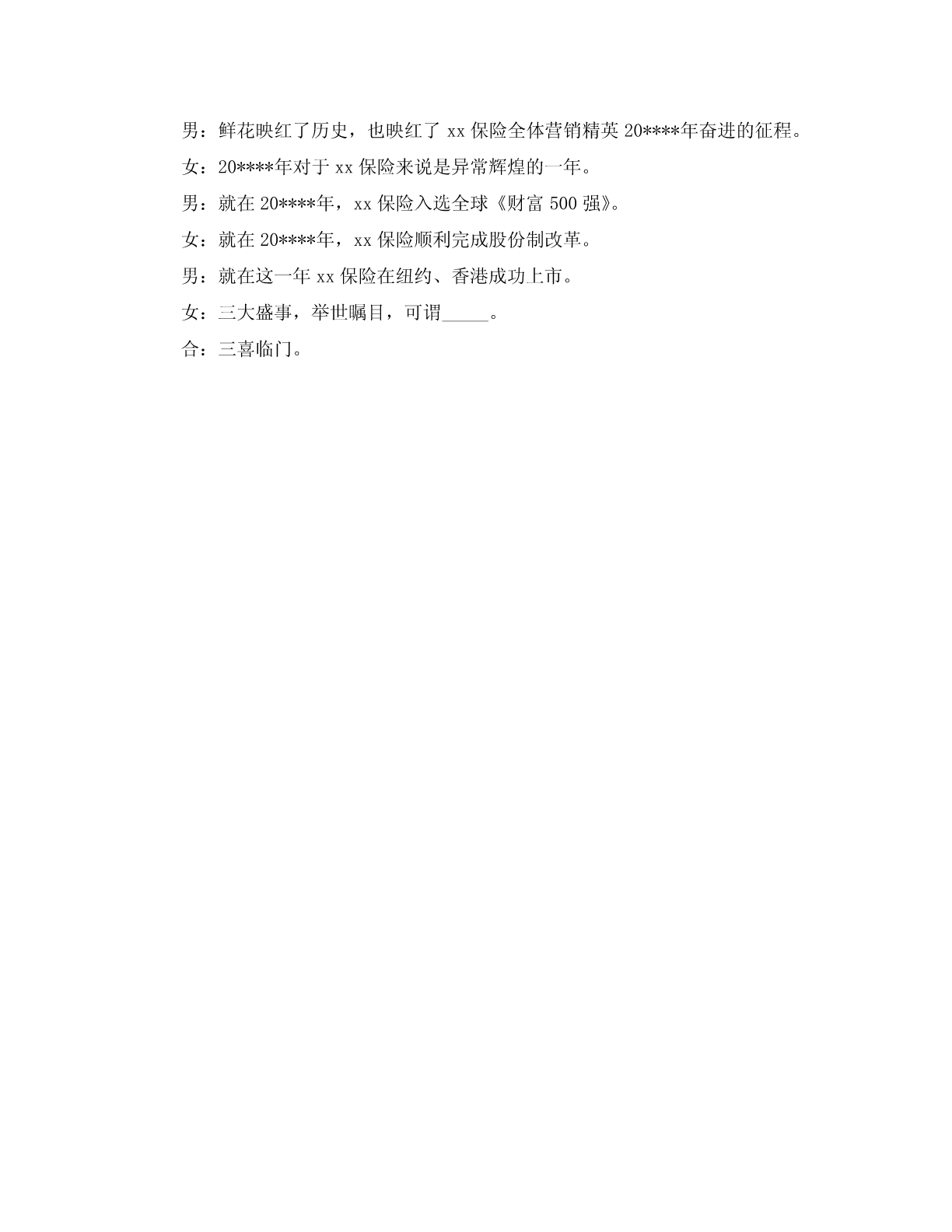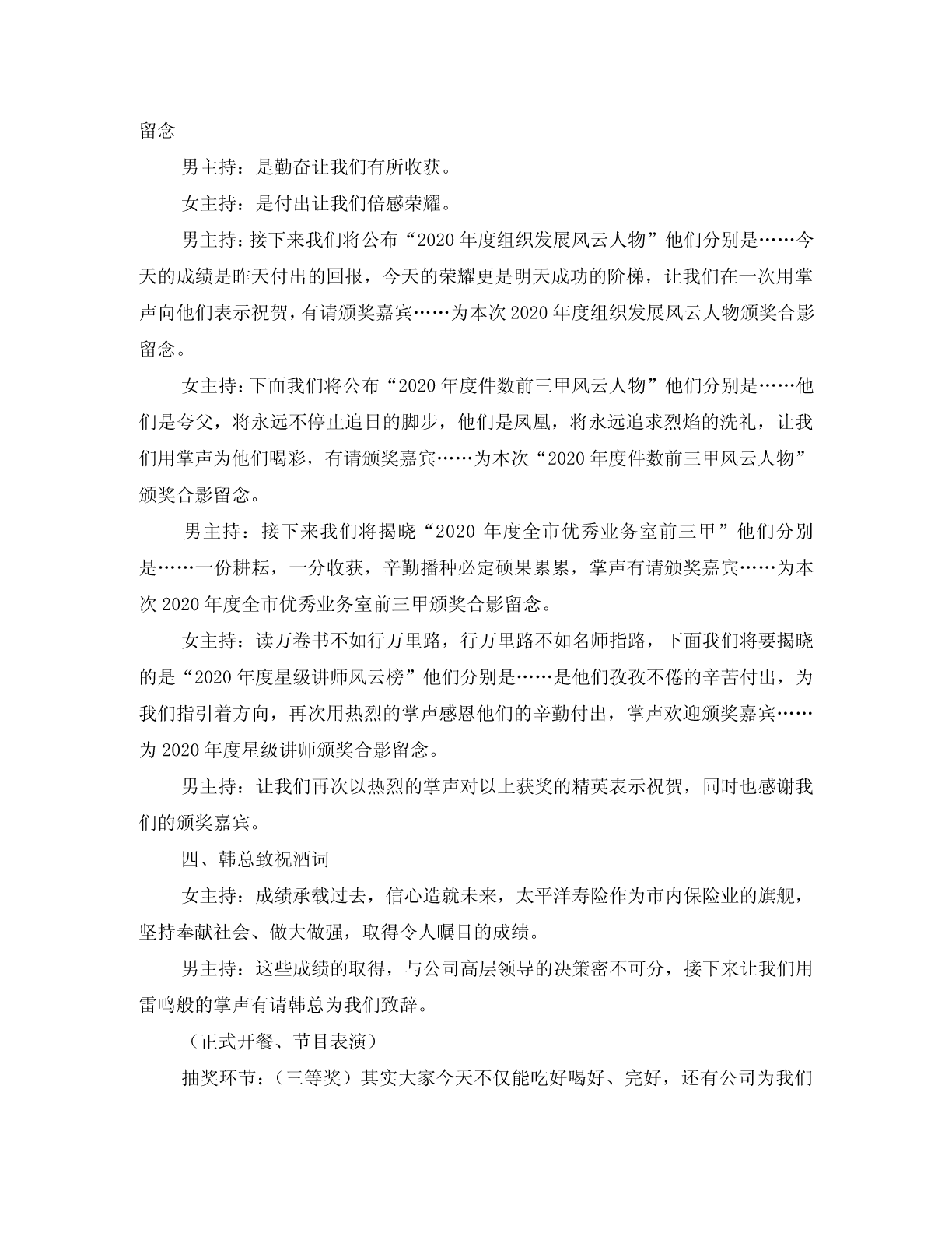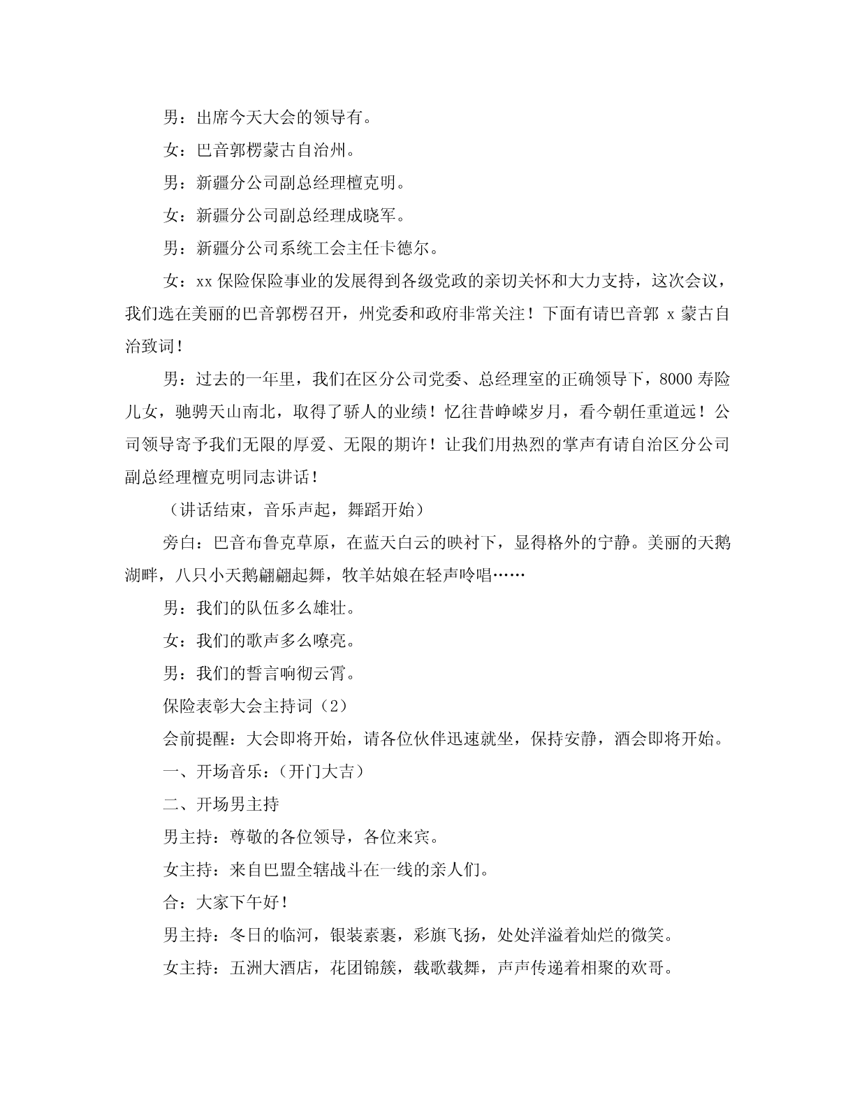 此资料由网络收集而来,如有侵权请告知上传者立即删除。资料共分享,我们负责传递知识。保险表彰大会主持词公司员工表彰大会是每个公司都不可或缺的一项活动,写好主持词可以让整个活动活色生香,让每个人的心情舒畅。下面是小编为你整理了“保险表彰大会主持词”,希望能帮助到您。保险表彰大会主持词(1)背景音乐:好日子男:流火的七月,我们相聚在华厦第一州,我们相约孔雀河畔的梨城。女:今天是用鲜花和掌声簇拥的日子,今天是一个激动人心的日子,是一个好日子!男:来自天山南北的优秀主管和精英们就在我们会场的门口,让我们全体起立,用热情的掌声欢迎他们入场!女:看!他们走进来了,那份英姿!那份豪气!辉映出成功的喜悦!(背景音乐:进行曲。一致到领导入座)男:看!那份坚定!那份执着!浸透着他们永不言败的精神!女:因为有了他们!我们感到骄傲!男:因为有了他们!我们感受到自豪!女:让我们用爱的真棒来表达对英雄的敬意!(领:爱的真棒:学习精英!挑战自我!顽强拼搏!迈向成功!)男:伙伴们!让雷鸣般的掌声响起来,欢迎领导入场!(领导入座后,威风锣鼓表演)女:各位领导!各位来宾!男:精英们!伙伴们!合:大家好!男:xx保险保险新疆分公司2020年度个人寿险销售精英暨优秀主管表彰大会现在开始!女:请全体起立,奏唱国歌!此资料由网络收集而来,如有侵权请告知上传者立即删除。资料共分享,我们负责传递知识。男:出席今天大会的领导有。女:巴音郭楞蒙古自治州。男:新疆分公司副总经理檀克明。女:新疆分公司副总经理成晓军。男:新疆分公司系统工会主任卡德尔。女:xx保险保险事业的发展得到各级党政的亲切关怀和大力支持,这次会议,我们选在美丽的巴音郭楞召开,州党委和政府非常关注!下面有请巴音郭x蒙古自治致词!男:过去的一年里,我们在区分公司党委、总经理室的正确领导下,8000寿险儿女,驰骋天山南北,取得了骄人的业绩!忆往昔峥嵘岁月,看今朝任重道远!公司领导寄予我们无限的厚爱、无限的期许!让我们用热烈的掌声有请自治区分公司副总经理檀克明同志讲话!(讲话结束,音乐声起,舞蹈开始)旁白:巴音布鲁克草原,在蓝天白云的映衬下,显得格外的宁静。美丽的天鹅湖畔,八只小天鹅翩翩起舞,牧羊姑娘在轻声呤唱……男:我们的队伍多么雄壮。女:我们的歌声多么嘹亮。男:我们的誓言响彻云霄。保险表彰大会主持词(2)会前提醒:大会即将开始,请各位伙伴迅速就坐,保持安静,酒会即将开始。一、开场音乐:(开门大吉)二、开场男主持男主持:尊敬的各位领导,各位来宾。女主持:来自巴盟全辖战斗在一线的亲人们。合:大家下午好!男主持:冬日的临河,银装素裹,彩旗飞扬,处处洋溢着灿烂的微笑。女主持:五洲大酒店,花团锦簇,载歌载舞,声声传递着相聚的欢哥。此资料由网络收集而来,如有侵权请告知上传者立即删除。资料共分享,我们负责传递知识。男主持:当新年的钟声响起,我们与2020挥手告别。女主持:当新年的钟声响起,我们与2020激情相约。男主持:当新年的钟声响起,我们回眸2020。女主持:当新年的钟声响起,我们展望2020。男主持:在这激动人心的日子里,我们手牵手回忆巴彦淖尔中支2020的光辉岁月。女主持:在这热血沸腾的时刻,我们心连心祝福所有伙伴续写新的辉煌。男主持:当激情与激情再一次的相约碰撞,梦想的血液将流淌出无数美丽的希望。女主持:当欢声与笑语再一次扬帆起航,明天的乐曲将弹奏的更加流畅。男主持:让我们激情舞动,让我们放声高唱。女主持:让我们插上双翼,让我们放飞希望。男主持:让我们撒下热情,让我们凝聚力量。女主持:让我们把心情沸腾,让我们把快乐燃烧。男主持:让我们用沸腾的心,用燃烧的清,共同携起手来。合:迎接2020的灿烂与辉煌。男主持:现在我宣布,中国xxx寿险xxx中心支公司“成就卓越,独享尊荣”暨迎新年狂欢酒会现在正式开始(音乐掌声欢呼声)。三、介绍出席领导及领导至祝酒词男主持:下面请允许隆重的为大家介绍出席本次年度盛会的各位领导,来自中国xx寿险xxx心支公司总经理王凤亭先生欢迎您。女主持:来自中国xx寿险xxx心支公司个人业务部总经理韩风军先生欢迎您。男主持:来自北京九州智鼎咨询公司高级咨询顾问任慧萍老师欢迎您。女主持:来自中国xx寿险xxx心支公司本部张旭经理欢迎您。男主持:来自中国xx寿险xxx支乌拉特前旗支公司吴凤杰经理欢迎您。女主持:来自中国xx寿险xxx支杭锦后旗支公司马红芬经理欢迎您。男主持:来自中国xx寿险xxx心支公司全辖战斗在一线的所有亲爱的同事们此资料由网络收集而来,如有侵权请告知上传者立即删除。资料共分享,我们负责传递知识。欢迎您们的到来