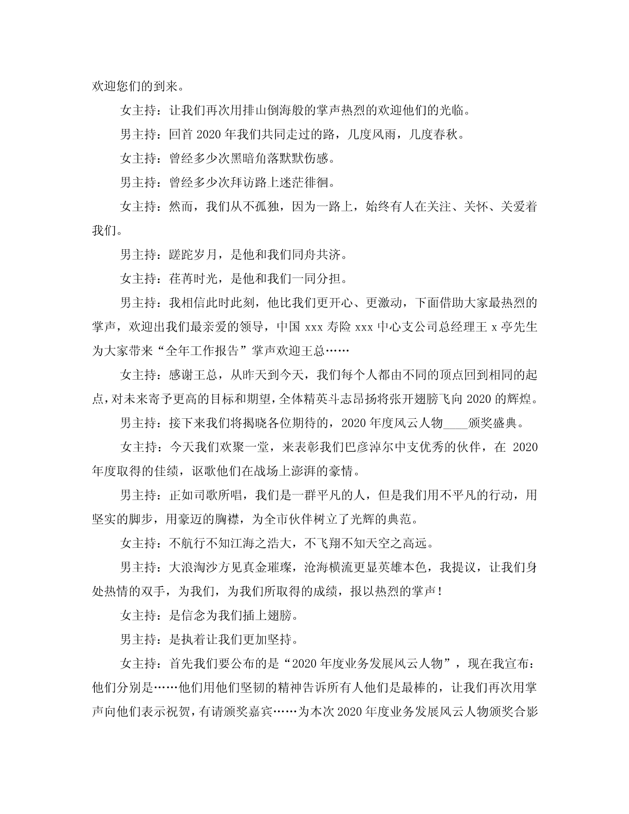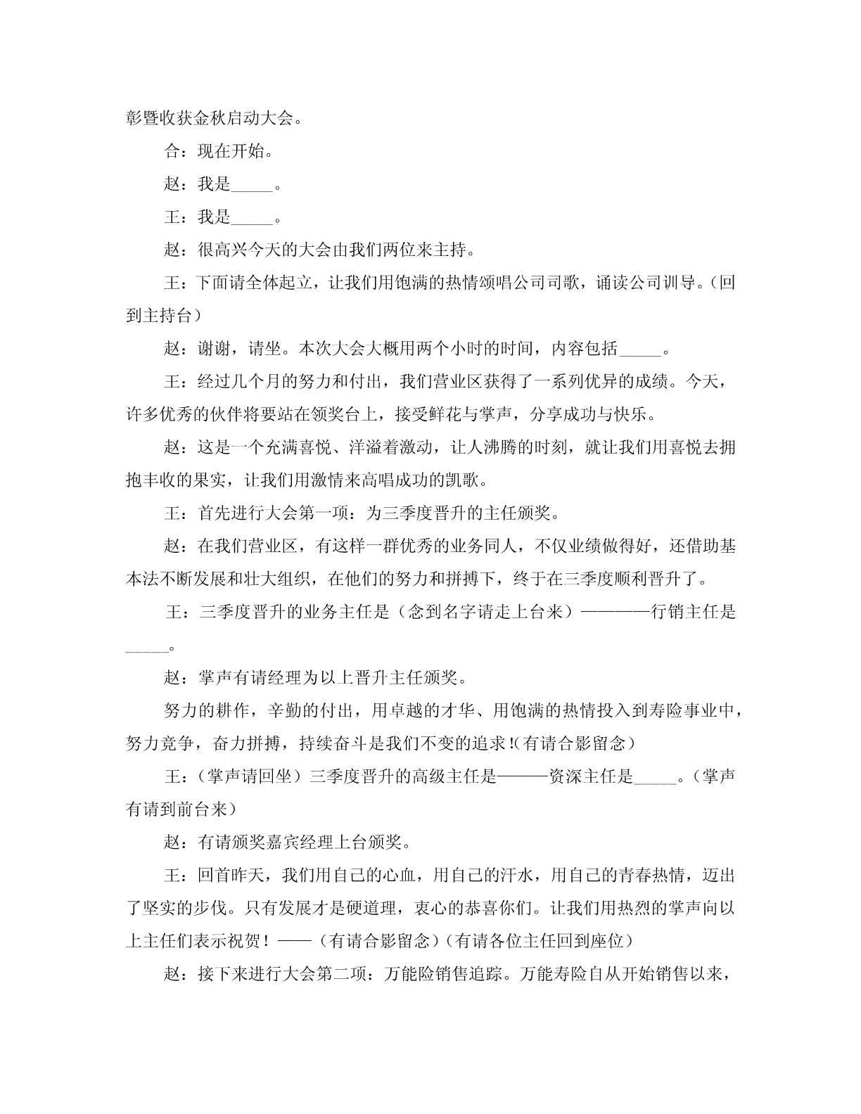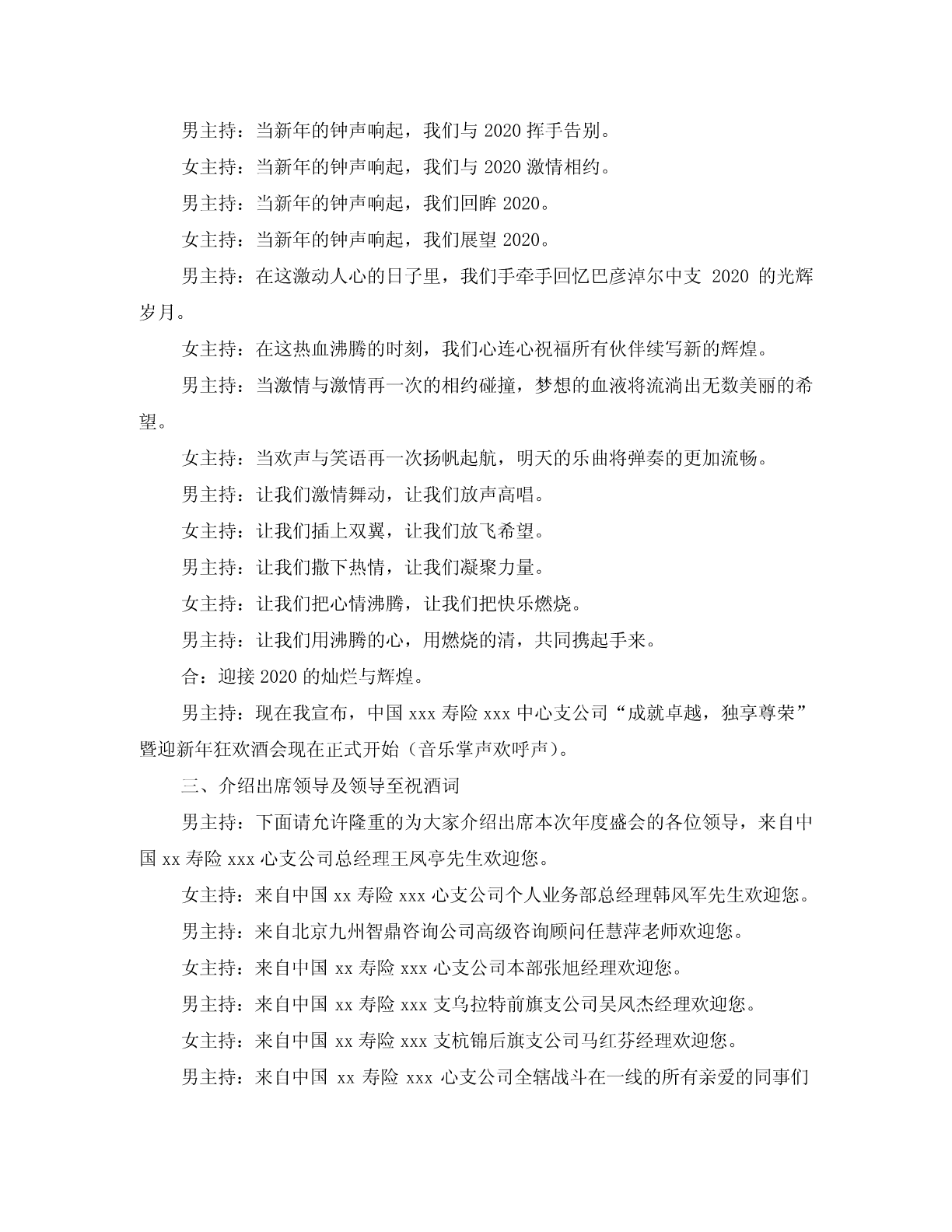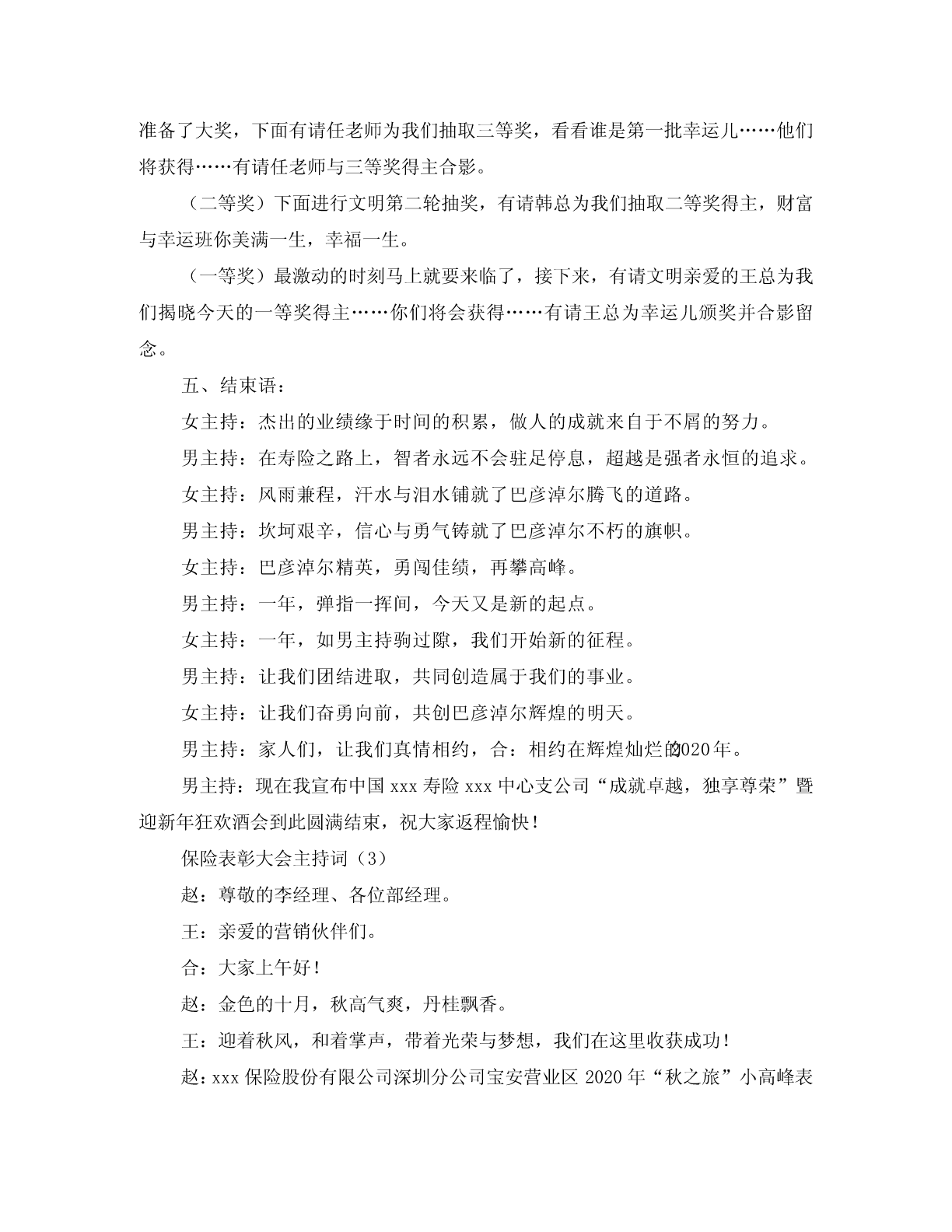 此资料由网络收集而来,如有侵权请告知上传者立即删除。资料共分享,我们负责传递知识。保险表彰大会主持词公司员工表彰大会是每个公司都不可或缺的一项活动,写好主持词可以让整个活动活色生香,让每个人的心情舒畅。下面是小编为你整理了“保险表彰大会主持词”,希望能帮助到您。保险表彰大会主持词(1)背景音乐:好日子男:流火的七月,我们相聚在华厦第一州,我们相约孔雀河畔的梨城。女:今天是用鲜花和掌声簇拥的日子,今天是一个激动人心的日子,是一个好日子!男:来自天山南北的优秀主管和精英们就在我们会场的门口,让我们全体起立,用热情的掌声欢迎他们入场!女:看!他们走进来了,那份英姿!那份豪气!辉映出成功的喜悦!(背景音乐:进行曲。一致到领导入座)男:看!那份坚定!那份执着!浸透着他们永不言败的精神!女:因为有了他们!我们感到骄傲!男:因为有了他们!我们感受到自豪!女:让我们用爱的真棒来表达对英雄的敬意!(领:爱的真棒:学习精英!挑战自我!顽强拼搏!迈向成功!)男:伙伴们!让雷鸣般的掌声响起来,欢迎领导入场!(领导入座后,威风锣鼓表演)女:各位领导!各位来宾!男:精英们!伙伴们!合:大家好!男:xx保险保险新疆分公司2020年度个人寿险销售精英暨优秀主管表彰大会现在开始!女:请全体起立,奏唱国歌!此资料由网络收集而来,如有侵权请告知上传者立即删除。资料共分享,我们负责传递知识。男:出席今天大会的领导有。女:巴音郭楞蒙古自治州。男:新疆分公司副总经理檀克明。女:新疆分公司副总经理成晓军。男:新疆分公司系统工会主任卡德尔。女:xx保险保险事业的发展得到各级党政的亲切关怀和大力支持,这次会议,我们选在美丽的巴音郭楞召开,州党委和政府非常关注!下面有请巴音郭x蒙古自治致词!男:过去的一年里,我们在区分公司党委、总经理室的正确领导下,8000寿险儿女,驰骋天山南北,取得了骄人的业绩!忆往昔峥嵘岁月,看今朝任重道远!公司领导寄予我们无限的厚爱、无限的期许!让我们用热烈的掌声有请自治区分公司副总经理檀克明同志讲话!(讲话结束,音乐声起,舞蹈开始)旁白:巴音布鲁克草原,在蓝天白云的映衬下,显得格外的宁静。美丽的天鹅湖畔,八只小天鹅翩翩起舞,牧羊姑娘在轻声呤唱……男:我们的队伍多么雄壮。女:我们的歌声多么嘹亮。男:我们的誓言响彻云霄。保险表彰大会主持词(2)会前提醒:大会即将开始,请各位伙伴迅速就坐,保持安静,酒会即将开始。一、开场音乐:(开门大吉)二、开场男主持男主持:尊敬的各位领导,各位来宾。女主持:来自巴盟全辖战斗在一线的亲人们。合:大家下午好!男主持:冬日的临河,银装素裹,彩旗飞扬,处处洋溢着灿烂的微笑。女主持:五洲大酒店,花团锦簇,载歌载舞,声声传递着相聚的欢哥。此资料由网络收集而来,如有侵权请告知上传者立即删除。资料共分享,我们负责传递知识。男主持:当新年的钟声响起,我们与2020挥手告别。女主持:当新年的钟声响起,我们与2020激情相约。男主持:当新年的钟声响起,我们回眸2020。女主持:当新年的钟声响起,我们展望2020。男主持:在这激动人心的日子里,我们手牵手回忆巴彦淖尔中支2020的光辉岁月。女主持:在这热血沸腾的时刻,我们心连心祝福所有伙伴续写新的辉煌。男主持:当激情与激情再一次的相约碰撞,梦想的血液将流淌出无数美丽的希望。女主持:当欢声与笑语再一次扬帆起航,明天的乐曲将弹奏的更加流畅。男主持:让我们激情舞动,让我们放声高唱。女主持:让我们插上双翼,让我们放飞希望。男主持:让我们撒下热情,让我们凝聚力量。女主持:让我们把心情沸腾,让我们把快乐燃烧。男主持:让我们用沸腾的心,用燃烧的清,共同携起手来。合:迎接2020的灿烂与辉煌。男主持:现在我宣布,中国xxx寿险xxx中心支公司“成就卓越,独享尊荣”暨迎新年狂欢酒会现在正式开始(音乐掌声欢呼声)。三、介绍出席领导及领导至祝酒词男主持:下面请允许隆重的为大家介绍出席本次年度盛会的各位领导,来自中国xx寿险xxx心支公司总经理王凤亭先生欢迎您。女主持:来自中国xx寿险xxx心支公司个人业务部总经理韩风军先生欢迎您。男主持:来自北京九州智鼎咨询公司高级咨询顾问任慧萍老师欢迎您。女主持:来自中国xx寿险xxx心支公司本部张旭经理欢迎您。男主持:来自中国xx寿险xxx支乌拉特前旗支公司吴凤杰经理欢迎您。女主持:来自中国xx寿险xxx支杭锦后旗支公司马红芬经理欢迎您。男主持:来自中国xx寿险xxx心支公司全辖战斗在一线的所有亲爱的同事们此资料由网络收集而来,如有侵权请告知上传者立即删除。资料共分享,我们负责传递知识。欢迎您们的到来