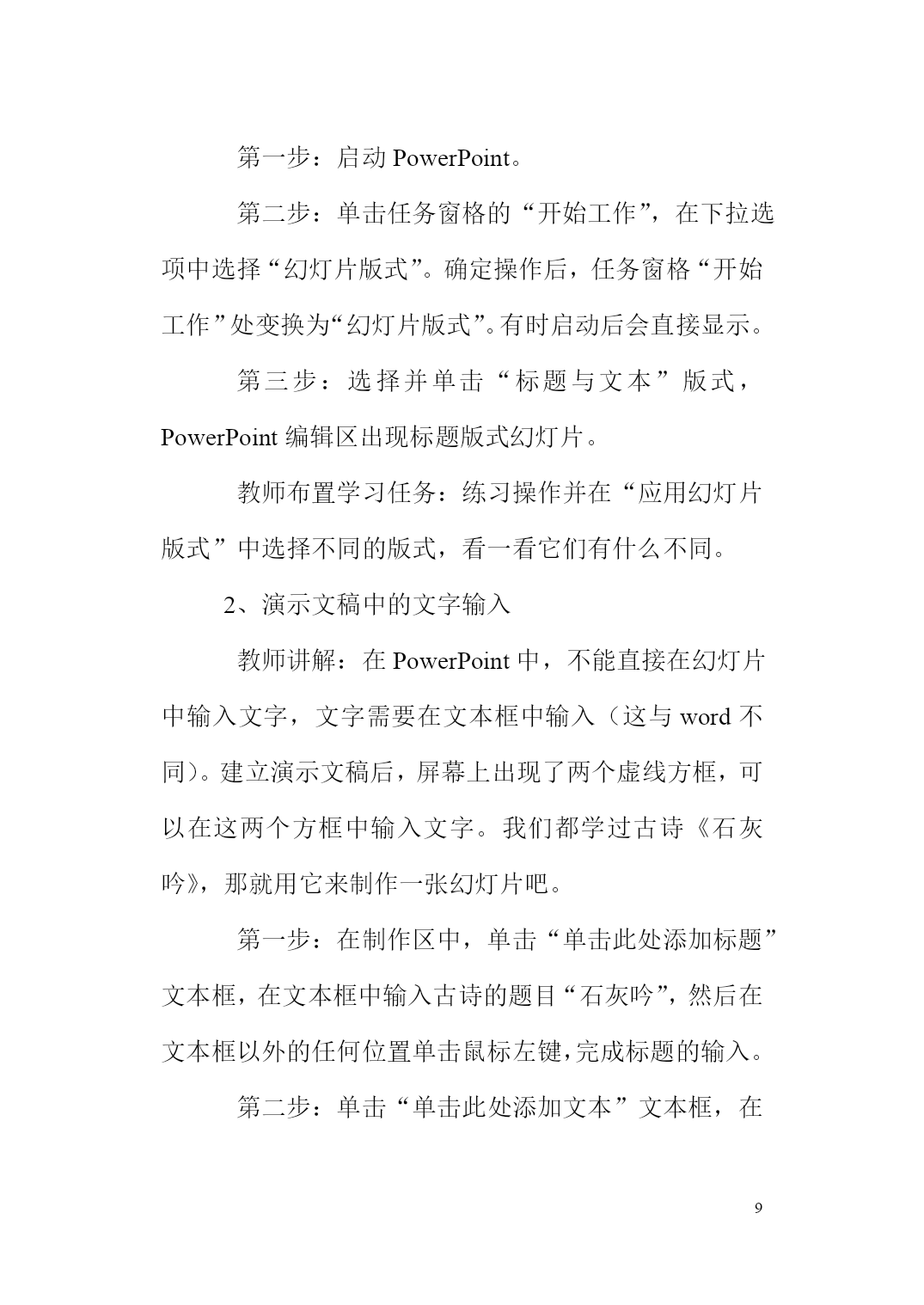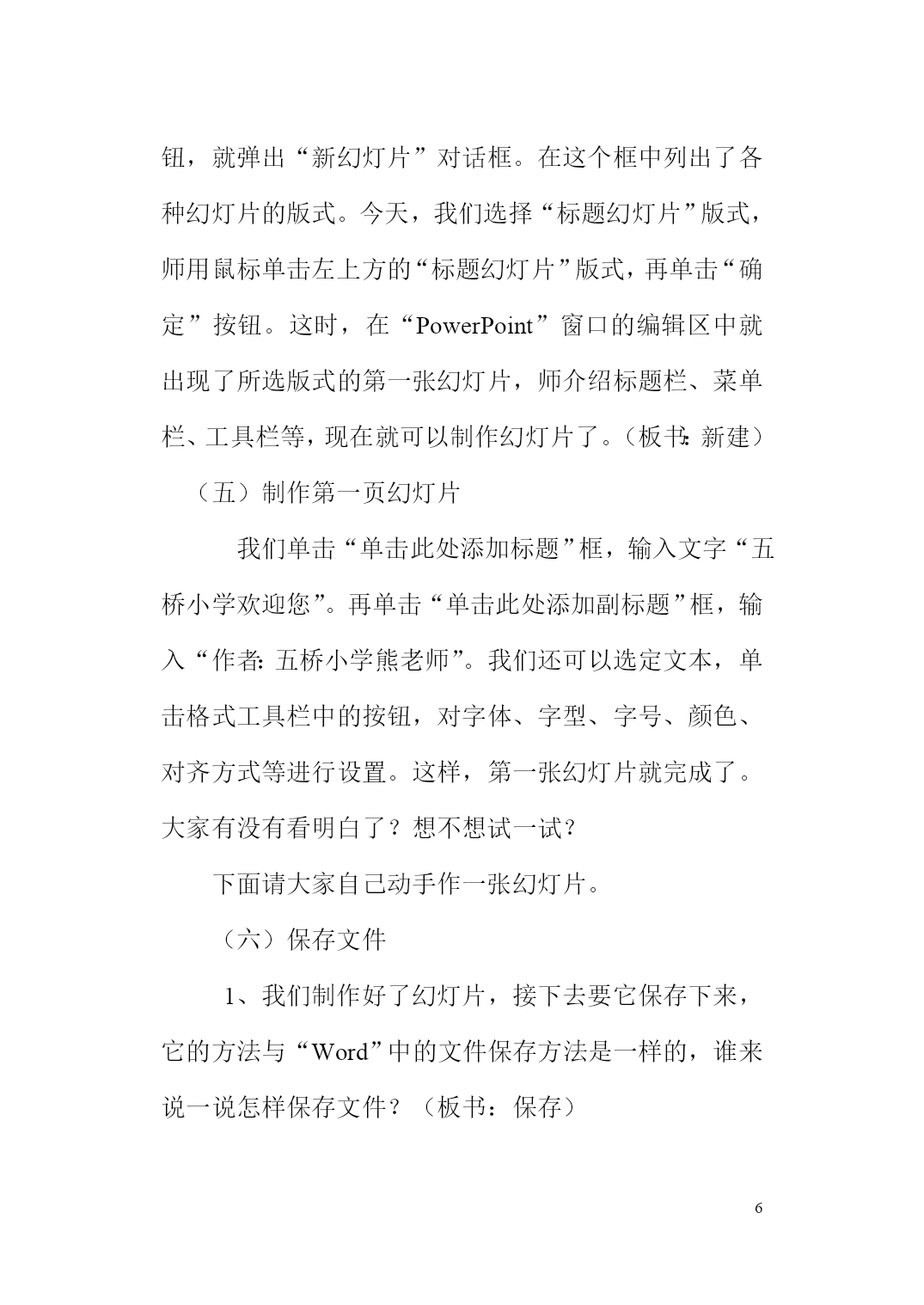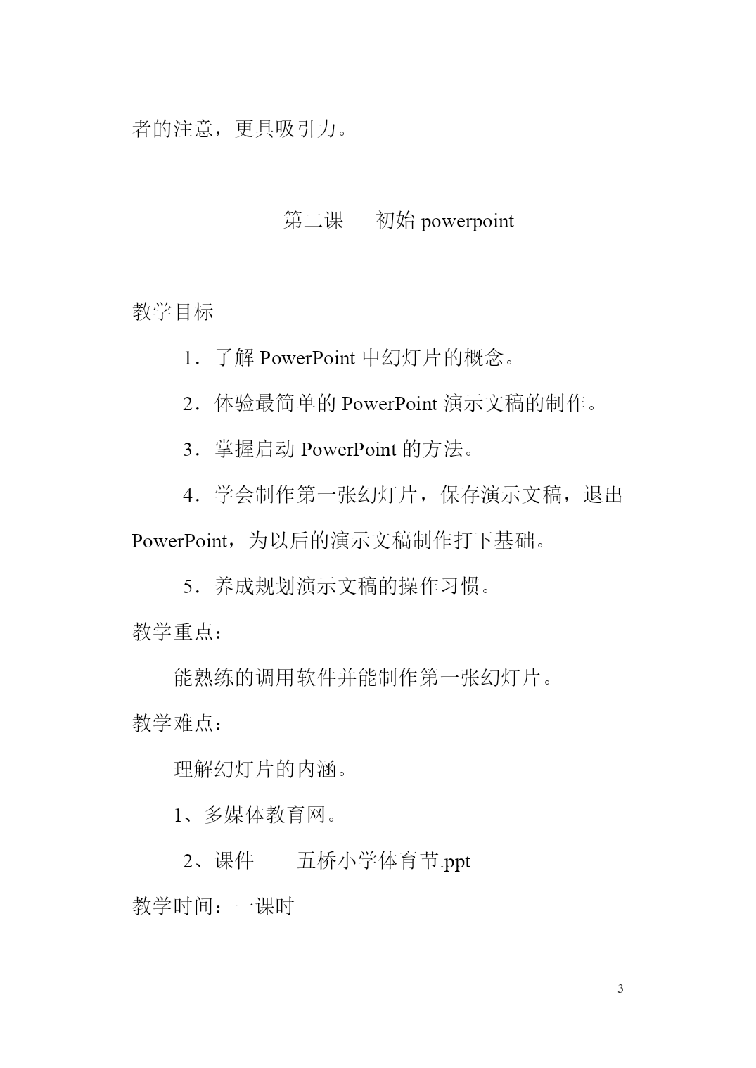 PAGEPAGE42第一课走进多媒体世界教学目标:1、了解媒体、多媒体及多媒体作品的概念。2、知道多媒体的表现形式。教学重点:了解媒体、多媒体及多媒体的概念。教学难点:知道多媒体的表现形式。教学方法:讲解法演示法教学过程:一、导入同学们,我们今天来学习第一课走进多媒体世界,那么我们要先了解什么是多媒体,下面我就来了解什么事媒体,什么是多媒体。二、新授1、媒体的概念信息的传递需要载体,我们通常所见的文字、声音、图形、动画、影像等这些表示和传播信息的载体都叫媒体。2、多媒体及多媒体技术的应用利用计算机综合处理多种媒体的技术就叫做多媒体技术。随着社会的进步及计算机的普及,社会对多没有的需求越来越大,多媒体技术已逐渐渗透到各个领域。多媒体技术能应用在那几个方面呢?首先是用于在公共展览馆或博物馆等场合。它能形象、直观的展示展品,人们可以通过多媒体的演示进一步了解展品。其次是用于教学领域。教师可以通过多媒体,直观形象地讲述比较难描述的课程内容,学生可以更直观形象地去理解和掌握相应的教学内容,而且学生也可以通过多媒体演示产品介绍,直观、经济、便捷的获得产品信息,效果非常好。最后是用于网上多媒体。随着互联网的普及,多媒体技术在互联网上的应用越来越普及,一个有声音、动态的页面比静态的只有文字和图片的页面更能引起浏览者的注意,更具吸引力。第二课初始powerpoint教学目标1.了解PowerPoint中幻灯片的概念。2.体验最简单的PowerPoint演示文稿的制作。3.掌握启动PowerPoint的方法。4.学会制作第一张幻灯片,保存演示文稿,退出PowerPoint,为以后的演示文稿制作打下基础。5.养成规划演示文稿的操作习惯。教学重点:能熟练的调用软件并能制作第一张幻灯片。教学难点:理解幻灯片的内涵。1、多媒体教育网。2、课件——五桥小学体育节.ppt教学时间:一课时教学过程一、激趣导入同学们,你们知道我校的体育特色吗?是踢跳。每年的三、四月间,我校都要举办“体育节”,大家参加比赛的照片,老师把它们放在了电脑中,下面,我们一起来欣赏一下同学们的风采。你们看到的画面有什么特点?(包含有文字、声音、图片、动画、视频等信息媒体)。其实这并不是简单的图片,这叫演示文稿,也就是常说的“PowerPoint”软件制作出来的,它的中文名字叫“电子幻灯片”。那么你们想不想知道怎么制作出这样的幻灯片呢?今天这堂课,我们就来学习这一内容。齐读课题:8、初识PowerPoint二、教学新课(一)认识PowerPoint首先,我们来认识下,什么是“PowerPoint”。PowerPoint是用于设计制作专家报告、教师讲课、产品演示、广告宣传的电子版幻灯片,制作的演示文稿可以通过计算机屏幕或投影机播放,就像刚才那几张幻灯片那样。它的功能特别强大,应用很广泛。齐读35页的内容。(二)制作演示文稿前的准备。(板书:准备)需要做哪些准备,自学书第1个内容,思考第1步做什么?思考第2步做什么?思考第3步做什么?步骤:拟出提纲→收集素材→规划设计(三)启动PowerPointPowerPoint和我们前面所学的Word都属于office办公软件之一,它们在操作上有许多相似之处,同学们能不能用启动Word的方法找到它?师根据学生的回答,演示给学生看,并口述步骤:开始→程序→PowerPoint。(板书:启动)请学生说出它的各部分名称,如标题栏、菜单栏、工具栏等。(四)新建第一页幻灯片师说明:这时,屏幕上显示的是“PowerPoint”的对话框,我们一般选择空演示文稿,再单击“确定”按钮,就弹出“新幻灯片”对话框。在这个框中列出了各种幻灯片的版式。今天,我们选择“标题幻灯片”版式,师用鼠标单击左上方的“标题幻灯片”版式,再单击“确定”按钮。这时,在“PowerPoint”窗口的编辑区中就出现了所选版式的第一张幻灯片,师介绍标题栏、菜单栏、工具栏等,现在就可以制作幻灯片了。(板书:新建)(五)制作第一页幻灯片我们单击“单击此处添加标题”框,输入文字“五桥小学欢迎您”。再单击“单击此处添加副标题”框,输入“作者:五桥小学熊老师”。我们还可以选定文本,单击格式工具栏中的按钮,对字体、字型、字号、颜色、对齐方式等进行设置。这样,第一张幻灯片就完成了。大家有没有看明白了?想不想试一试?下面请大家自己动手作一张幻灯片。(六)保存文件1、我们制作好了幻灯片,接下去要它保存下来,它的方法与“Word”中的文件保存方法是一样的,谁来说一说怎样保存文件?(板书:保存)2、用“五桥小学体育节”为文件名保存。三、学生分组练习,教师指导下面,大家按照老师的样