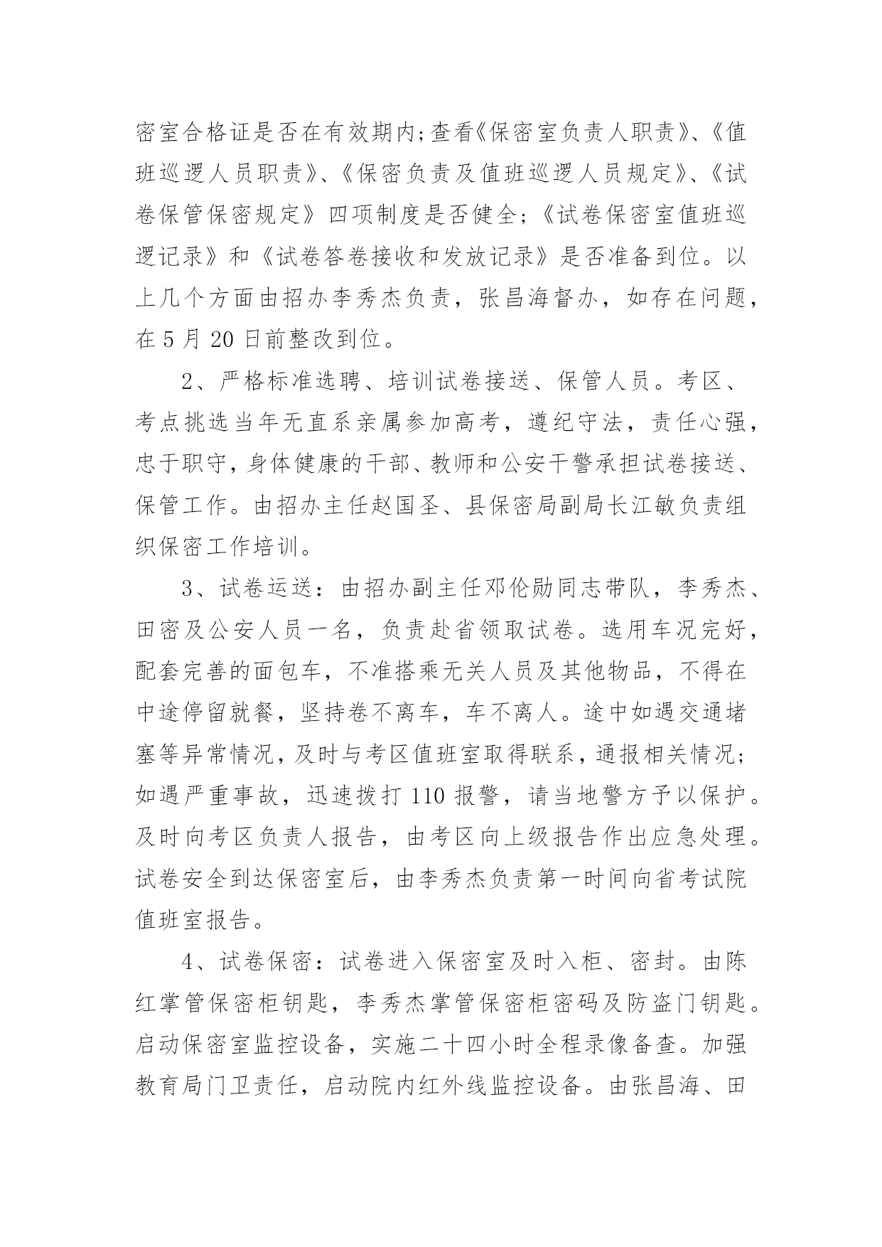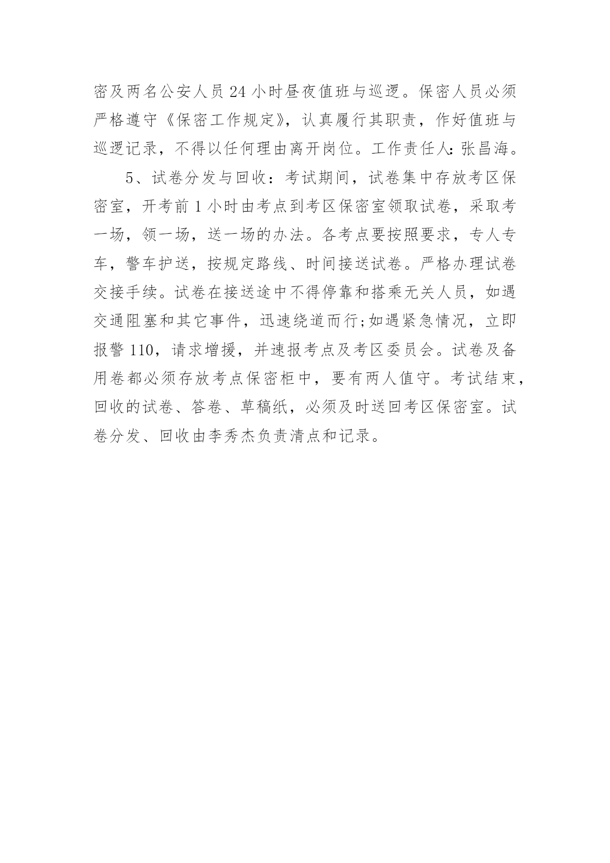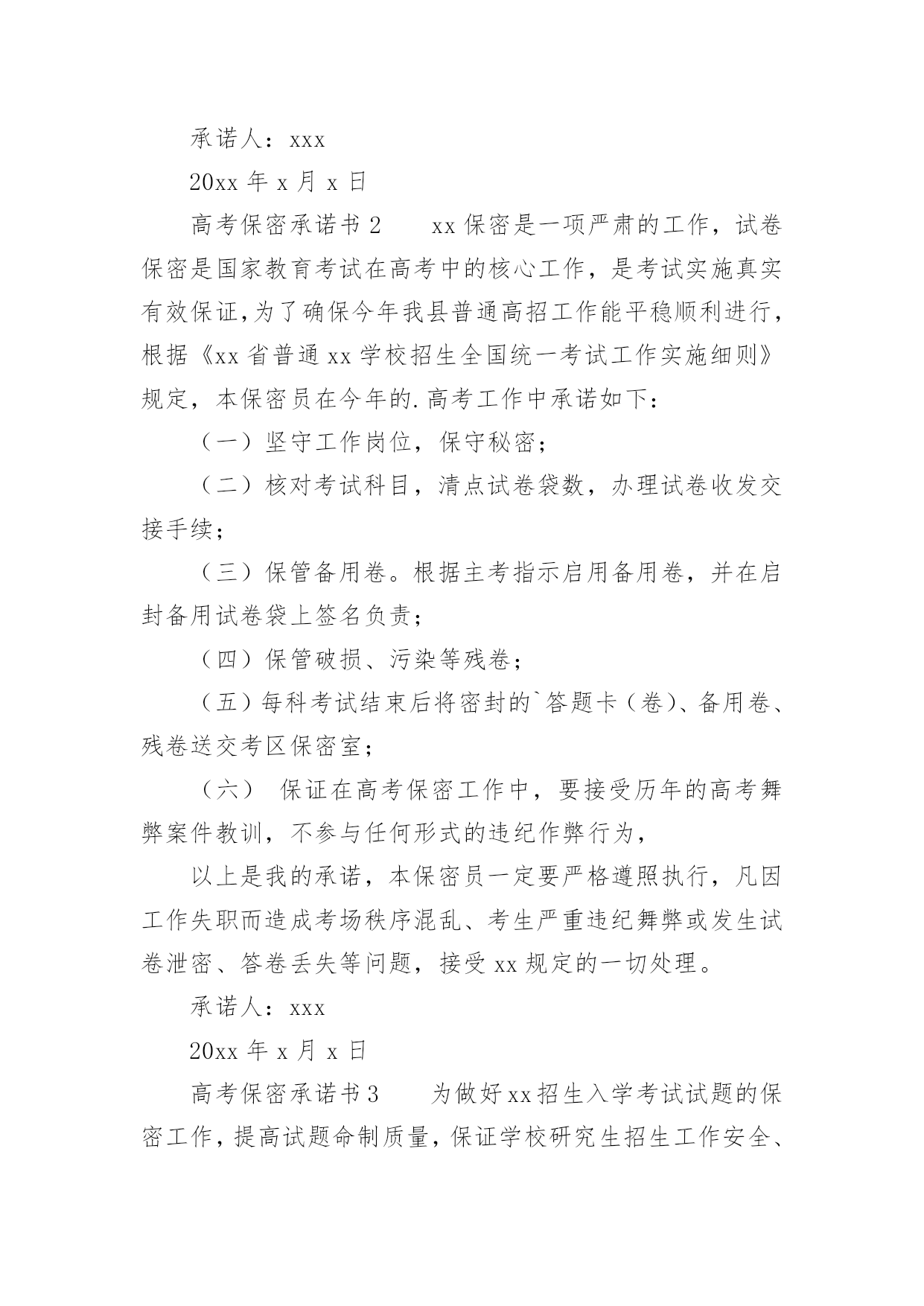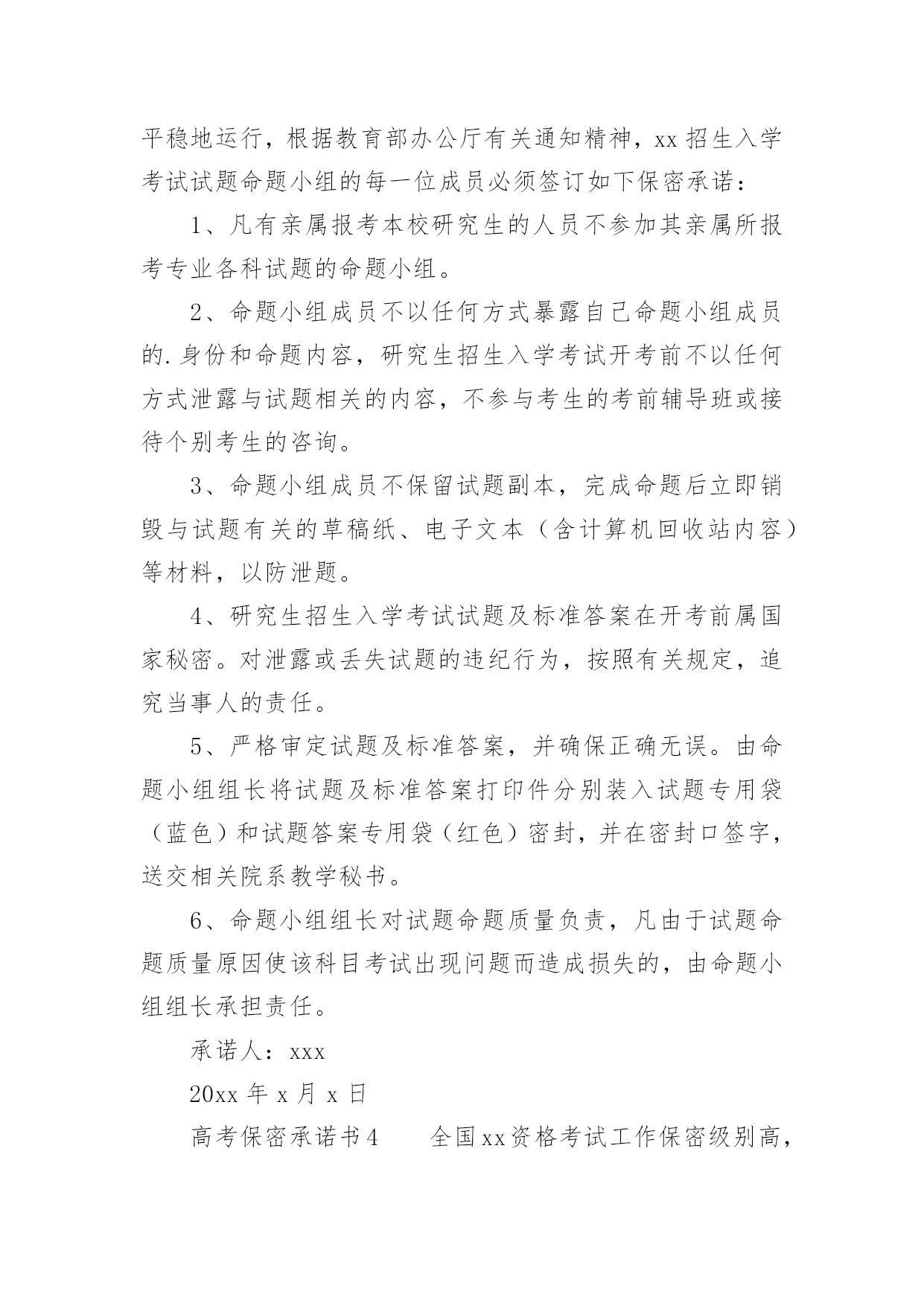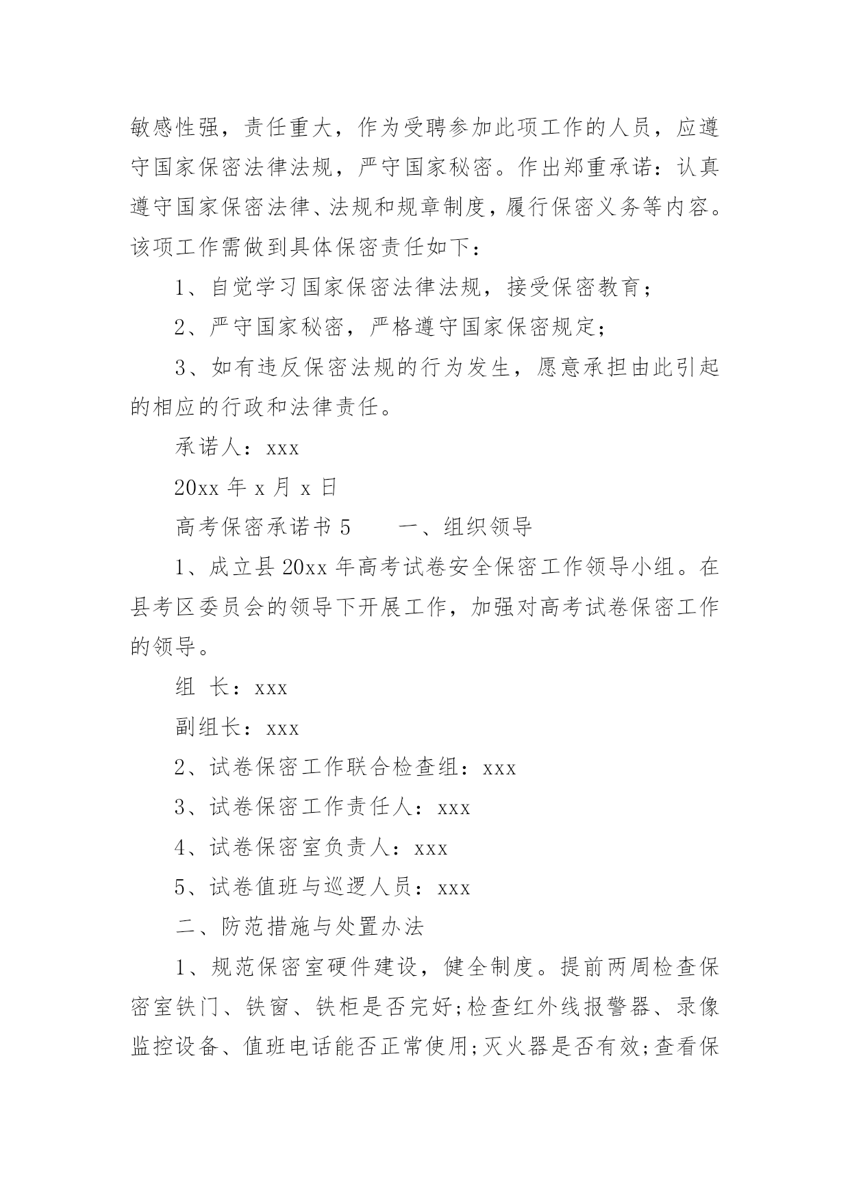 高考保密承诺书一、什么是承诺书“承诺书是承诺人对要约人的要约完全同意的意思,表示以书面形式。通常是要求以书面订立的合同,其承诺也必须采取书面形式。如《美国统一商法典》第二篇第2-201条规定,凡价金超过5000美元的货物买卖合同,除该法典另有规定外,均须以书面方式作成,否则不能要求法院强制执行,法院在诉讼中对这种合同原则上不接受口头证据。”二、高考保密承诺书(精选5篇)在日常生活和工作中,承诺书与我们的生活息息相关,承诺书是否产生法律约束力,要具体问题具体分析。你写承诺书时总是没有文字可写?下面是小编帮大家整理的高考保密承诺书(精选5篇),仅供参考,希望能够帮助到大家。高考保密承诺书1本人参加20xx年xx月x课程期末/重修/补考考核命题工作,在命题工作期间直至考核结束(20xx年x月x日至20xx年x月x日),将本着对国家负责,对学校负责,对学生负责的态度,严格遵守国家、学校有关保密法规和纪律,并作以下承诺:1、不参加任何有关该课程考核的补习、辅导活动。2、不向任何人透露试题的内容和命题工作情况。3、不向任何人透露命题人员姓名。4、若有任何形式的泄密行为,愿意接受组织上的纪律处分直至追究法律责任。承诺人:xxx20xx年x月x日高考保密承诺书2xx保密是一项严肃的工作,试卷保密是国家教育考试在高考中的核心工作,是考试实施真实有效保证,为了确保今年我县普通高招工作能平稳顺利进行,根据《xx省普通xx学校招生全国统一考试工作实施细则》规定,本保密员在今年的.高考工作中承诺如下:(一)坚守工作岗位,保守秘密;(二)核对考试科目,清点试卷袋数,办理试卷收发交接手续;(三)保管备用卷。根据主考指示启用备用卷,并在启封备用试卷袋上签名负责;(四)保管破损、污染等残卷;(五)每科考试结束后将密封的`答题卡(卷)、备用卷、残卷送交考区保密室;(六)保证在高考保密工作中,要接受历年的高考舞弊案件教训,不参与任何形式的违纪作弊行为,以上是我的承诺,本保密员一定要严格遵照执行,凡因工作失职而造成考场秩序混乱、考生严重违纪舞弊或发生试卷泄密、答卷丢失等问题,接受xx规定的一切处理。承诺人:xxx20xx年x月x日高考保密承诺书3为做好xx招生入学考试试题的保密工作,提高试题命制质量,保证学校研究生招生工作安全、平稳地运行,根据教育部办公厅有关通知精神,xx招生入学考试试题命题小组的每一位成员必须签订如下保密承诺:1、凡有亲属报考本校研究生的人员不参加其亲属所报考专业各科试题的命题小组。2、命题小组成员不以任何方式暴露自己命题小组成员的.身份和命题内容,研究生招生入学考试开考前不以任何方式泄露与试题相关的内容,不参与考生的考前辅导班或接待个别考生的咨询。3、命题小组成员不保留试题副本,完成命题后立即销毁与试题有关的草稿纸、电子文本(含计算机回收站内容)等材料,以防泄题。4、研究生招生入学考试试题及标准答案在开考前属国家秘密。对泄露或丢失试题的违纪行为,按照有关规定,追究当事人的责任。5、严格审定试题及标准答案,并确保正确无误。由命题小组组长将试题及标准答案打印件分别装入试题专用袋(蓝色)和试题答案专用袋(红色)密封,并在密封口签字,送交相关院系教学秘书。6、命题小组组长对试题命题质量负责,凡由于试题命题质量原因使该科目考试出现问题而造成损失的,由命题小组组长承担责任。承诺人:xxx20xx年x月x日高考保密承诺书4全国xx资格考试工作保密级别高,敏感性强,责任重大,作为受聘参加此项工作的人员,应遵守国家保密法律法规,严守国家秘密。作出郑重承诺:认真遵守国家保密法律、法规和规章制度,履行保密义务等内容。该项工作需做到具体保密责任如下:1、自觉学习国家保密法律法规,接受保密教育;2、严守国家秘密,严格遵守国家保密规定;3、如有违反保密法规的行为发生,愿意承担由此引起的相应的行政和法律责任。承诺人:xxx20xx年x月x日高考保密承诺书5一、组织领导1、成立县20xx年高考试卷安全保密工作领导小组。在县考区委员会的领导下开展工作,加强对高考试卷保密工作的领导。组长:xxx副组长:xxx2、试卷保密工作联合检查组:xxx3、试卷保密工作责任人:xxx4、试卷保密室负责人:xxx5、试卷值班与巡逻人员:xxx二、防范措施与处置办法1、规范保密室硬件建设,健全制度。提前两周检查保密室铁门、铁窗、铁柜是否完好;检查红外线报警器、录像监控设备、值班电话能否正常使用;灭火器是否有效;查看保密室合格证是否在有效期内;查看《保密室负责人职责》、《值班巡逻人员职责》、《保密负责及值班巡逻人员规定》、《试卷保管保密规定》四项制度是否健全;《试卷保密室值班巡逻记录》和《试卷答卷接收和发放记录》是否准备到位。以上几个方面由招办李秀杰负责,张昌海督办,如存在问题,在5月20日前