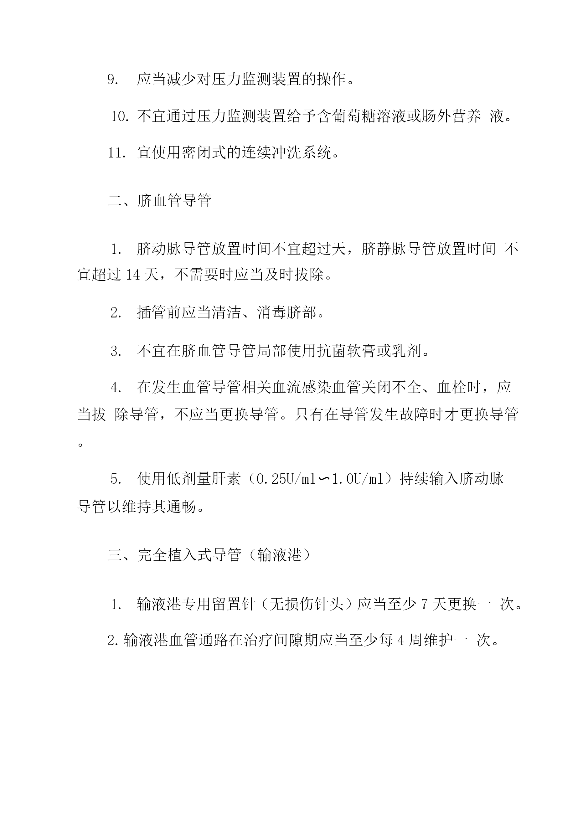 附件各类血管导管相关感染的特别预防措施一、中心静脉导管必1如及肺动脉导管不应当常规更换中心静脉导管PICC或肺动脉导管以预防血管导管相关感染。非隧道式导管无明显感染证据时,可以通过导丝引导更换。非隧道式导管可疑感染时,不应当通过导丝更换导管。中心静脉导管或DICC患者出现血管导管相关血流感染证据,应当根据临床综合评估结果决定是否拔管。外周动脉导管及压力监测装置成人宜选择桡动脉肱动脉、足背动脉。儿童宜选择桡动脉、足背部动脉及胫骨后动脉。压力传感器使用时间应当遵循产品说明书或4天更换一次。宜使用入处为隔膜的压力监测装置在使用前应用消毒剂擦拭消毒隔膜。应当保持使用中压力监测装置无菌包括校准装置和冲洗装置无菌。应当减少对压力监测装置的操作。不宜通过压力监测装置给予含葡萄糖溶液或肠外营养液。宜使用密闭式的连续冲洗系统。二、脐血管导管脐动脉导管放置时间不宜超过天,脐静脉导管放置时间不宜超过14天,不需要时应当及时拔除。插管前应当清洁、消毒脐部。不宜在脐血管导管局部使用抗菌软膏或乳剂。在发生血管导管相关血流感染血管关闭不全、血栓时,应当拔除导管,不应当更换导管。只有在导管发生故障时才更换导管。使用低剂量肝素(0.25U/ml〜1.0U/ml)持续输入脐动脉导管以维持其通畅。三、完全植入式导管(输液港)输液港专用留置针(无损伤针头)应当至少7天更换一次。输液港血管通路在治疗间隙期应当至少每4周维护一次。四、血液透析导管宜首选颈内静脉置管。维持性血液透析患者宜采用动静脉内痿。