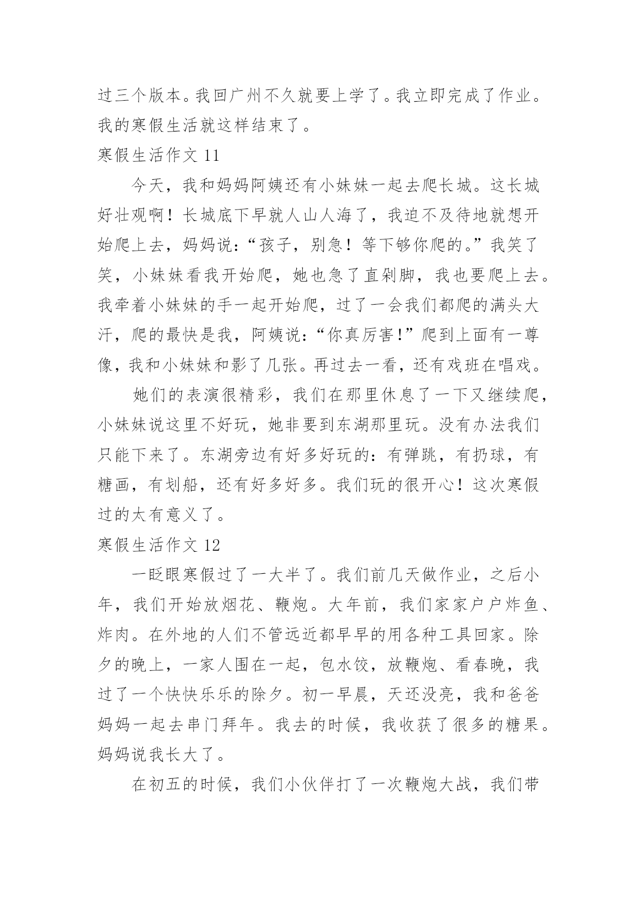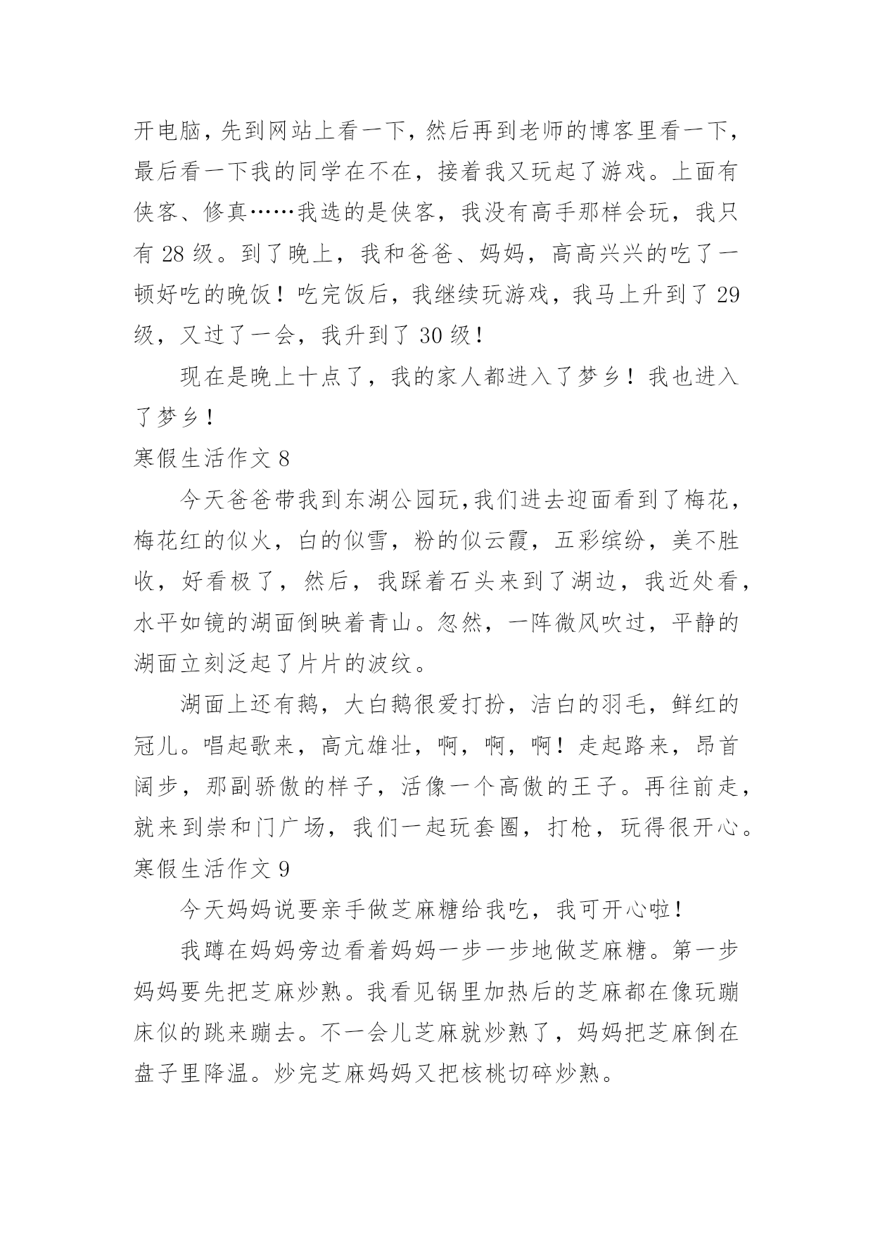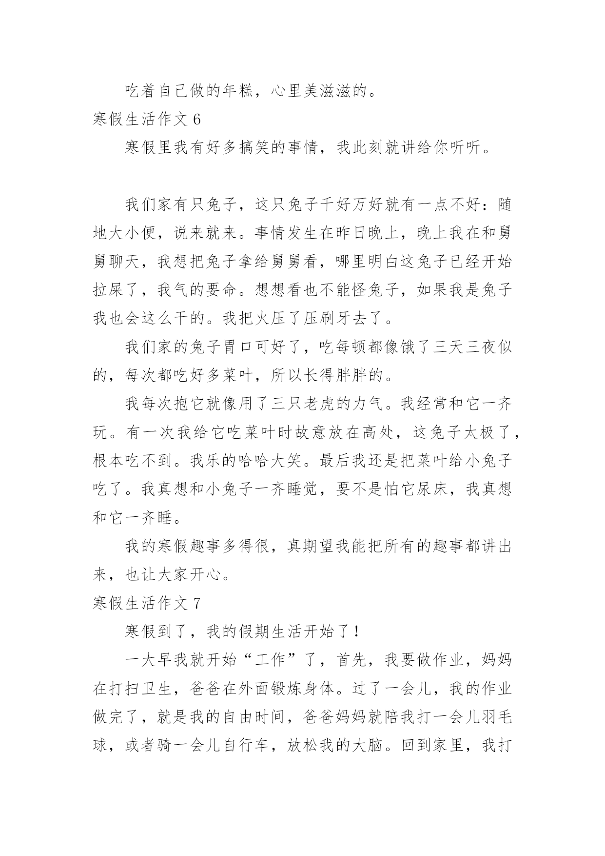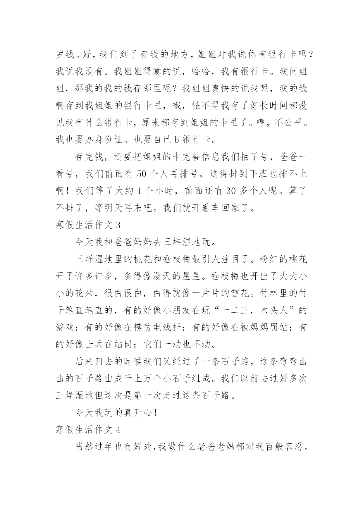 寒假生活作文【推荐】寒假生活作文在学习、工作或生活中,大家都跟作文打过交道吧,通过作文可以把我们那些零零散散的思想,聚集在一块。那要怎么写好作文呢?下面是小编精心整理的寒假生活作文,欢迎大家借鉴与参考,希望对大家有所帮助。寒假生活作文1我的寒假是在快乐中度过的。每当到了春节,我就会挣到很多压岁钱。有一次,我去找我同学的路上看到一个残疾人趴在路上一步一步艰难的向前挪着,我想起了自己的压岁钱,于是我从口袋里掏出了自己准备买芭比娃娃的压岁钱给了他。周围的人们顿时把赞许的目光投给了我,当时别提心里有多美了。转眼间到了元宵节,真热闹啊,好多的表演节目让人目不暇接呢!电视上我看了刘谦的变魔术,感到很好奇便问爸爸妈妈。可他们都不知道,后来看到电脑上的魔术揭秘原来是这么回事啊!晚上全家人一起吃元宵后我给家人表演了“偷”来的魔术节目,乐的大家哈哈大笑。现在虽然我已经上学了,但是寒假中留给我的美好记忆一直在我脑海里浮现,让我拥有着无穷的快乐。寒假生活作文2今天下午爸爸突然对我说,你的压岁钱呢?咱们去存压岁钱。好,我们到了存钱的地方,姐姐对我说你有银行卡吗?我说我没有。我姐姐得意的说,哈哈,我有银行卡。我问姐姐,那我的我的钱存哪里呢?我姐姐爽快的说我呢,我的钱啊存到我姐姐的银行卡里,哦,怪不得我存了好长时间都没见我有什么银行卡,原来都存到姐姐的卡里了。哼,不公平。我也要办身份证。也要自己b银行卡。存完钱,还要把姐姐的卡完善信息我们抽了号,爸爸一看号,我们前面有50个人再排号,这得排到下班也排不上啊!我们等了大约1个小时,前面还有30多个人呢。算了不排了,等明天再来吧。我们就开着车回家了。寒假生活作文3今天我和爸爸妈妈去三垟湿地玩。三垟湿地里的桃花和垂枝梅最引人注目了。粉红的桃花开了许多许多,多得像漫天的星星。垂枝梅也开出了大大小小的花朵,很白很白,白得就像一片片的雪花。竹林里的竹子笔直笔直的,有的好像小朋友在玩“一二三,木头人”的游戏;有的好像在模仿电线杆;有的好像在被妈妈罚站;有的好像士兵在站岗;它们一动也不动。后来回去的时候我们又经过了一条石子路,这条弯弯曲曲的石子路由成千上万个小石子组成。我们以前去过好多次三垟湿地但这次是第一次走过这条石子路。今天我玩的真开心!寒假生活作文4当然过年也有好处,我做什么老爸老妈都对我百般容忍。还有压岁钱可以拿,虽然不多但我感到很满足,因为这些对于我已经足够了。好象一直都在说玩的事,说说我的学习吧,其实本人自认为我还是提挺乖的,过年前几天我一直都在专心做作业,大多数都早就完成了。当然我在读书前几天,还是拿起书本来复习,因为我知道我该收收心了,我的生活又将全部是学习,用姐姐的话说除了学习还是学习,这是无法改变的社会现实嘛。过年的日子很无聊,走完西家走东家,吃来吃去什么山珍海味都麻木了,倒是体重一路飙升,因为我还有一个坏习惯爱赖床,总要老姐气得掀我被子时才起来。想想还真是惭愧。一句话,我该“有则改之,无则加勉”。寒假生活作文5俗话说:吃年糕,年年高。自己做的年糕最好吃。这个寒假的第一个星期六,艳阳高照,我们在妈妈的带领下,兴致勃勃的来到农村螺门。到了那里,我深吸一口气,啊!空气是那么新鲜。我往前看一眼,啊!风景是那么美丽。我们走进年糕厂,只见做年糕的师傅先把泡好的大米从水中捞出,水分沥干后把大米放在剁米机上,把米剁成粉末状,接着把米蒸熟。最后把米放在年糕成型机上,白白胖胖的年糕从机器里出来了,一种六面有刀的机器把年糕切成一段一段的。年糕就做出来了。吃着自己做的年糕,心里美滋滋的。寒假生活作文6寒假里我有好多搞笑的事情,我此刻就讲给你听听。我们家有只兔子,这只兔子千好万好就有一点不好:随地大小便,说来就来。事情发生在昨日晚上,晚上我在和舅舅聊天,我想把兔子拿给舅舅看,哪里明白这兔子已经开始拉屎了,我气的要命。想想看也不能怪兔子,如果我是兔子我也会这么干的。我把火压了压刷牙去了。我们家的兔子胃口可好了,吃每顿都像饿了三天三夜似的,每次都吃好多菜叶,所以长得胖胖的。我每次抱它就像用了三只老虎的力气。我经常和它一齐玩。有一次我给它吃菜叶时故意放在高处,这兔子太极了,根本吃不到。我乐的哈哈大笑。最后我还是把菜叶给小兔子吃了。我真想和小兔子一齐睡觉,要不是怕它尿床,我真想和它一齐睡。我的寒假趣事多得很,真期望我能把所有的趣事都讲出来,也让大家开心。寒假生活作文7寒假到了,我的假期生活开始了!一大早我就开始“工作”了,首先,我要做作业,妈妈在打扫卫生,爸爸在外面锻炼身体。过了一会儿,我的作业做完了,就是我的自由时间,爸爸妈妈就陪我打一会儿羽毛球,或者骑一会儿自行车,放松我的大脑。回到家里,我打开电脑,先到网站上看一下,然后再到老师的博客里看一下,最后看一下我的同学在不在,接着我又玩起了游戏。上面有侠客、修真……我选的是侠客,我