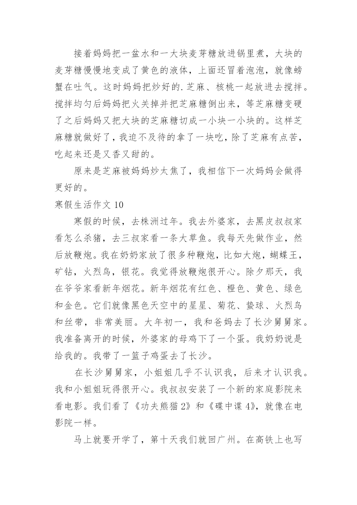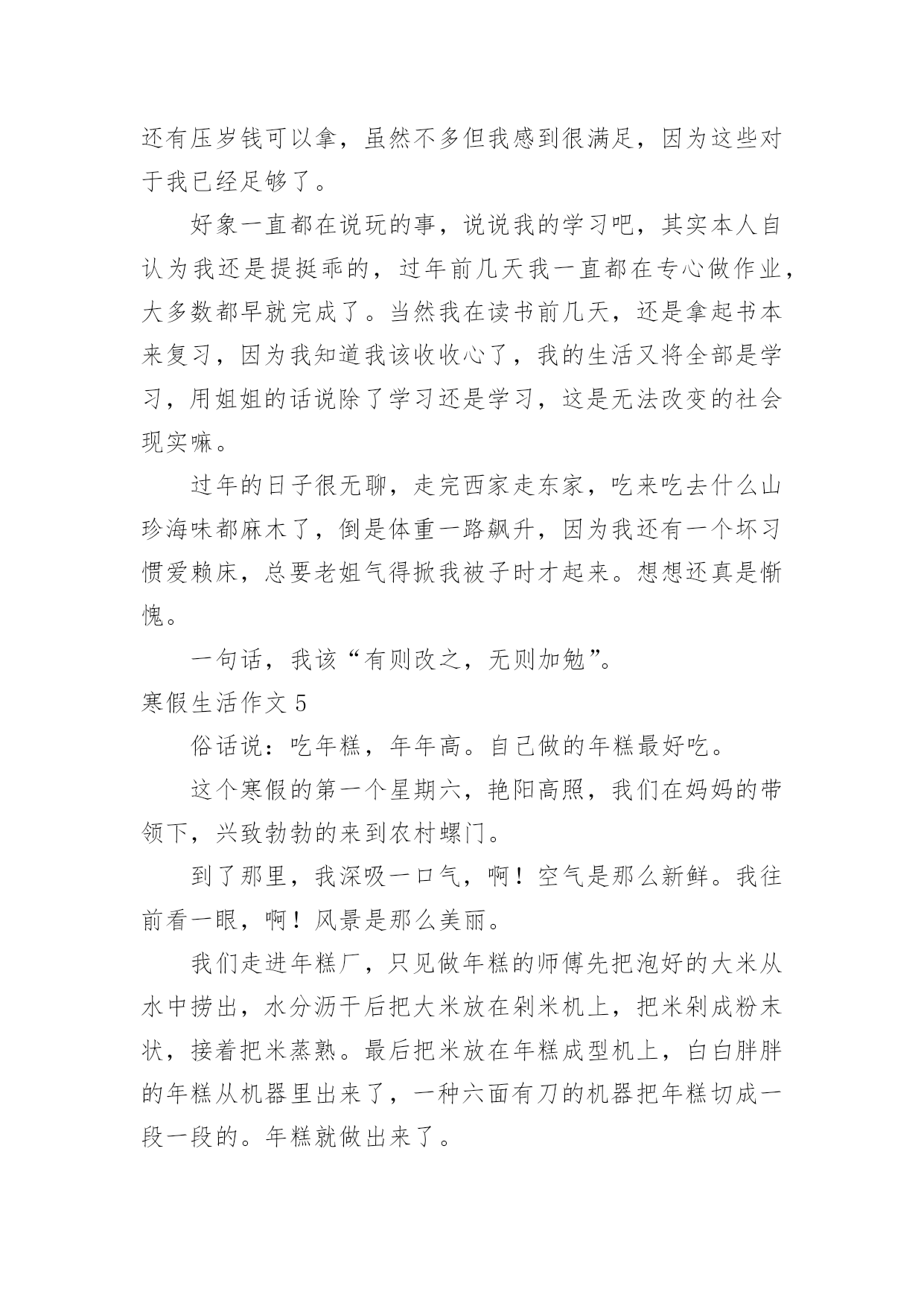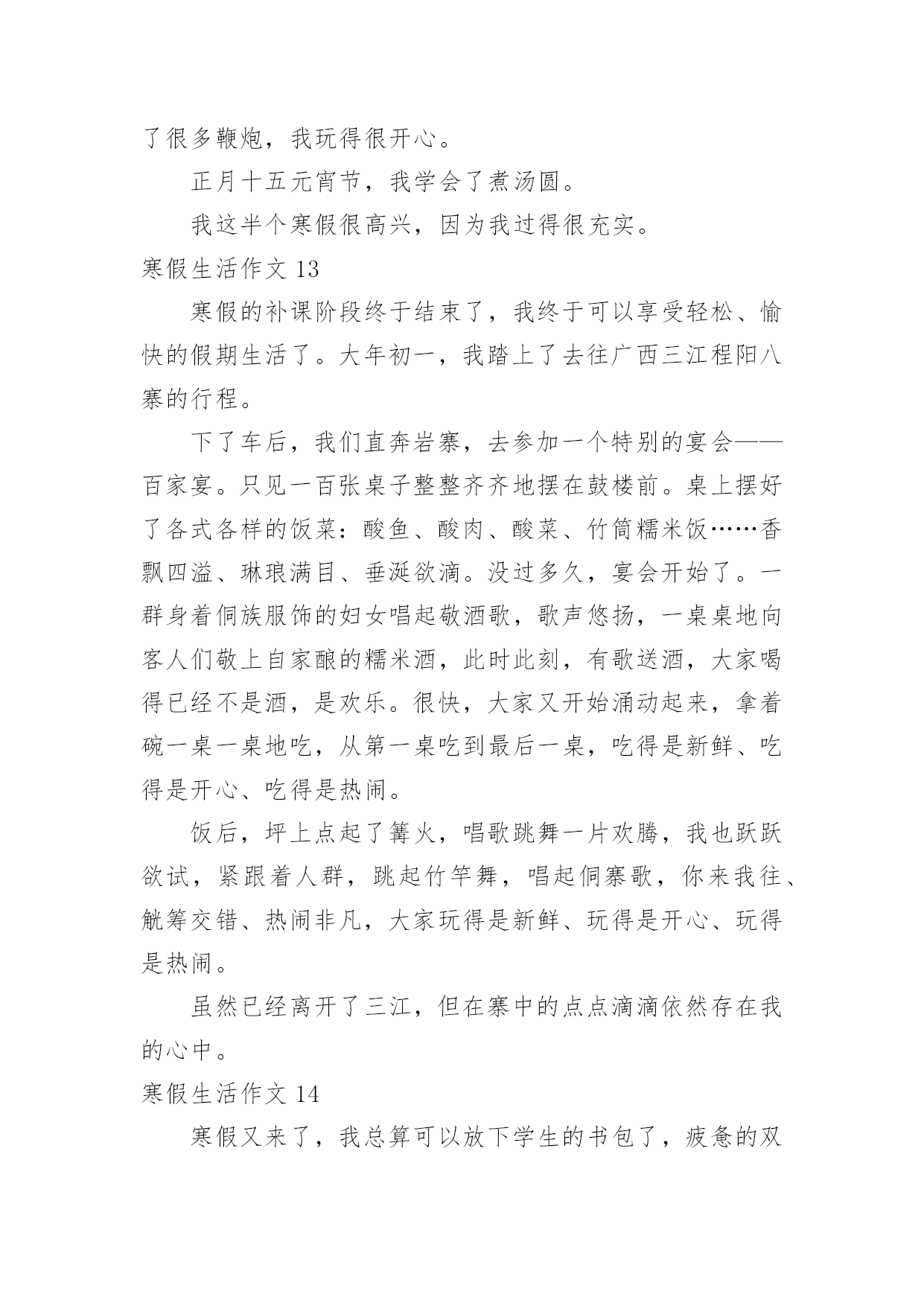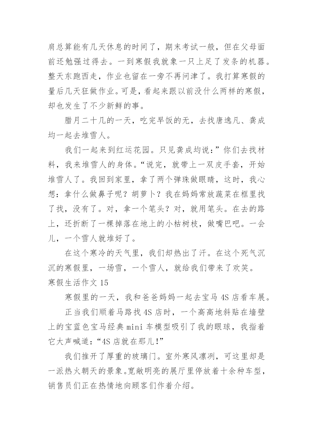 寒假生活作文【推荐】寒假生活作文在学习、工作或生活中,大家都跟作文打过交道吧,通过作文可以把我们那些零零散散的思想,聚集在一块。那要怎么写好作文呢?下面是小编精心整理的寒假生活作文,欢迎大家借鉴与参考,希望对大家有所帮助。寒假生活作文1我的寒假是在快乐中度过的。每当到了春节,我就会挣到很多压岁钱。有一次,我去找我同学的路上看到一个残疾人趴在路上一步一步艰难的向前挪着,我想起了自己的压岁钱,于是我从口袋里掏出了自己准备买芭比娃娃的压岁钱给了他。周围的人们顿时把赞许的目光投给了我,当时别提心里有多美了。转眼间到了元宵节,真热闹啊,好多的表演节目让人目不暇接呢!电视上我看了刘谦的变魔术,感到很好奇便问爸爸妈妈。可他们都不知道,后来看到电脑上的魔术揭秘原来是这么回事啊!晚上全家人一起吃元宵后我给家人表演了“偷”来的魔术节目,乐的大家哈哈大笑。现在虽然我已经上学了,但是寒假中留给我的美好记忆一直在我脑海里浮现,让我拥有着无穷的快乐。寒假生活作文2今天下午爸爸突然对我说,你的压岁钱呢?咱们去存压岁钱。好,我们到了存钱的地方,姐姐对我说你有银行卡吗?我说我没有。我姐姐得意的说,哈哈,我有银行卡。我问姐姐,那我的我的钱存哪里呢?我姐姐爽快的说我呢,我的钱啊存到我姐姐的银行卡里,哦,怪不得我存了好长时间都没见我有什么银行卡,原来都存到姐姐的卡里了。哼,不公平。我也要办身份证。也要自己b银行卡。存完钱,还要把姐姐的卡完善信息我们抽了号,爸爸一看号,我们前面有50个人再排号,这得排到下班也排不上啊!我们等了大约1个小时,前面还有30多个人呢。算了不排了,等明天再来吧。我们就开着车回家了。寒假生活作文3今天我和爸爸妈妈去三垟湿地玩。三垟湿地里的桃花和垂枝梅最引人注目了。粉红的桃花开了许多许多,多得像漫天的星星。垂枝梅也开出了大大小小的花朵,很白很白,白得就像一片片的雪花。竹林里的竹子笔直笔直的,有的好像小朋友在玩“一二三,木头人”的游戏;有的好像在模仿电线杆;有的好像在被妈妈罚站;有的好像士兵在站岗;它们一动也不动。后来回去的时候我们又经过了一条石子路,这条弯弯曲曲的石子路由成千上万个小石子组成。我们以前去过好多次三垟湿地但这次是第一次走过这条石子路。今天我玩的真开心!寒假生活作文4当然过年也有好处,我做什么老爸老妈都对我百般容忍。还有压岁钱可以拿,虽然不多但我感到很满足,因为这些对于我已经足够了。好象一直都在说玩的事,说说我的学习吧,其实本人自认为我还是提挺乖的,过年前几天我一直都在专心做作业,大多数都早就完成了。当然我在读书前几天,还是拿起书本来复习,因为我知道我该收收心了,我的生活又将全部是学习,用姐姐的话说除了学习还是学习,这是无法改变的社会现实嘛。过年的日子很无聊,走完西家走东家,吃来吃去什么山珍海味都麻木了,倒是体重一路飙升,因为我还有一个坏习惯爱赖床,总要老姐气得掀我被子时才起来。想想还真是惭愧。一句话,我该“有则改之,无则加勉”。寒假生活作文5俗话说:吃年糕,年年高。自己做的年糕最好吃。这个寒假的第一个星期六,艳阳高照,我们在妈妈的带领下,兴致勃勃的来到农村螺门。到了那里,我深吸一口气,啊!空气是那么新鲜。我往前看一眼,啊!风景是那么美丽。我们走进年糕厂,只见做年糕的师傅先把泡好的大米从水中捞出,水分沥干后把大米放在剁米机上,把米剁成粉末状,接着把米蒸熟。最后把米放在年糕成型机上,白白胖胖的年糕从机器里出来了,一种六面有刀的机器把年糕切成一段一段的。年糕就做出来了。吃着自己做的年糕,心里美滋滋的。寒假生活作文6寒假里我有好多搞笑的事情,我此刻就讲给你听听。我们家有只兔子,这只兔子千好万好就有一点不好:随地大小便,说来就来。事情发生在昨日晚上,晚上我在和舅舅聊天,我想把兔子拿给舅舅看,哪里明白这兔子已经开始拉屎了,我气的要命。想想看也不能怪兔子,如果我是兔子我也会这么干的。我把火压了压刷牙去了。我们家的兔子胃口可好了,吃每顿都像饿了三天三夜似的,每次都吃好多菜叶,所以长得胖胖的。我每次抱它就像用了三只老虎的力气。我经常和它一齐玩。有一次我给它吃菜叶时故意放在高处,这兔子太极了,根本吃不到。我乐的哈哈大笑。最后我还是把菜叶给小兔子吃了。我真想和小兔子一齐睡觉,要不是怕它尿床,我真想和它一齐睡。我的寒假趣事多得很,真期望我能把所有的趣事都讲出来,也让大家开心。寒假生活作文7寒假到了,我的假期生活开始了!一大早我就开始“工作”了,首先,我要做作业,妈妈在打扫卫生,爸爸在外面锻炼身体。过了一会儿,我的作业做完了,就是我的自由时间,爸爸妈妈就陪我打一会儿羽毛球,或者骑一会儿自行车,放松我的大脑。回到家里,我打开电脑,先到网站上看一下,然后再到老师的博客里看一下,最后看一下我的同学在不在,接着我又玩起了游戏。上面有侠客、修真……我选的是侠客,我
