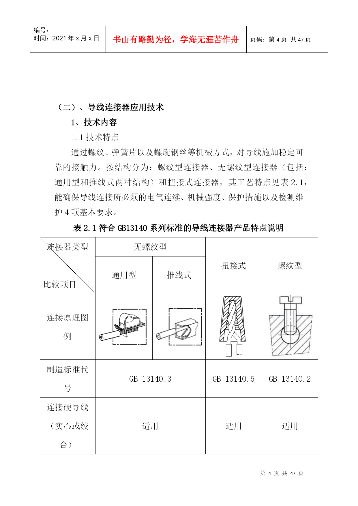 编号:时间:2021年x月x日书山有路勤为径,学海无涯苦作舟页码:第PAGE47页共NUMPAGES47页第PAGE\*MERGEFORMAT47页共NUMPAGES\*MERGEFORMAT47页机电安装工程技术(一)、基于BIM的管线综合技术1、技术内容1.1技术特点随着BIM技术的普及,其在机电管线综合技术应用方面的优势比较突出。丰富的模型信息库、与多种软件方便的数据交换接口,成熟、便捷的的可视化应用软件等,比传统的管线综合技术有了较大的提升。1.2深化设计及设计优化机电工程施工中,许多工程的设计图纸由于诸多原因,设计深度往往满足不了施工的需要,施工前尚需进行深化设计。机电系统各种管线错综复杂,管路走向密集交错,若在施工中发生碰撞情况,则会出现拆除返工现象,甚至会导致设计方案的重新修改,不仅浪费材料、延误工期,还会增加项目成本。基于BIM技术的管线综合技术可将建筑、结构、机电等专业模型整合,可很方便的进行深化设计,再根据建筑专业要求及净高要求将综合模型导入相关软件进行机电专业和建筑、结构专业的碰撞检查,根据碰撞报告结果对管线进行调整、避让建筑结构。机电本专业的碰撞检测,是在根据“机电管线排布方案”建模的基础上对设备和管线进行综合布置并调整,从而在工程开始施工前发现问题,通过深化设计及设计优化,使问题在施工前得以解决。1.3多专业施工工序协调暖通、给排水、消防、强弱电等各专业由于受施工现场、专业协调、技术差异等因素的影响,不可避免地存在很多局部的、隐性的专业交叉问题,各专业在建筑某些平面、立面位置上产生交叉、重叠,无法按施工图作业或施工顺序倒置,造成返工,这些问题有些是无法通过经验判断来及时发现并解决的。通过BIM技术的可视化、参数化、智能化特性,进行多专业碰撞检查、净高控制检查和精确预留预埋,或者利用基于BIM技术的4D施工管理,对施工工序过程进行模拟,对各专业进行事先协调,可以很容易的发现和解决碰撞点,减少因不同专业沟通不畅而产生技术错误,大大减少返工,节约施工成本。1.4施工模拟利用BIM施工模拟技术,使得复杂的机电施工过程,变得简单、可视、易懂。BIM4D虚拟建造形象直观、动态模拟施工阶段过程和重要环节施工工艺,将多种施工及工艺方案的可实施性进行比较,为最终方案优选决策提供支持。采用动态跟踪可视化施工组织设计(4D虚拟建造)的实施情况,对于设备、材料到货情况进行预警,同时通过进度管理,将现场实际进度完成情况反馈回“BIM信息模型管理系统”中,与计划进行对比、分析及纠偏,实现施工进度控制管理。形象直观、动态模拟施工阶段过程和重要环节施工工艺,将多种施工及工艺方案的可实施性进行比较,为最终方案优选决策提供支持。基于BIM技术对施工进度可实现精确计划、跟踪和控制,动态地分配各种施工资源和场地,实时跟踪工程项目的实际进度,并通过计划进度与实际进度进行比较,及时分析偏差对工期的影响程度以及产生的原因,采取有效措施,实现对项目进度的控制。1.5BIM综合管线的实施流程设计交底及图纸会审→了解合同技术要求、征询业主意见→确定BIM深化设计内容及深度→制定BIM出图细则和出图标准、各专业管线优化原则→制定BIM详细的深化设计图纸送审及出图计划→机电初步BIM深化设计图提交→机电初步BIM深化设计图总包审核、协调、修改→图纸送监理、业主审核→机电综合管线平剖面图、机电预留预埋图、设备基础图、吊顶综合平面图绘制→图纸送监理、业主审核→BIM深化设计交底→现场施工→竣工图制作。2、技术指标综合管线布置与施工技术应符合《建筑给水排水设计规范》GB50015、《采暖通风与空气调节设计规范》GB50019、《民用建筑电气设计规范》JGJ16、《建筑通风和排烟系统用防火阀门》GB15930、自动喷水灭火系统设计规范GB50084、《建筑给水及采暖工程施工质量验收规范》GB50242、《通风与空调工程施工质量验收规范》GB50243、《电气装置安装工程低压电器施工及验收规范》GB50254、《给水排水管道工程施工及验收规范》GB50268、《智能建筑工程施工规范》GB50606、《消防给水及消火栓系统技术规范》GB50974、《综合布线工程设计规范》GB50311。3、适用范围适用于工业与民用建筑工程、城市轨道交通工程、电站等所有在建及扩建项目。(二)、导线连接器应用技术1、技术内容1.1技术特点通过螺纹、弹簧片以及螺旋钢丝等机械方式,对导线施加稳定可靠的接触力。按结构分为:螺纹型连接器、无螺纹型连接器(包括:通用型和推线式两种结构)和扭接式连接器,其工艺特点见表2.1,能确保导线连接所必须的电气连续、机械强度、保护措施以及检测维护4项基本要求