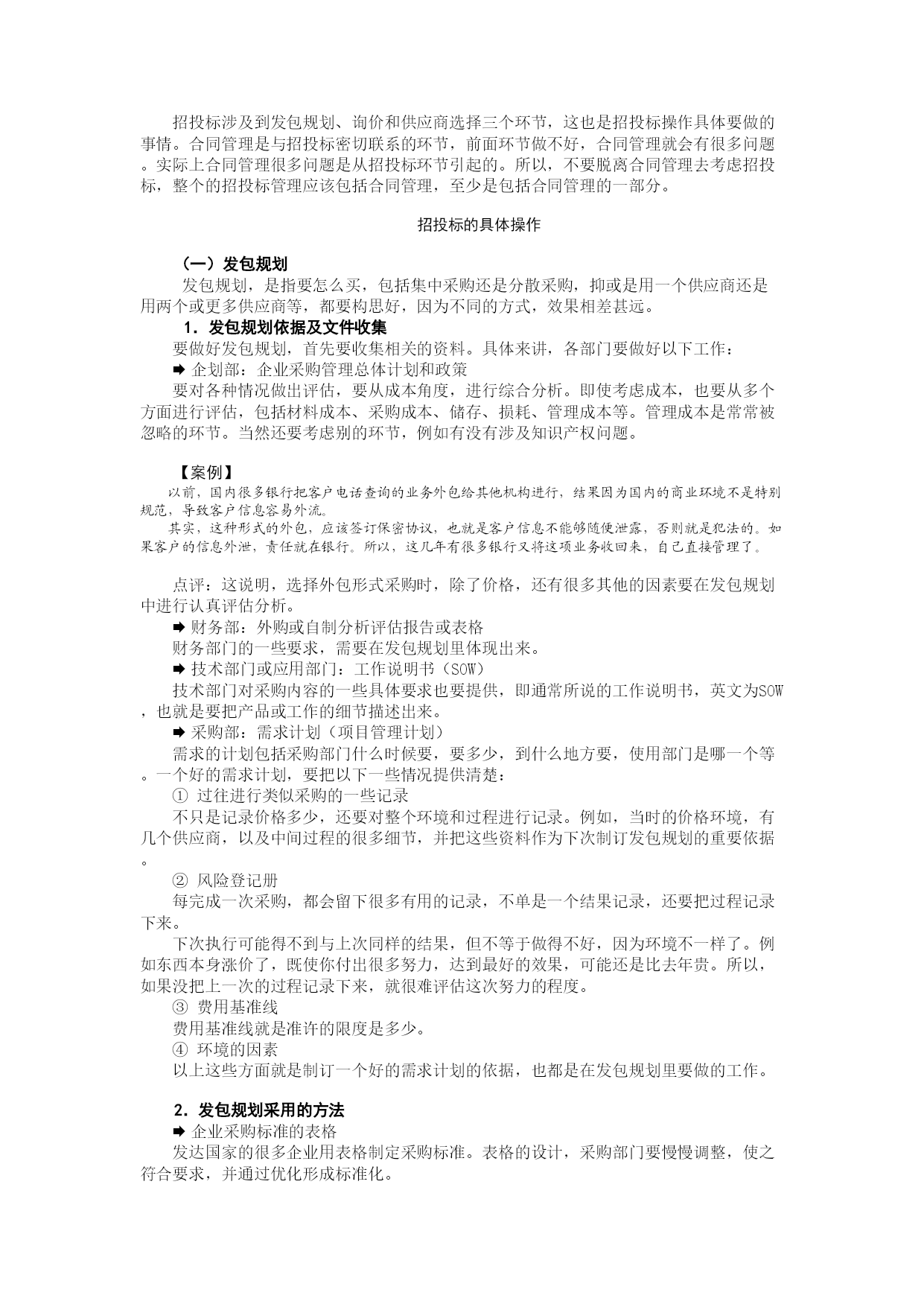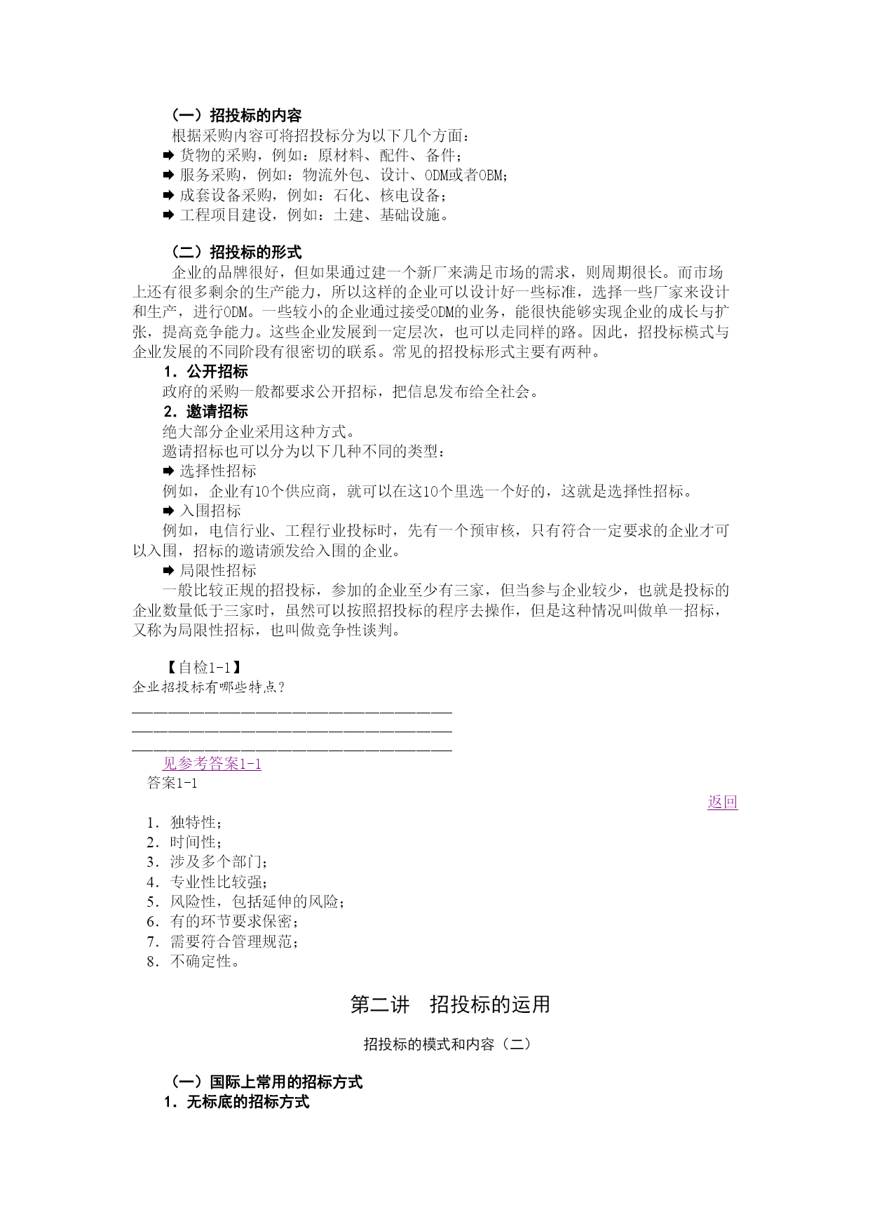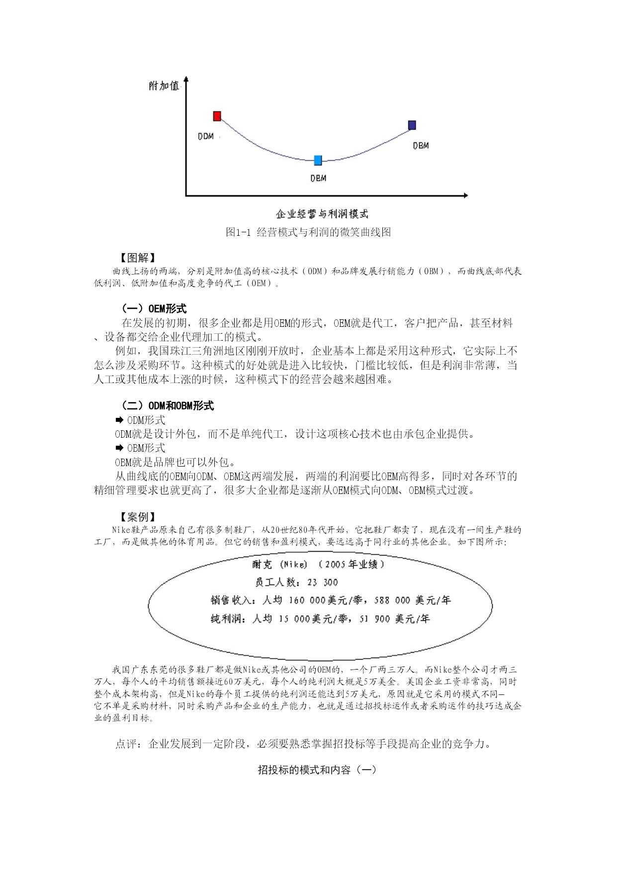 第一讲企业采购招投标模式及其运用(上)前言随着国内企业规模越来越大,对资源整合的要求也越来越高。企业通过资源整合,使自己的竞争力在严峻的市场环境下不断提升。而采购管理是资源整合的重要环节,这个环节可以使企业比较直接迅速地取得效果。采购的招投标是采购管理的重要工具。招投标的历史与发展2000年左右,比较规范的招投标开始在国内实施。当时主要是针对一些政府项目和国际项目。随着企业规模的扩大,整合资源的要求使招投标日益受到重视。招投标存在于市场经济环境里,通过市场机制,充分发挥一个产品或者一个企业的市场价值。对于一个企业,要想在市场里面采购到最适合企业的产品,就需要通过招投标的工具来达到这个目的。采购招投标的基本目的(一)企业招投标的意义企业的采购与个人买东西是有差别的,到商店买东西,一般卖多少钱就付多少钱。但对于企业采购来讲,买东西的过程同时也是卖东西的过程,是卖企业的前景、企业的形象、企业的管理体制。例如企业愿意以比较低的价格把东西卖给沃尔玛,就是因为在交易过程中能得到想要的东西,包括期待将来还有定单,在市场上推广自己是沃尔玛的供应商等,这对企业整体的利益,是有好处的。虽然企业以比较低的价格售出产品,但并不能简单地以亏损而论,因为经济上的暂时亏损可以从别的地方得到利益。企业通过这个过程的管理,可以把资源价值充分体现出来。【案例】1984年以前的奥运会,基本上都是政府操办的,每一届都亏损。例如,1972年德国慕尼黑奥运会,恐怖分子劫持了以色列的运动员,这一届奥运会亏损了大概10亿美元;1976年加拿大的蒙特利尔奥运会,亏损了20亿美元;1980年莫斯科奥运会,西方国家抵制,结果这一届运动会亏损90亿美元。1984年美国洛杉矶奥运会组织委员会主席叫尤伯罗斯,现在是美国奥委会主席。当年他组织奥运会的时候就用到了招投标的工具。尤伯罗斯当时是一个旅行社的总经理,管理才能非常出众。承担奥运会的组织工作任务后,想了很多办法。先用150美元,在银行为洛杉矶奥运会的组织委员会开了一个账户。然后分析资源,并用招投标的方式把这些资源卖给企业,充分体现出资源的价值。例如,在奥运场馆里面做广告,哪个企业出钱高,就树哪个企业的广告牌。也就是指定广告商,或者指定唯一的产品。他首先从饮料业开始,美国的可口可乐和百事可乐参加竞标,结果可口可乐中标,一个标就是1500万美元。通过招投标的方式,把一件件的资源卖出去,筹集了足够的资金。本次的奥运会上,电视转播权也是通过这种方式进行销售,结果美国广播公司以2.5亿美元中标。点评:洛杉矶奥运会的招标方式体现了如下特点,即:通过规范的过程,以便宜的价格购买到比较好的东西,并通过对招投标的管理、策划,把资源真正的内在价值发掘出来,使交易双方达到了双赢的局面。(二)企业熟悉招投标的基本目的企业掌握招投标的工具,可以在资源整合的过程中使资源最大化,或者最优化。经济学上有一个图叫做微笑曲线图。如图1-1所示:图1-1经营模式与利润的微笑曲线图【图解】曲线上扬的两端,分别是附加值高的核心技术(ODM)和品牌发展行销能力(OBM),而曲线底部代表低利润、低附加值和高度竞争的代工(OEM)。(一)OEM形式在发展的初期,很多企业都是用OEM的形式,OEM就是代工,客户把产品,甚至材料、设备都交给企业代理加工的模式。例如,我国珠江三角洲地区刚刚开放时,企业基本上都是采用这种形式,它实际上不怎么涉及采购环节。这种模式的好处就是进入比较快,门槛比较低,但是利润非常薄,当人工或其他成本上涨的时候,这种模式下的经营会越来越困难。(二)ODM和OBM形式ÆODM形式ODM就是设计外包,而不是单纯代工,设计这项核心技术也由承包企业提供。ÆOBM形式OBM就是品牌也可以外包。从曲线底的OEM向ODM、OBM这两端发展,两端的利润要比OEM高得多,同时对各环节的精细管理要求也就更高了,很多大企业都是逐渐从OEM模式向ODM、OBM模式过渡。【案例】Nike鞋产品原来自己有很多制鞋厂,从20世纪80年代开始,它把鞋厂都卖了,现在没有一间生产鞋的工厂,而是做其他的体育用品。但它的销售和盈利模式,要远远高于同行业的其他企业。如下图所示:我国广东东莞的很多鞋厂都是做Nike或其他公司的OEM的,一个厂两三万人。而Nike整个公司才两三万人,每个人的平均销售额接近60万美元,每个人的纯利润大概是5万美金。美国企业工资非常高,同时整个成本架构高,但是Nike的每个员工提供的纯利润还能达到5万美元,原因就是它采用的模式不同—它不单是采购材料,同时采购产品和企业的生产能力,也就是通过招投标运作或者采购运作的技巧达成企业的盈利目标。点评:企业发展到一定阶段,必须要熟悉掌握招投