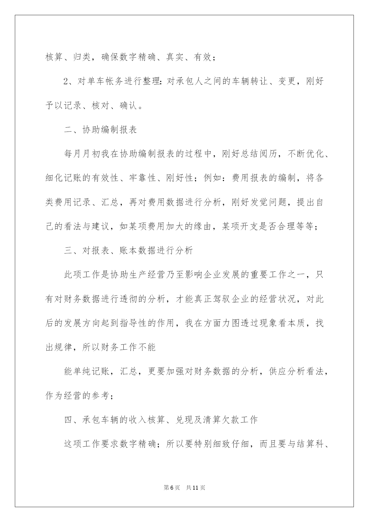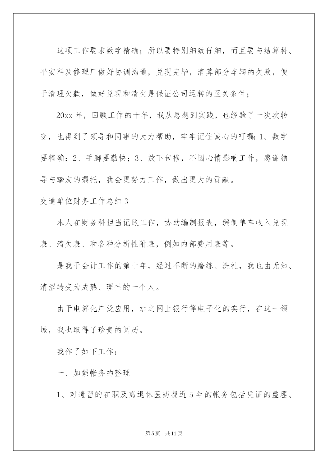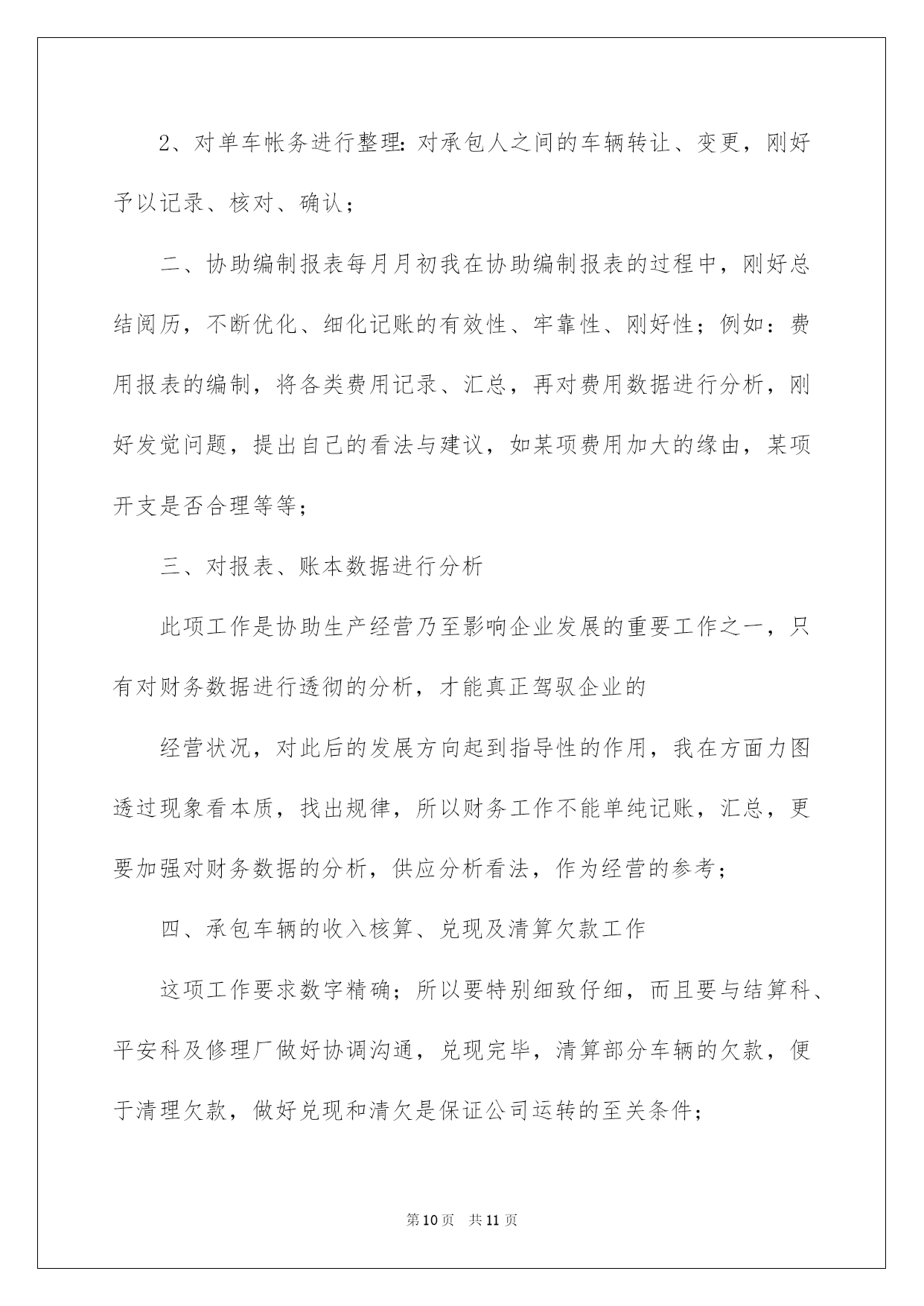 第PAGE\*Arabic\*MERGEFORMAT11页共NUMPAGES\*Arabic\*MERGEFORMAT11页第PAGE\*MERGEFORMAT11页共NUMPAGES\*MERGEFORMAT11页第PAGE\*MERGEFORMAT11页共NUMPAGES\*MERGEFORMAT11页第PAGE\*MERGEFORMAT11页共NUMPAGES\*MERGEFORMAT11页第PAGE\*MERGEFORMAT11页共NUMPAGES\*MERGEFORMAT11页第PAGE\*MERGEFORMAT11页共NUMPAGES\*MERGEFORMAT11页第PAGE\*MERGEFORMAT11页共NUMPAGES\*MERGEFORMAT11页第PAGE\*MERGEFORMAT11页共NUMPAGES\*MERGEFORMAT11页第PAGE\*MERGEFORMAT11页共NUMPAGES\*MERGEFORMAT11页第PAGE\*MERGEFORMAT11页共NUMPAGES\*MERGEFORMAT11页第PAGE\*MERGEFORMAT11页共NUMPAGES\*MERGEFORMAT11页2022交通单位财务工作总结交通单位财务工作总结总结是对某一阶段的工作、学习或思想中的阅历或状况进行分析探讨的书面材料,它能够使头脑更加醒悟,目标更加明确,我想我们须要写一份总结了吧。如何把总结做到重点突出呢?以下是我为大家收集的交通单位财务工作总结,供大家参考借鉴,希望可以帮助到有须要的挚友。交通单位财务工作总结1本人在财务科担当记账工作,协助编制报表,编制单车收入兑现表、清欠表、和各种分析性附表,例如内部费用表等。是我干会计工作的第十年,经过不断的磨练、洗礼,我也由无知、清涩转变为成熟、理性的一个人。由于电算化广泛应用,加之网上银行等电子化的实行,在这一领域,我也取得了珍贵的阅历。我作了如下工作:一、加强帐务的整理1、对遗留的在职及离退休医药费近5年的帐务包括凭证的整理、核算、归类,确保数字精确、真实、有效;2、对单车帐务进行整理:对承包人之间的车辆转让、变更,刚好予以记录、核对、确认;二、协助编制报表每月月初我在协助编制报表的过程中,刚好阅历,不断优化、细化记账的有效性、牢靠性、刚好性;例如:费用报表的编制,将各类费用记录、汇总,再对费用数据进行分析,刚好发觉问题,提出自己的看法与建议,如某项费用加大的缘由,某项开支是否合理等等;三、对报表、账本数据进行分析此项工作是协助生产经营乃至影响企业发展的重要工作之一,只有对财务数据进行透彻的分析,才能真正驾驭企业的经营状况,对此后的发展方向起到指导性的作用,我在方面力图透过现象看本质,找出规律,所以财务工作不能单纯记账,汇总,更要加强对财务数据的分析,供应分析看法,作为经营的参考;四、承包车辆的收入核算、兑现及清算欠款工作这项工作要求数字精确;所以要特别细致仔细,而且要与结算科、平安科及修理厂做好协调沟通,兑现完毕,清算部分车辆的欠款,便于清理欠款,做好兑现和清欠是保证公司运转的至关条件;回顾工作的十年,我从思想到实践,也经验了一次次转变,也得到了领导和同事的大力帮助,牢牢记住诚心的叮嘱:1、数字要精确;2、手脚要勤快;3、放下包袱,不因心情影响工作,感谢领导与挚友的嘱托,我会更努力工作,做出更大的贡献。交通单位财务工作总结2本人在财务科担当记账工作,协助编制报表,编制单车收入兑现表、清欠表、和各种分析性附表,例如内部费用表等,年交通单位财务个人工作总结。20xx年是我干会计工作的第十年,经过不断的磨练、洗礼,我也由无知、清涩转变为成熟、理性的一个人。由于电算化广泛应用,加之网上银行等电子化的实行,在这一领域,我也取得了珍贵的阅历。!20xx年我作了如下工作:一、加强帐务的整理1、对遗留的在职及离退休医药费近5年的帐务包括凭证的整理核算、归类,确保数字精确、真实、有效;2、对单车帐务进行整理:对承包人之间的车辆转让、变更,刚好予以记录、核对、确认;二、协助编制报表每月月初我在协助编制报表的过程中,刚好总结阅历,不断优化、细化记账的有效性、牢靠性、刚好性;例如:费用报表的编制,将各类费用记录、汇总,再对费用数据进行分析,刚好发觉问题,提出自己的看法与建议,如某项费用加大的缘由,某项开支是否合理等等;三、对报表、账本数据进行分析此项工作是协助生产经营乃至影响企业发展的重要工作之一,只有对财务数据进行透彻的分析,才能真正驾驭企业的经营状况,对此后的发展方向起到指导性的作用,我在方面力图透过现象看本质,找出