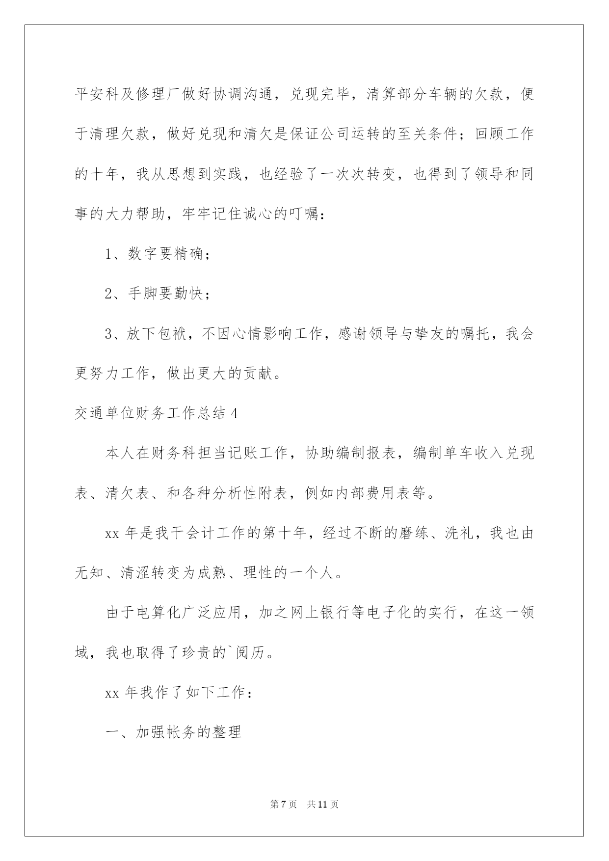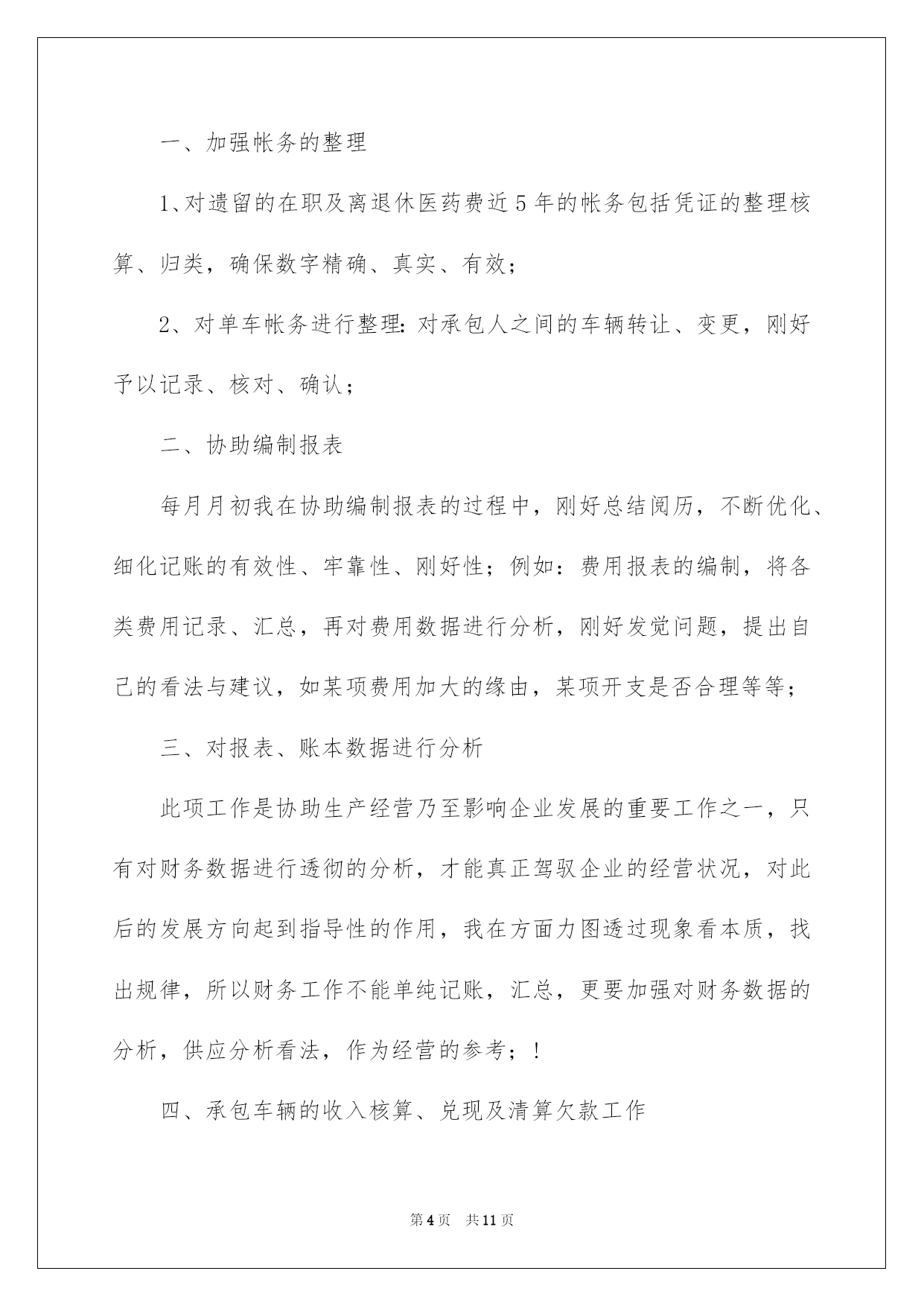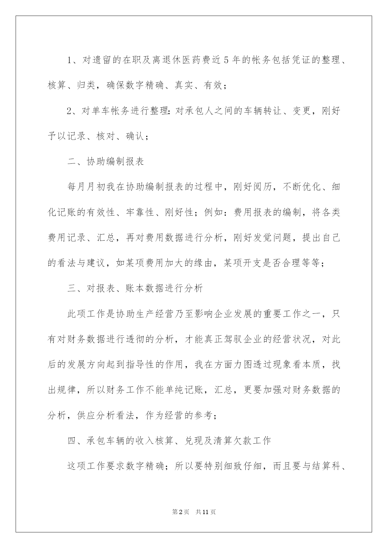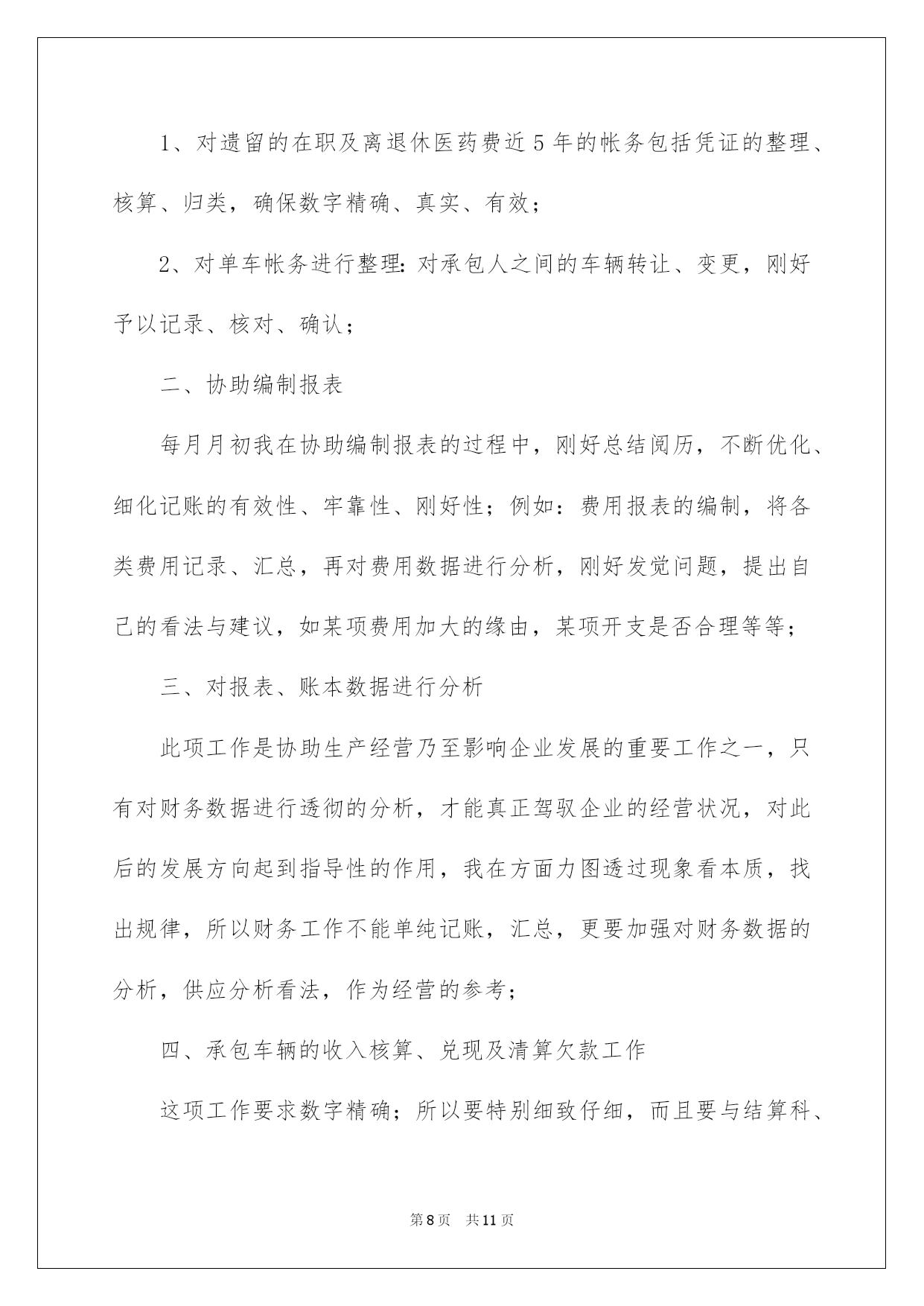 第PAGE\*Arabic\*MERGEFORMAT11页共NUMPAGES\*Arabic\*MERGEFORMAT11页第PAGE\*MERGEFORMAT11页共NUMPAGES\*MERGEFORMAT11页第PAGE\*MERGEFORMAT11页共NUMPAGES\*MERGEFORMAT11页第PAGE\*MERGEFORMAT11页共NUMPAGES\*MERGEFORMAT11页第PAGE\*MERGEFORMAT11页共NUMPAGES\*MERGEFORMAT11页第PAGE\*MERGEFORMAT11页共NUMPAGES\*MERGEFORMAT11页第PAGE\*MERGEFORMAT11页共NUMPAGES\*MERGEFORMAT11页第PAGE\*MERGEFORMAT11页共NUMPAGES\*MERGEFORMAT11页第PAGE\*MERGEFORMAT11页共NUMPAGES\*MERGEFORMAT11页第PAGE\*MERGEFORMAT11页共NUMPAGES\*MERGEFORMAT11页第PAGE\*MERGEFORMAT11页共NUMPAGES\*MERGEFORMAT11页2022交通单位财务工作总结交通单位财务工作总结总结是对某一阶段的工作、学习或思想中的阅历或状况进行分析探讨的书面材料,它能够使头脑更加醒悟,目标更加明确,我想我们须要写一份总结了吧。如何把总结做到重点突出呢?以下是我为大家收集的交通单位财务工作总结,供大家参考借鉴,希望可以帮助到有须要的挚友。交通单位财务工作总结1本人在财务科担当记账工作,协助编制报表,编制单车收入兑现表、清欠表、和各种分析性附表,例如内部费用表等。是我干会计工作的第十年,经过不断的磨练、洗礼,我也由无知、清涩转变为成熟、理性的一个人。由于电算化广泛应用,加之网上银行等电子化的实行,在这一领域,我也取得了珍贵的阅历。我作了如下工作:一、加强帐务的整理1、对遗留的在职及离退休医药费近5年的帐务包括凭证的整理、核算、归类,确保数字精确、真实、有效;2、对单车帐务进行整理:对承包人之间的车辆转让、变更,刚好予以记录、核对、确认;二、协助编制报表每月月初我在协助编制报表的过程中,刚好阅历,不断优化、细化记账的有效性、牢靠性、刚好性;例如:费用报表的编制,将各类费用记录、汇总,再对费用数据进行分析,刚好发觉问题,提出自己的看法与建议,如某项费用加大的缘由,某项开支是否合理等等;三、对报表、账本数据进行分析此项工作是协助生产经营乃至影响企业发展的重要工作之一,只有对财务数据进行透彻的分析,才能真正驾驭企业的经营状况,对此后的发展方向起到指导性的作用,我在方面力图透过现象看本质,找出规律,所以财务工作不能单纯记账,汇总,更要加强对财务数据的分析,供应分析看法,作为经营的参考;四、承包车辆的收入核算、兑现及清算欠款工作这项工作要求数字精确;所以要特别细致仔细,而且要与结算科、平安科及修理厂做好协调沟通,兑现完毕,清算部分车辆的欠款,便于清理欠款,做好兑现和清欠是保证公司运转的至关条件;回顾工作的十年,我从思想到实践,也经验了一次次转变,也得到了领导和同事的大力帮助,牢牢记住诚心的叮嘱:1、数字要精确;2、手脚要勤快;3、放下包袱,不因心情影响工作,感谢领导与挚友的嘱托,我会更努力工作,做出更大的贡献。交通单位财务工作总结2本人在财务科担当记账工作,协助编制报表,编制单车收入兑现表、清欠表、和各种分析性附表,例如内部费用表等,年交通单位财务个人工作总结。20xx年是我干会计工作的第十年,经过不断的磨练、洗礼,我也由无知、清涩转变为成熟、理性的一个人。由于电算化广泛应用,加之网上银行等电子化的实行,在这一领域,我也取得了珍贵的阅历。!20xx年我作了如下工作:一、加强帐务的整理1、对遗留的在职及离退休医药费近5年的帐务包括凭证的整理核算、归类,确保数字精确、真实、有效;2、对单车帐务进行整理:对承包人之间的车辆转让、变更,刚好予以记录、核对、确认;二、协助编制报表每月月初我在协助编制报表的过程中,刚好总结阅历,不断优化、细化记账的有效性、牢靠性、刚好性;例如:费用报表的编制,将各类费用记录、汇总,再对费用数据进行分析,刚好发觉问题,提出自己的看法与建议,如某项费用加大的缘由,某项开支是否合理等等;三、对报表、账本数据进行分析此项工作是协助生产经营乃至影响企业发展的重要工作之一,只有对财务数据进行透彻的分析,才能真正驾驭企业的经营状况,对此后的发展方向起到指导性的作用,我在方面力图透过现象看本质,找出