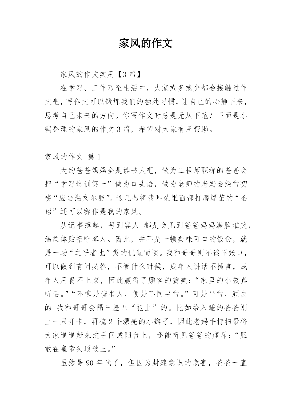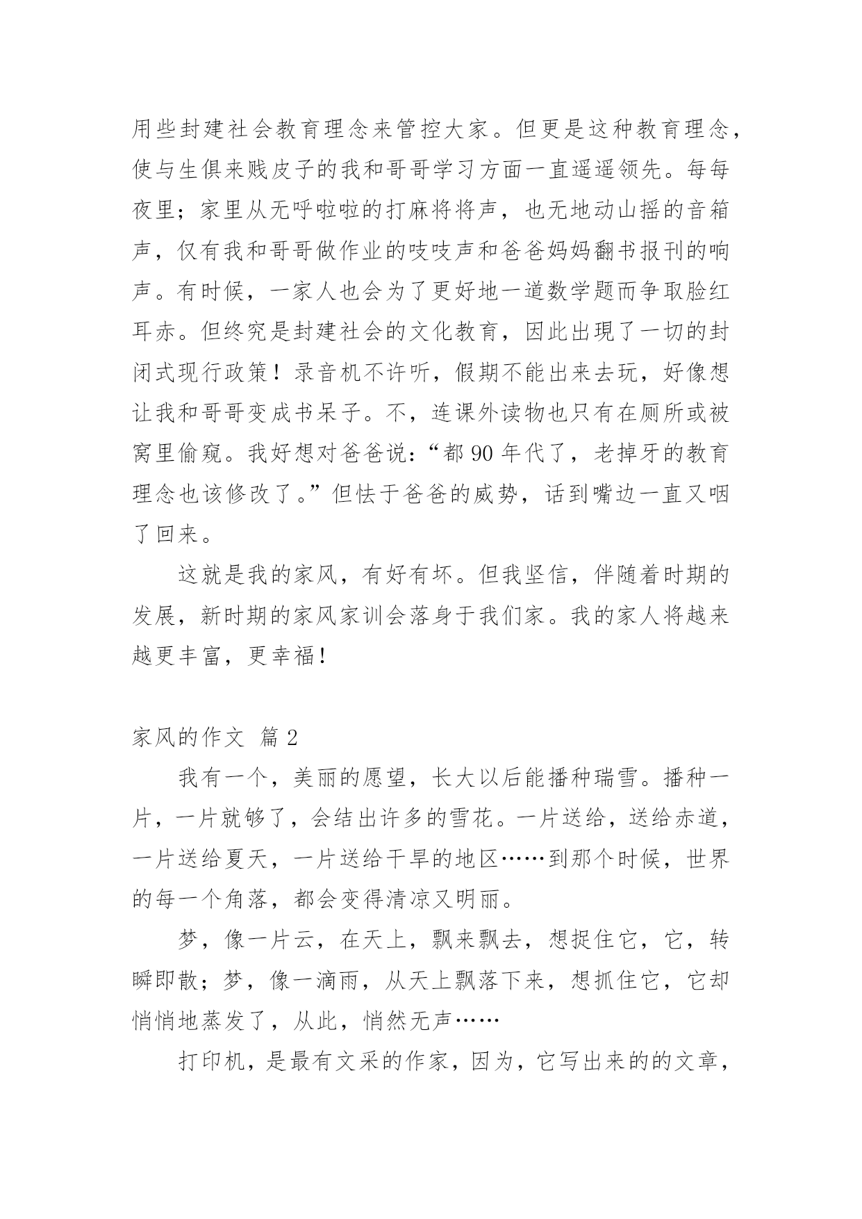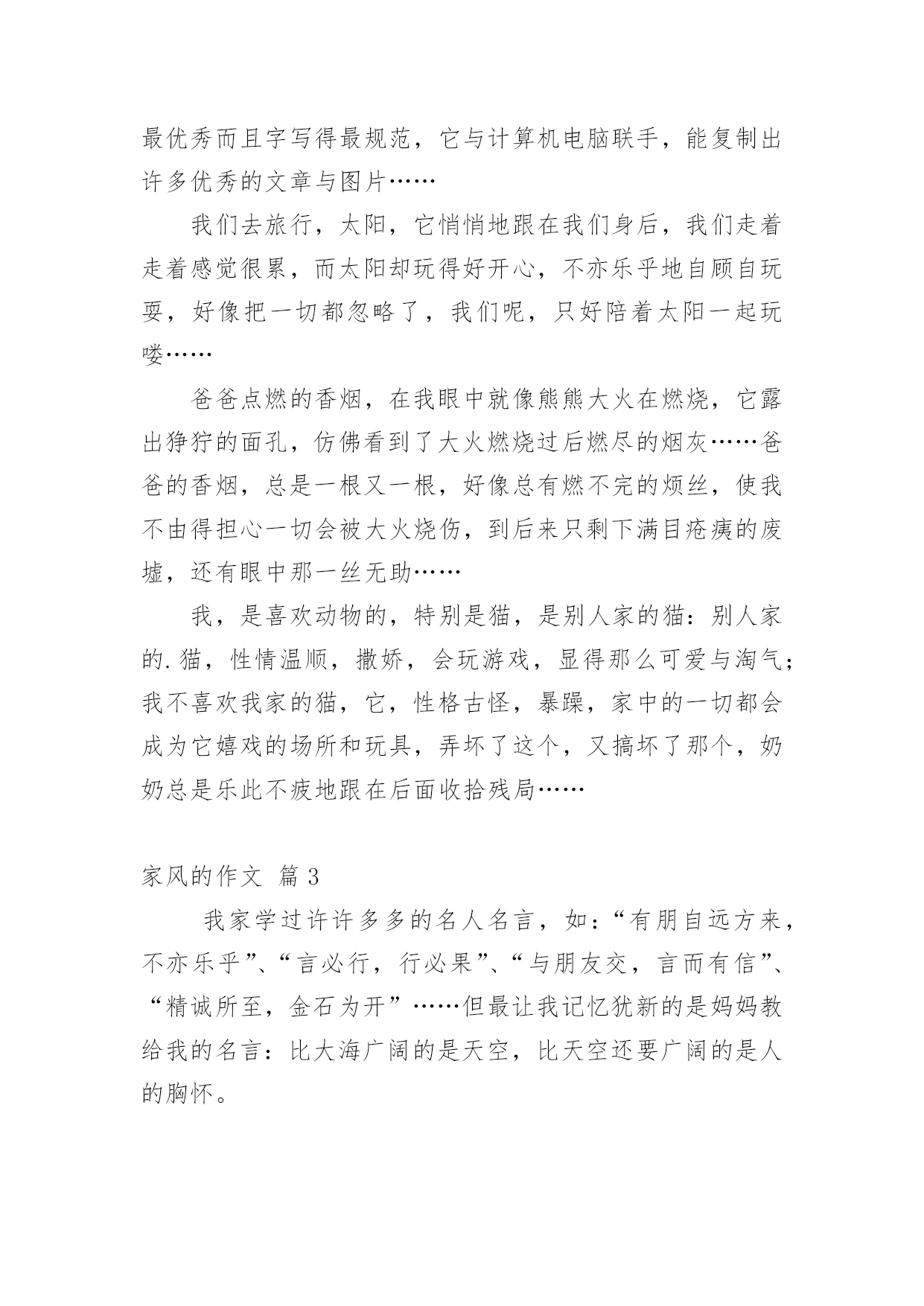 家风的作文家风的作文实用【3篇】在学习、工作乃至生活中,大家或多或少都会接触过作文吧,写作文可以锻炼我们的独处习惯,让自己的心静下来,思考自己未来的方向。你写作文时总是无从下笔?下面是小编整理的家风的作文3篇,希望对大家有所帮助。家风的作文篇1大约爸爸妈妈全是读书人吧,做为工程师职称的爸爸会把“学习培训第一”做为口头语,做为老师的老妈会经常叨唠“应当温文尔雅”。这几句将我耳朵里面都打磨厚茧的“圣诏”还可以称作是我的家风。从记事簿起,每到客人都是会见到爸爸妈妈满脸堆笑,温柔体贴招呼客人。因此,并不是一顿美味可口的饭食,就是一场“之乎者也”类的侃侃而谈。我和哥哥则不谈不张口,可以做到有问必答,不管什么时候,成年人讲话不插言,成年人用餐不上菜,因此赢得了顾客的赞美:“家里的小孩真听话。”“不愧是读书人,便是不同寻常。”可是平常,顽皮的.我和哥哥会隔三差五“犯上”的。比如给入睡的爸爸别上一只开卡,再梳2个漂亮的小辫子,因此老妈手持扫帚将大家通通赶来洗手间或阳台上,还能听见爸爸的痛斥:“胆敢在皇帝头顶破土。”虽然是90年代了,但因为封建意识的危害,爸爸一直用些封建社会教育理念来管控大家。但更是这种教育理念,使与生俱来贱皮子的我和哥哥学习方面一直遥遥领先。每每夜里;家里从无呼啦啦的打麻将将声,也无地动山摇的音箱声,仅有我和哥哥做作业的吱吱声和爸爸妈妈翻书报刊的响声。有时候,一家人也会为了更好地一道数学题而争取脸红耳赤。但终究是封建社会的文化教育,因此出現了一切的封闭式现行政策!录音机不许听,假期不能出来去玩,好像想让我和哥哥变成书呆子。不,连课外读物也只有在厕所或被窝里偷窥。我好想对爸爸说:“都90年代了,老掉牙的教育理念也该修改了。”但怯于爸爸的威势,话到嘴边一直又咽了回来。这就是我的家风,有好有坏。但我坚信,伴随着时期的发展,新时期的家风家训会落身于我们家。我的家人将越来越更丰富,更幸福!家风的作文篇2我有一个,美丽的愿望,长大以后能播种瑞雪。播种一片,一片就够了,会结出许多的雪花。一片送给,送给赤道,一片送给夏天,一片送给干旱的地区……到那个时候,世界的每一个角落,都会变得清凉又明丽。梦,像一片云,在天上,飘来飘去,想捉住它,它,转瞬即散;梦,像一滴雨,从天上飘落下来,想抓住它,它却悄悄地蒸发了,从此,悄然无声……打印机,是最有文采的作家,因为,它写出来的的文章,最优秀而且字写得最规范,它与计算机电脑联手,能复制出许多优秀的文章与图片……我们去旅行,太阳,它悄悄地跟在我们身后,我们走着走着感觉很累,而太阳却玩得好开心,不亦乐乎地自顾自玩耍,好像把一切都忽略了,我们呢,只好陪着太阳一起玩喽……爸爸点燃的香烟,在我眼中就像熊熊大火在燃烧,它露出狰狞的面孔,仿佛看到了大火燃烧过后燃尽的烟灰……爸爸的香烟,总是一根又一根,好像总有燃不完的烦丝,使我不由得担心一切会被大火烧伤,到后来只剩下满目疮痍的废墟,还有眼中那一丝无助……我,是喜欢动物的,特别是猫,是别人家的猫:别人家的.猫,性情温顺,撒娇,会玩游戏,显得那么可爱与淘气;我不喜欢我家的猫,它,性格古怪,暴躁,家中的一切都会成为它嬉戏的场所和玩具,弄坏了这个,又搞坏了那个,奶奶总是乐此不疲地跟在后面收拾残局……家风的作文篇3我家学过许许多多的名人名言,如:“有朋自远方来,不亦乐乎”、“言必行,行必果”、“与朋友交,言而有信”、“精诚所至,金石为开”……但最让我记忆犹新的是妈妈教给我的名言:比大海广阔的是天空,比天空还要广阔的是人的胸怀。去年,妈妈给我买了一支极为精美的双头钢笔,这支钢笔穿着亮闪闪的外衣,外衣的右边雕刻着一条霸气的蛟龙,盘旋在一个巨大的岩石上空,左边雕刻着一只飞舞在满天星斗中的凤凰,它马上就成了我的最爱。那天外语班下课的时候,同学们一窝蜂地涌出了教室,我坐在自己的位子上看着刚买的小说《狼王梦》。突然,“嘭”一声,我心爱的钢笔被杰克碰到了地上,杰克赶忙弯下腰伸手把钢笔捡了起来,又用嘴把钢笔上的土吹下来,然后放到我的.手心,小心翼翼说:“真对不起啊,我不小心把你的钢笔碰到了地上,你看看,没什么事儿吧?”我急忙打开笔帽,可怜的小笔尖已经被摔裂了。我很生气,大声吼道:“臭杰克,你快赔我的钢笔,你赔啊!”他带着哭腔解释着:“我不是故意的,我不是给你说过对不起了吗?你就原谅我吧!”我气得直哭,坚决地说:“不行!你赔!”放学后,我揉着红肿的眼睛回到家,一看到妈妈就倍感委屈,眼泪又像断了线的珍珠一样往下落。我哭着把事情的来龙去脉都告诉了妈妈,妈妈笑了,温和地对我说:“孩子,你知道吗?比大海广阔的是天空,比天空还要广阔的是人的胸怀。”听后我恍然大悟:妈妈是想让我学会宽容,让我懂得只有宽容才能交到更多的好朋友,不要因为一支钢笔,就破坏了同学之间的珍贵友谊。再次上外语班的时候,我主动找到了杰克