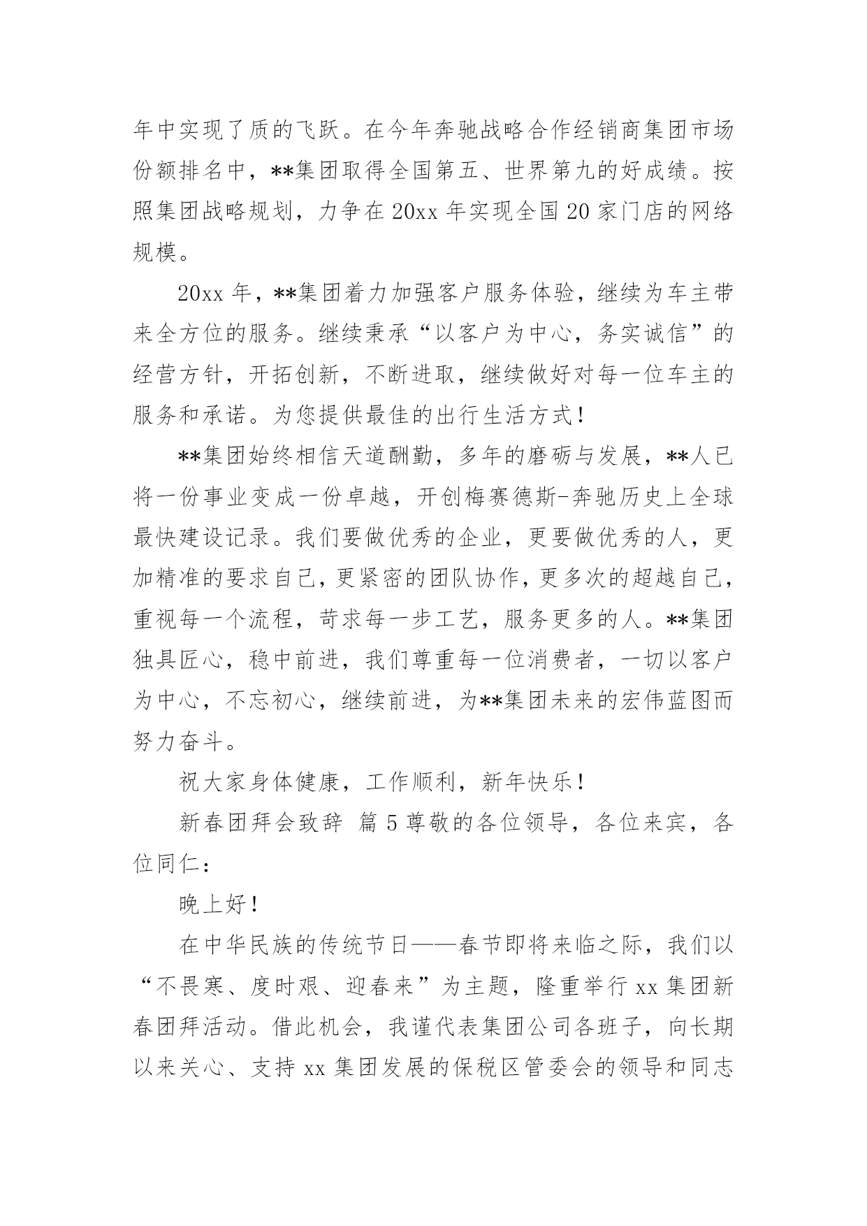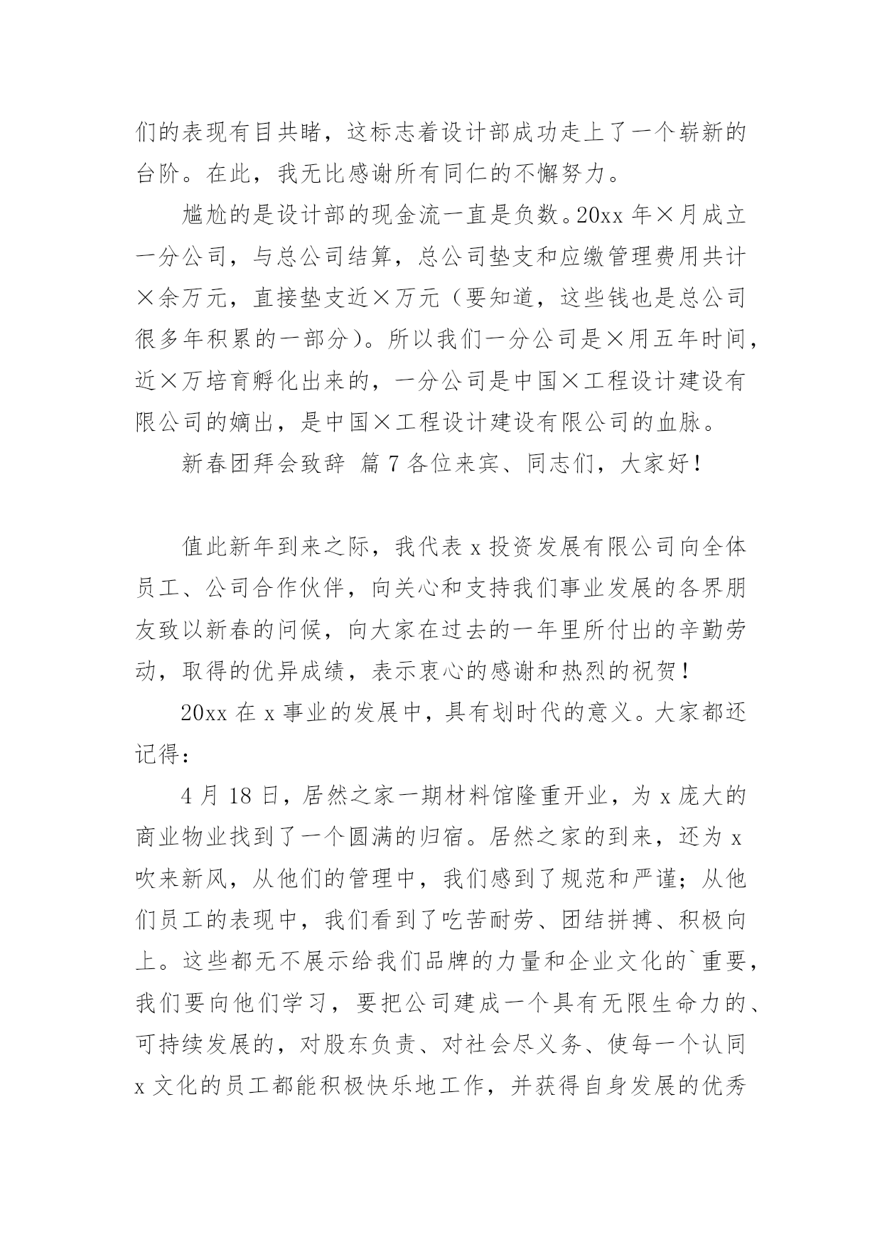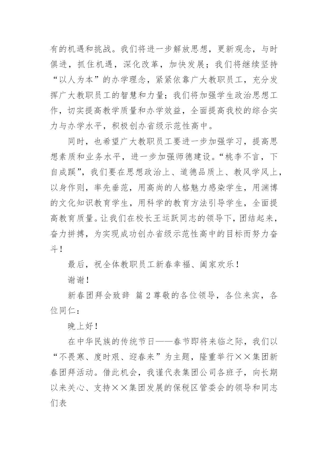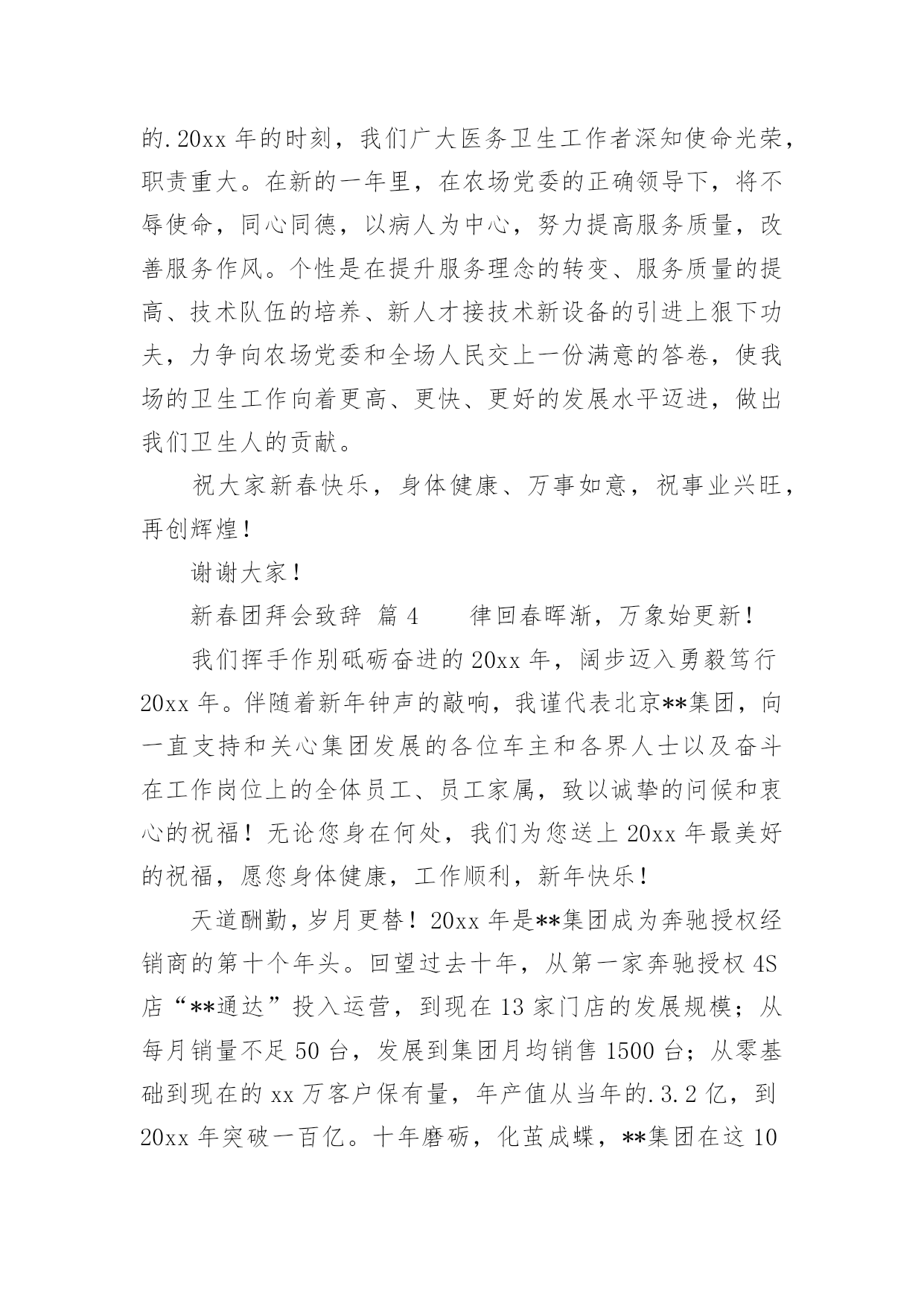 新春团拜会致辞新春团拜会致辞在现实生活或工作学习中,大家都尝试过写致辞吧,致辞要注意人物的身份,不能偏离说话的对象。究竟什么样的致辞才是好的致辞呢?以下是小编整理的新春团拜会致辞,仅供参考,希望能够帮助到大家。新春团拜会致辞篇1各位老师,女士们、先生们:大家好!一元复始、万象更新。在这春节即将到来之际,我们在这里欢聚一堂,辞旧迎新,共庆佳节。首先,我谨代表学校领导向全体教职员工,并通过你们向你们的亲人,致以节日的祝贺和亲切的慰问!即将过去的一年,广大教职员工以学校发展为己任,默默耕耘,无私奉献。广大教师依法执教、爱岗敬业、严谨治学、团结协作、勇于创新,在教书育人上取得了丰硕成果;广大干部职工紧紧围绕教学这个中心,努力提高管理水平和服务质量,充分发挥了管理育人、服务育人的作用。教育教学取得了较大成绩,学校的整体水平得到提高,申报市级示范性高中获得了成功。成绩来之不易,进步凝聚汗水。这些成绩的取得是我们全校教职员工共同努力的结果。为此,我代表学校领导感谢你们,向你们道一声:辛苦了!新的成绩标志着新的启点,新的.启点孕育着新的希望,新的希望承载着新的跨越。xxxx年,学校发展面临着前所未有的机遇和挑战。我们将进一步解放思想,更新观念,与时俱进,抓住机遇,深化改革,加快发展;我们将继续坚持“以人为本”的办学理念,紧紧依靠广大教职员工,充分发挥广大教职员工的智慧和力量;我们将加强学生政治思想工作,切实提高教学质量和办学效益,全面提高我校的综合实力与办学水平,积极创办省级示范性高中。同时,也希望广大教职员工要进一步加强学习,提高思想素质和业务水平,进一步加强师德建设。“桃李不言,下自成蹊”,我们要在思想政治上、道德品质上、教风学风上,以身作则,率先垂范,用高尚的人格魅力感染学生,用渊博的文化知识教育学生,用科学的教育方法引导学生,全面提高教育质量。让我们在校长王运跃同志的领导下,团结起来,奋力拼搏,为实现成功创办省级示范性高中的目标而努力奋斗!最后,祝全体教职员工新春幸福、阖家欢乐!谢谢!新春团拜会致辞篇2尊敬的各位领导,各位来宾,各位同仁:晚上好!在中华民族的传统节日——春节即将来临之际,我们以“不畏寒、度时艰、迎春来”为主题,隆重举行××集团新春团拜活动。借此机会,我谨代表集团公司各班子,向长期以来关心、支持××集团发展的保税区管委会的领导和同志们表示最衷心的感谢和新春的祝福!向过去一年来为××集团事业辛勤耕耘的全体员工及其家人表示崇高的敬意和节日的问候!各位同仁,20xx年,我们经受了百年不遇的金融风暴的严峻考验,我们从困境中突围,从风险中逃生,取得了骄人业绩,非常值得庆贺。所以,今晚的团拜会也是××集团有史以来最大规模的.庆功会。为此,我们应该用最响亮的掌声,对过去一年取得的成绩表示祝贺,现在,请赞美的掌声响起来!谢谢!谢谢大家!新春团拜会致辞篇3尊敬的各位领导、同志们:春华秋实,岁月更叠,转眼间20xx年已经过去,20xx年的春天正向我们走来。在此,我谨代表全场卫生系统的全体同仁向多年来关心、关注和支持农场卫生事业发展建设的农场领导、全场和各行各业的领导及同志们致以新春的问候和衷心的感谢!20xx年,对全中国人来说极不平凡的一年,对我们卫生系统职工来说也是记忆深刻的一年,在农场党委的正确领导下,在全场人民的关心和帮忙下,我场的卫生事业在医疗保健、公共卫生管理、疾病控制和计划生育等项工作中均取得了喜人的成绩。尤其是农场党委为我们医护人员落实了50%的档案工资,使我们系统上下倍受鼓舞和欣慰。农场职工医院,按照上级要求,开展了以“和谐卫生”为目标,以”保障人民健康”为中心,以”形象建设年”和“建立平安医院”活动为平台,继续深入开展“医院管理年”活动,较圆满地完成了全场人民的医疗保健卫生服务工作,完成了对全场老干部及医保人员的医疗救助及药费报销工作;顺利透过省专家组对我场艾滋病初筛实验室的检查验收;我们投入的23万余元购置的医院管理软件及投入22万余元购买的新型救护车都已经投入使用;我们还顺利地透过了总局礼貌单位的检查验收,成为总局级礼貌单位;并荣获总局级“医疗卫生工作先进单位”光荣称号。农场卫生监督所加强了对食品卫生工作的监管力度,确保了全场人民的食品安全,全年无一例食物中毒事件发生,无一例甲流发生,全场传染病发病率均控制在规范标准之内,疾控中心荣获总局“20xx年度垦区病病控制工作先进群众”称号。一年来,我们所有成绩的取得,与上级领导、农场党委、全场各单位、各部门领导和同志们的大力支持与帮忙是分不开的。我们深知在我们的肩上担子还很重,在我们的职业行为中,也还存在着这样或那样的问题与不足,但我们有决心有信心加以改善与提高。尽管医疗卫生事业改革步履艰难,尽管在补偿机制不健全的状况下卫生事业发展还面临许多困难,但我们会终贞不渝地坚持这