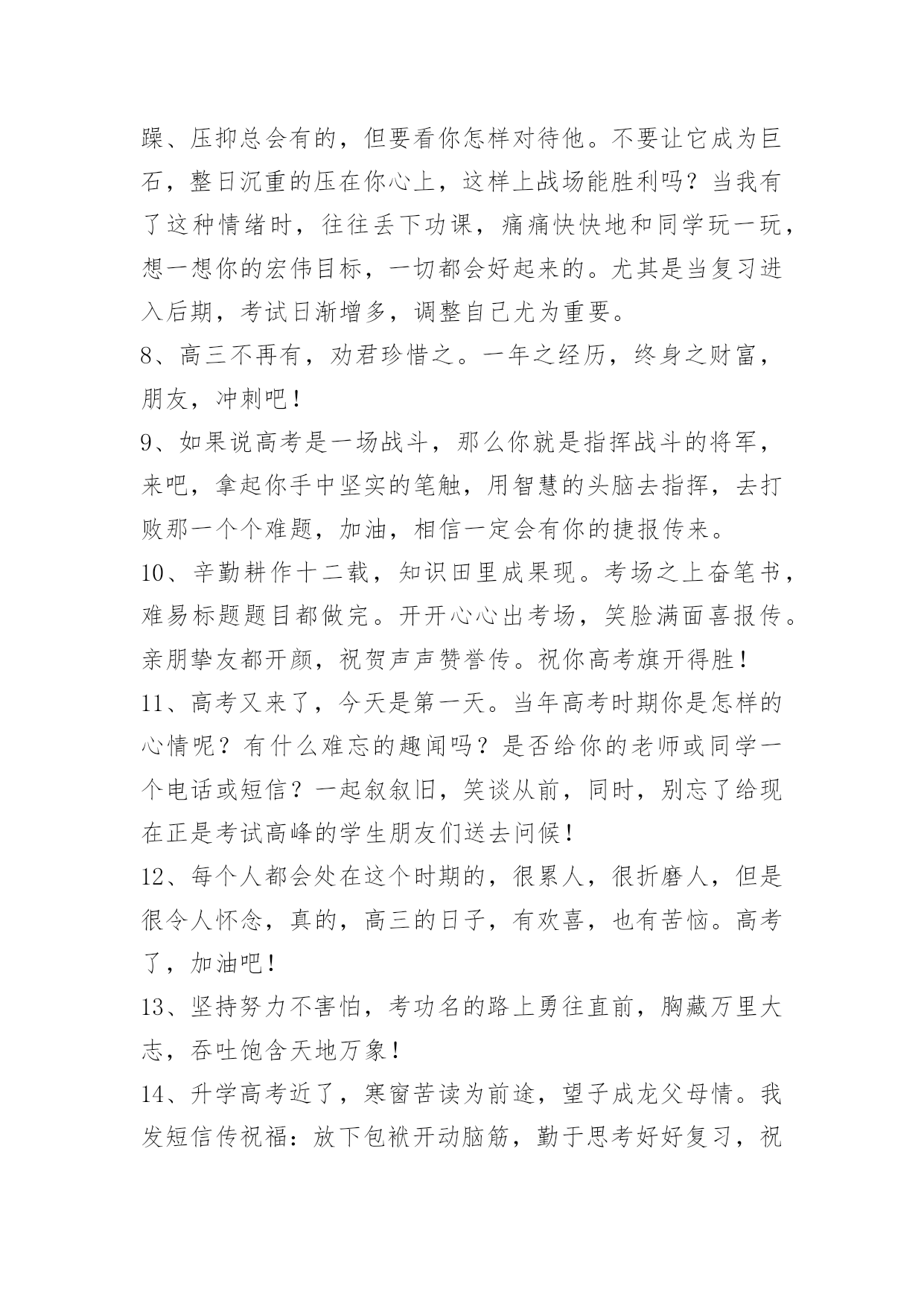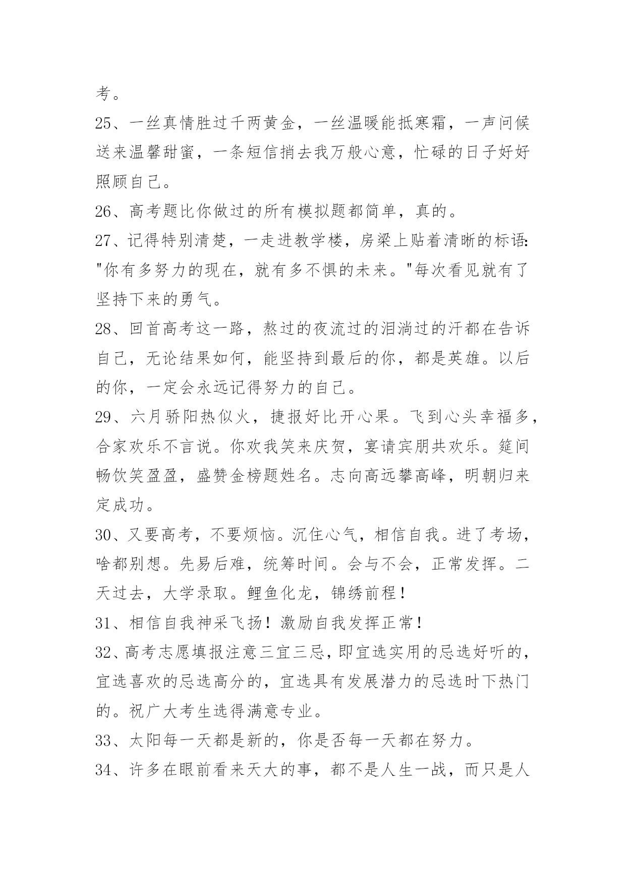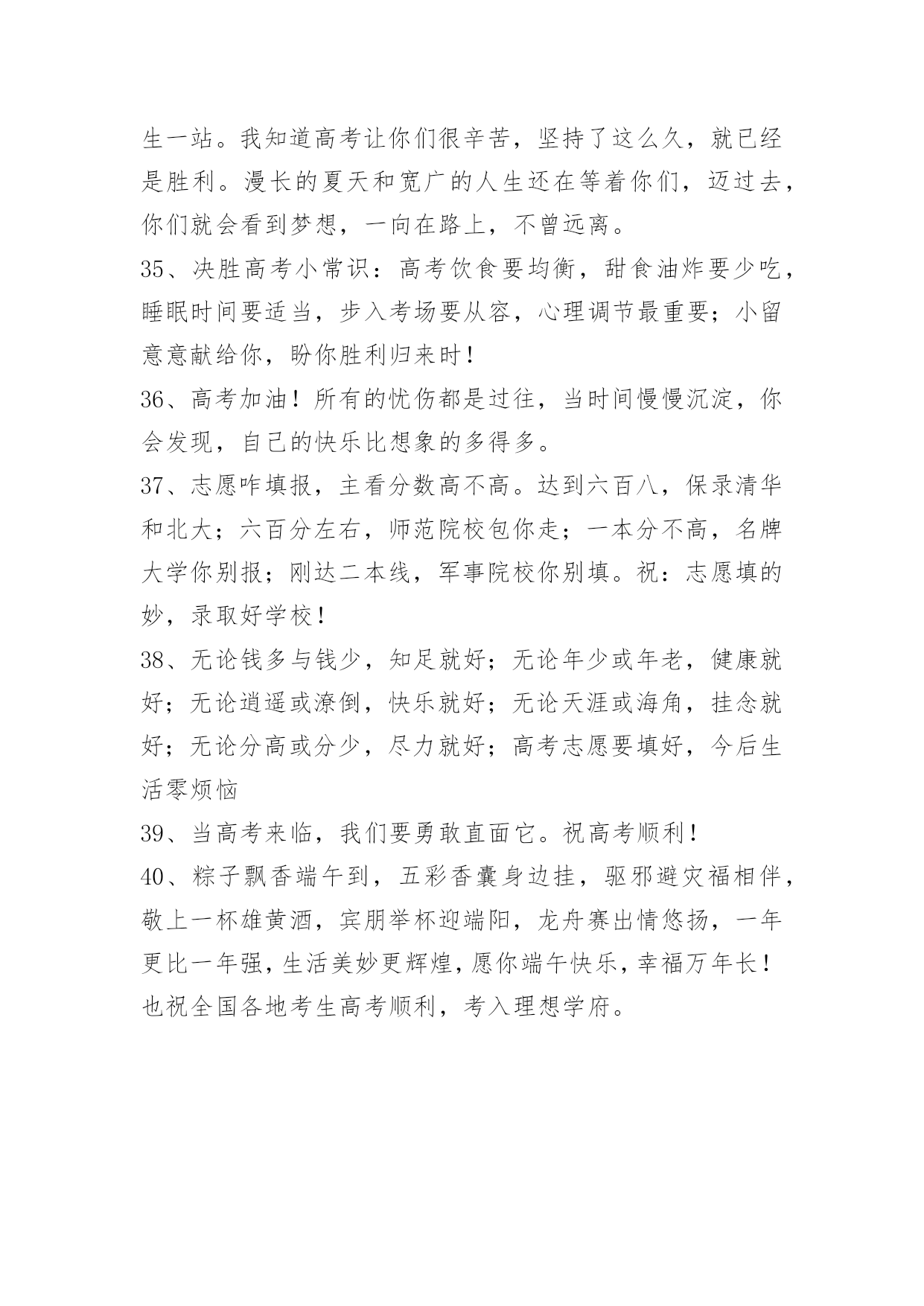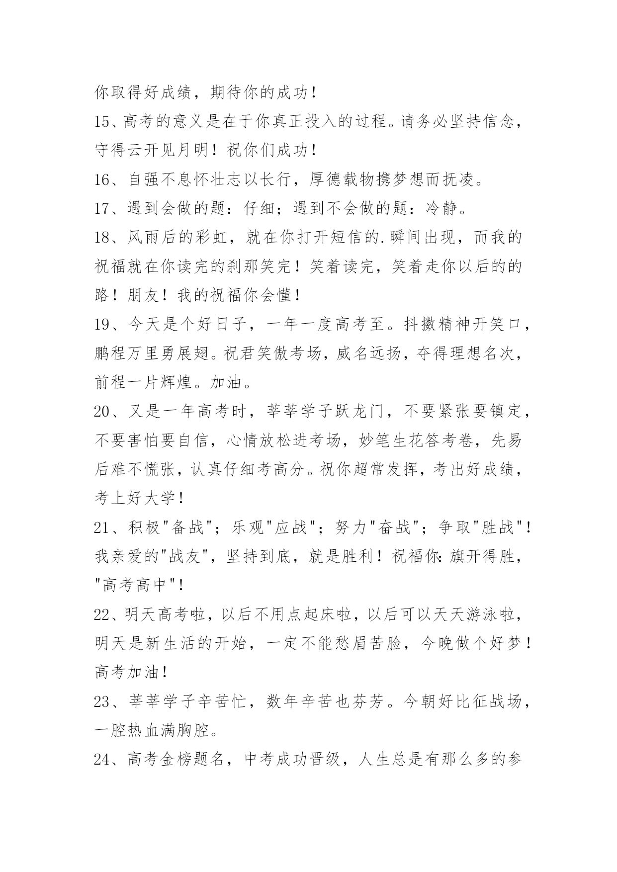 高考顺利祝福赠语高考顺利祝福赠语(通用40句)多一份沉着,沉着方能应对考试中的意外。多一份冷静,冷静方能将难题由难变易。多一份乐观,乐观才能使自己把握好考试的状态。高考即将到来,愿你潇洒去考场,欢心离考场,考出好成绩!本文是小编帮大家整理的高考顺利祝福赠语,一起来欣赏吧。1、经过了黑色六月的奋斗,迎来了金秋十月的满满收获!高考,已然成为昨天;大学,马上将成为全新起点,新的起点,新的风采,奋发拼搏,不断进取,祝大学期间学业有成,知识才识更上一层楼!2、忽然发现:中国每次地震都是快要到高考的时候。高考必备的蒙答案口诀:一颗小豆两颗米,这题答案就是它。3、绽蕾花树株株秀;破土春笋节节高。4、淡淡一点的友情很真,淡淡一点的恋情很醉,淡淡一点的问候很醇,淡淡一点的依恋很清,淡淡一点的孤独很美,淡淡一点的思念很深,淡淡一点的祝福最真,祝你们成功!5、要想高考成功,须记住以下话语:健康身体是基础,良好学风是条件,勤奋刻苦是前提,学习方法是截键,心理素质是保证。6、我的同学,衷心地祝福你在今年的高考中定能一举夺魁,榜上有名,考入心中理想的大学。7、在高三,除了学习外,情绪的调整也很重要,焦虑、烦躁、压抑总会有的,但要看你怎样对待他。不要让它成为巨石,整日沉重的压在你心上,这样上战场能胜利吗?当我有了这种情绪时,往往丢下功课,痛痛快快地和同学玩一玩,想一想你的宏伟目标,一切都会好起来的。尤其是当复习进入后期,考试日渐增多,调整自己尤为重要。8、高三不再有,劝君珍惜之。一年之经历,终身之财富,朋友,冲刺吧!9、如果说高考是一场战斗,那么你就是指挥战斗的将军,来吧,拿起你手中坚实的笔触,用智慧的头脑去指挥,去打败那一个个难题,加油,相信一定会有你的捷报传来。10、辛勤耕作十二载,知识田里成果现。考场之上奋笔书,难易标题题目都做完。开开心心出考场,笑脸满面喜报传。亲朋挚友都开颜,祝贺声声赞誉传。祝你高考旗开得胜!11、高考又来了,今天是第一天。当年高考时期你是怎样的心情呢?有什么难忘的趣闻吗?是否给你的老师或同学一个电话或短信?一起叙叙旧,笑谈从前,同时,别忘了给现在正是考试高峰的学生朋友们送去问候!12、每个人都会处在这个时期的,很累人,很折磨人,但是很令人怀念,真的,高三的日子,有欢喜,也有苦恼。高考了,加油吧!13、坚持努力不害怕,考功名的路上勇往直前,胸藏万里大志,吞吐饱含天地万象!14、升学高考近了,寒窗苦读为前途,望子成龙父母情。我发短信传祝福:放下包袱开动脑筋,勤于思考好好复习,祝你取得好成绩,期待你的成功!15、高考的意义是在于你真正投入的过程。请务必坚持信念,守得云开见月明!祝你们成功!16、自强不息怀壮志以长行,厚德载物携梦想而抚凌。17、遇到会做的题:仔细;遇到不会做的题:冷静。18、风雨后的彩虹,就在你打开短信的.瞬间出现,而我的祝福就在你读完的刹那笑完!笑着读完,笑着走你以后的的路!朋友!我的祝福你会懂!19、今天是个好日子,一年一度高考至。抖擞精神开笑口,鹏程万里勇展翅。祝君笑傲考场,威名远扬,夺得理想名次,前程一片辉煌。加油。20、又是一年高考时,莘莘学子跃龙门,不要紧张要镇定,不要害怕要自信,心情放松进考场,妙笔生花答考卷,先易后难不慌张,认真仔细考高分。祝你超常发挥,考出好成绩,考上好大学!21、积极"备战";乐观"应战";努力"奋战";争取"胜战"!我亲爱的"战友",坚持到底,就是胜利!祝福你:旗开得胜,"高考高中"!22、明天高考啦,以后不用点起床啦,以后可以天天游泳啦,明天是新生活的开始,一定不能愁眉苦脸,今晚做个好梦!高考加油!23、莘莘学子辛苦忙,数年辛苦也芬芳。今朝好比征战场,一腔热血满胸腔。24、高考金榜题名,中考成功晋级,人生总是有那么多的参考。25、一丝真情胜过千两黄金,一丝温暖能抵寒霜,一声问候送来温馨甜蜜,一条短信捎去我万般心意,忙碌的日子好好照顾自己。26、高考题比你做过的所有模拟题都简单,真的。27、记得特别清楚,一走进教学楼,房梁上贴着清晰的标语:"你有多努力的现在,就有多不惧的未来。"每次看见就有了坚持下来的勇气。28、回首高考这一路,熬过的夜流过的泪淌过的汗都在告诉自己,无论结果如何,能坚持到最后的你,都是英雄。以后的你,一定会永远记得努力的自己。29、六月骄阳热似火,捷报好比开心果。飞到心头幸福多,合家欢乐不言说。你欢我笑来庆贺,宴请宾朋共欢乐。筵间畅饮笑盈盈,盛赞金榜题姓名。志向高远攀高峰,明朝归来定成功。30、又要高考,不要烦恼。沉住心气,相信自我。进了考场,啥都别想。先易后难,统筹时间。会与不会,正常发挥。二天过去,大学录取。鲤鱼化龙,锦绣前程!31、相信自我神采飞扬!激励自我发挥正常!32、高考志愿填报注意三宜三忌,即宜选实用的忌选好听的,宜选喜欢的忌选高分的,宜选具有发