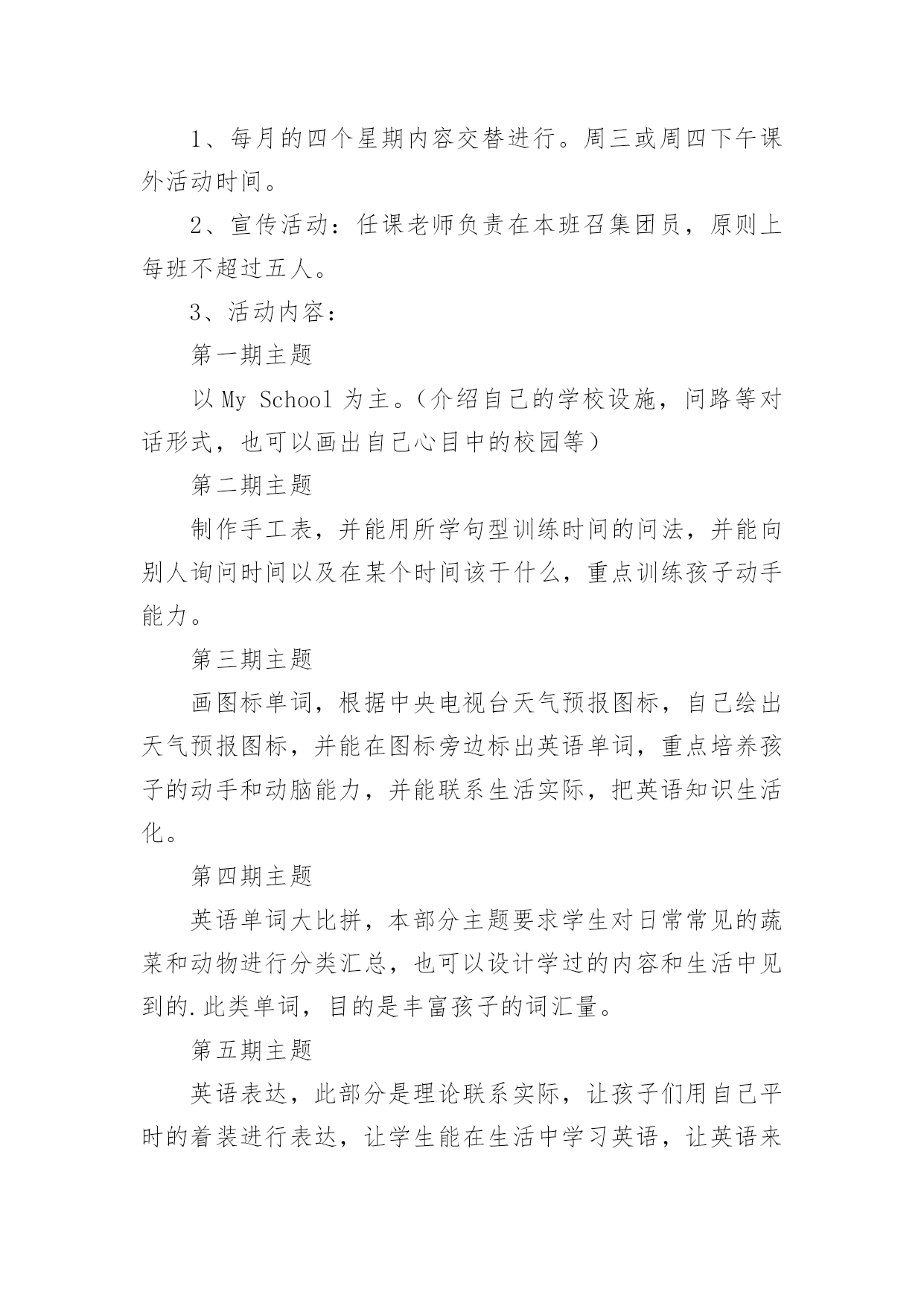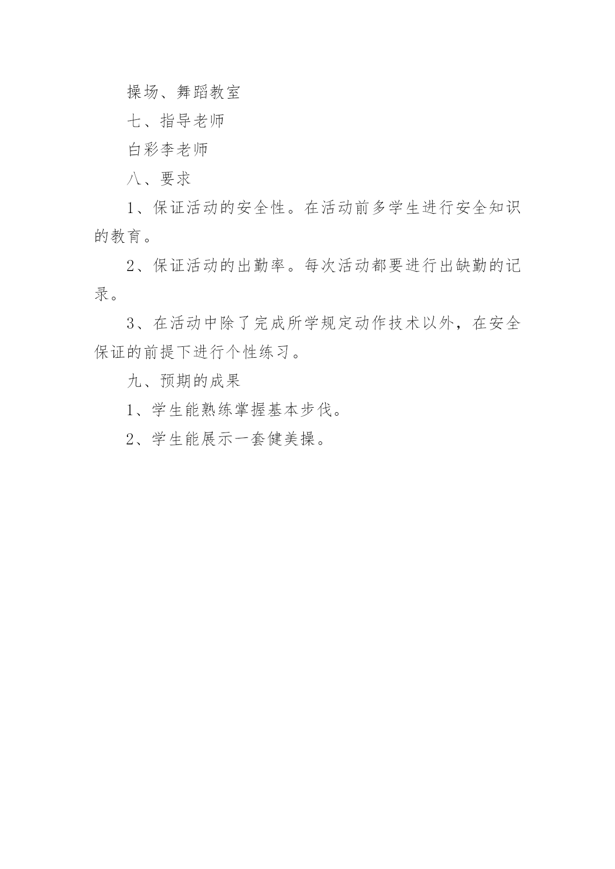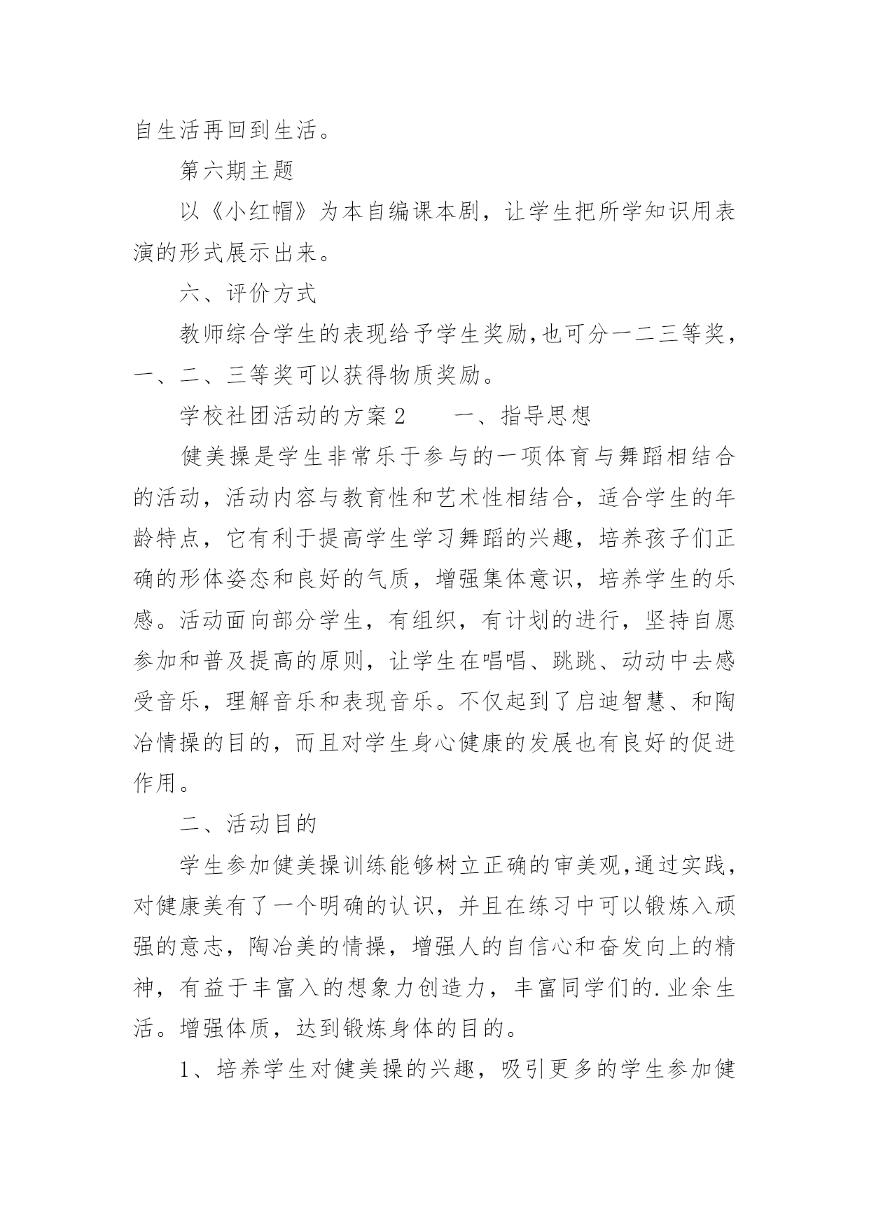 学校社团活动的方案学校社团活动的方案为确保活动顺利开展,我们需要提前开始活动方案制定工作,活动方案是活动的书面计划,具有内容条理清楚、步骤清晰的特点。那么活动方案应该怎么制定才合适呢?下面是小编精心整理的学校社团活动的方案,供大家参考借鉴,希望可以帮助到有需要的朋友。学校社团活动的方案1一、活动目的借助英语角活动的开展,提高学生的学习兴趣和口语水平。创造一个交流的空间,丰富同学们的生活。通过制作英语贺卡,英语小游戏,画图标单词,英语手抄报,英语单词大比拼等形式展开,侧重培养学生的兴趣和动手操作能力。二、活动宗旨提高学生学习英语的兴趣,增强语感,培养听说能力和口语表达能力,使学生在语音,语调方面都有不同程度的提高,能够让学生在具体的真实语境中表达英语,更好地辅助英语教学。三、指导思想HappyEnglish,Happylife。快乐英语,快乐生活。四、活动地点校园活动角和课余时间五、具体安排1、每月的四个星期内容交替进行。周三或周四下午课外活动时间。2、宣传活动:任课老师负责在本班召集团员,原则上每班不超过五人。3、活动内容:第一期主题以MySchool为主。(介绍自己的学校设施,问路等对话形式,也可以画出自己心目中的校园等)第二期主题制作手工表,并能用所学句型训练时间的问法,并能向别人询问时间以及在某个时间该干什么,重点训练孩子动手能力。第三期主题画图标单词,根据中央电视台天气预报图标,自己绘出天气预报图标,并能在图标旁边标出英语单词,重点培养孩子的动手和动脑能力,并能联系生活实际,把英语知识生活化。第四期主题英语单词大比拼,本部分主题要求学生对日常常见的蔬菜和动物进行分类汇总,也可以设计学过的内容和生活中见到的.此类单词,目的是丰富孩子的词汇量。第五期主题英语表达,此部分是理论联系实际,让孩子们用自己平时的着装进行表达,让学生能在生活中学习英语,让英语来自生活再回到生活。第六期主题以《小红帽》为本自编课本剧,让学生把所学知识用表演的形式展示出来。六、评价方式教师综合学生的表现给予学生奖励,也可分一二三等奖,一、二、三等奖可以获得物质奖励。学校社团活动的方案2一、指导思想健美操是学生非常乐于参与的一项体育与舞蹈相结合的活动,活动内容与教育性和艺术性相结合,适合学生的年龄特点,它有利于提高学生学习舞蹈的兴趣,培养孩子们正确的形体姿态和良好的气质,增强集体意识,培养学生的乐感。活动面向部分学生,有组织,有计划的进行,坚持自愿参加和普及提高的原则,让学生在唱唱、跳跳、动动中去感受音乐,理解音乐和表现音乐。不仅起到了启迪智慧、和陶冶情操的目的,而且对学生身心健康的发展也有良好的促进作用。二、活动目的学生参加健美操训练能够树立正确的审美观,通过实践,对健康美有了一个明确的认识,并且在练习中可以锻炼入顽强的意志,陶冶美的情操,增强人的自信心和奋发向上的精神,有益于丰富入的想象力创造力,丰富同学们的.业余生活。增强体质,达到锻炼身体的目的。1、培养学生对健美操的兴趣,吸引更多的学生参加健美操活动。2、发展柔韧、协调、灵敏、速度、弹跳等运动素质。3、学习和掌握健美操运动的基本活动技能,逐步培养完成各种练习的正确姿势,对学生的特长的培养。4、在训练过程中努力培养学生守纪律、爱集体、懂礼貌、爱学习、勇于吃苦、意志顽强的品质,使其能够全面发展。三、活动内容1、第一阶段教会学生正确地掌握健美操的基本要领。2、第二阶段要求全体队员都能在教师的训练下基本达到下叉,对个别感觉不错的队员可加深练习。3、第三阶段要求学一些儿童健美操中常见的舞步的组合。4、第四阶段训练内容,对个别好的队员进行个人素质的提高,技巧方向可加深一些。四、活动措施1、引导学生观看健美操录像带,帮助学生寻找感觉。2、逐段示范、讲解动作,逐个辅导。3、学生个人练习和个别辅导相结合。4、采用学生互帮、好学生示范的方法,进一步提高水平。五、活动时间每天阳光体育时间六、活动地点操场、舞蹈教室七、指导老师白彩李老师八、要求1、保证活动的安全性。在活动前多学生进行安全知识的教育。2、保证活动的出勤率。每次活动都要进行出缺勤的记录。3、在活动中除了完成所学规定动作技术以外,在安全保证的前提下进行个性练习。九、预期的成果1、学生能熟练掌握基本步伐。2、学生能展示一套健美操。